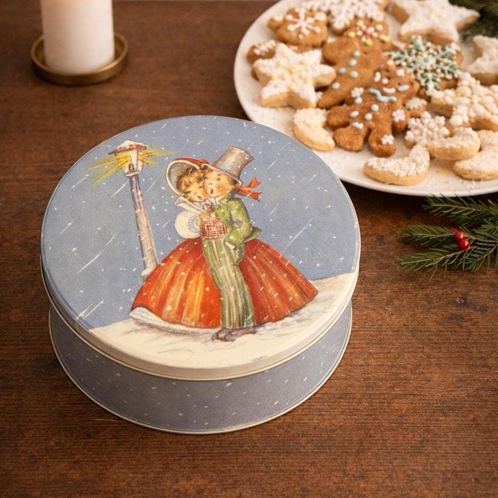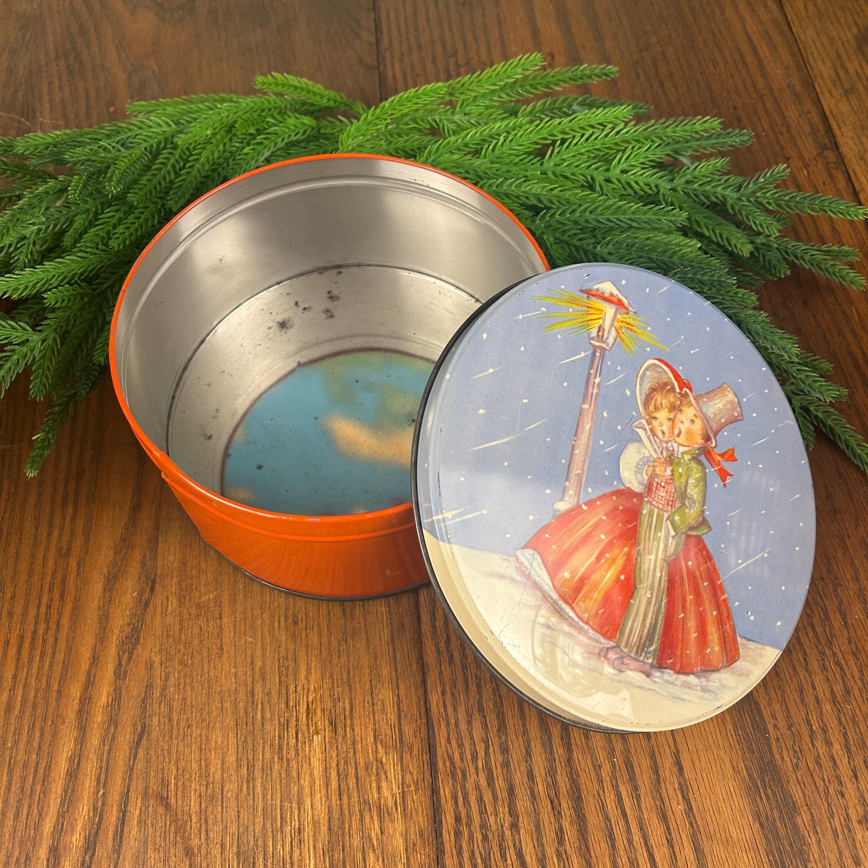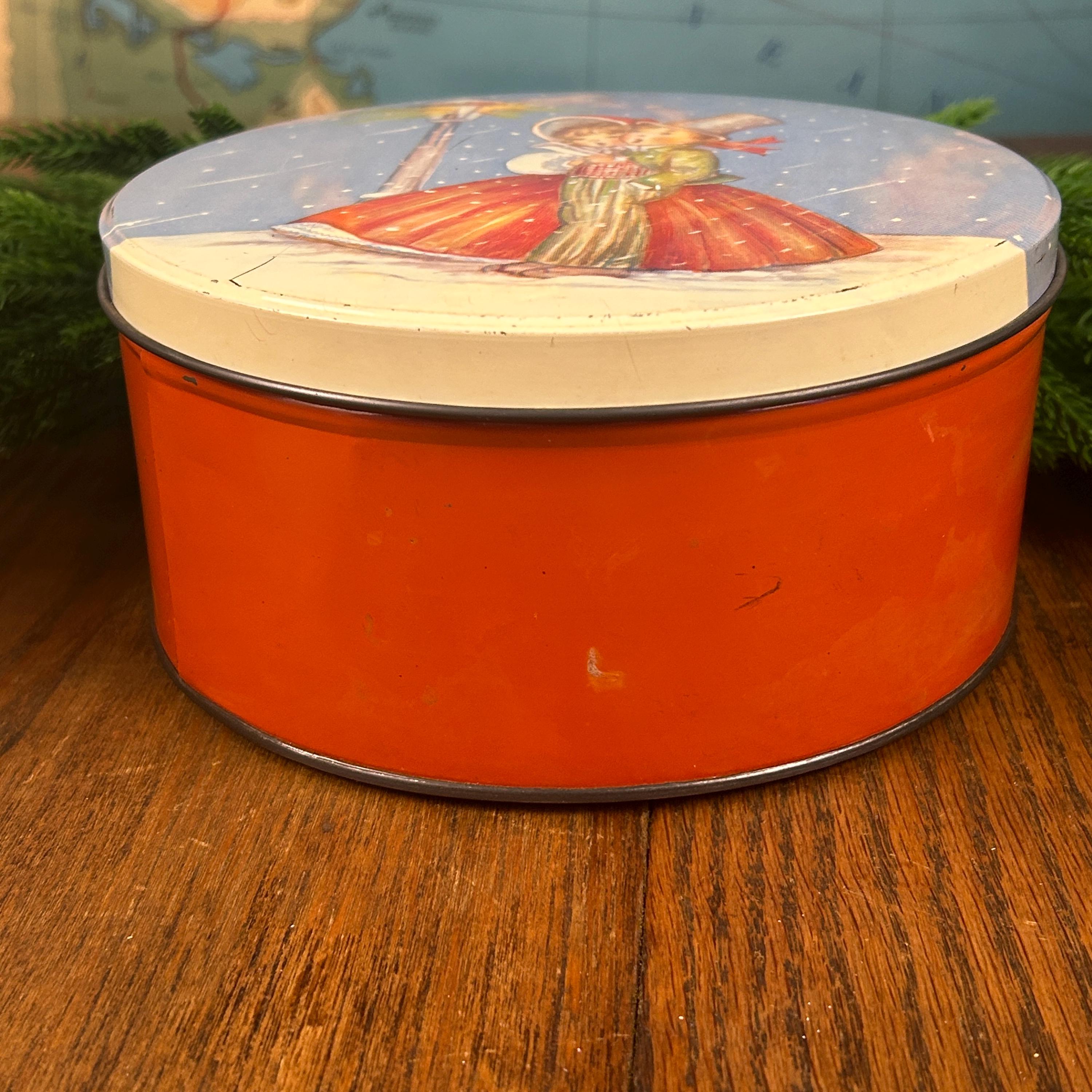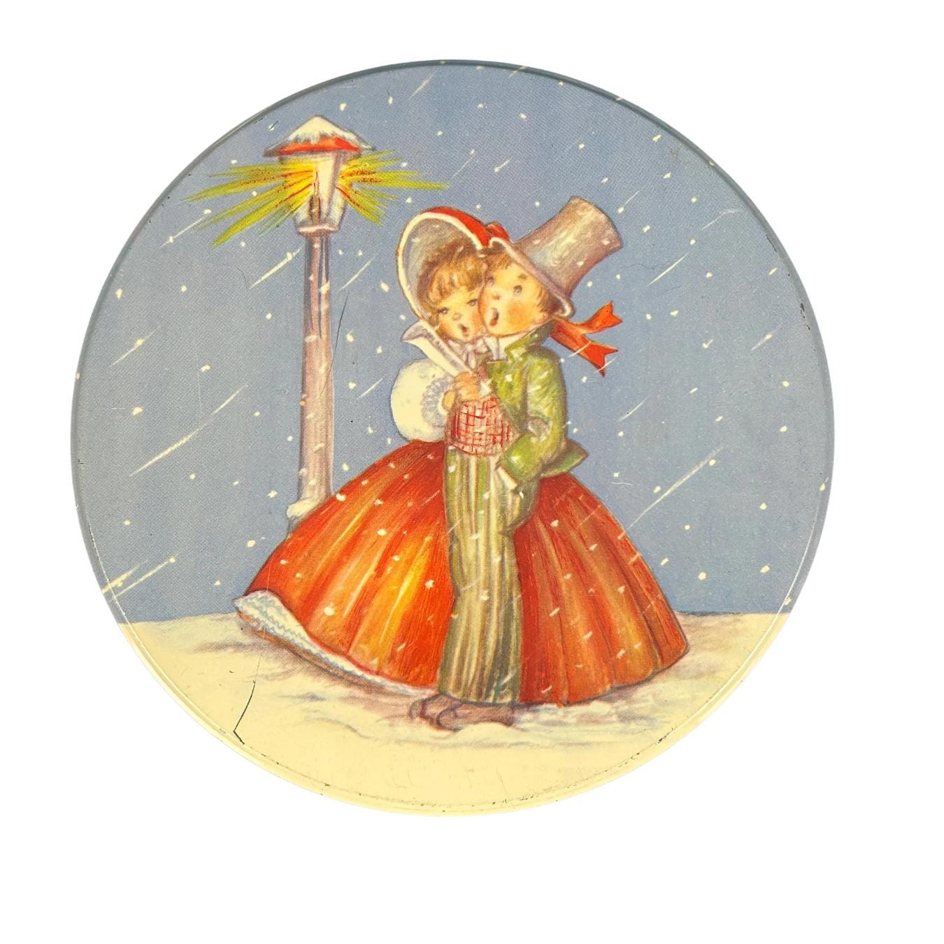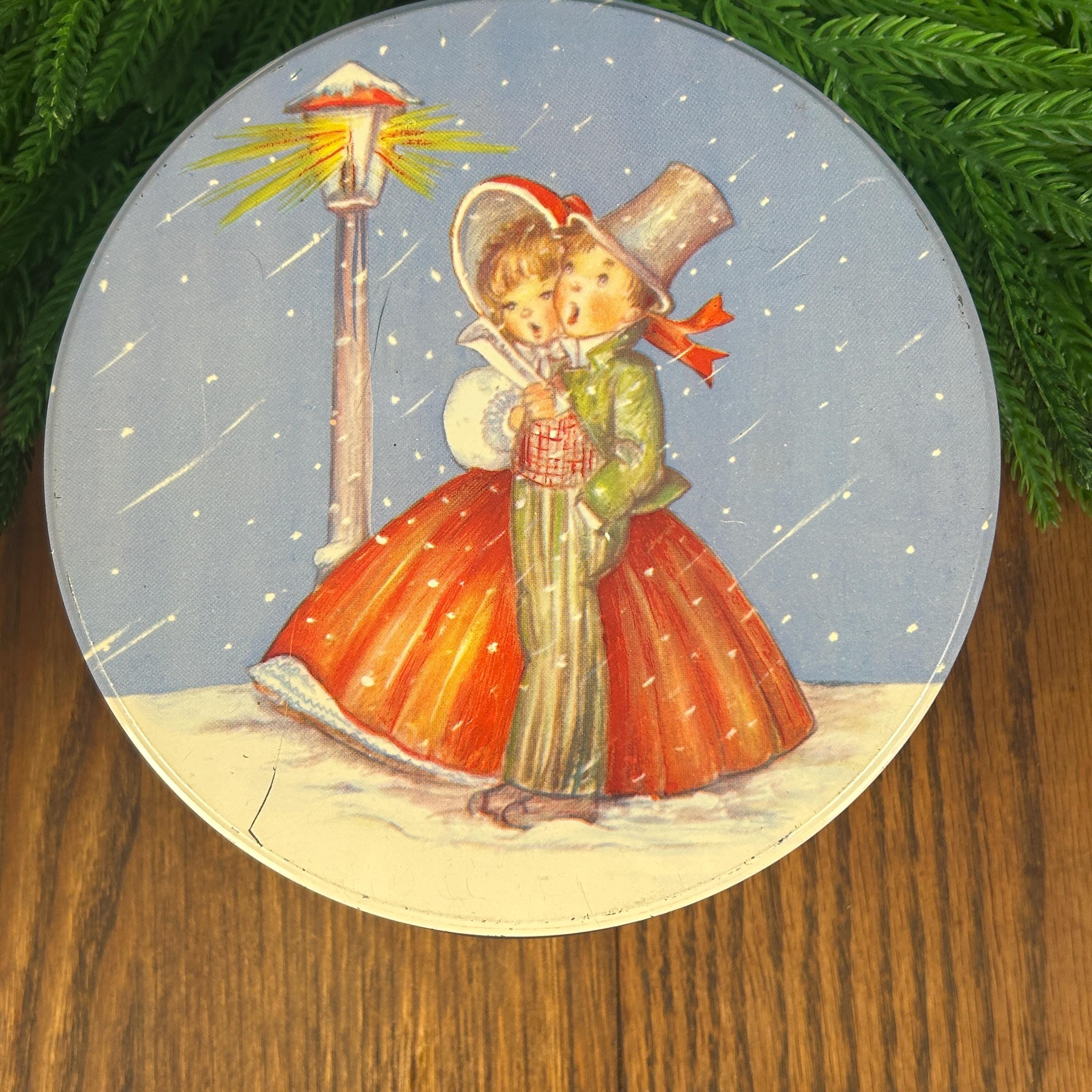 This is a vintage Christmas collectible tin featuring an illustration of two children caroling by a lamppost in the snow. The tin has a round shape with a lid.