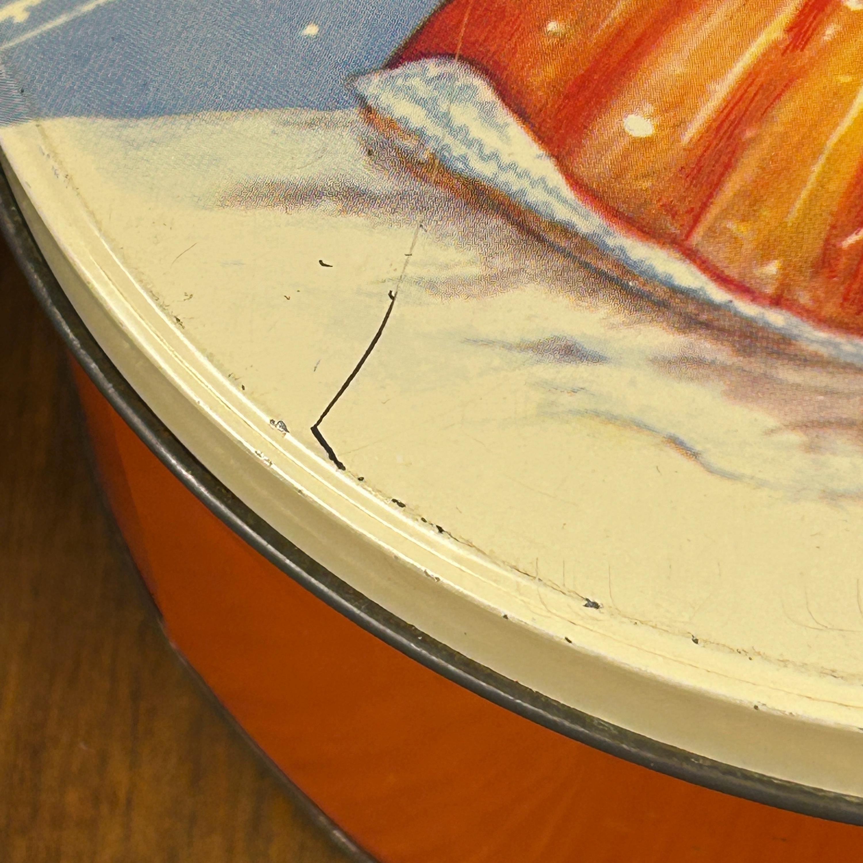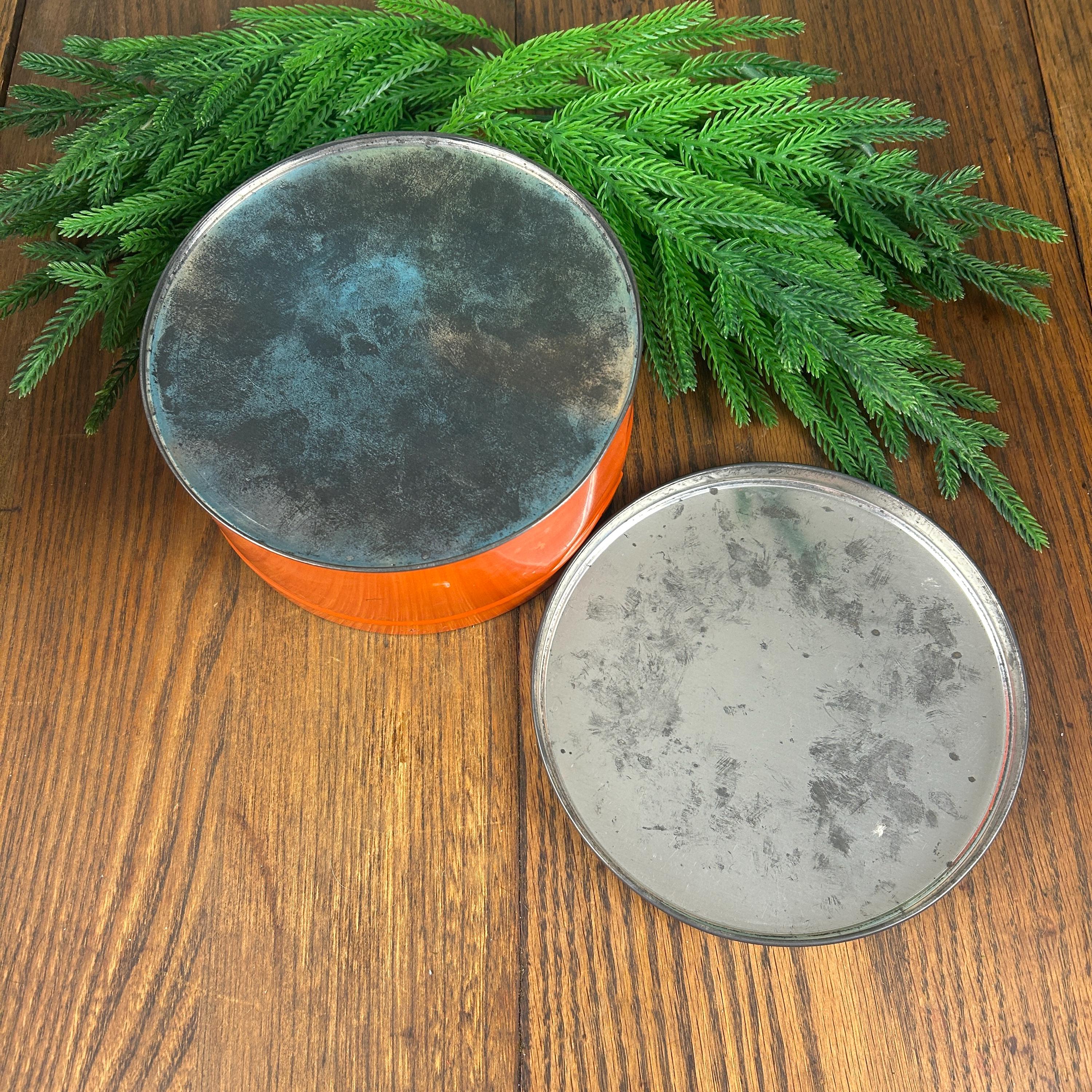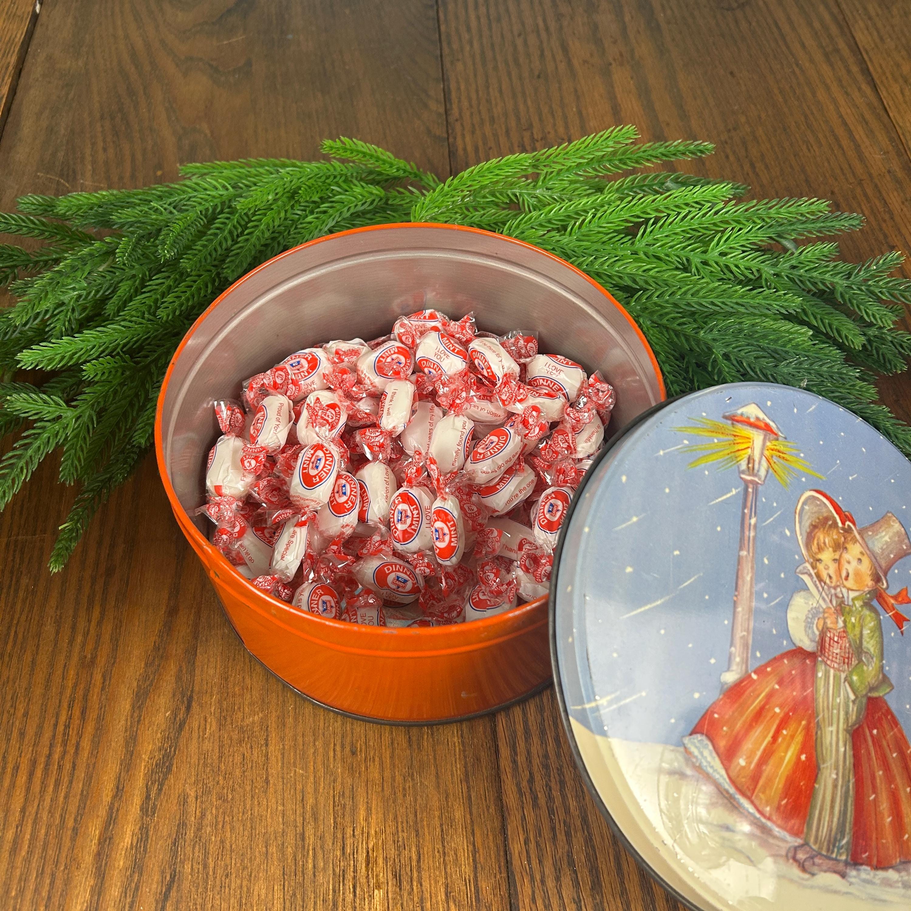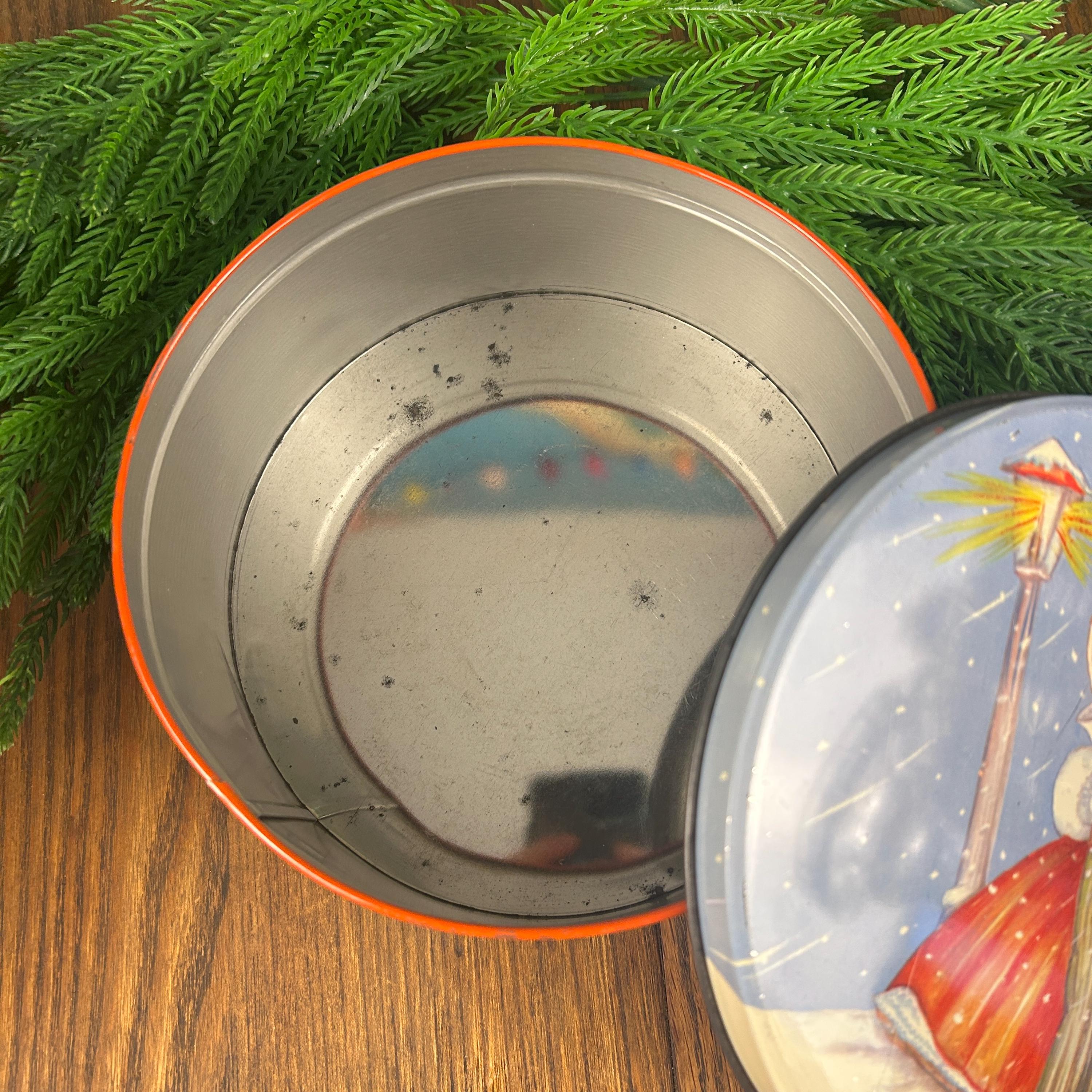 This is a vintage Christmas collectible tin featuring an illustration of two children caroling by a lamppost in the snow. The tin has a round shape with a lid.