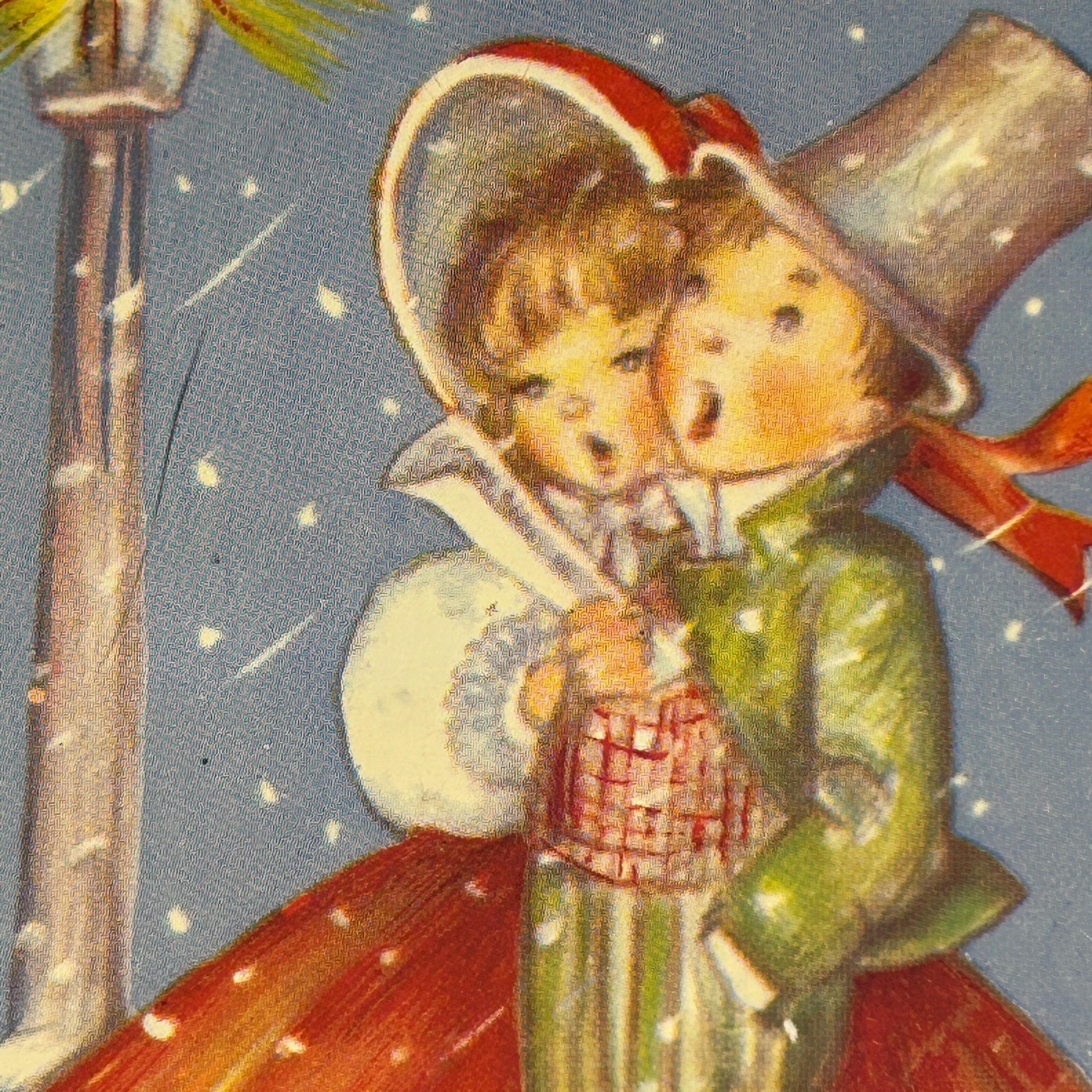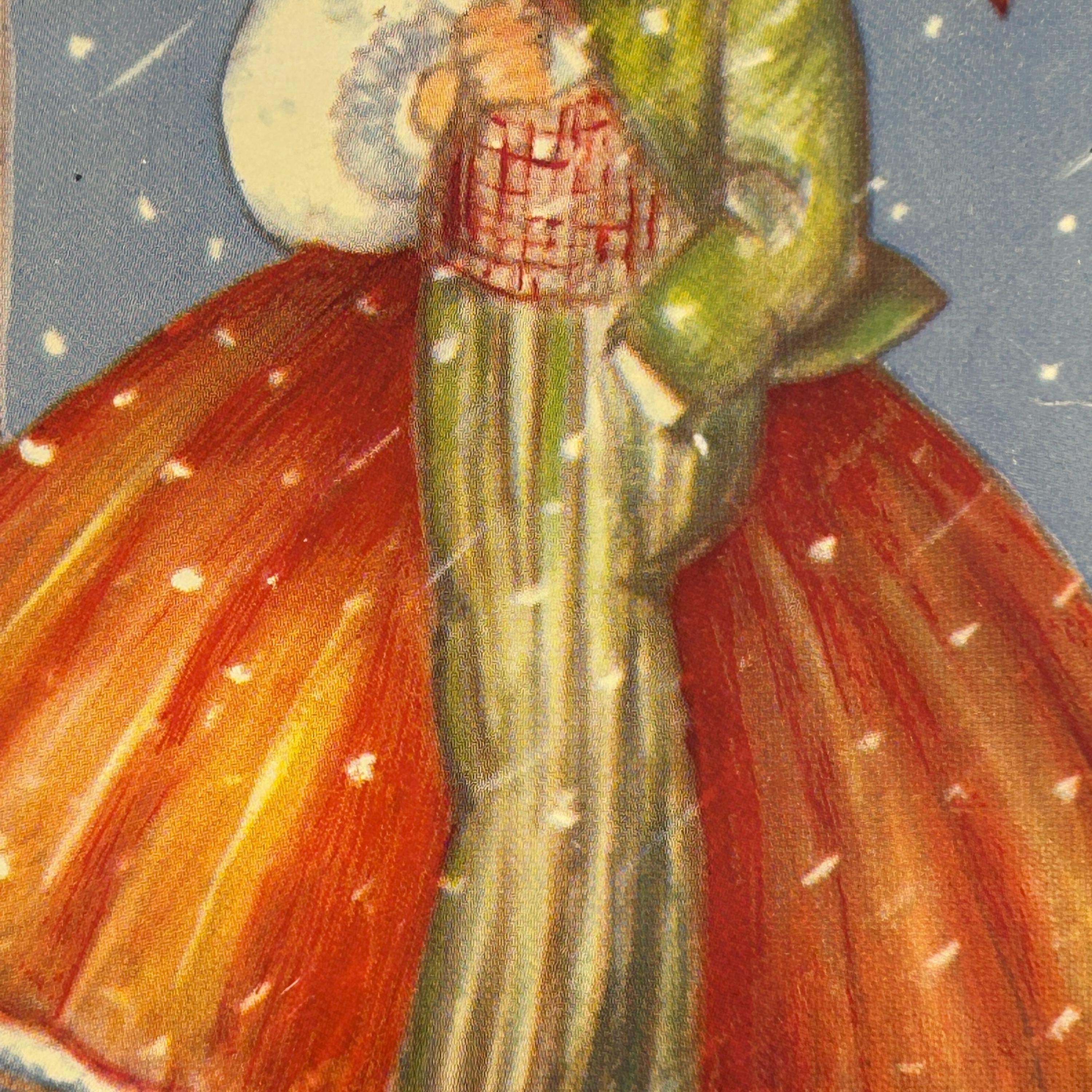 It features a colorful, vintage-style lithograph illustration. The image depicts a boy in a top hat and a girl in a bonnet singing carols.