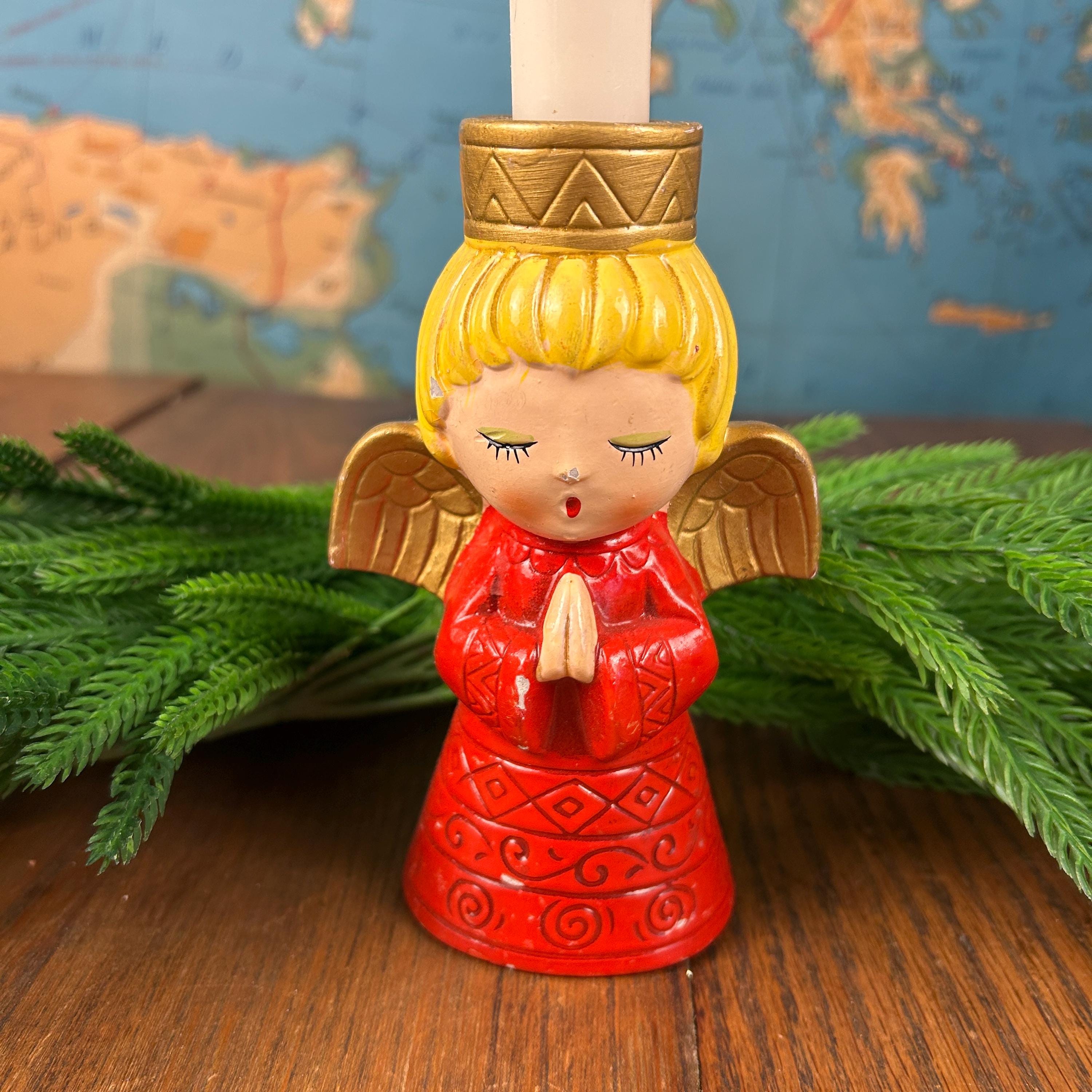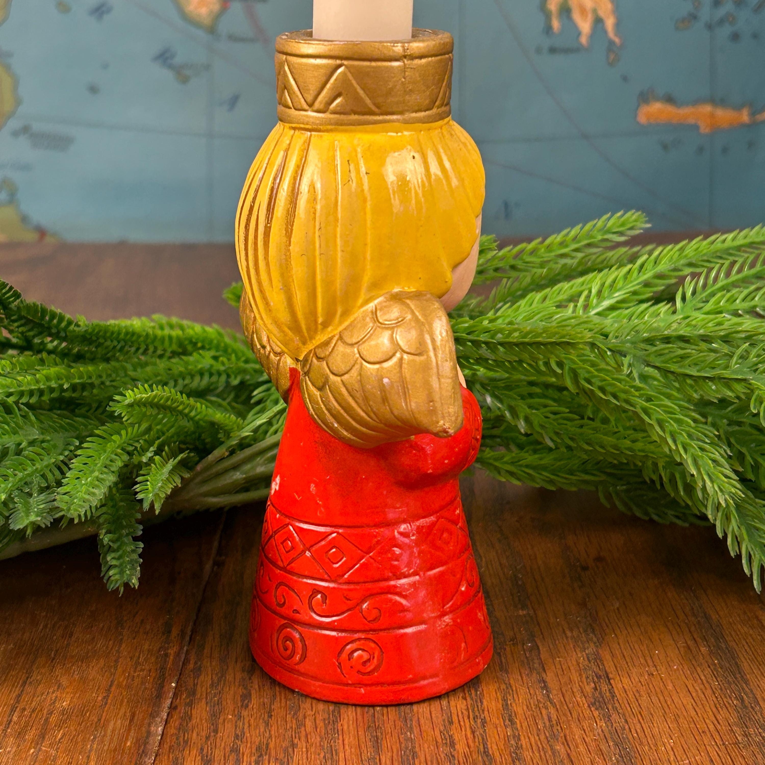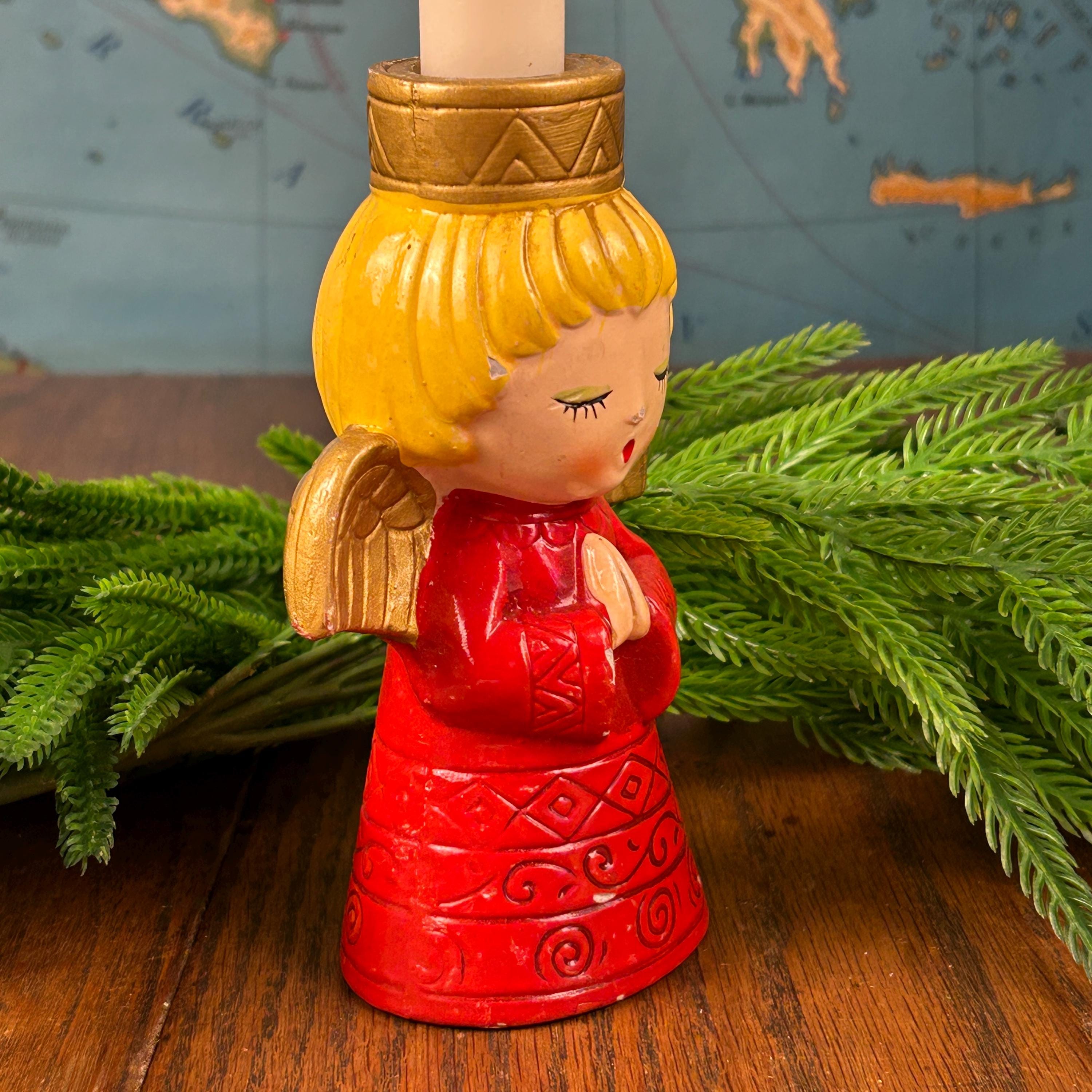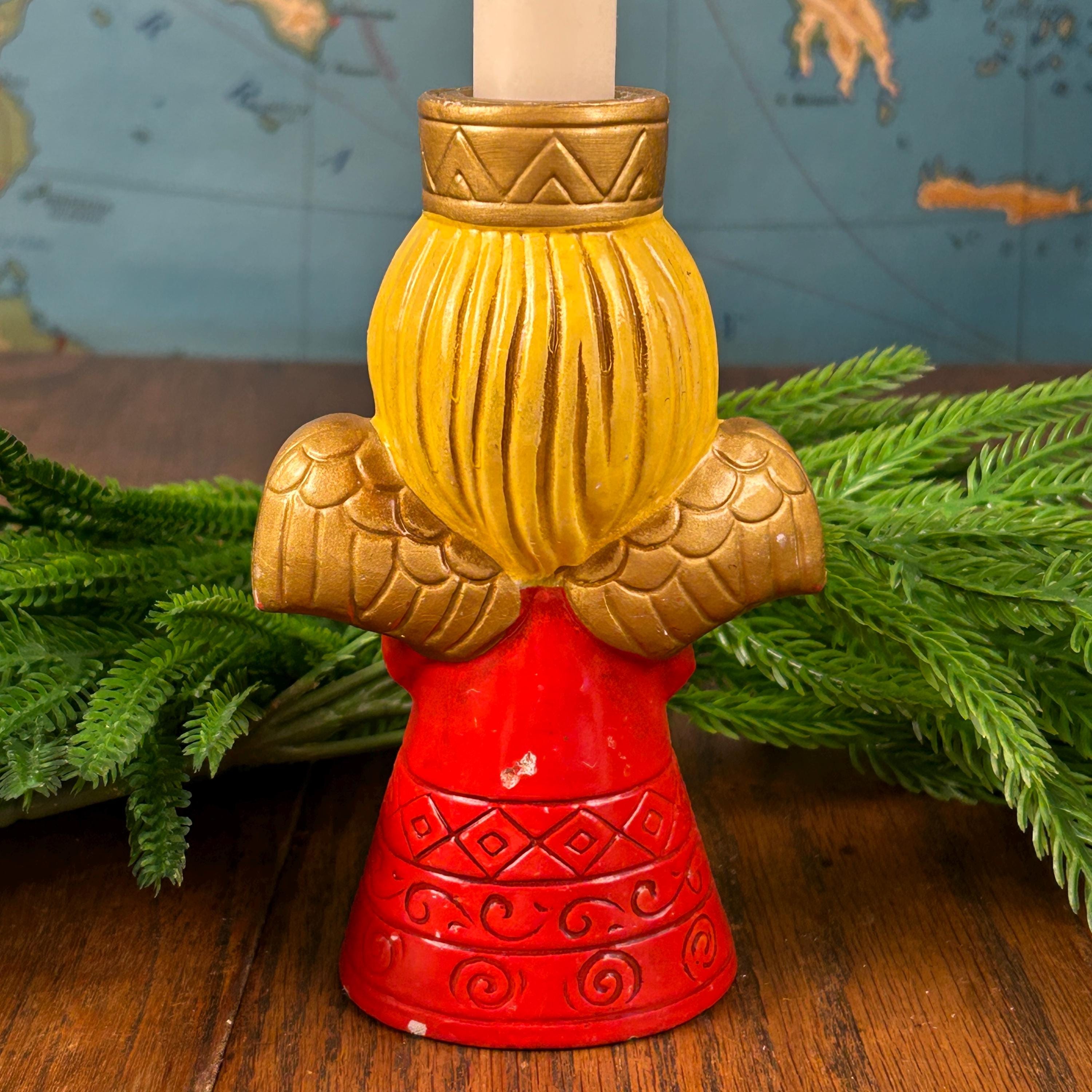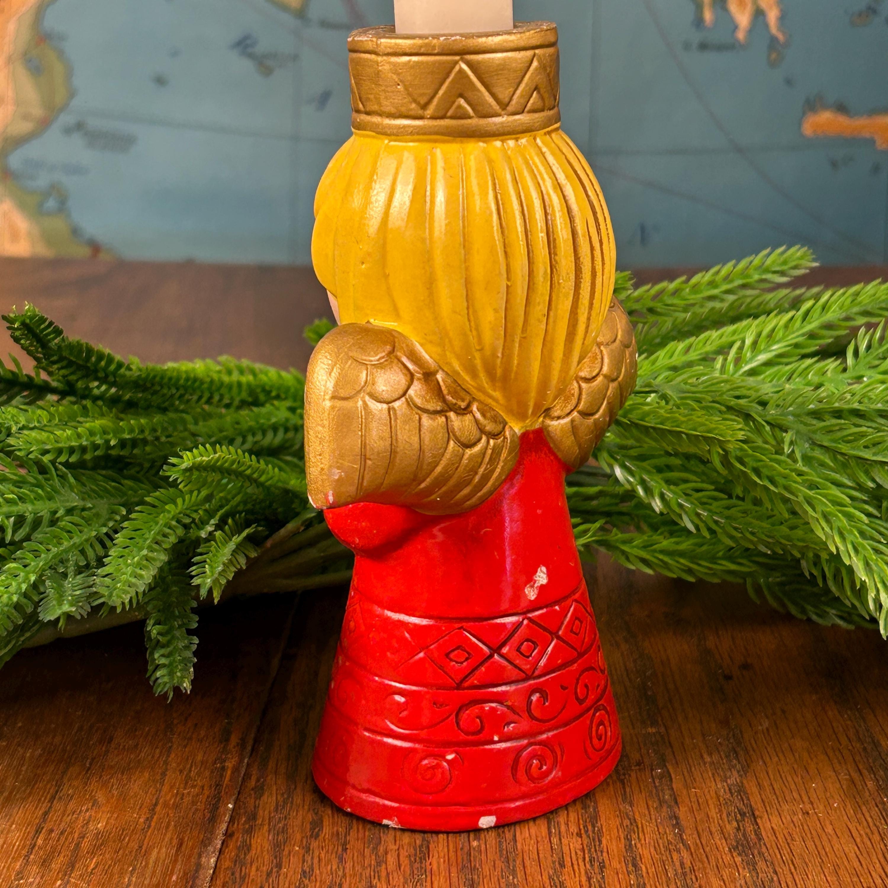 The figure features a red robe with gold-colored wings and a crown. Made in the 1960s. It is designed to hold a taper candle.