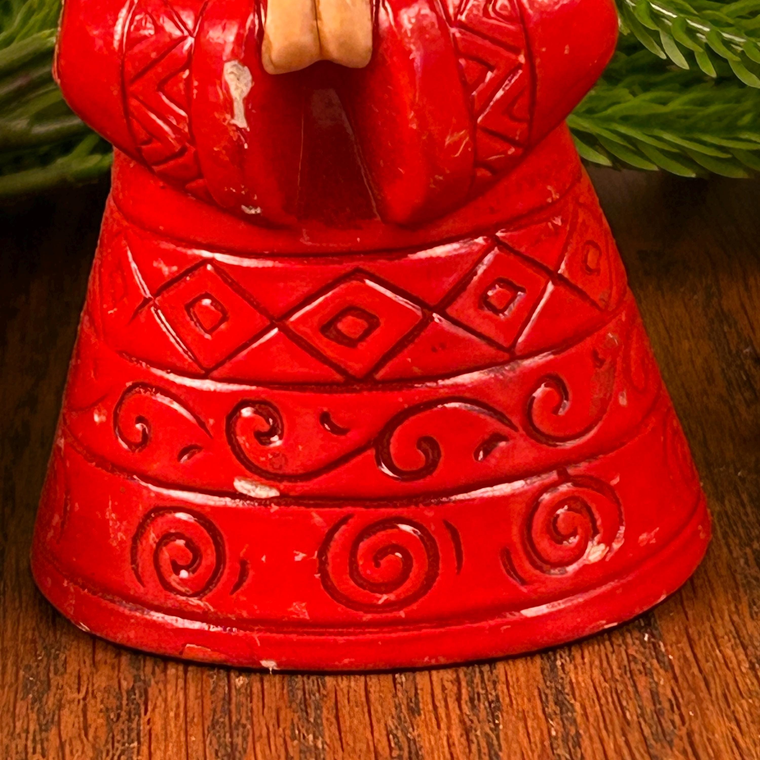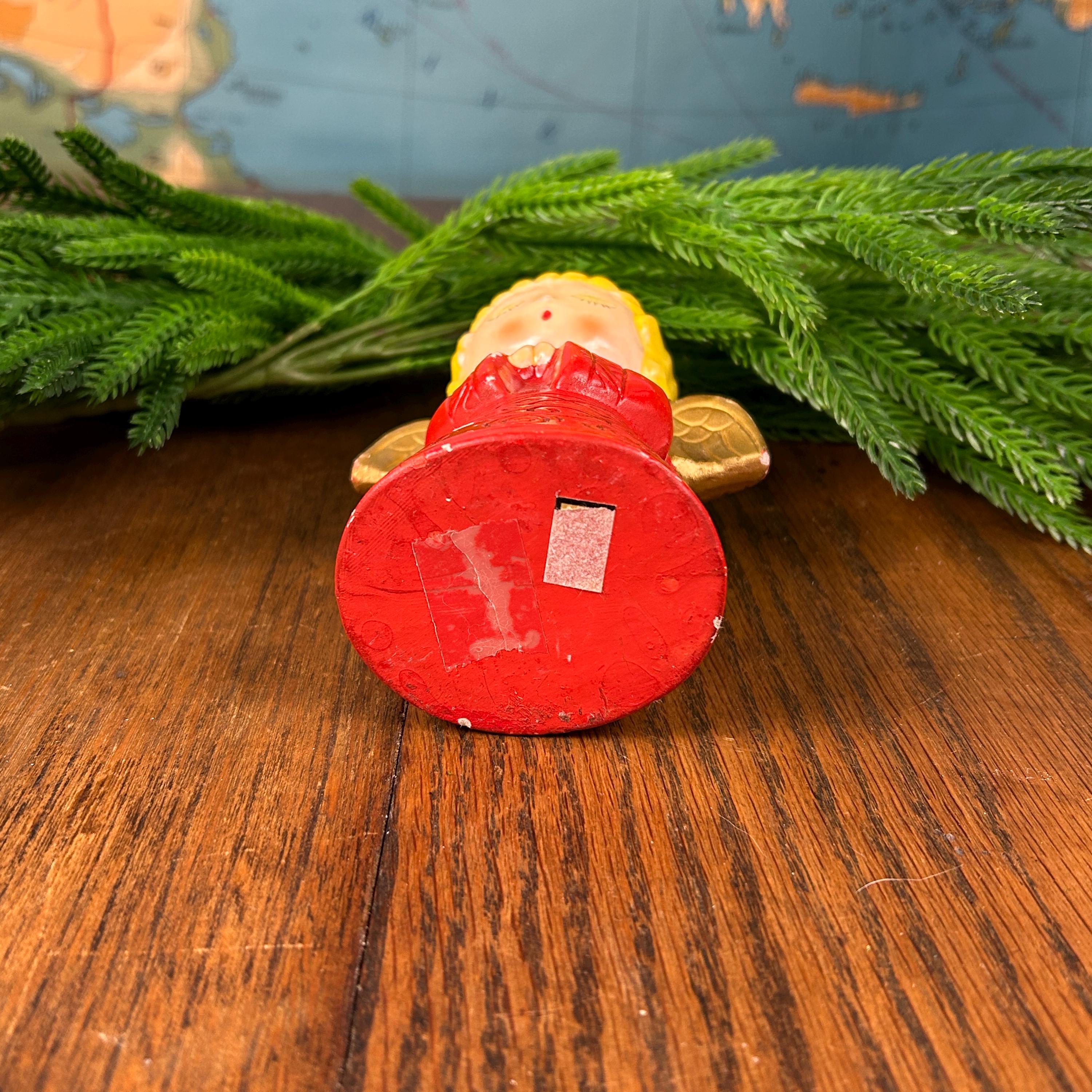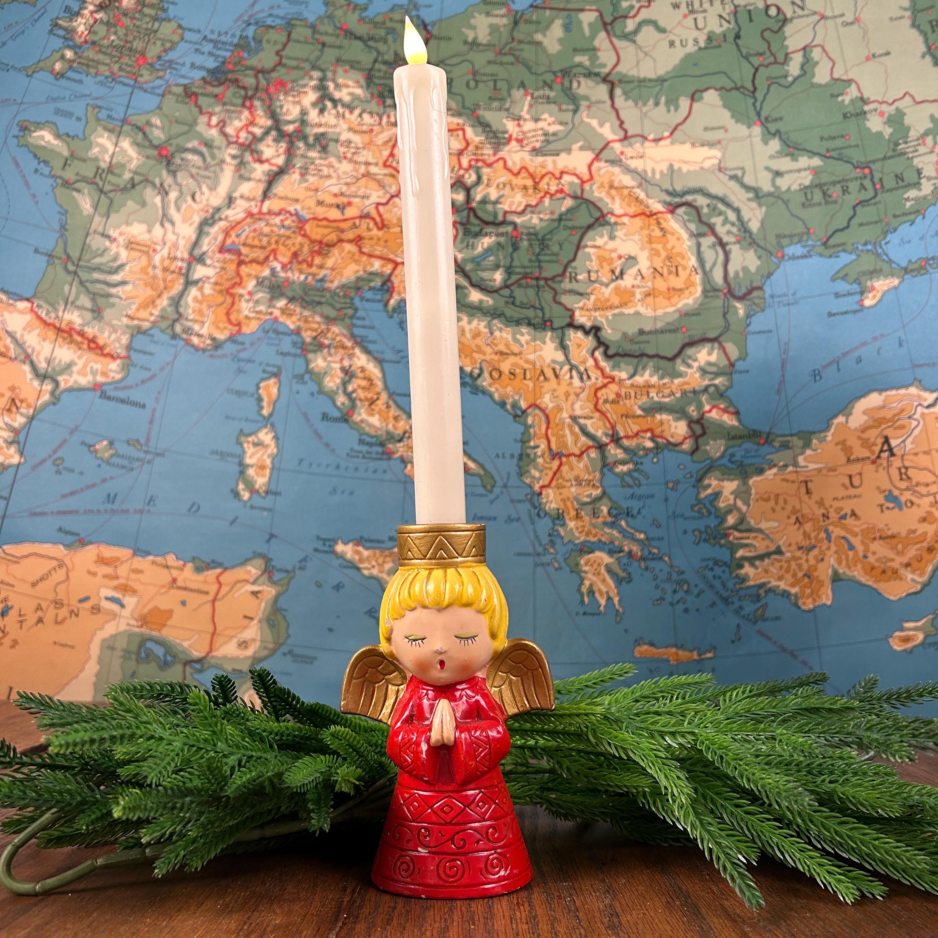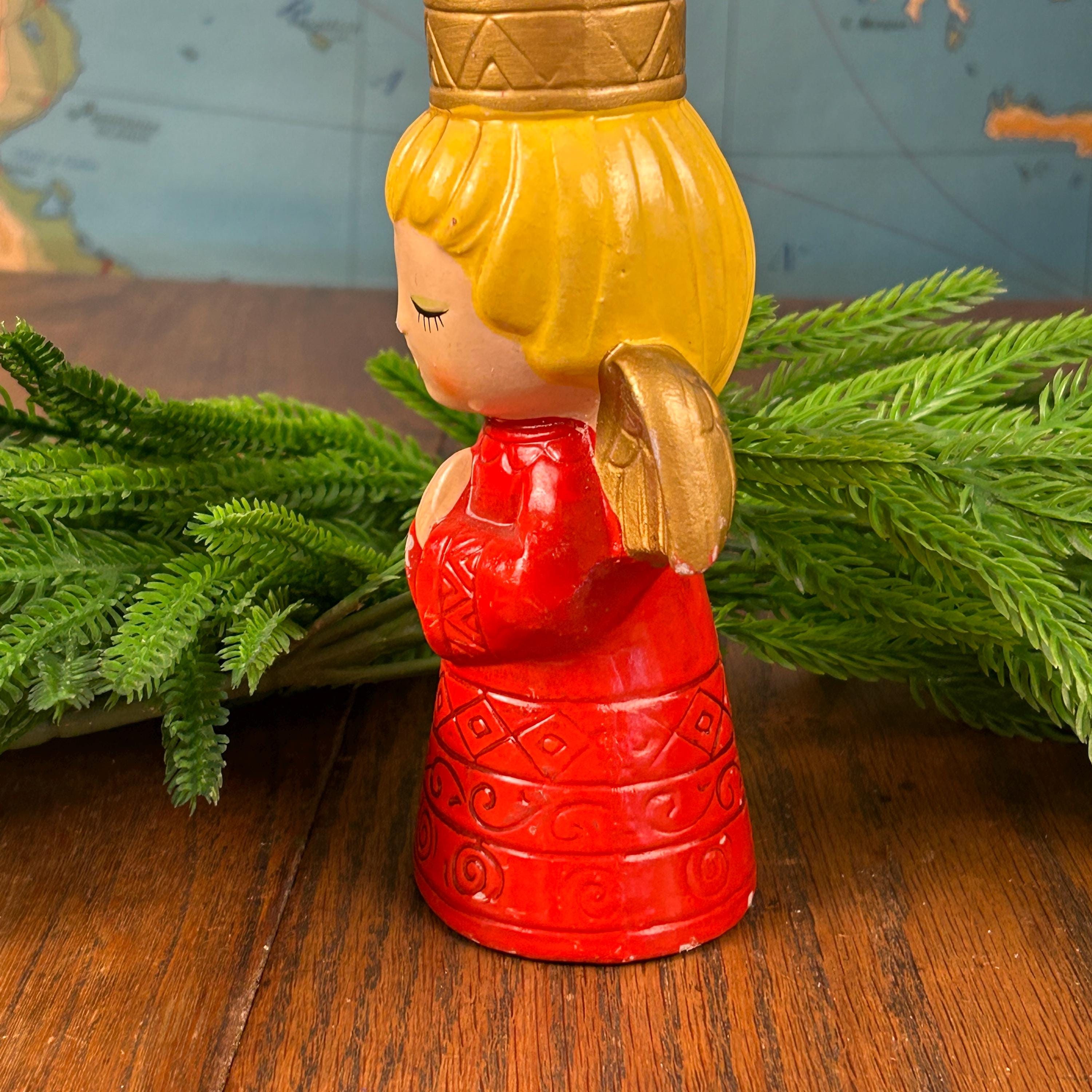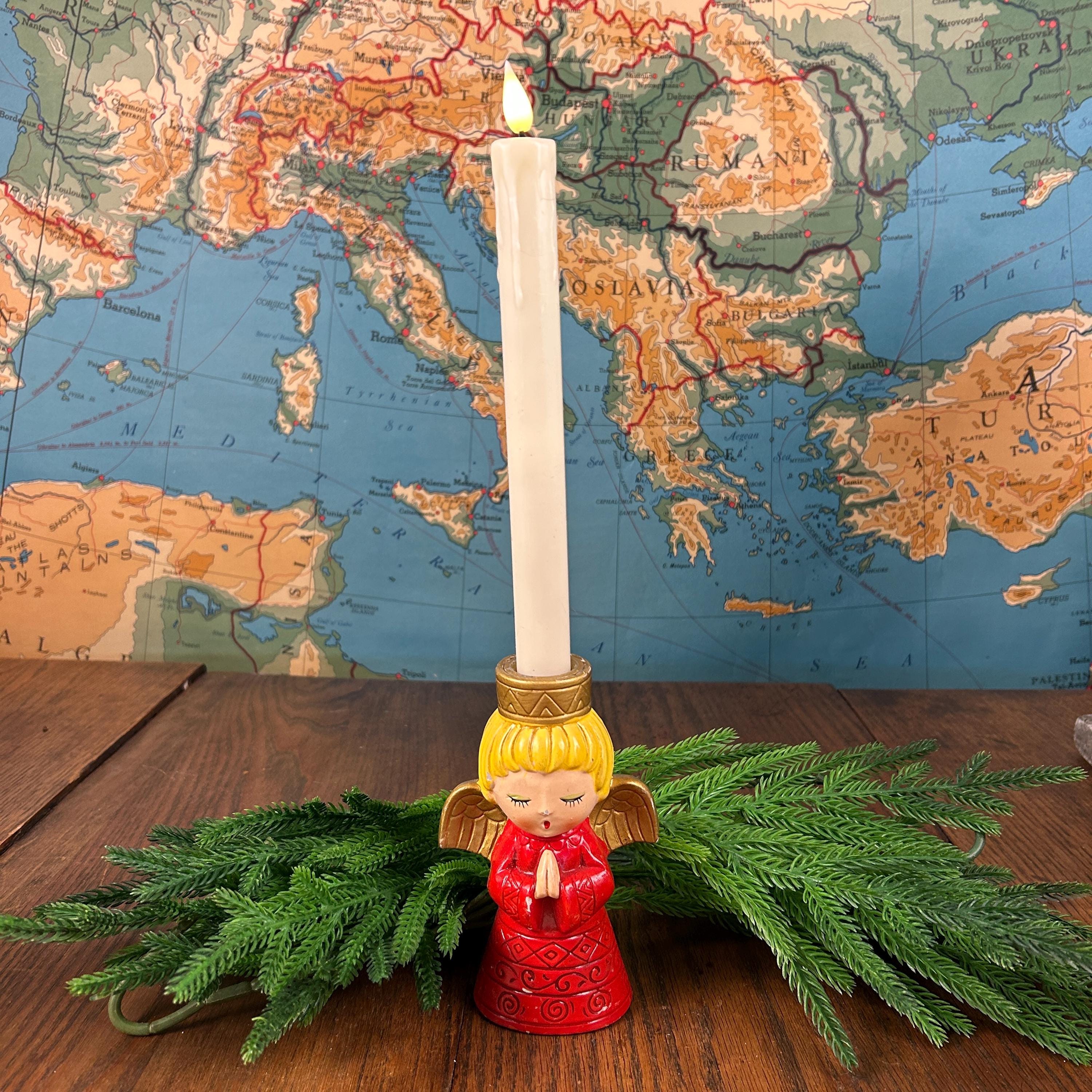 The figure features a red robe with gold-colored wings and a crown. Made in the 1960s. It is designed to hold a taper candle.