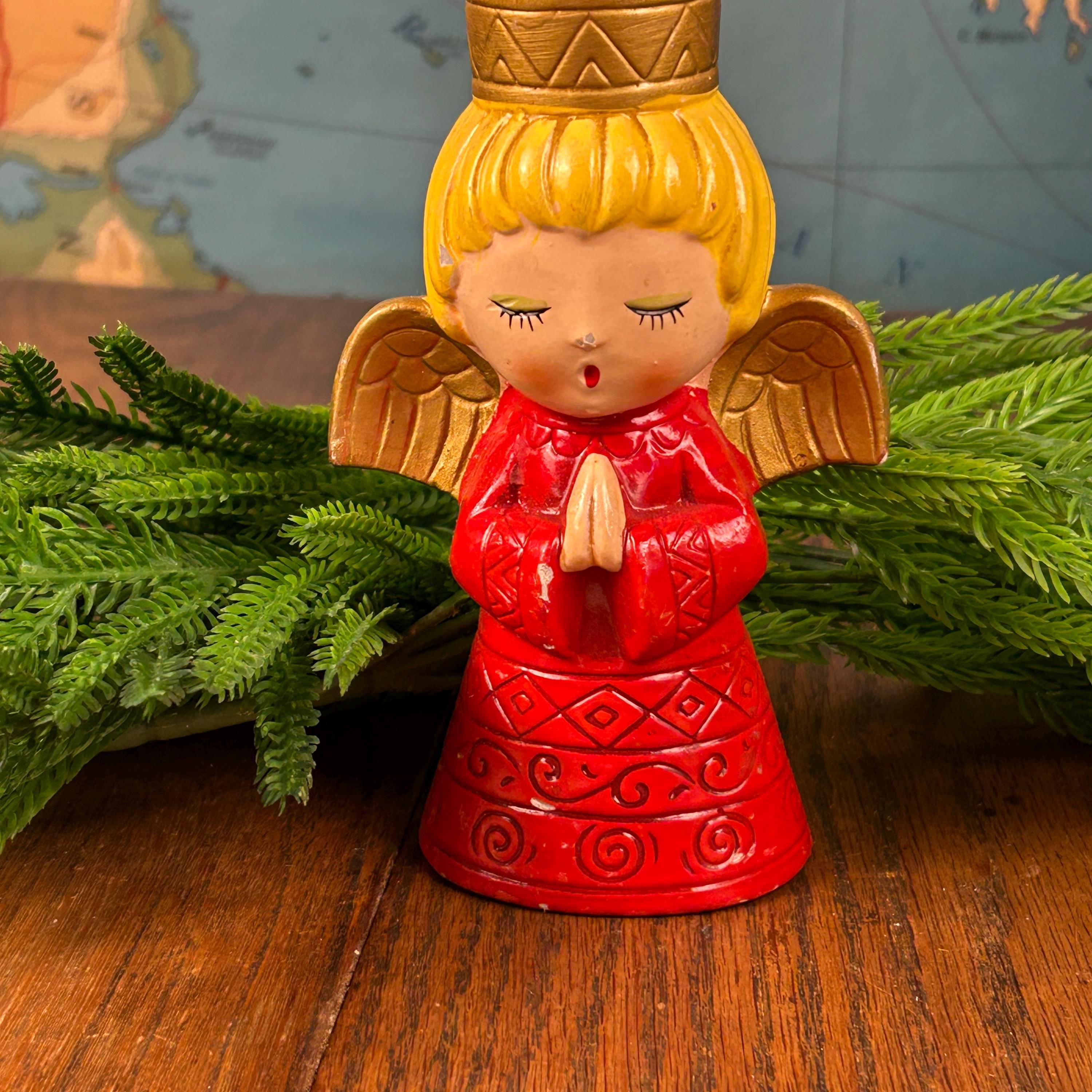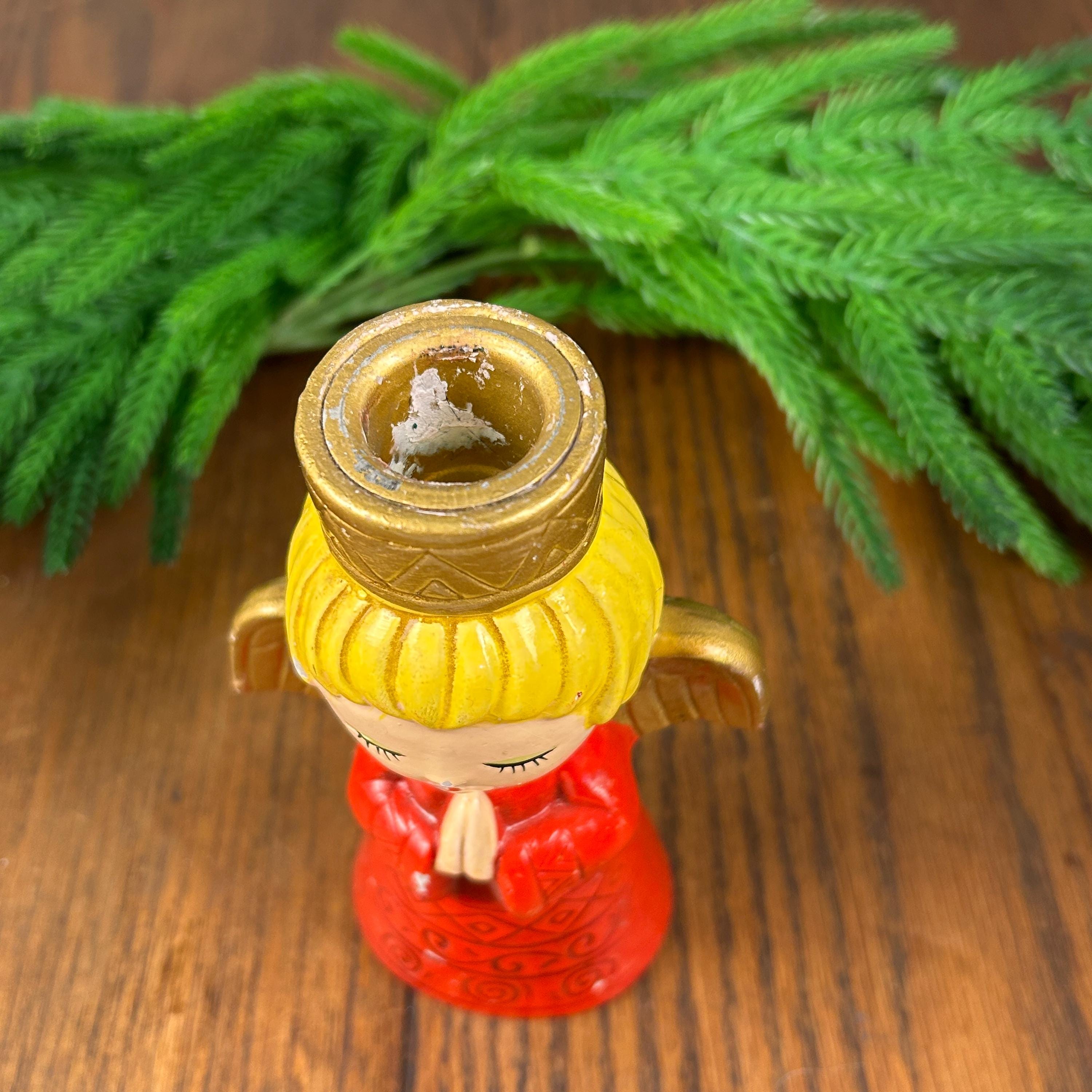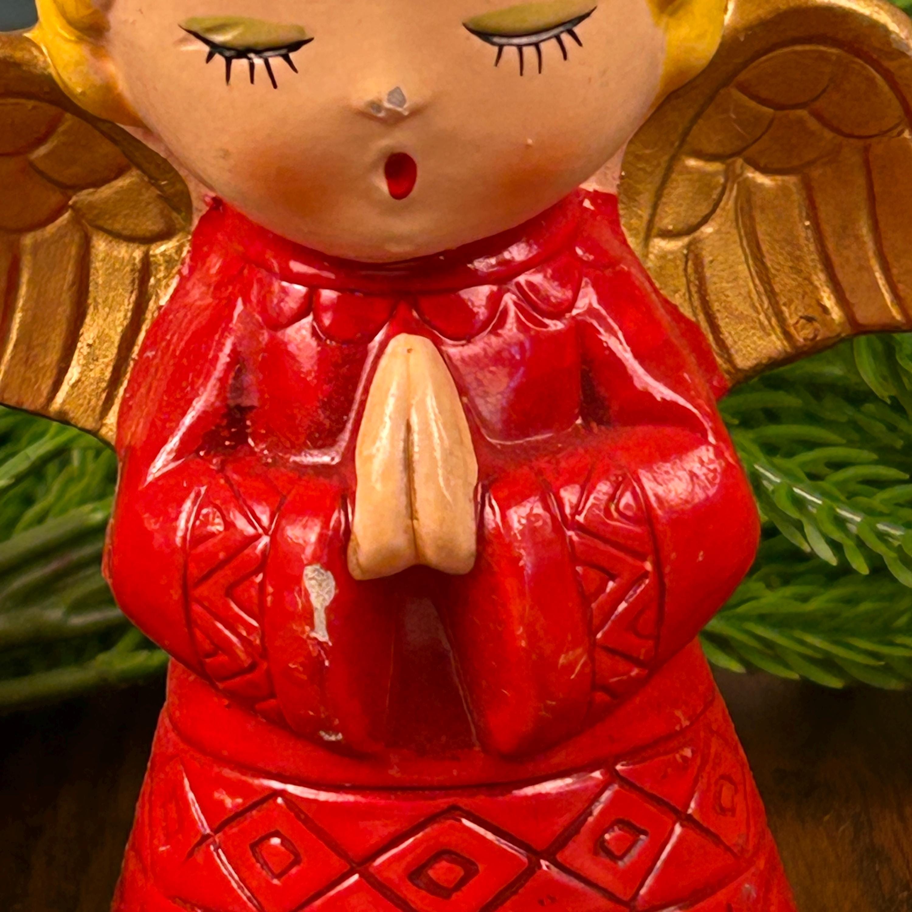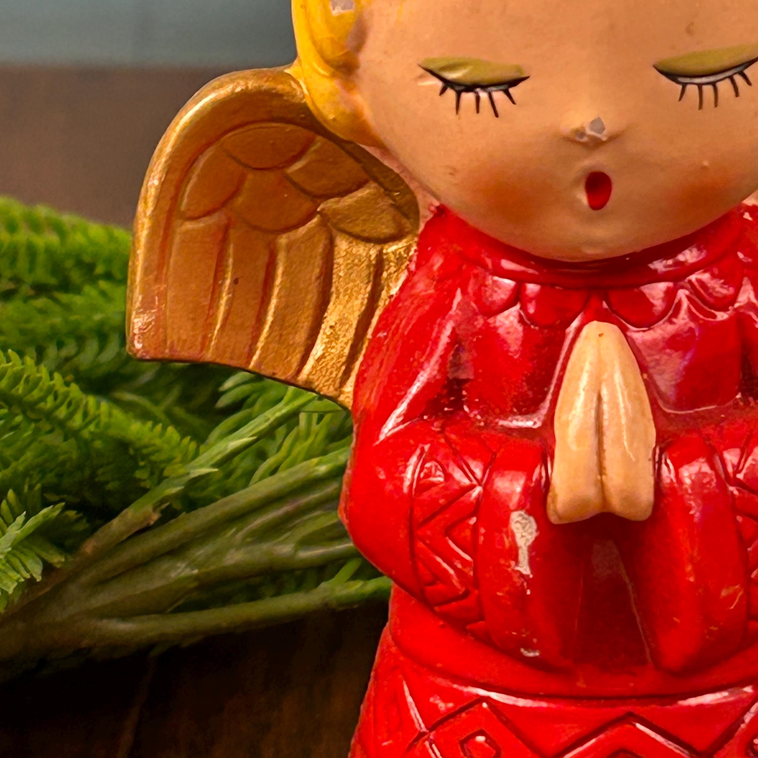 This vintage red praying angel candle holder is a ceramic or papier-mâché collectible made in Japan by Ardco.