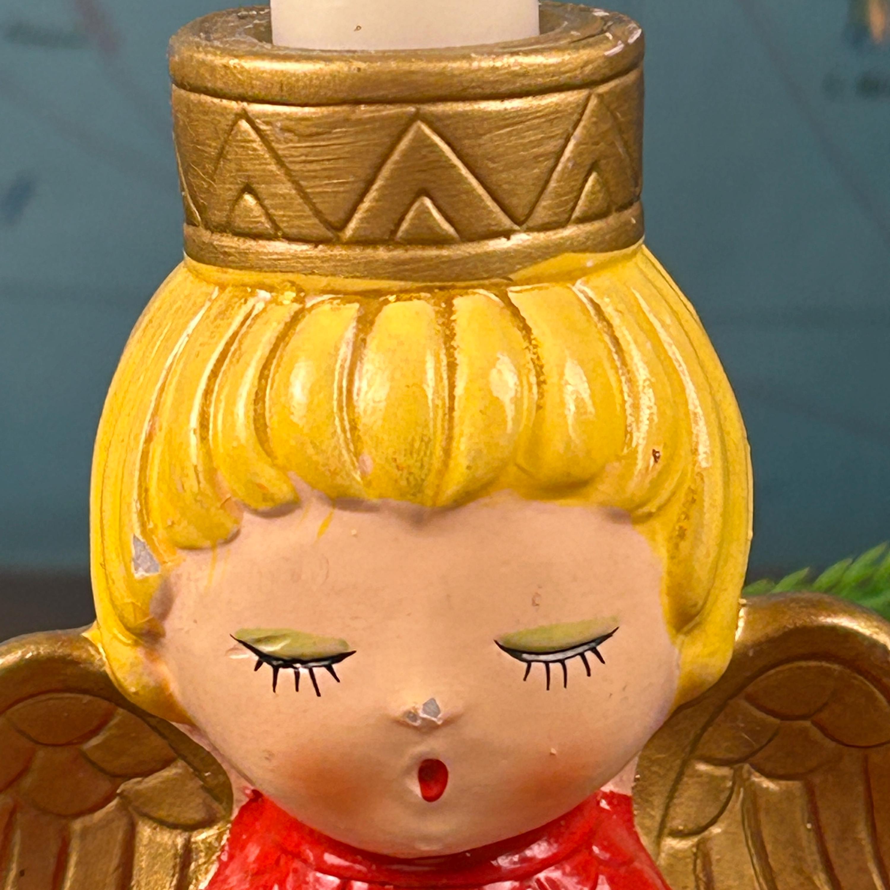 Fun Kitschy Christmas Praying Angel Candle Holder. Great gold wings and gold crown, and bright yellow hair. She has long eyelashes and is also singing. Holds a taper candle nicely. Add these to your vintage Angel Decor, or traditional Christmas knick knacks!