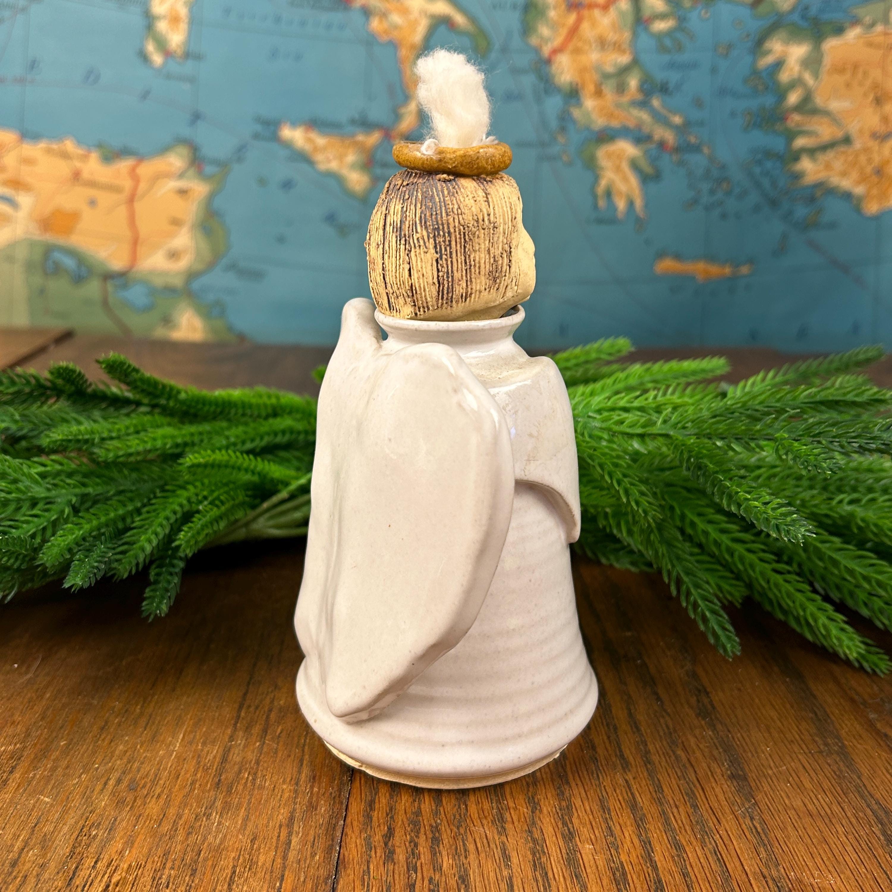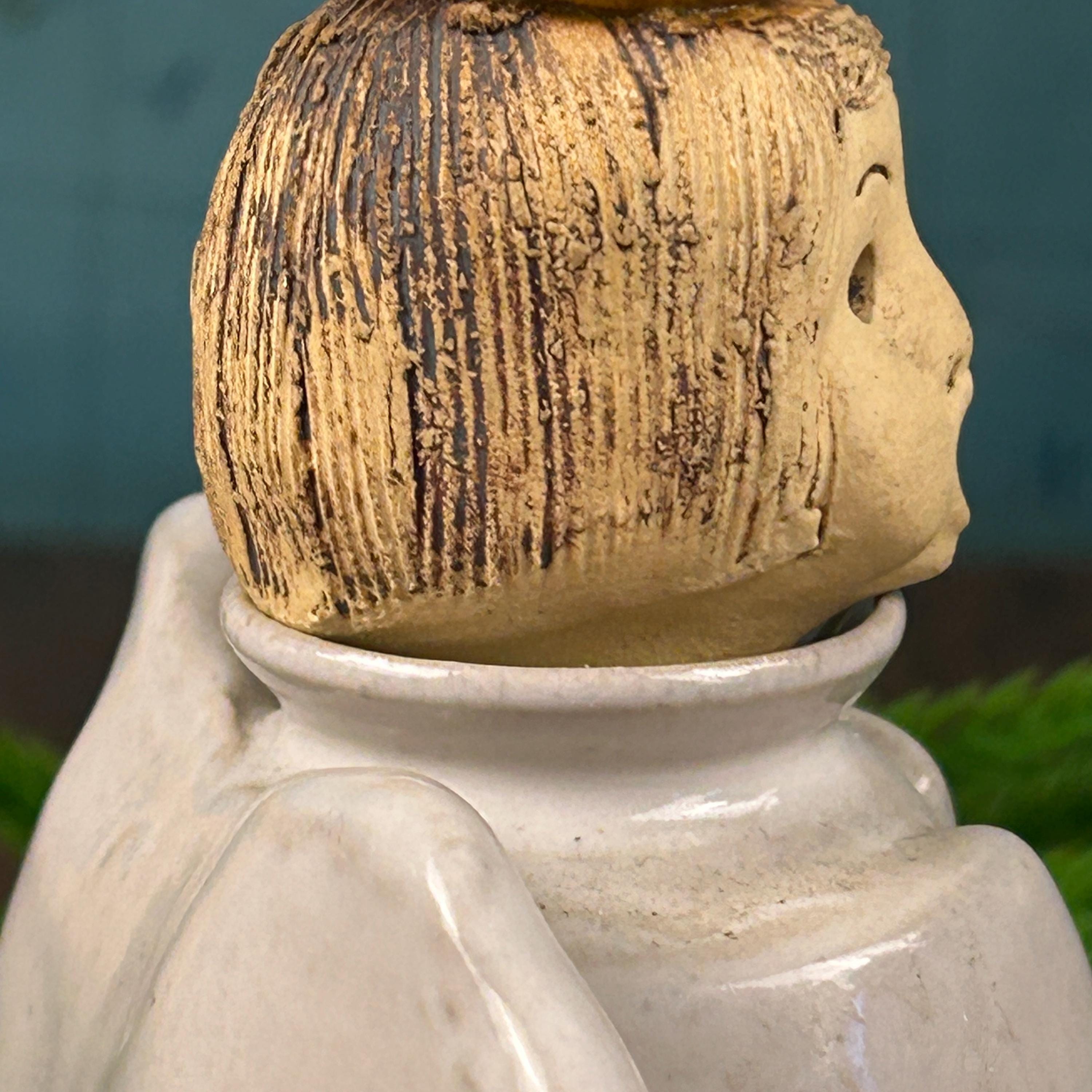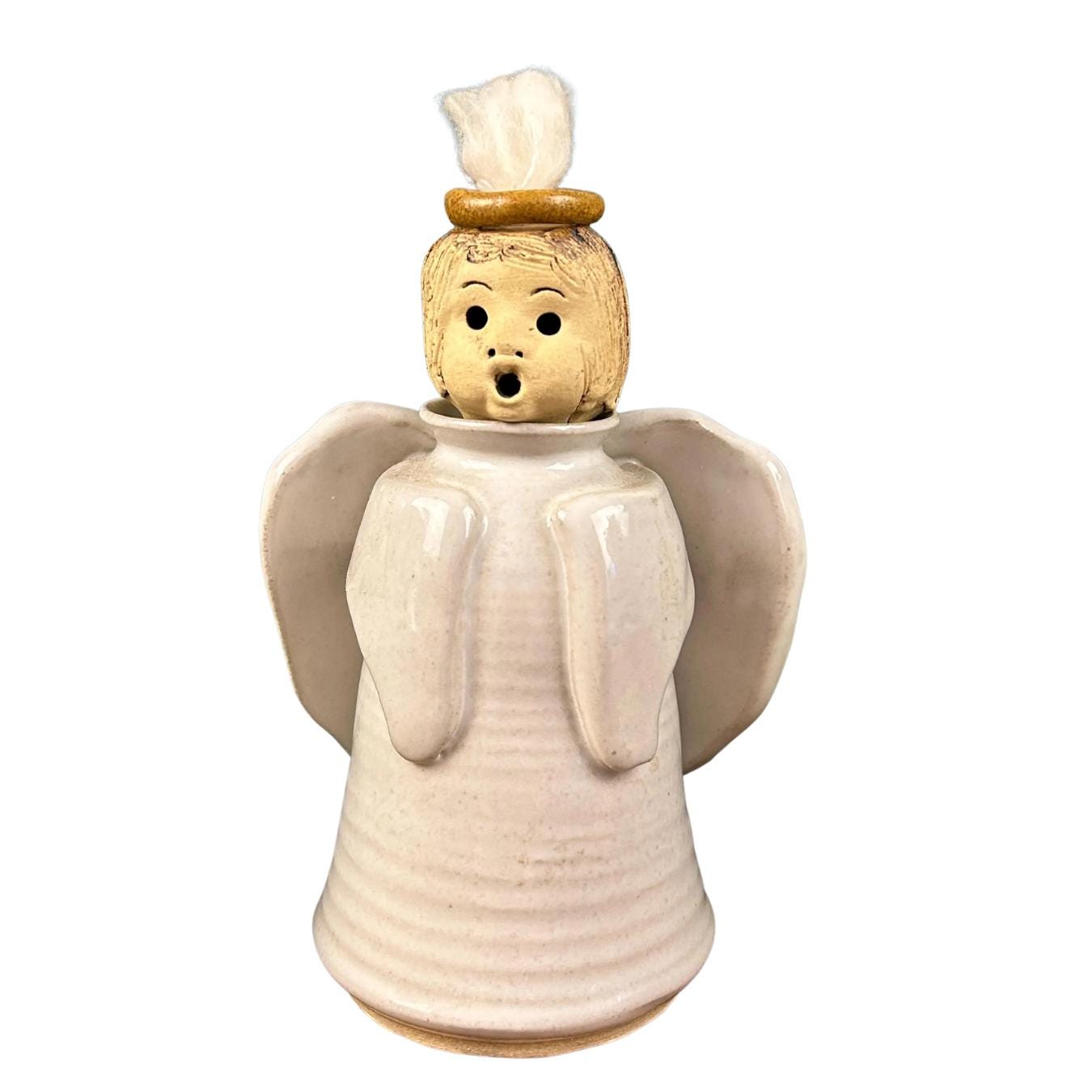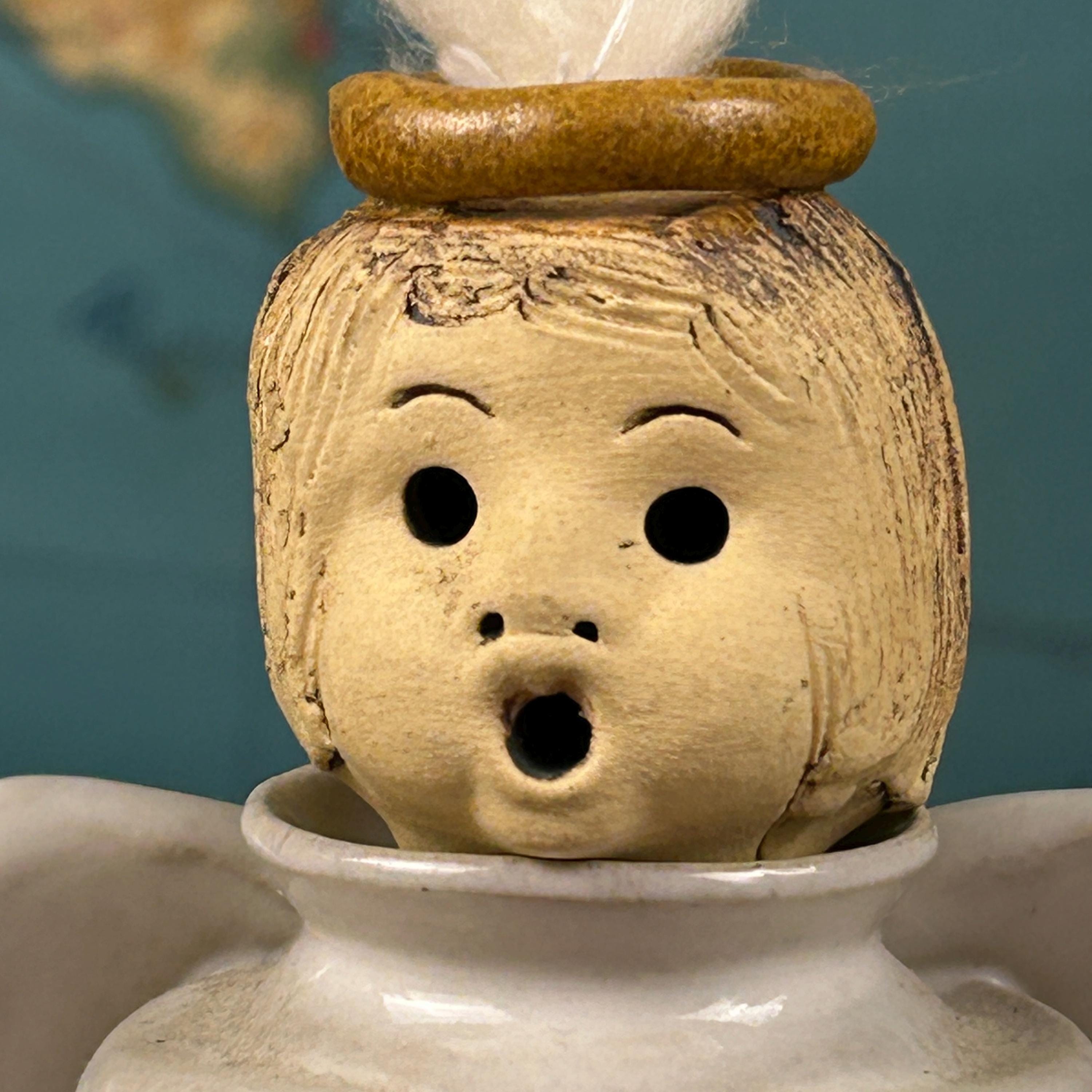 This is a vintage, handcrafted ceramic angel oil lamp made by artist Rita Ward of Pottery House at Terra Studios in the Ozarks of Arkansas. The lamp is designed as an angel figurine with a removable head to access the oil reservoir.