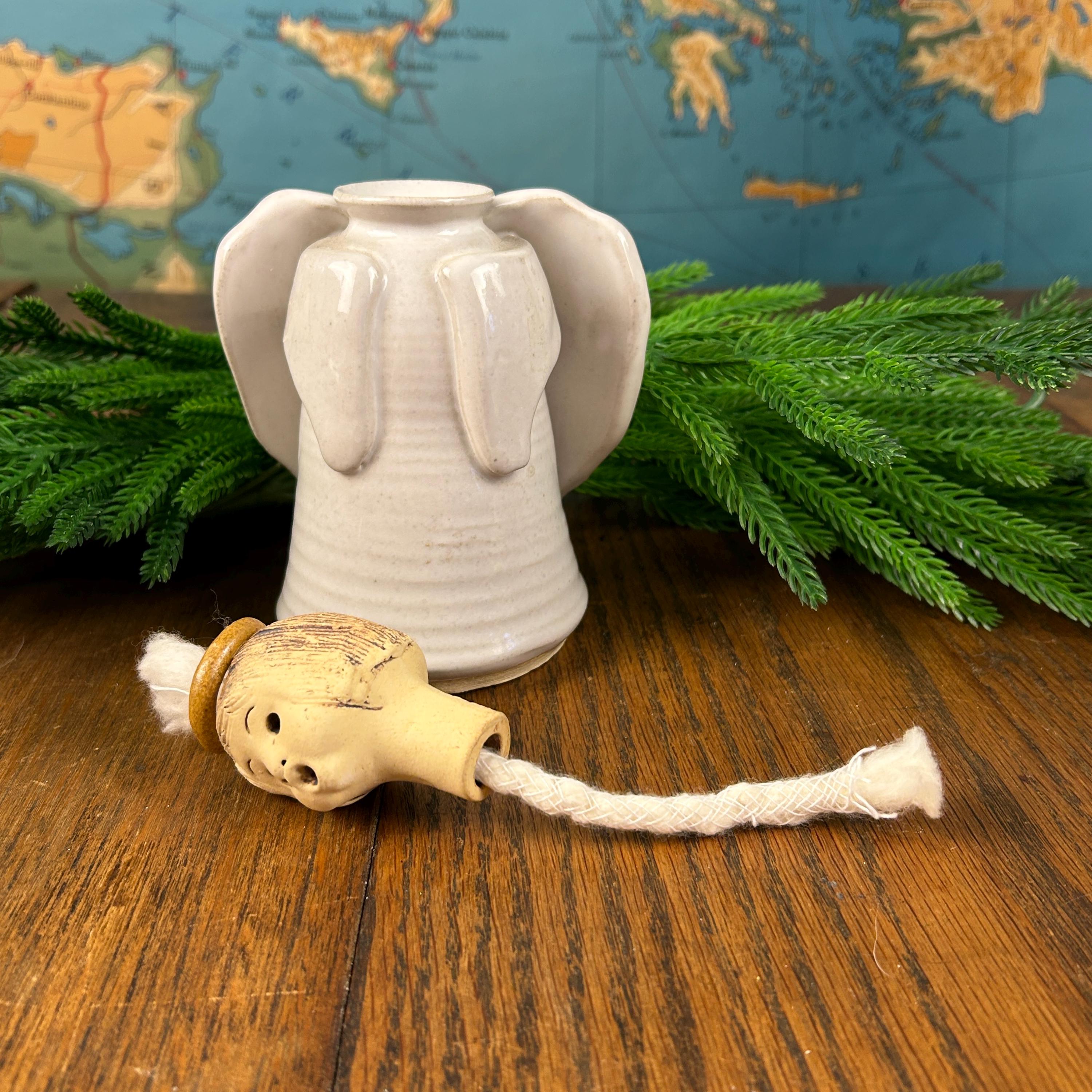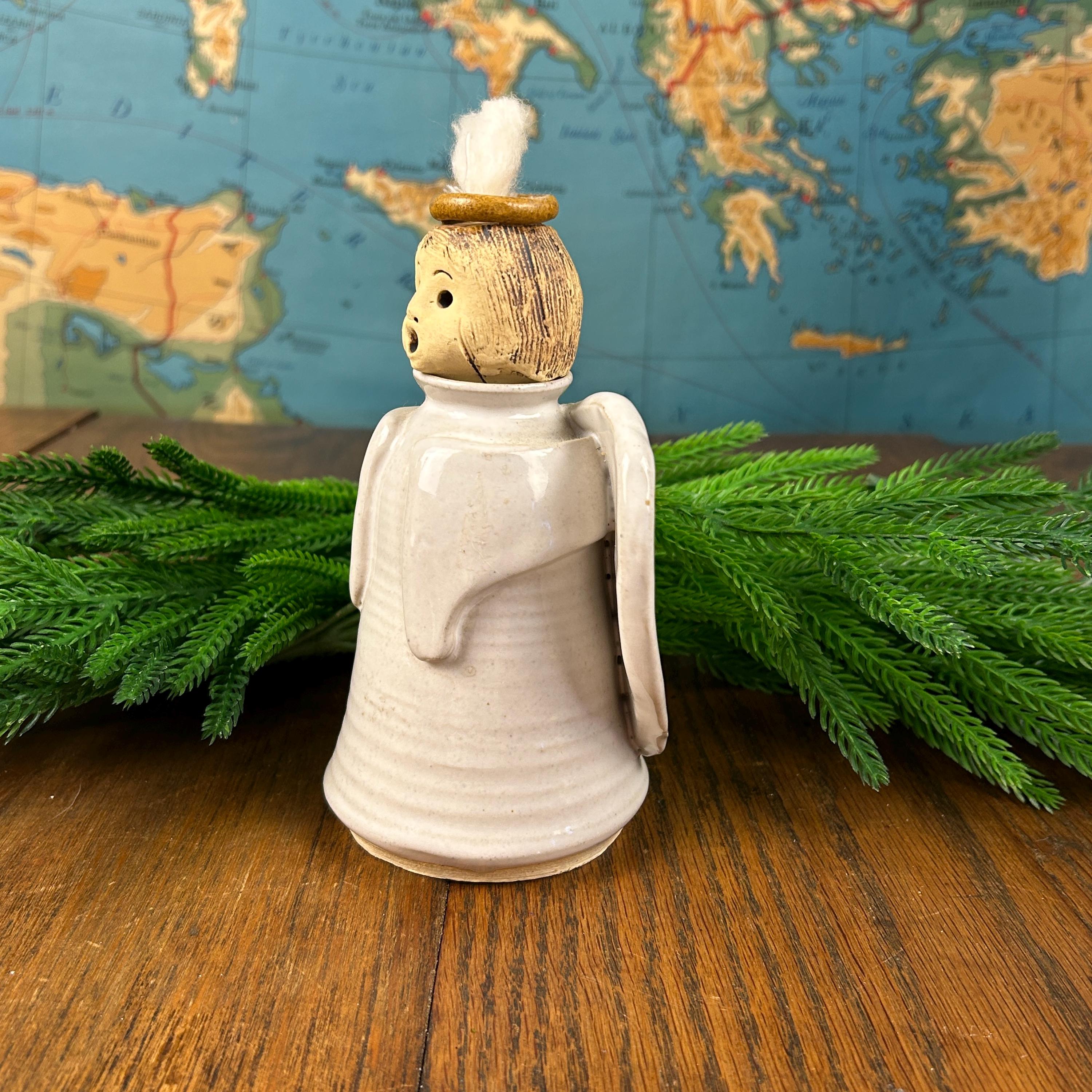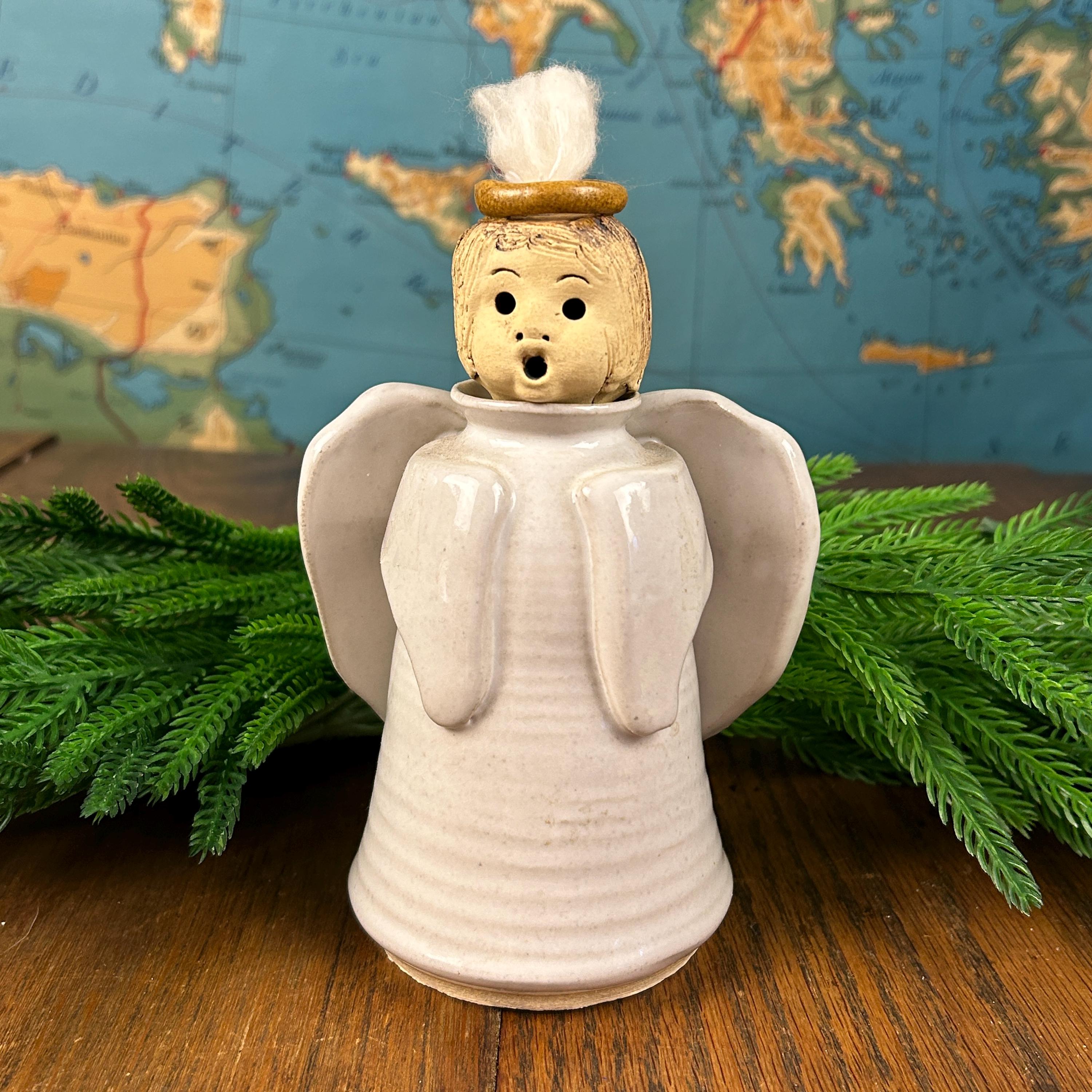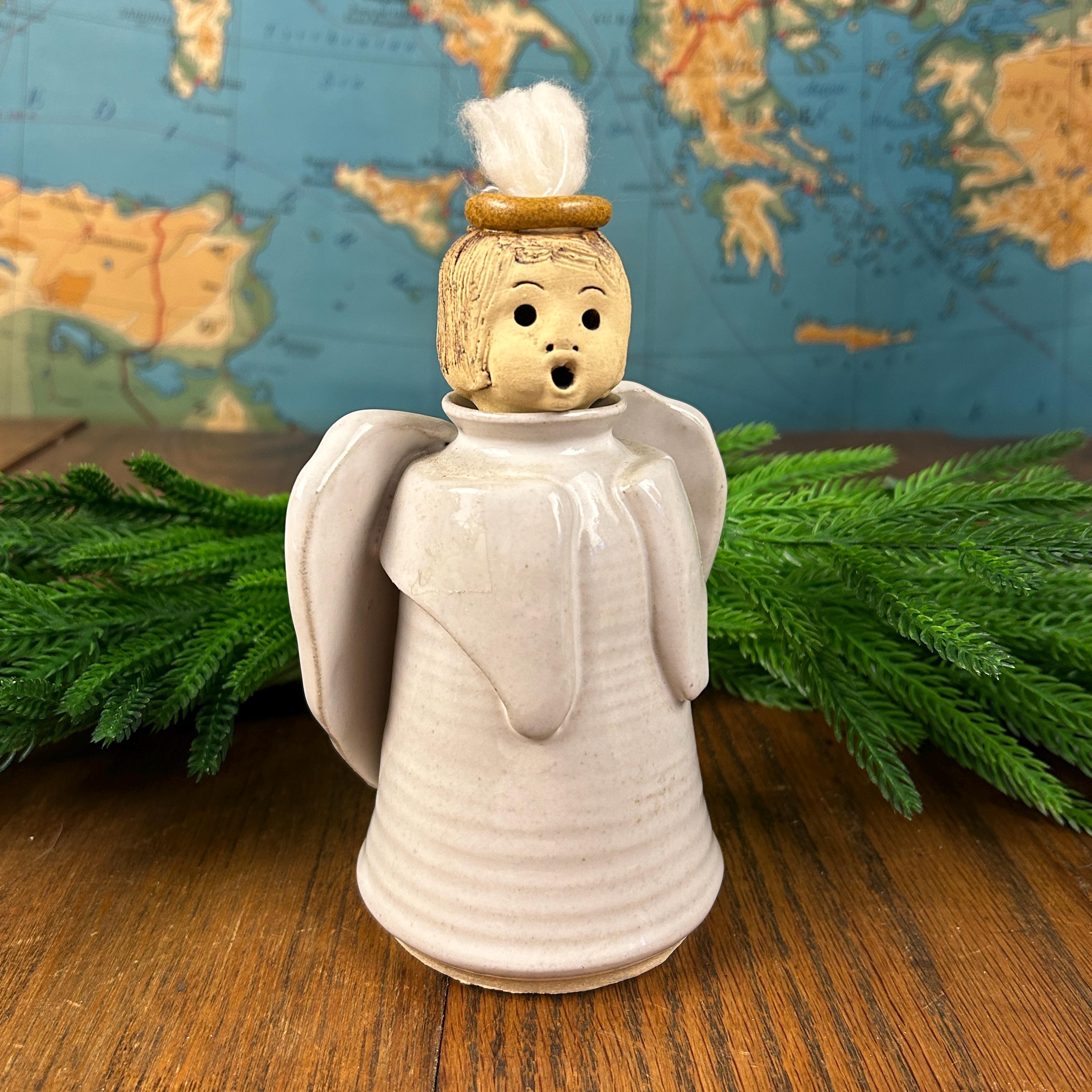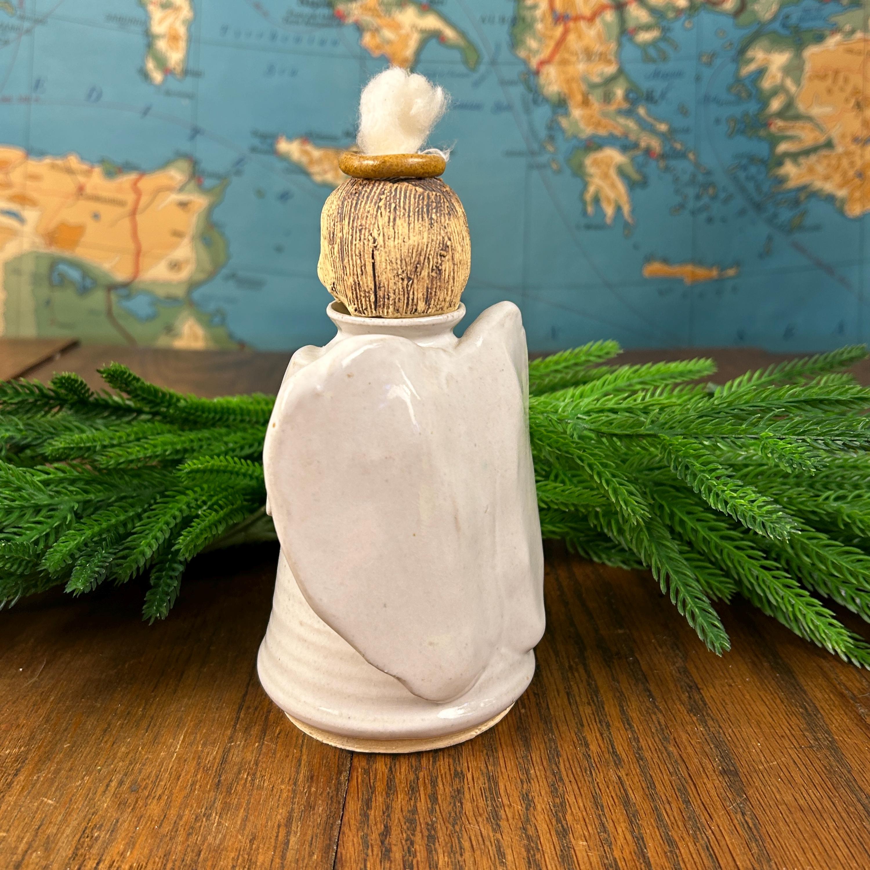 This is a vintage, handcrafted ceramic angel oil lamp made by artist Rita Ward of Pottery House at Terra Studios in the Ozarks of Arkansas. The lamp is designed as an angel figurine with a removable head to access the oil reservoir.