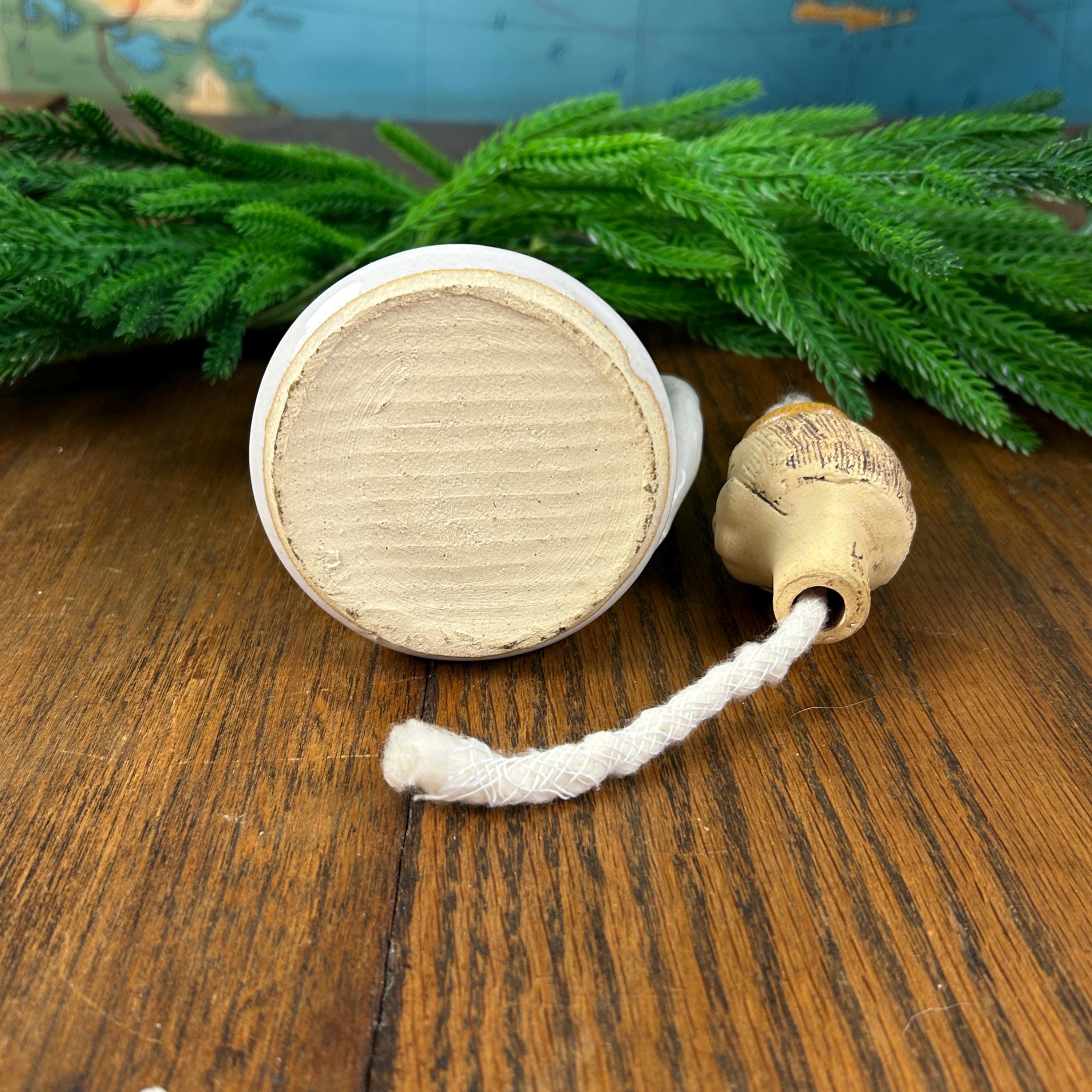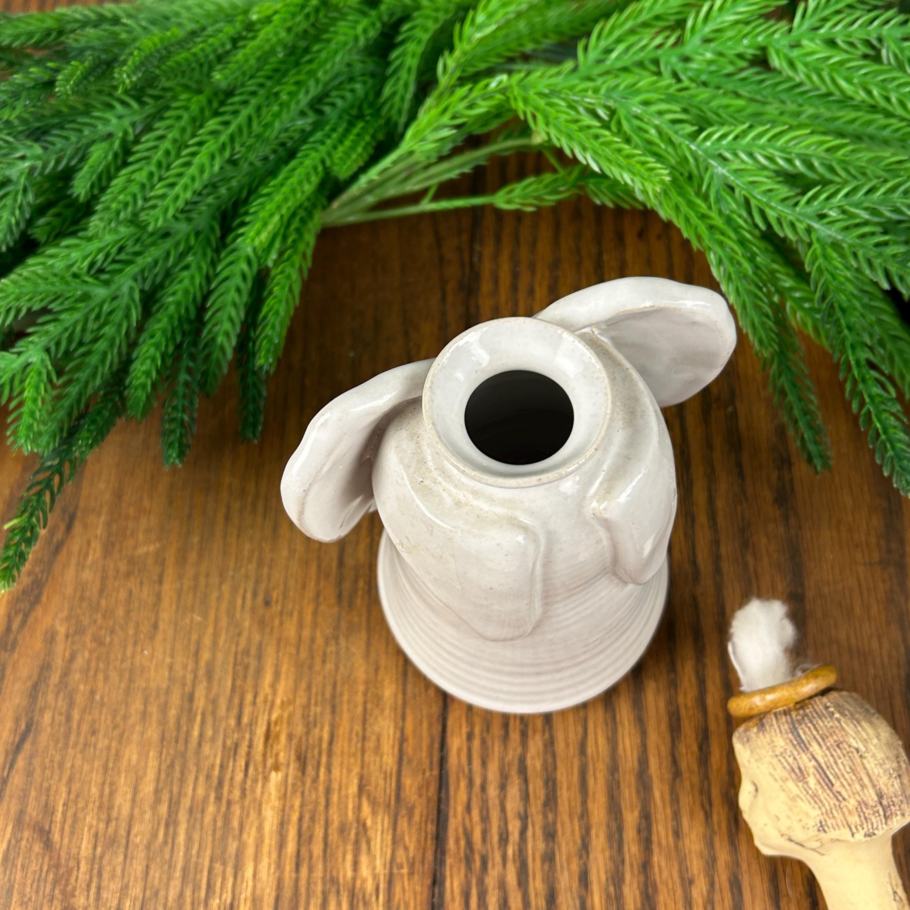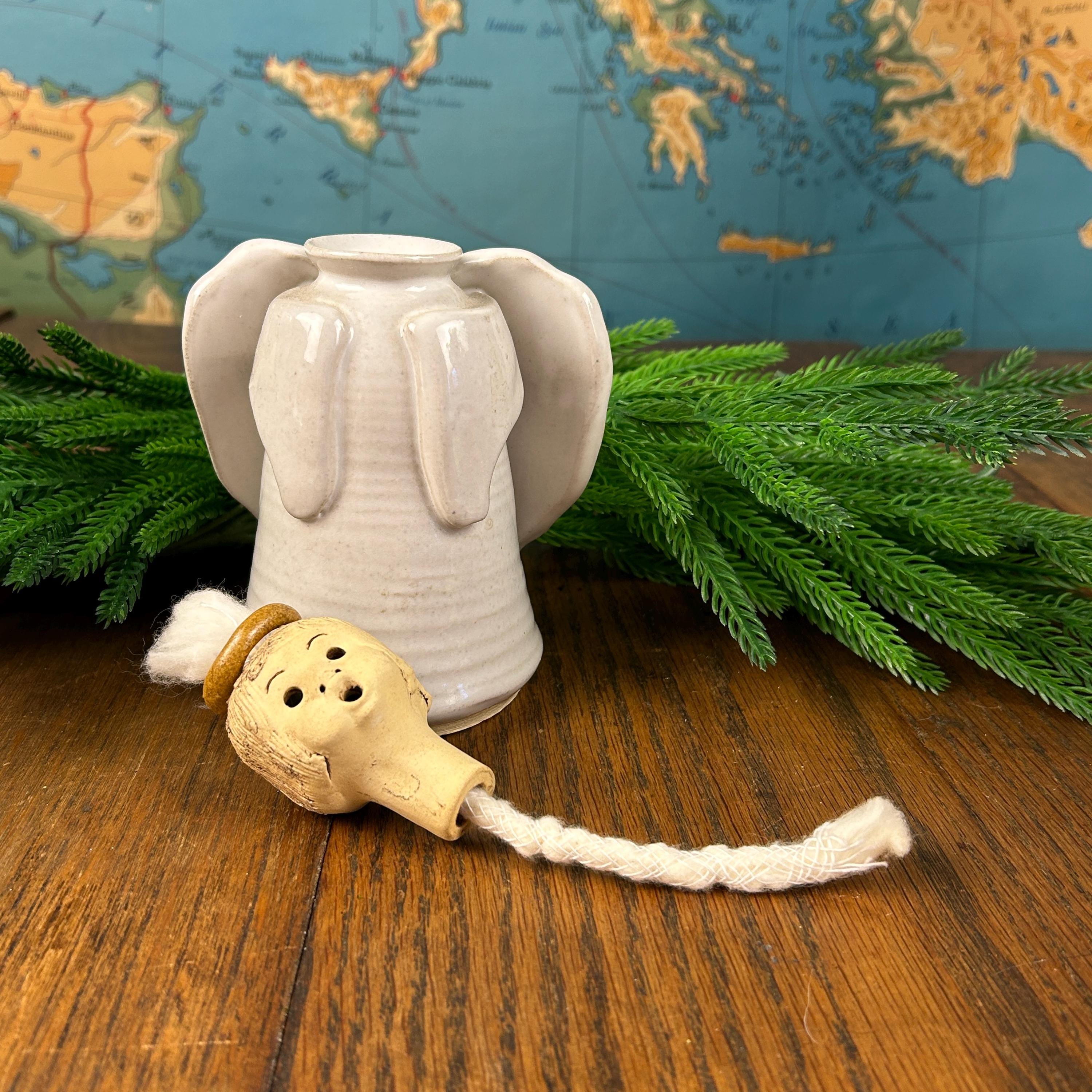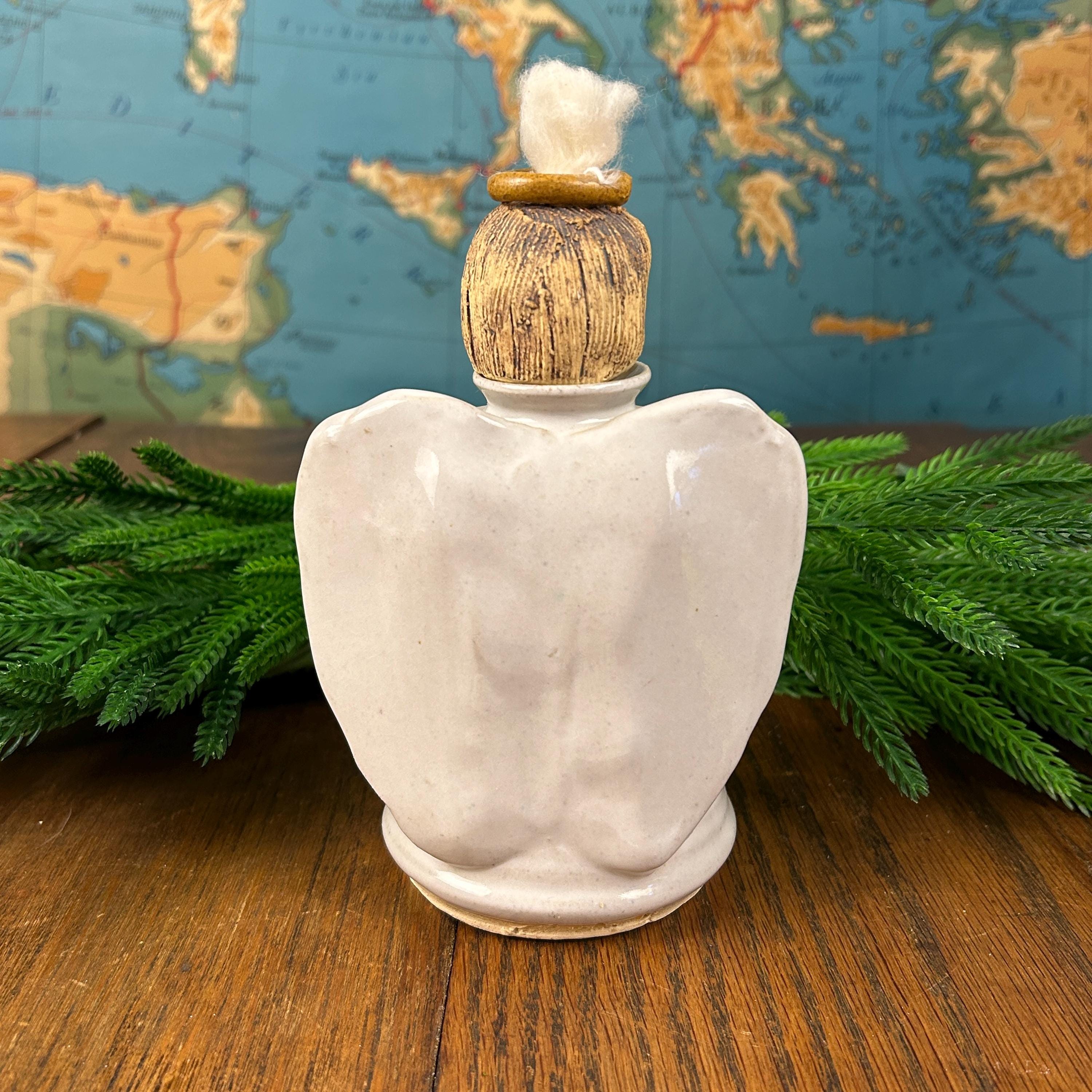 This is a vintage, handcrafted ceramic angel oil lamp made by artist Rita Ward of Pottery House at Terra Studios in the Ozarks of Arkansas. The lamp is designed as an angel figurine with a removable head to access the oil reservoir.
