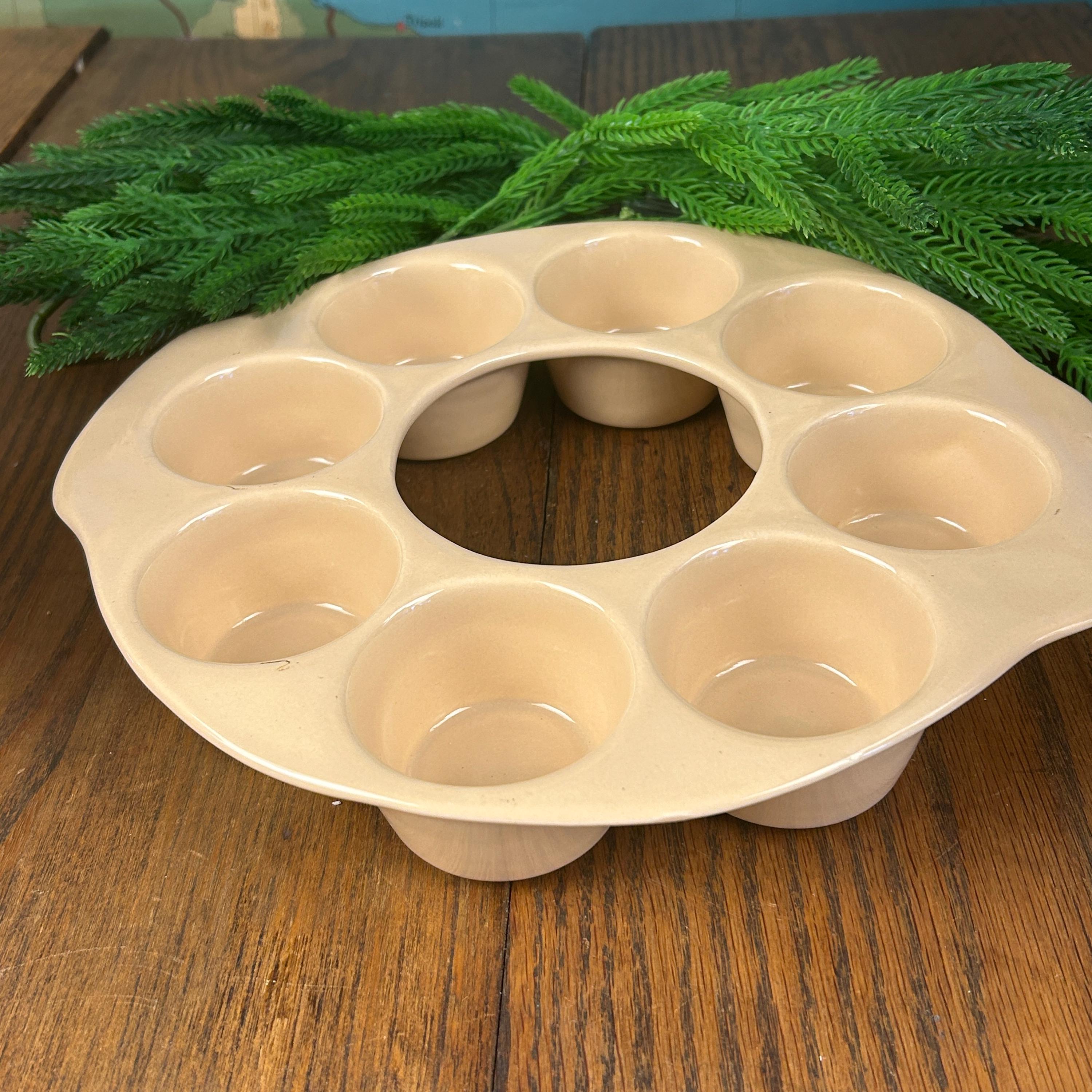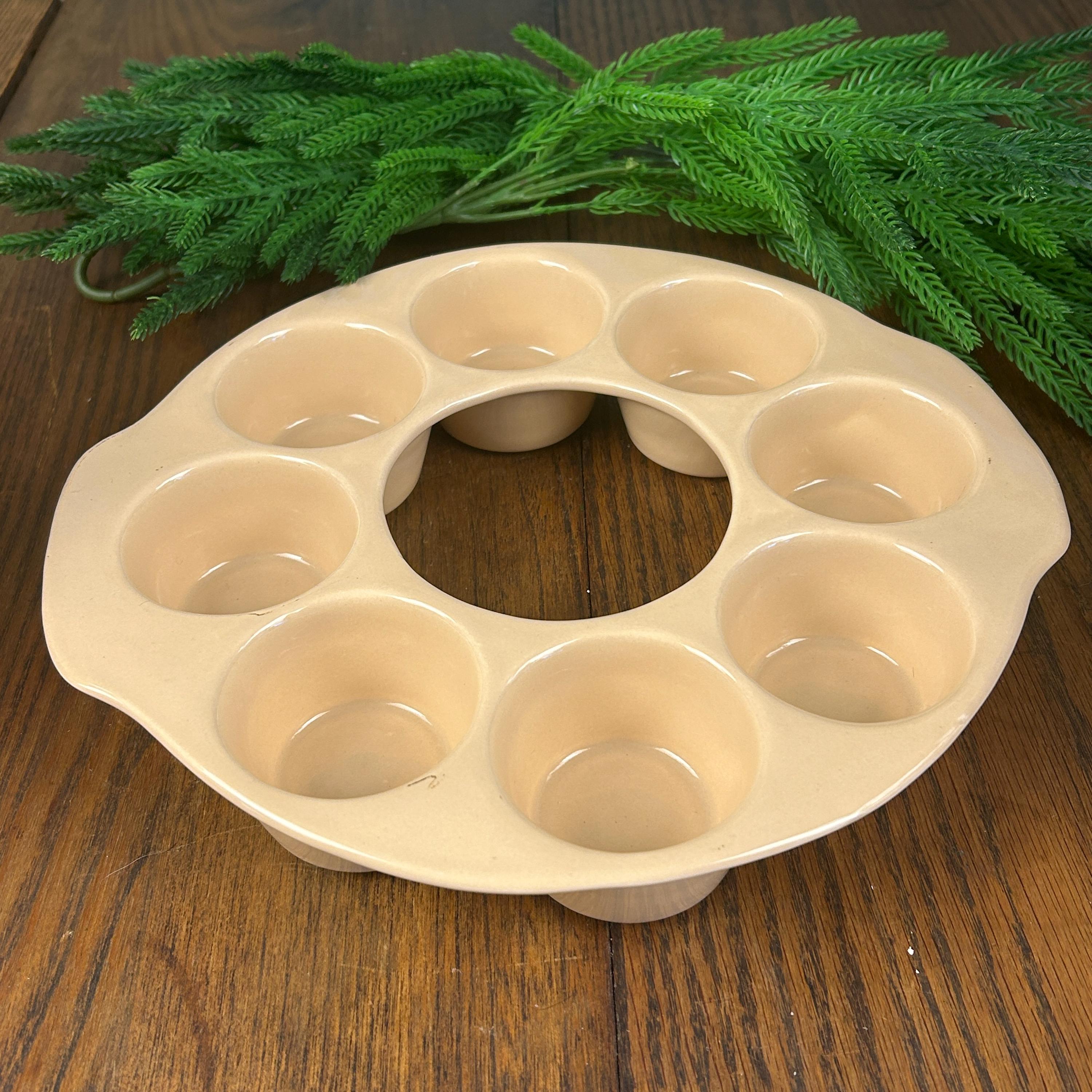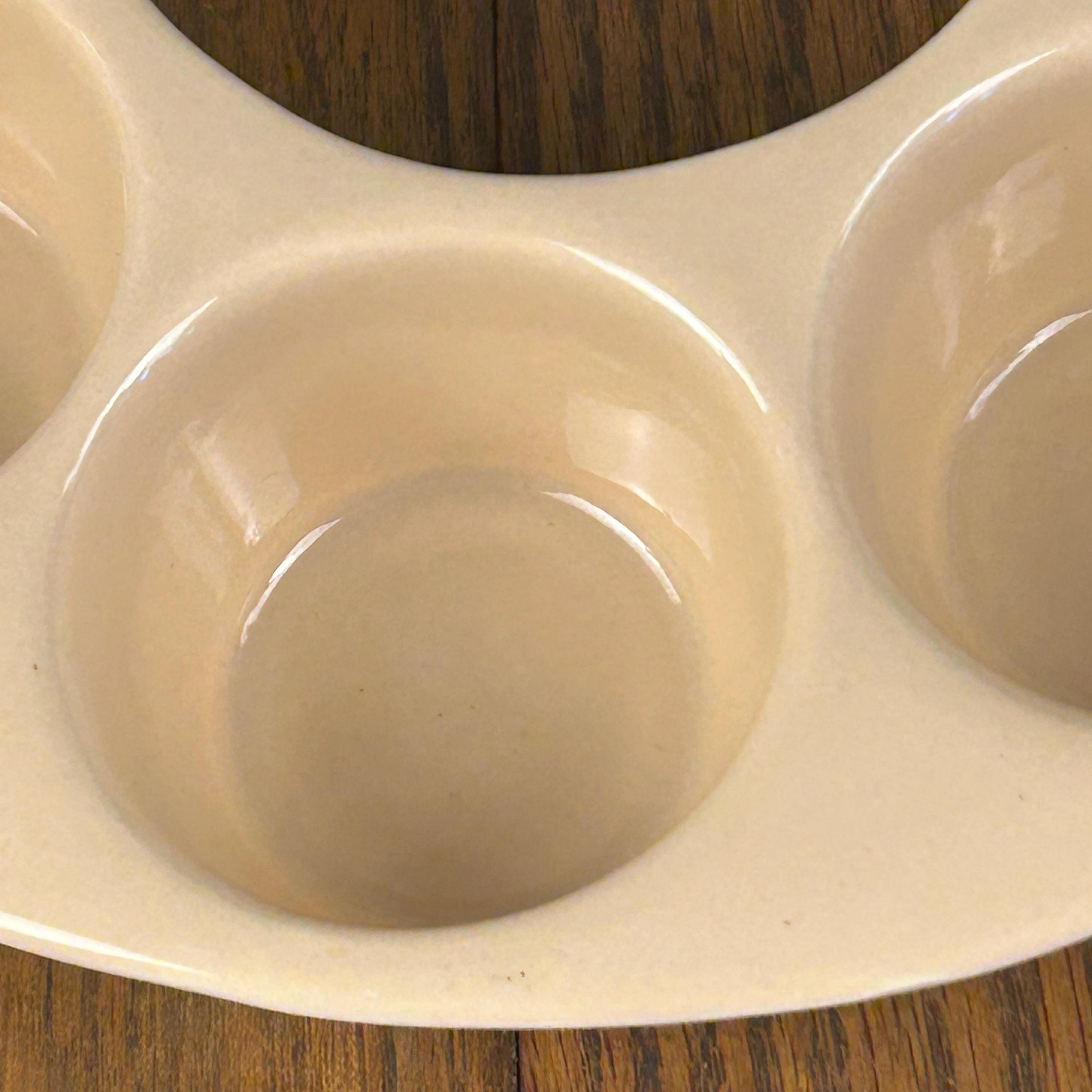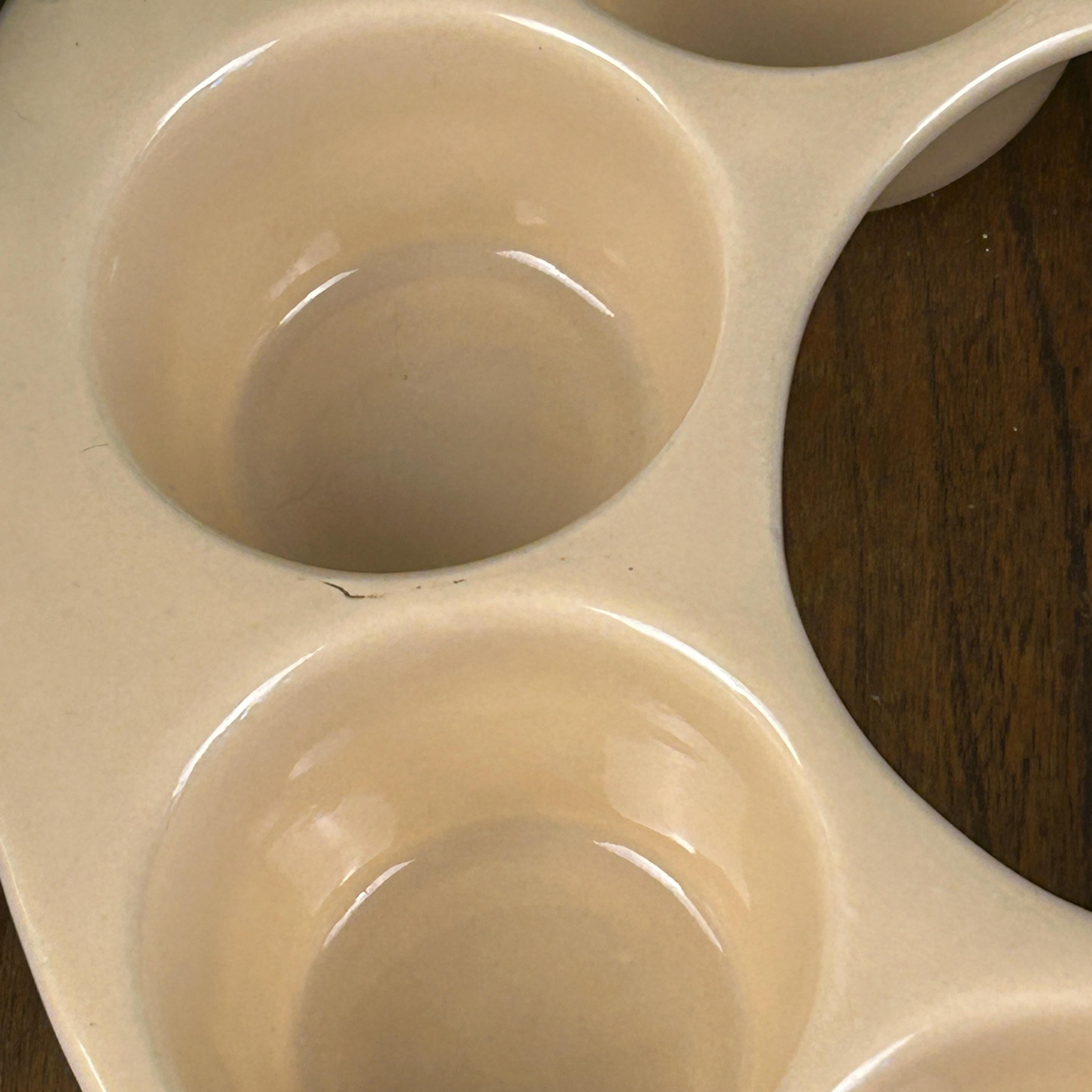 This is a vintage, round, beige stoneware muffin pan made in the USA by El Camino. It has 8 compartments and is designed for baking single deep dish muffins. The pan is in excellent condition. The pan is made using a pottery production technique and has a unique shape that makes it stand out from other muffin pans.
