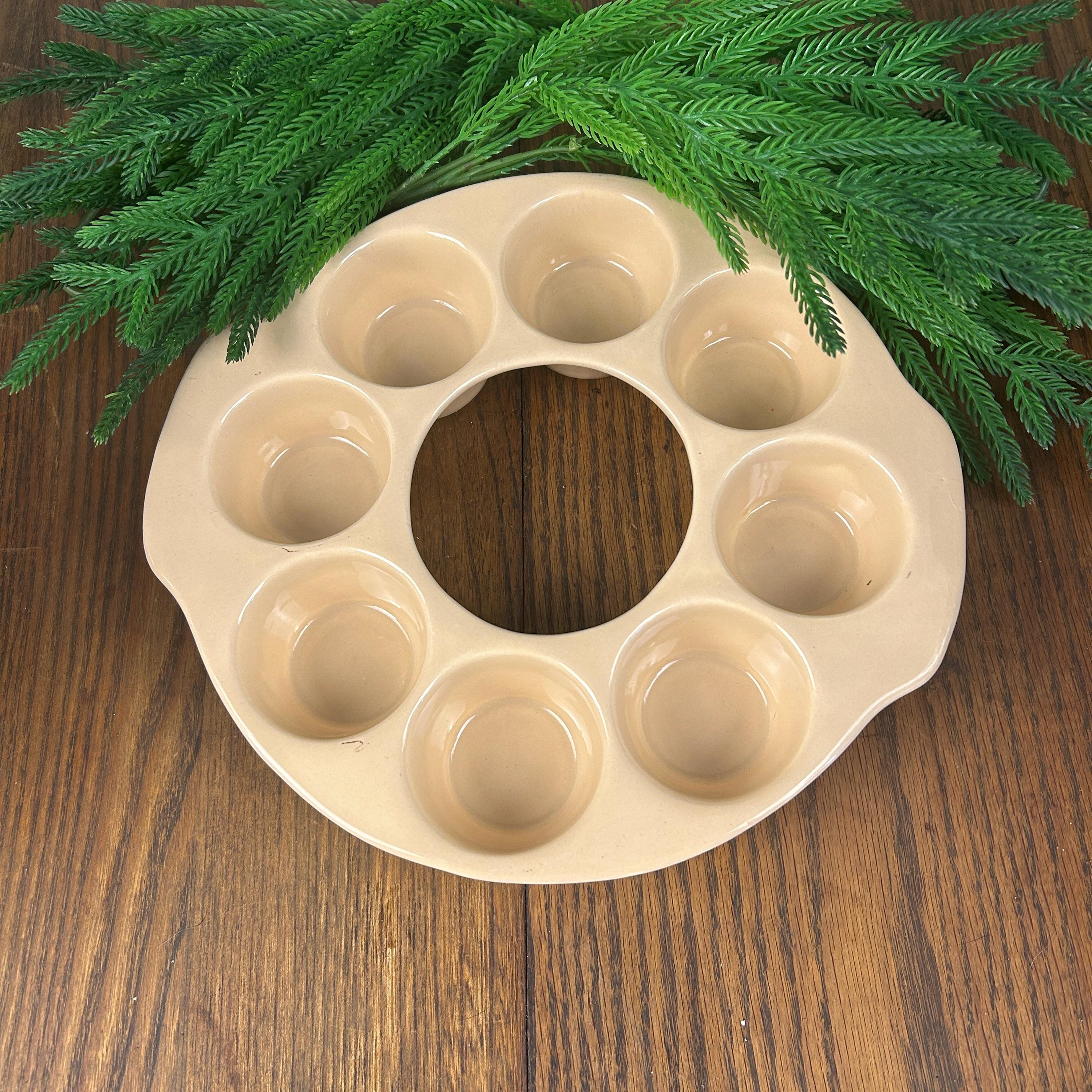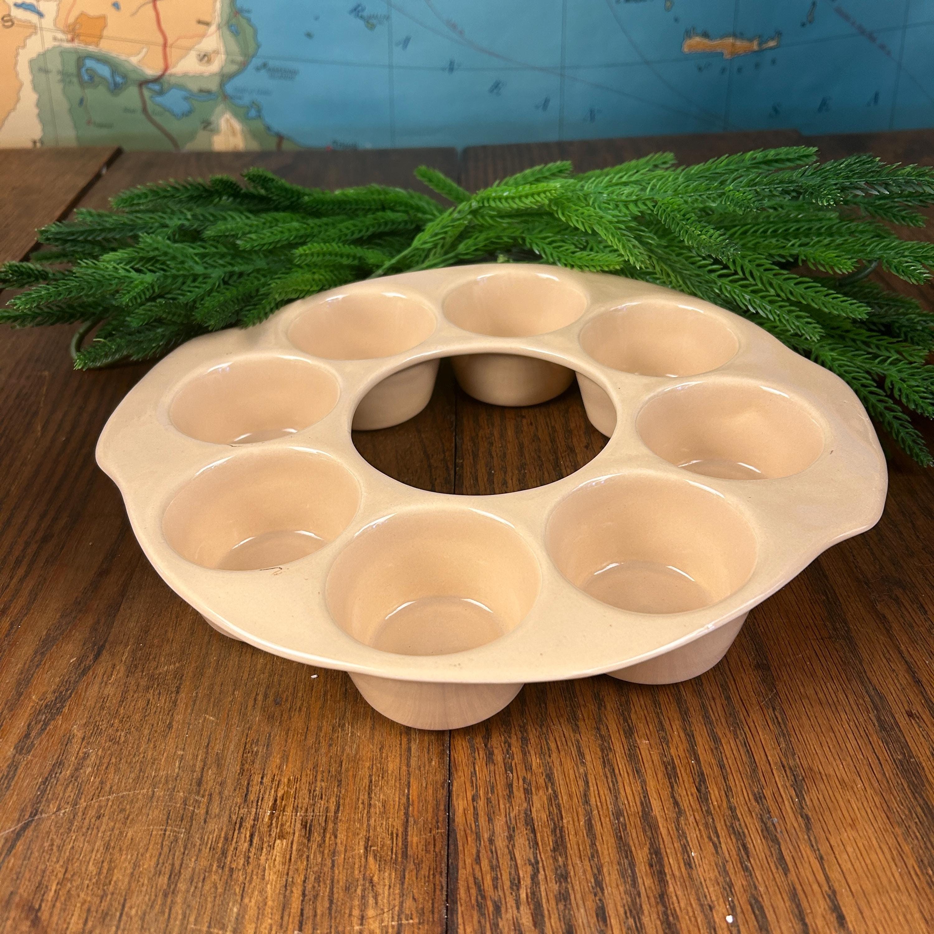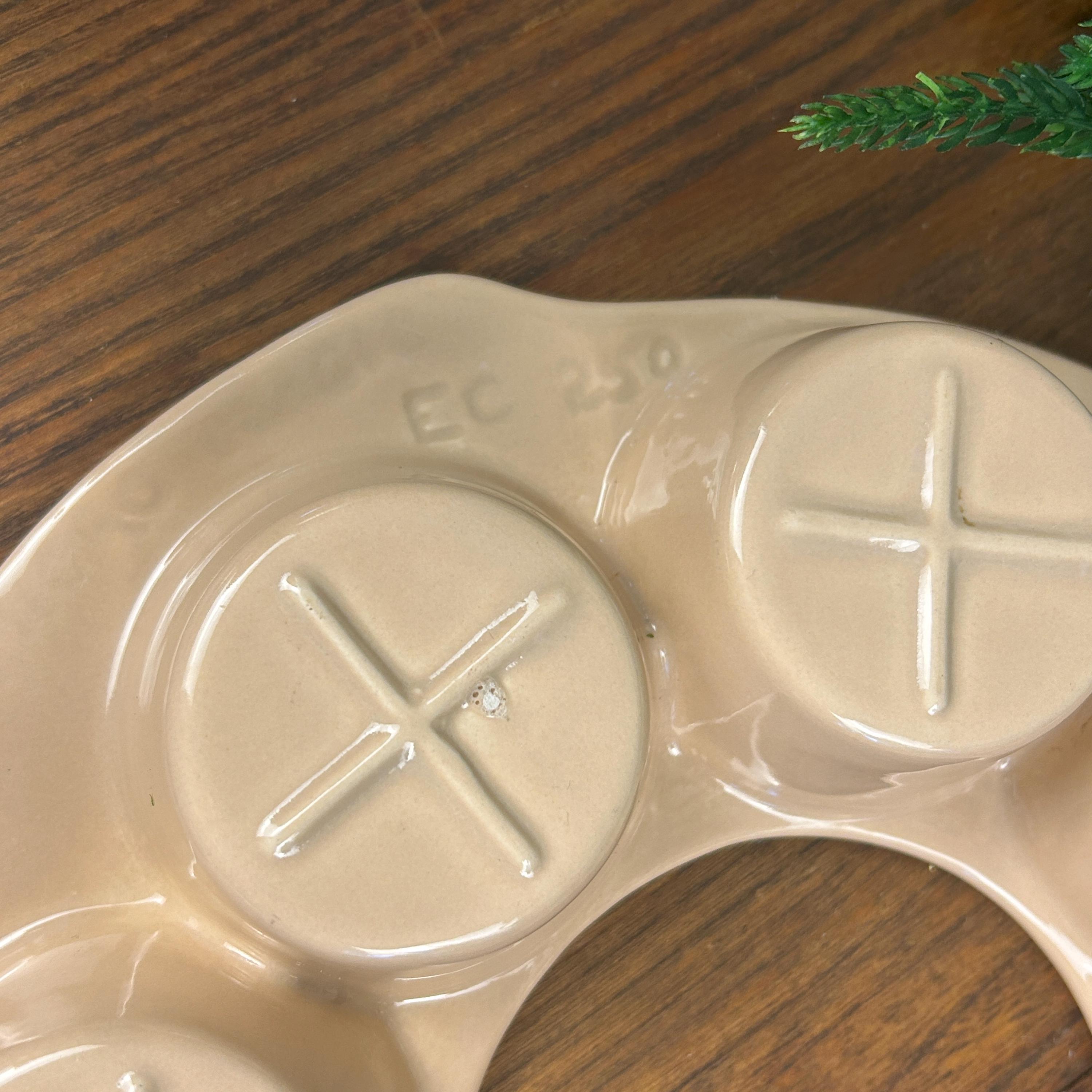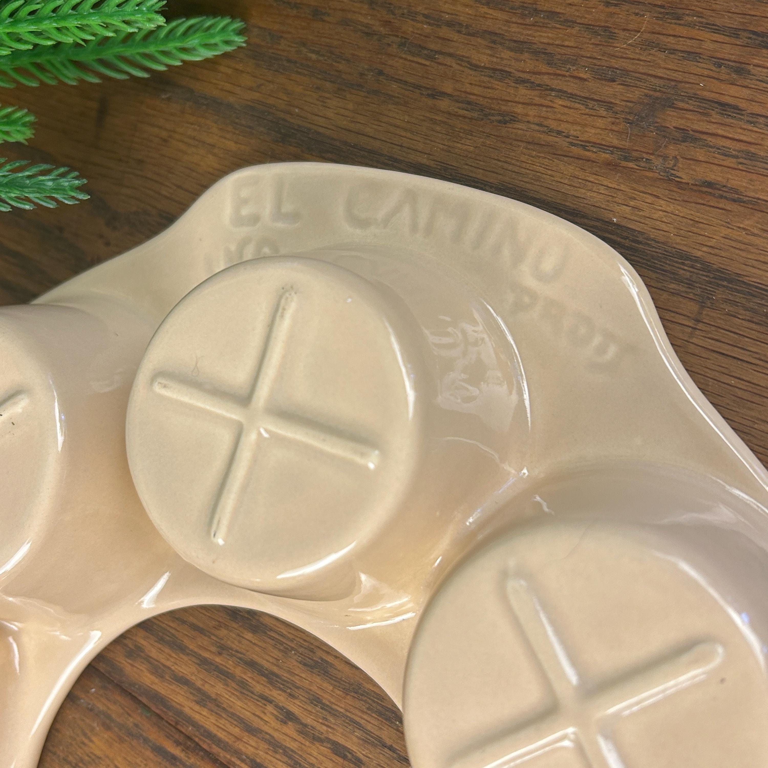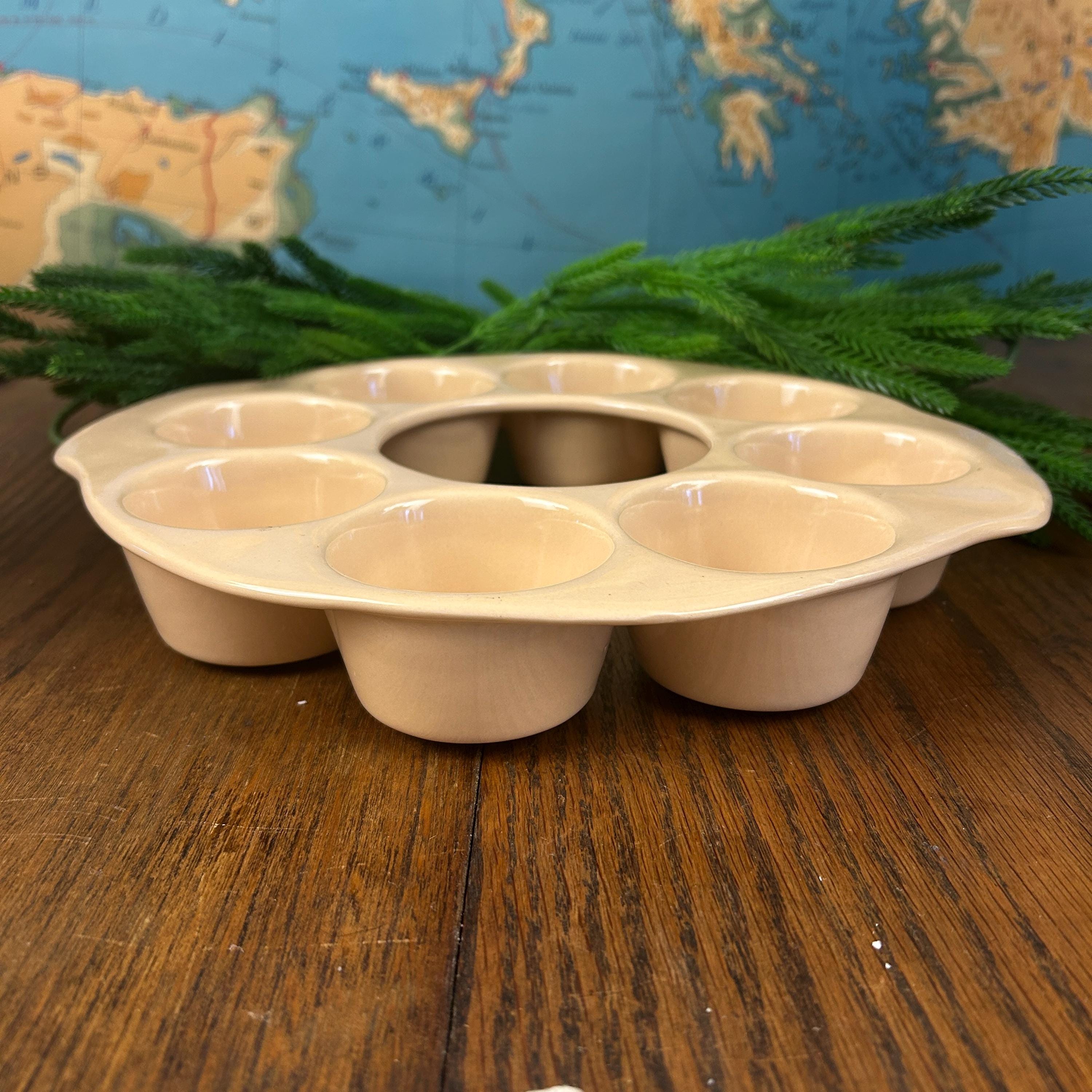 This is a vintage, round, beige stoneware muffin pan made in the USA by El Camino. It has 8 compartments and is designed for baking single deep dish muffins. The pan is in excellent condition. The pan is made using a pottery production technique and has a unique shape that makes it stand out from other muffin pans.