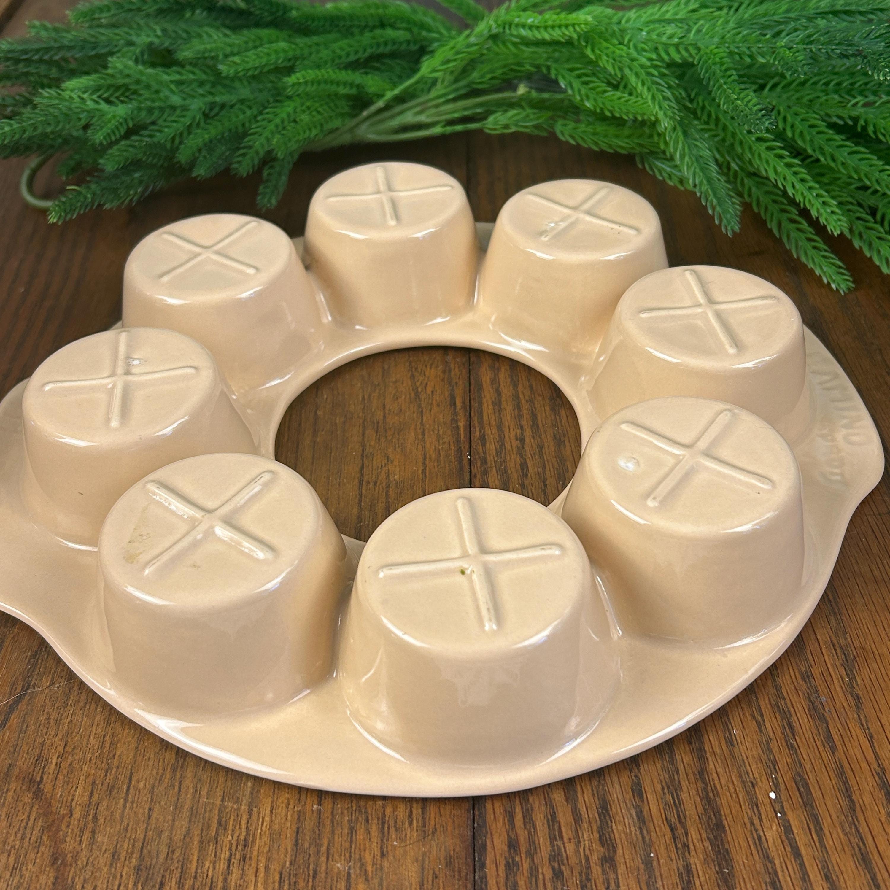 Design: The pan is round, beige or tan in color, and features eight deep-dish compartments for baking.