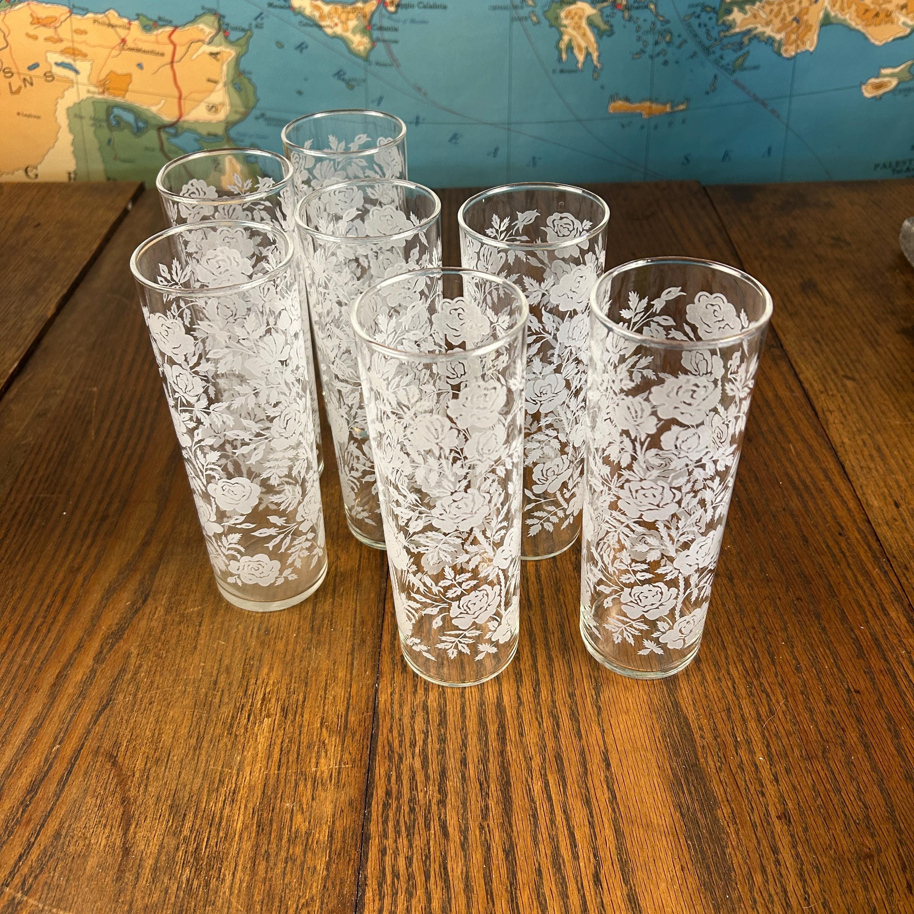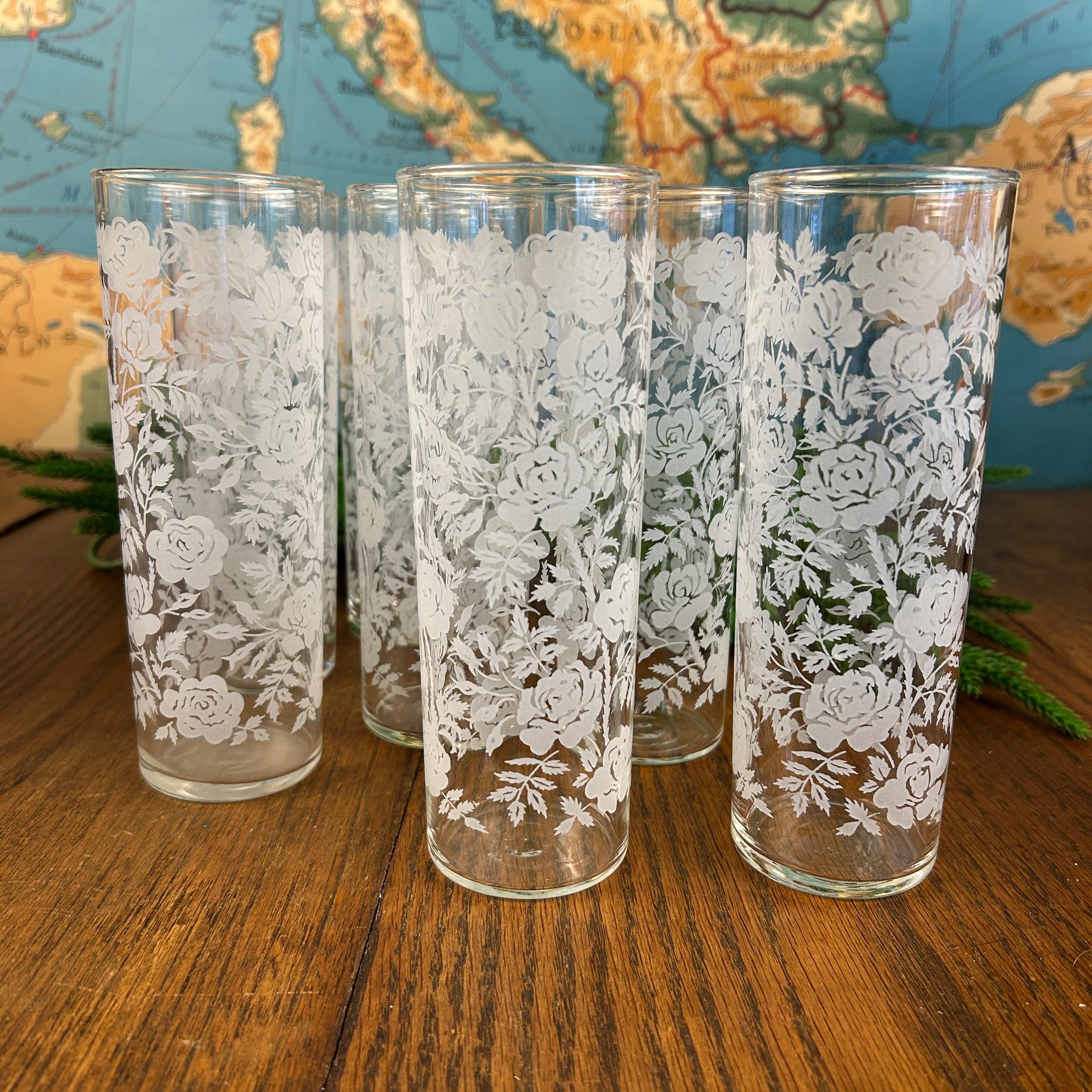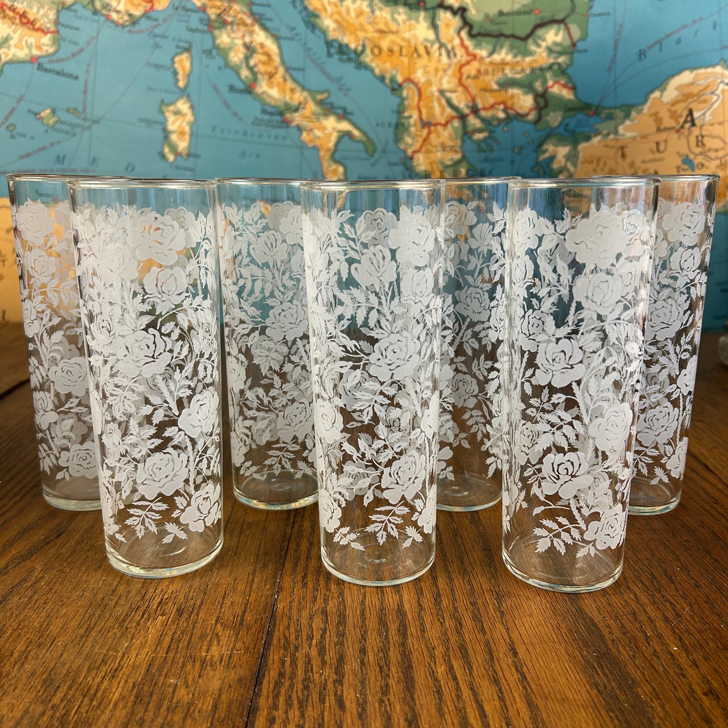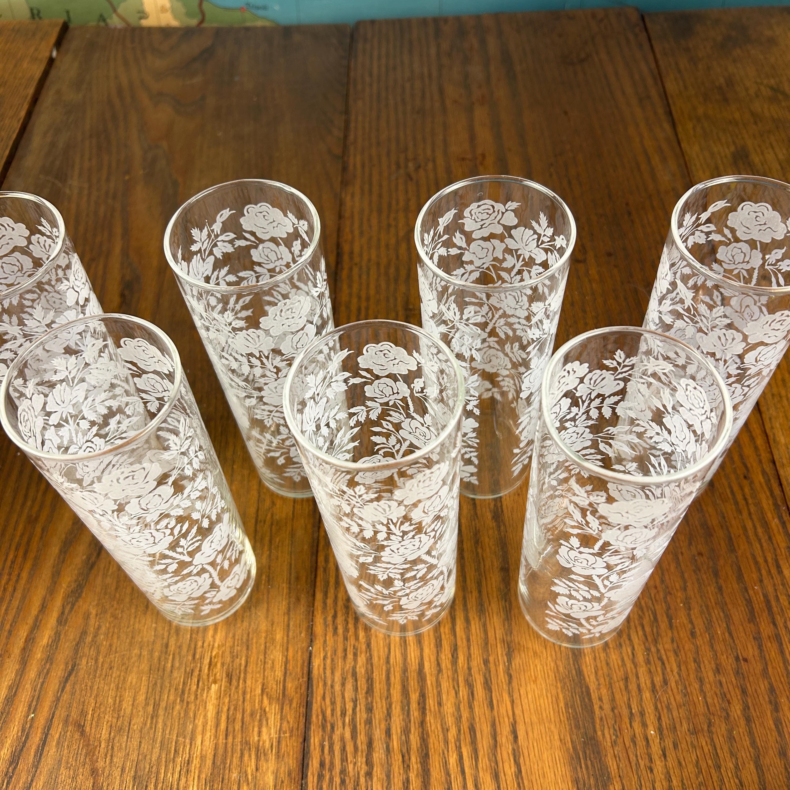 Add a touch of vintage elegance to your drinkware collection with this set of seven Libbey beverage or highball glasses. The glasses feature a beautiful white rose pattern on a round shape, making them perfect for any formal occasion or cocktail party. The glasses are made of fused glass with a glossy finish, and are decorated with a touch of class. These vintage original glasses are perfect for any collector or lover of elegant glassware. These will not disappoint you. They are beautiful and timeless. Very unique Barware or perfect for dressing up your casual dining.