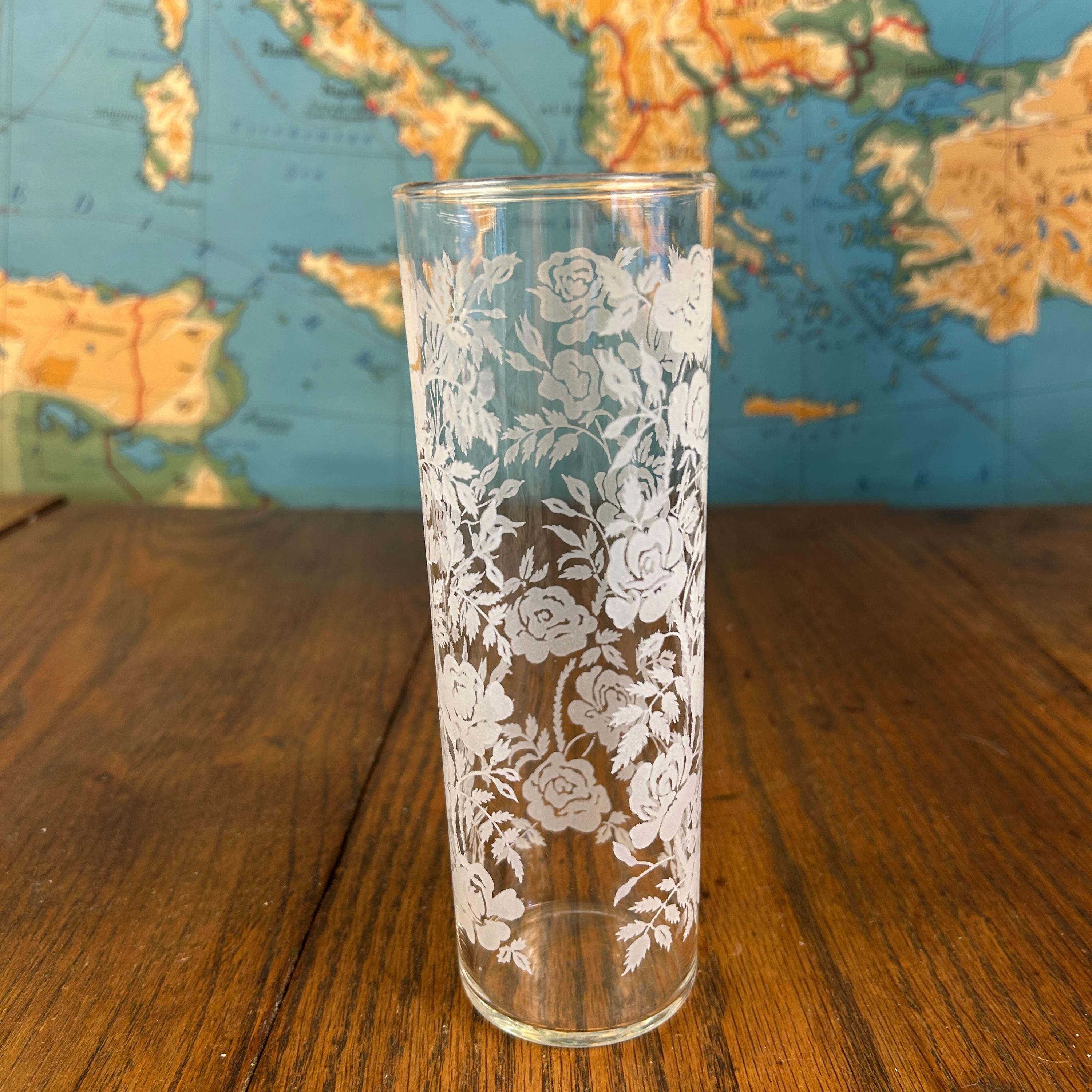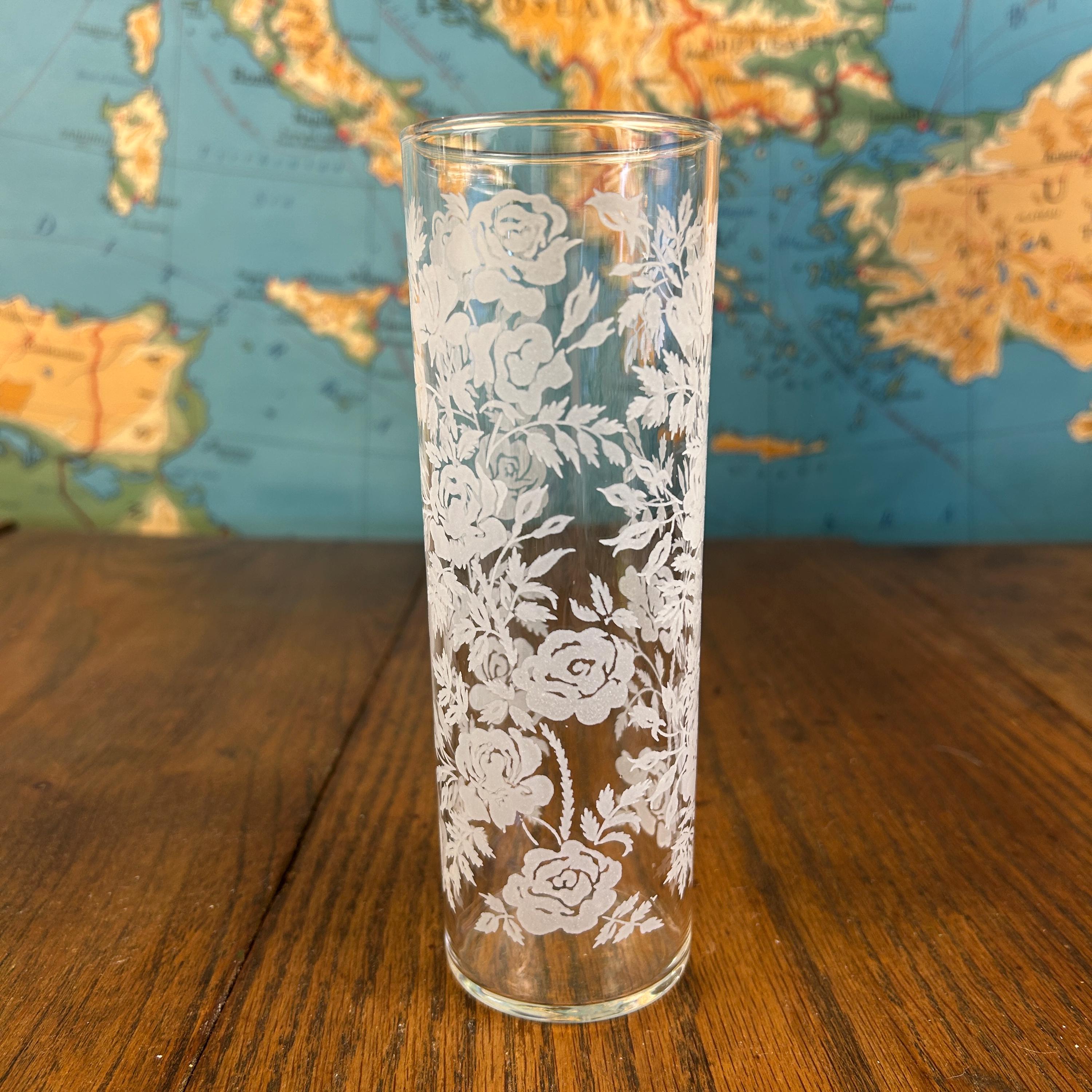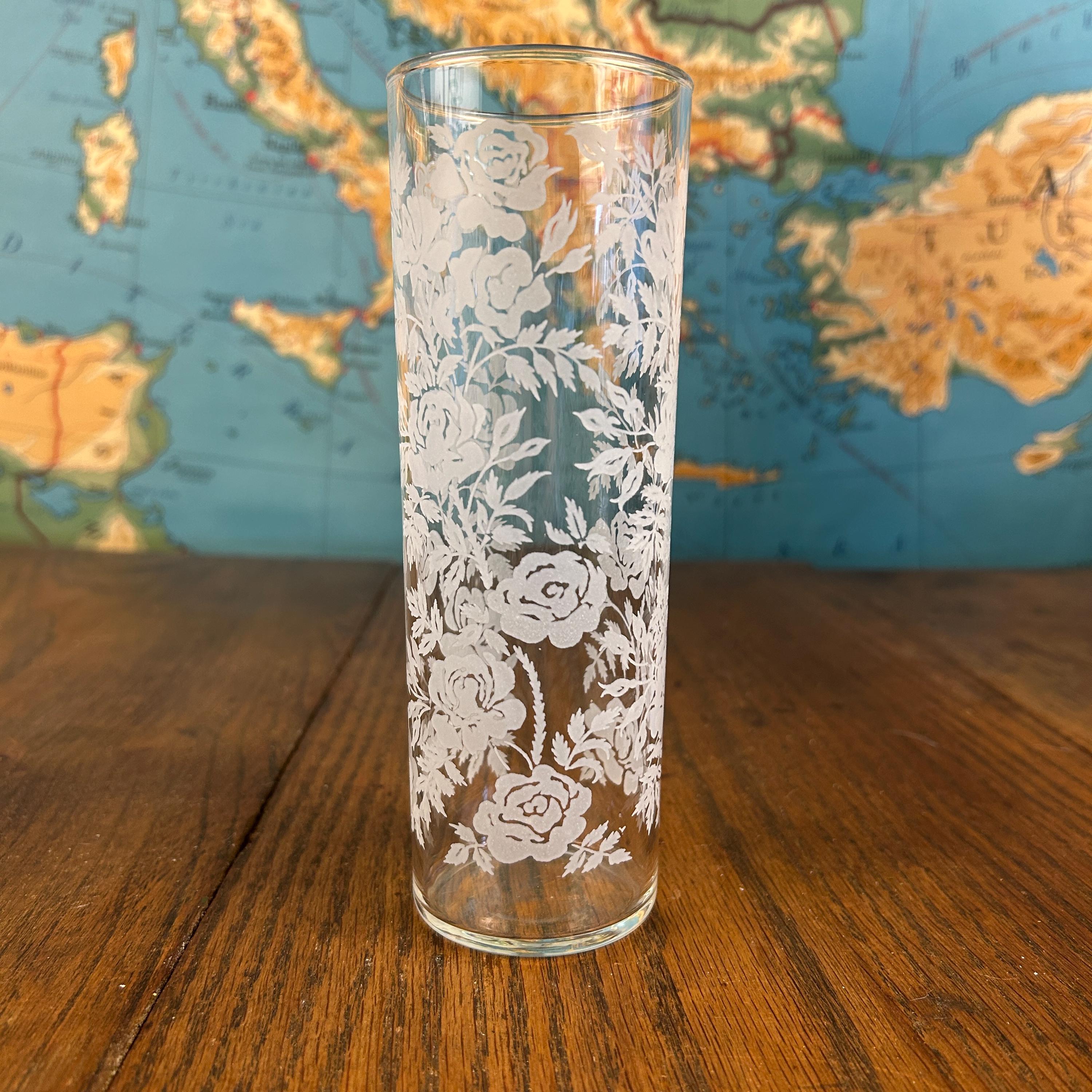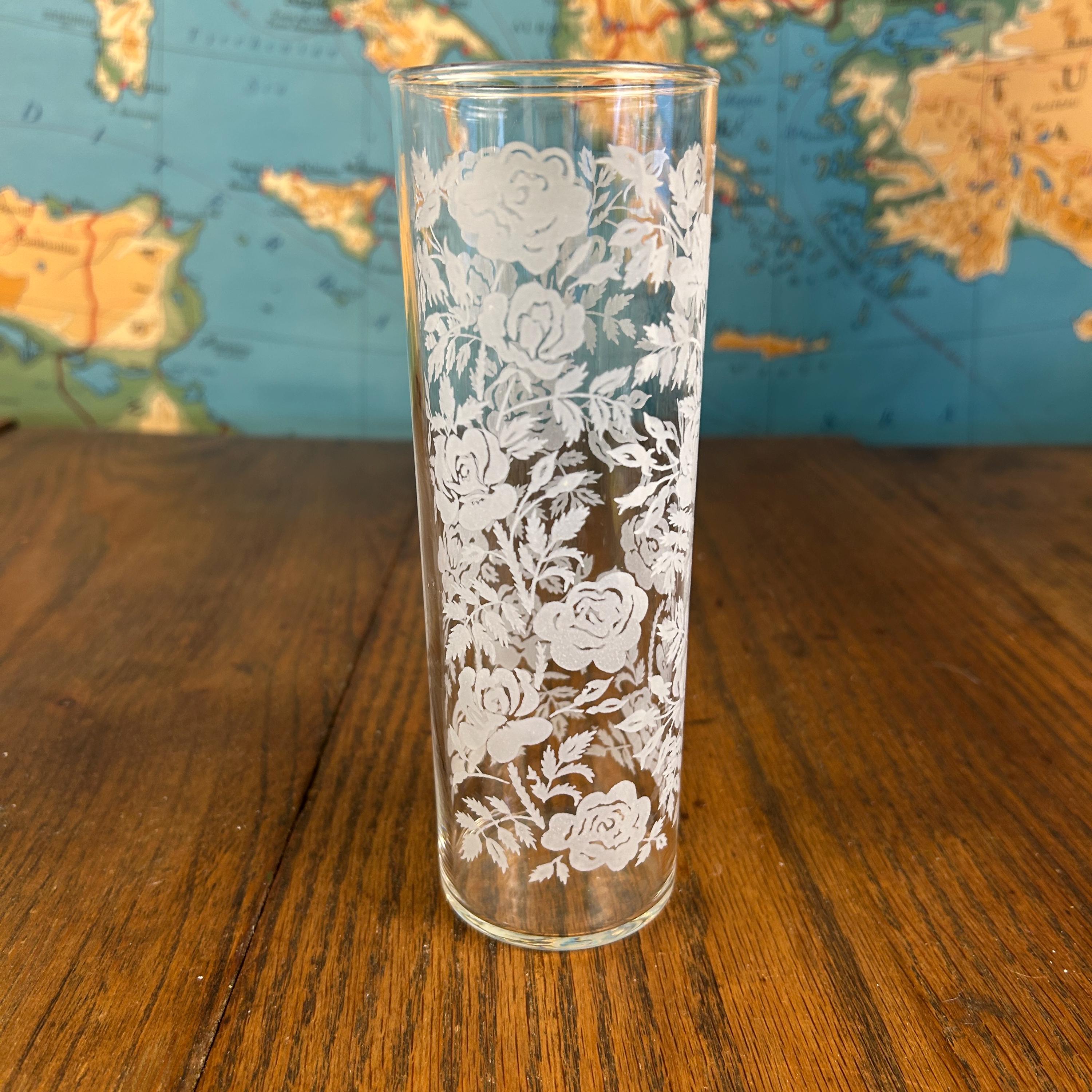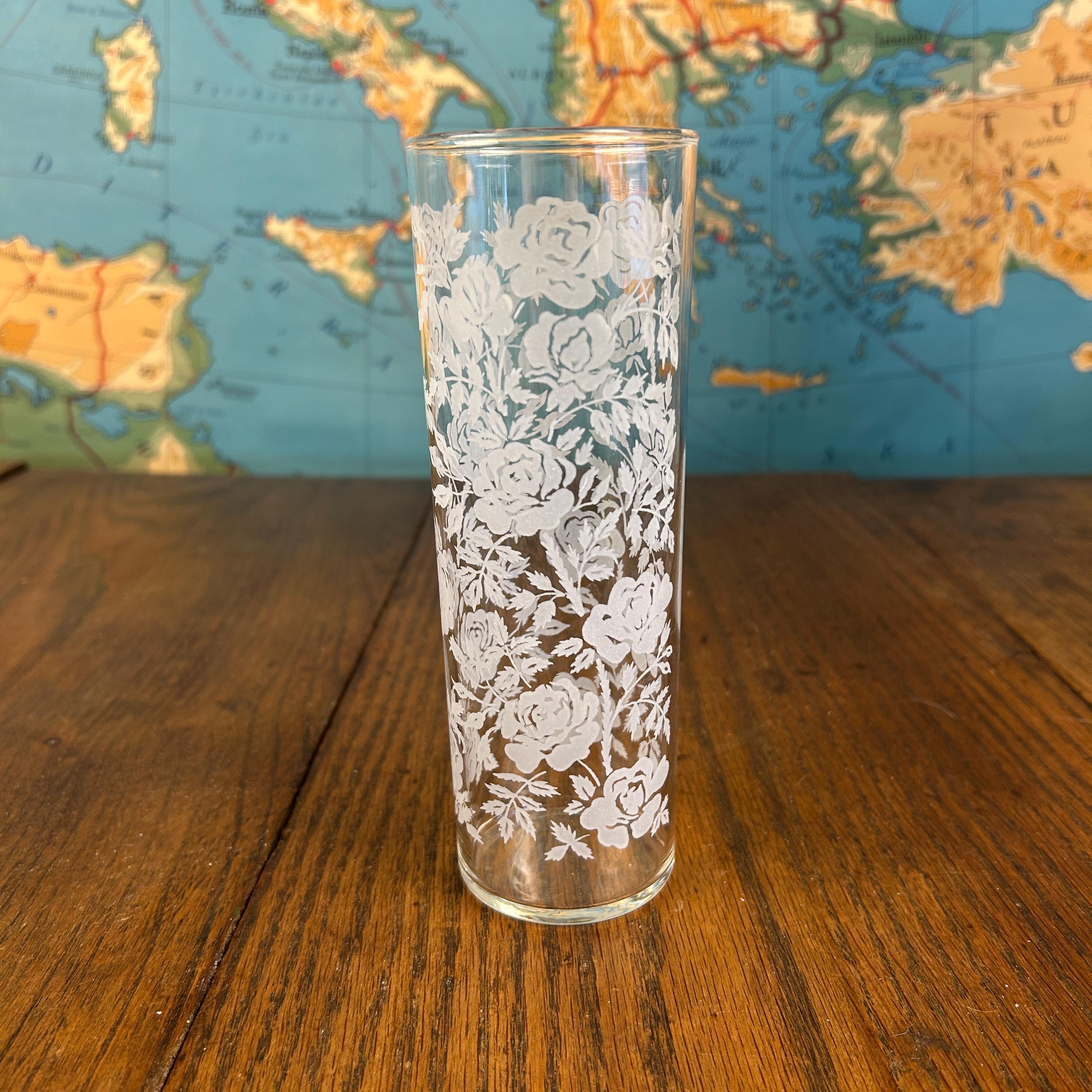 Add a touch of vintage elegance to your drinkware collection with this set of seven Libbey beverage or highball glasses. The glasses feature a beautiful white rose pattern on a round shape, making them perfect for any formal occasion or cocktail party. The glasses are made of fused glass with a glossy finish, and are decorated with a touch of class. These vintage original glasses are perfect for any collector or lover of elegant glassware. These will not disappoint you. They are beautiful and timeless. Very unique Barware or perfect for dressing up your casual dining.