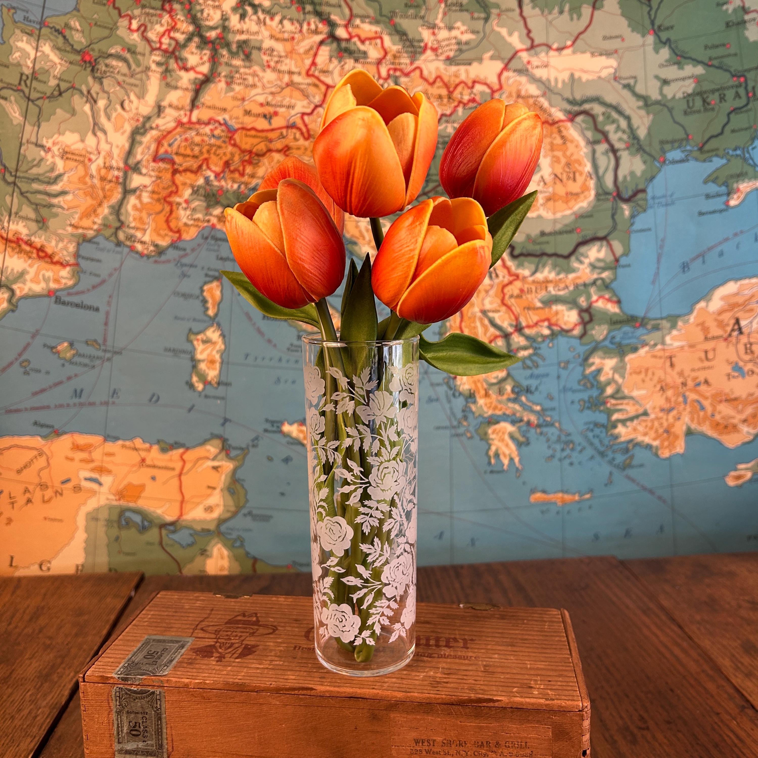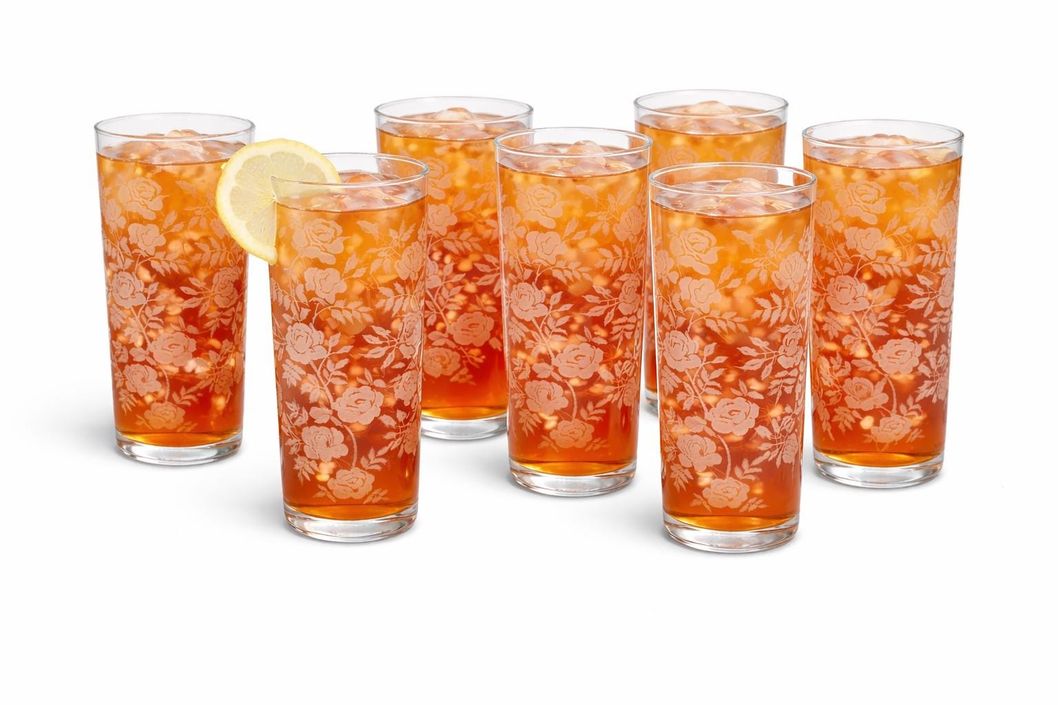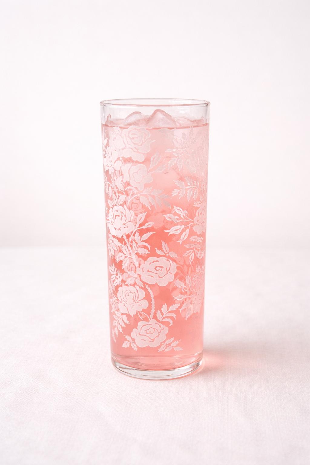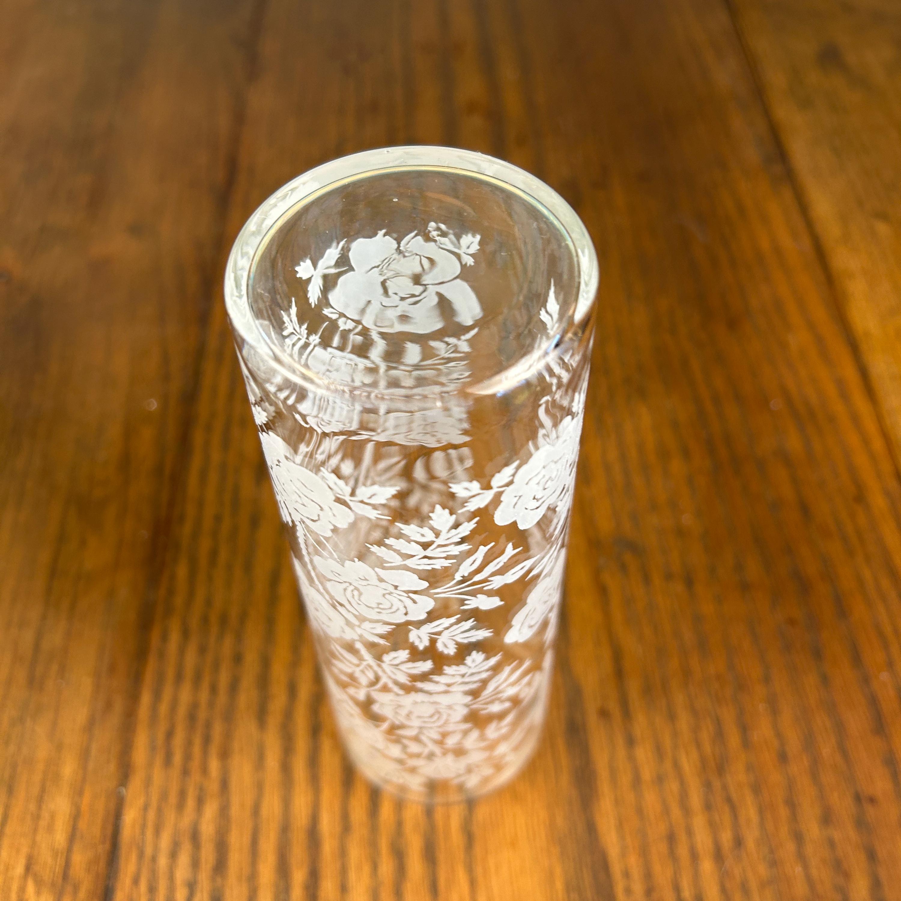 Add a touch of vintage elegance to your drinkware collection with this set of seven Libbey beverage or highball glasses. The glasses feature a beautiful white rose pattern on a round shape, making them perfect for any formal occasion or cocktail party. The glasses are made of fused glass with a glossy finish, and are decorated with a touch of class. These vintage original glasses are perfect for any collector or lover of elegant glassware. These will not disappoint you. They are beautiful and timeless. Very unique Barware or perfect for dressing up your casual dining.