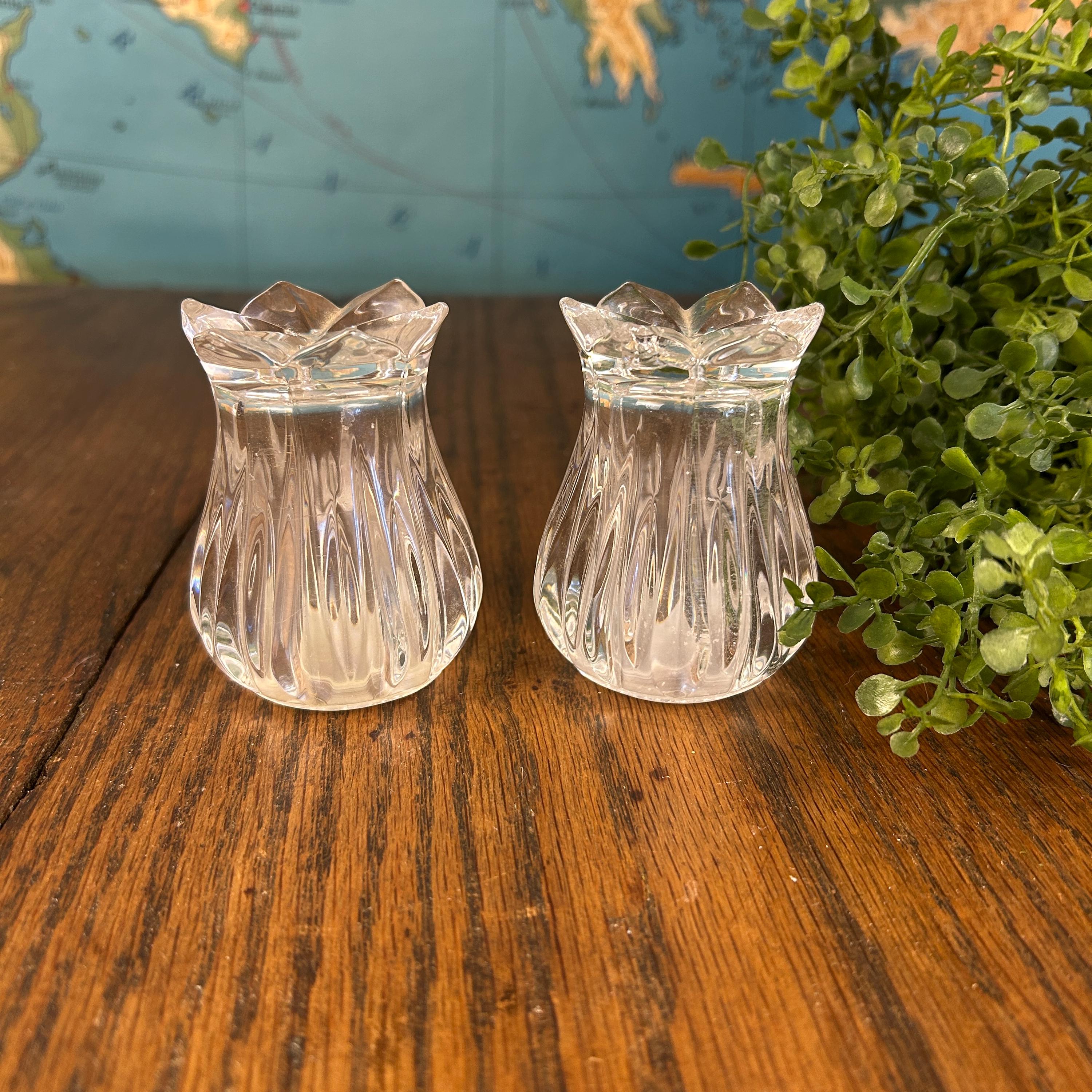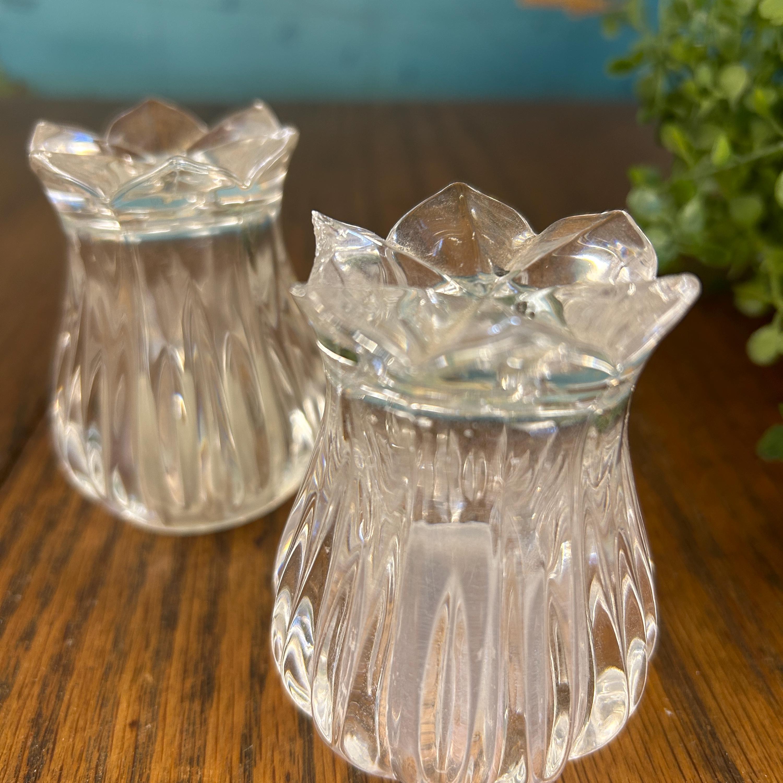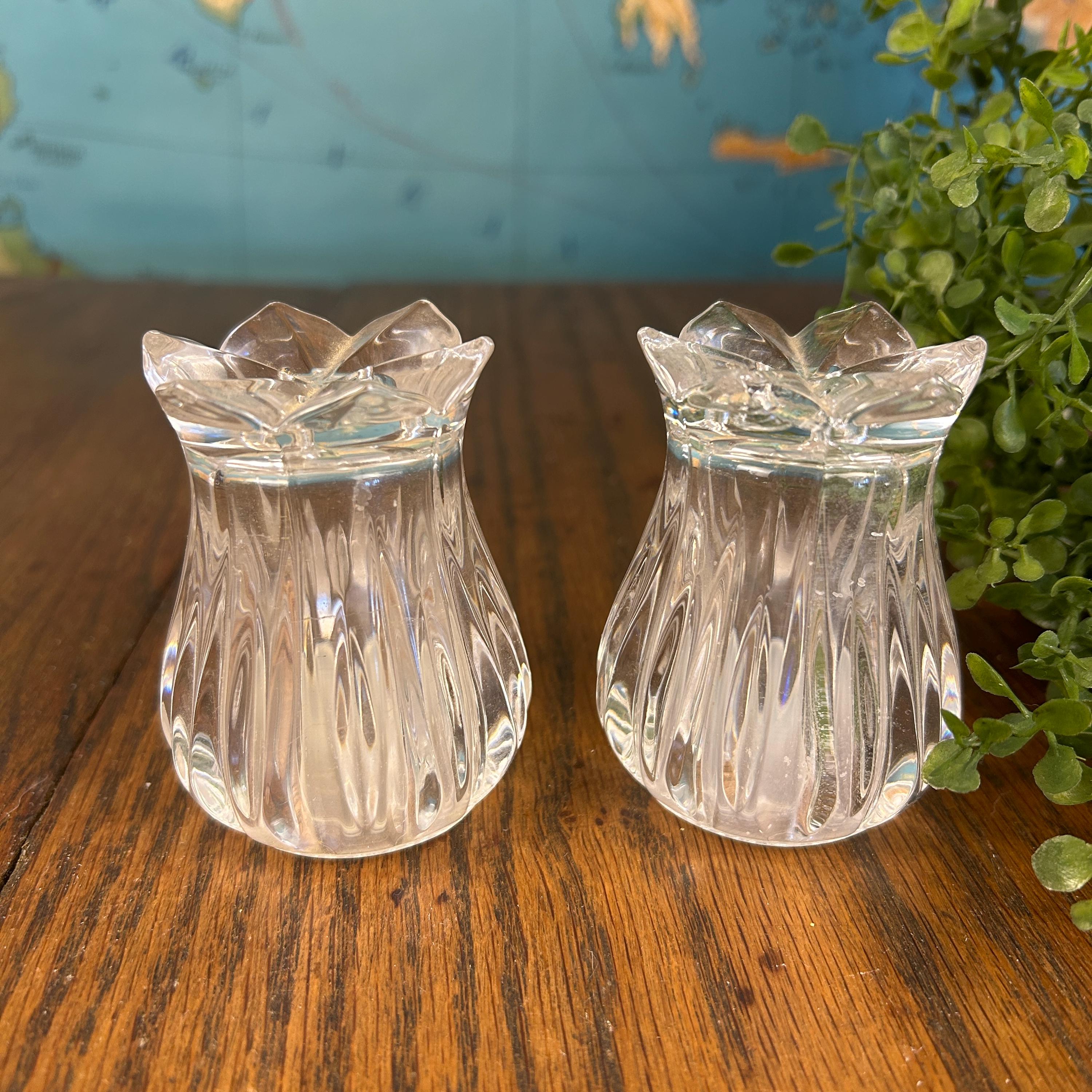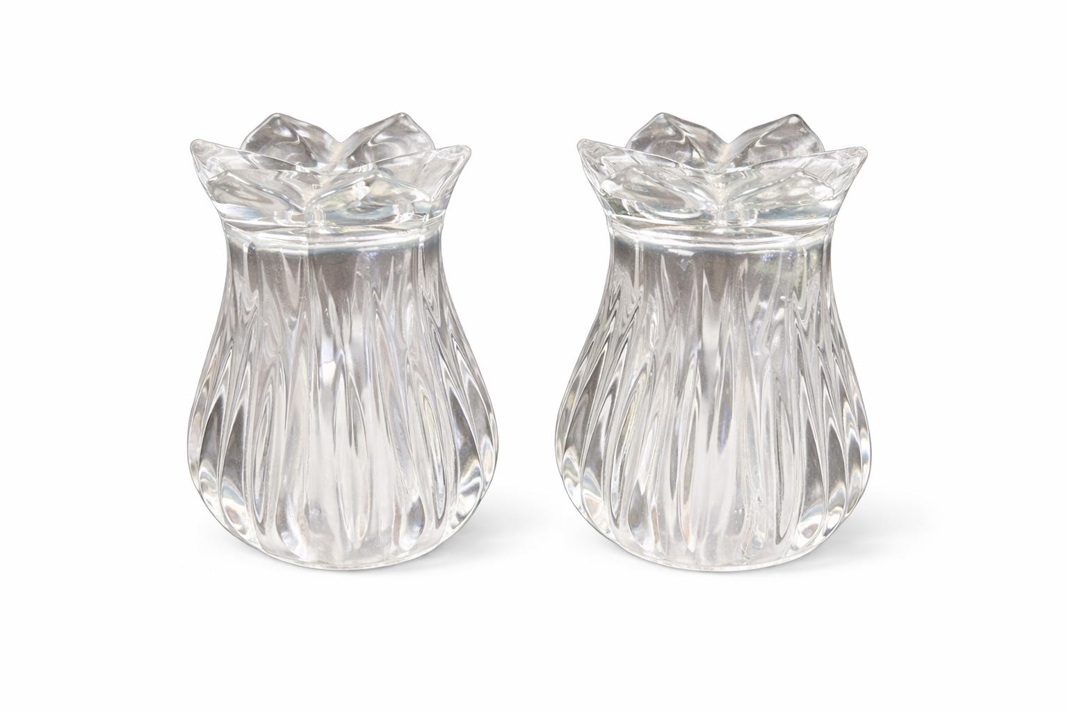 This is a pair of Gorham Crystal Lotus salt and pepper shakers. They are made of clear, cut lead crystal.