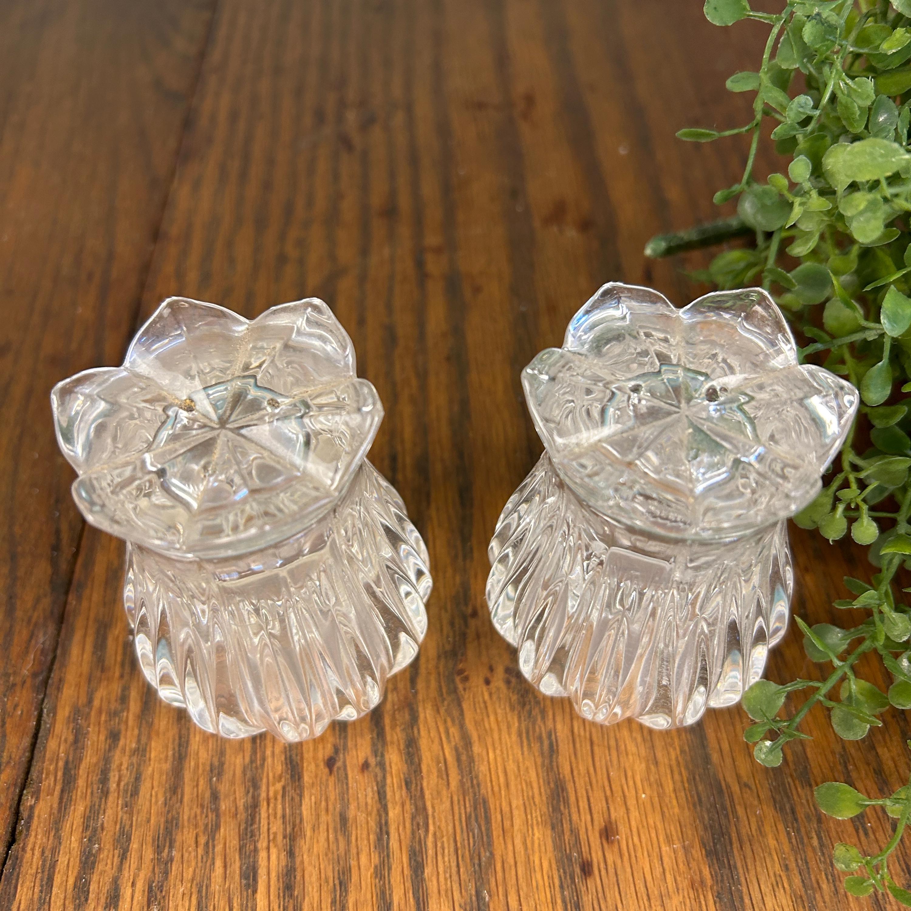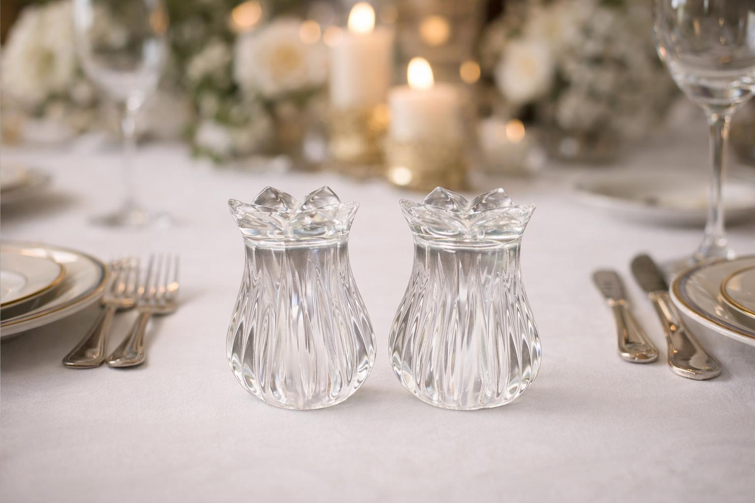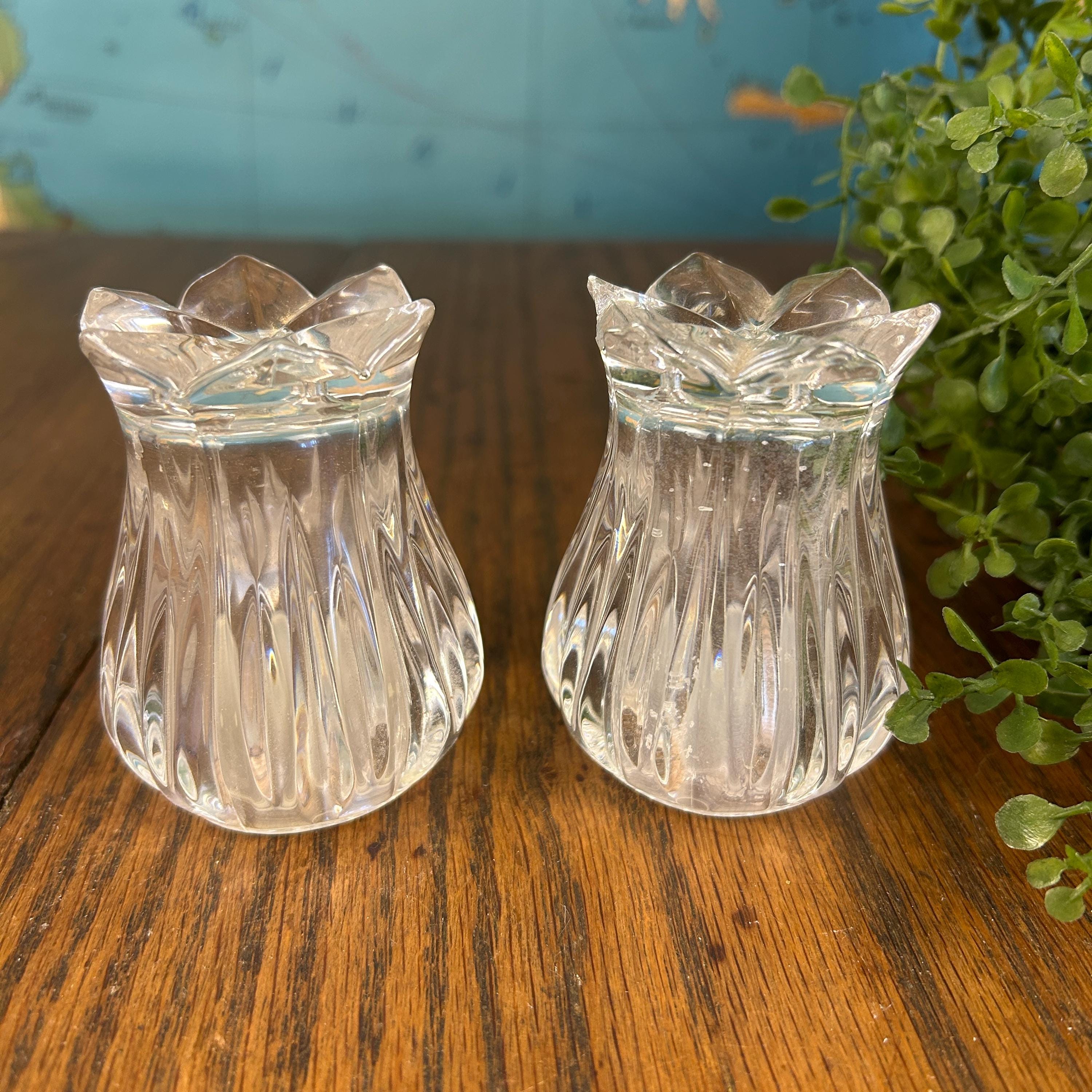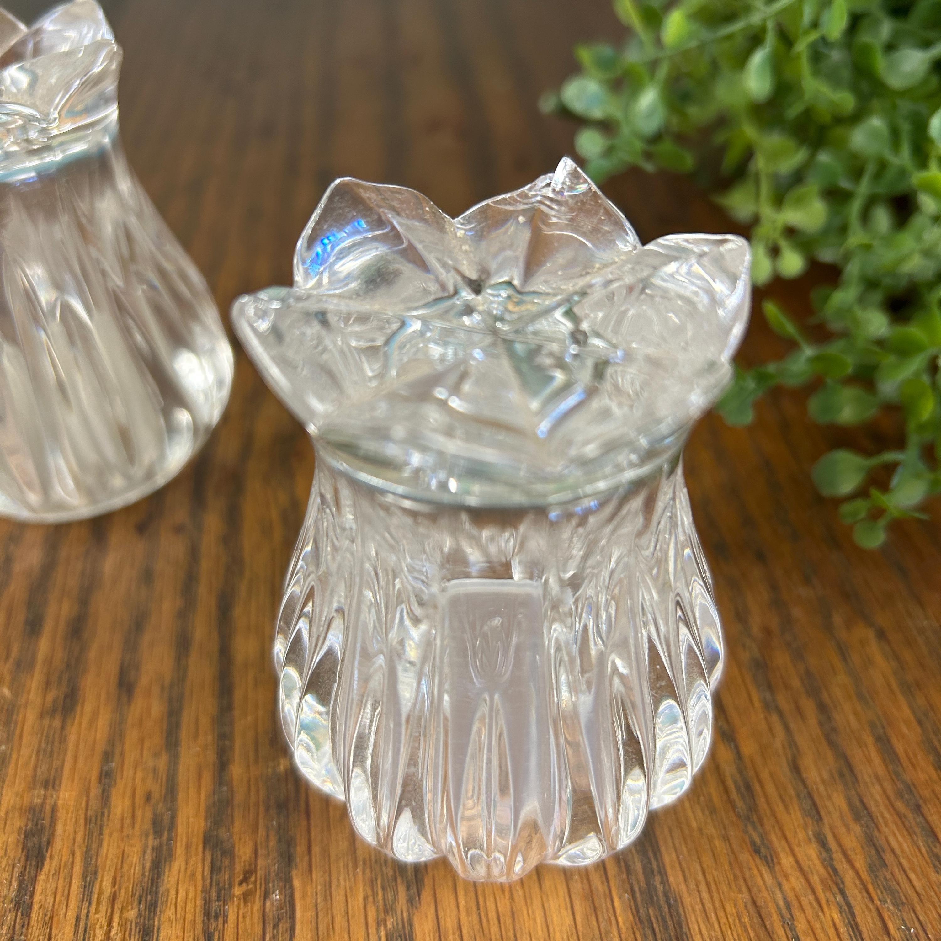 This is a pair of Gorham Crystal Lotus salt and pepper shakers. They are made of clear, cut lead crystal.