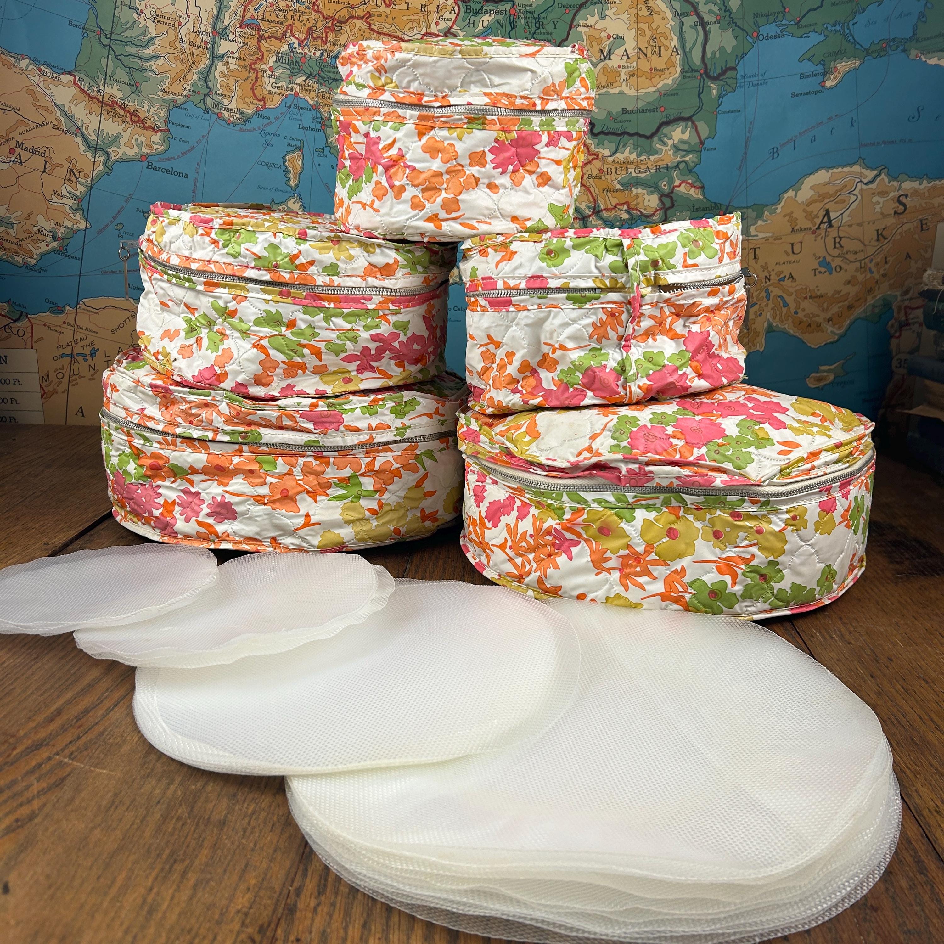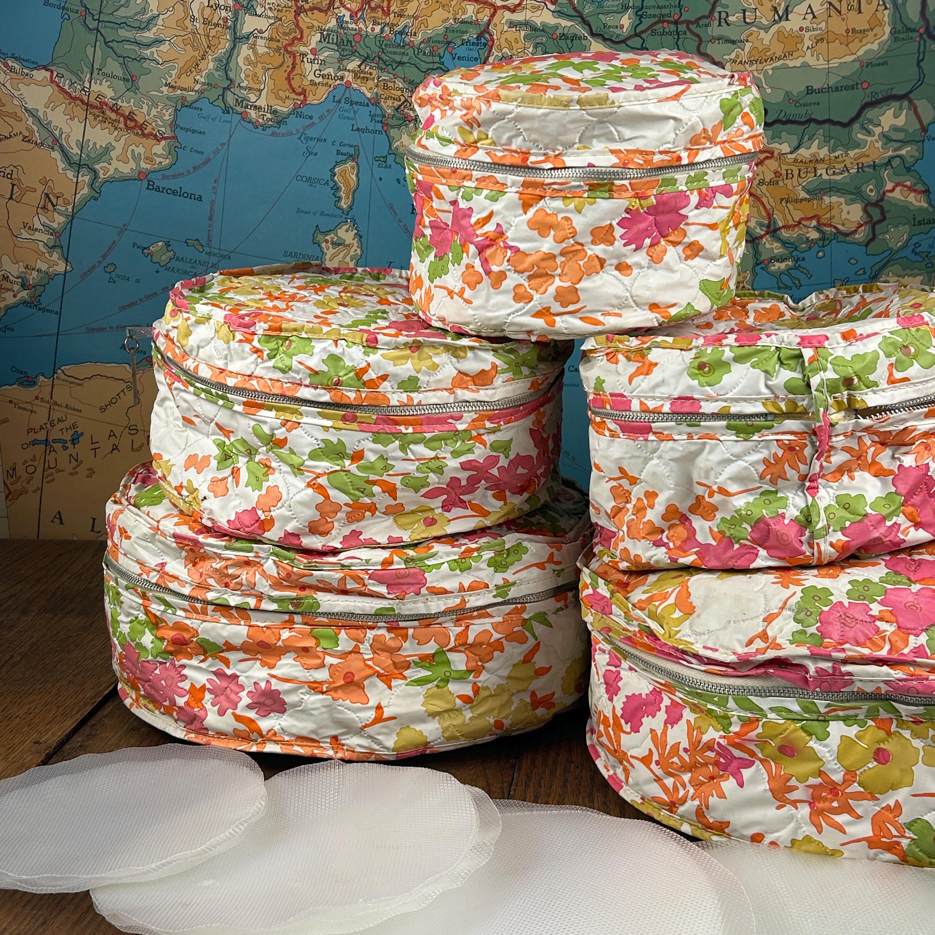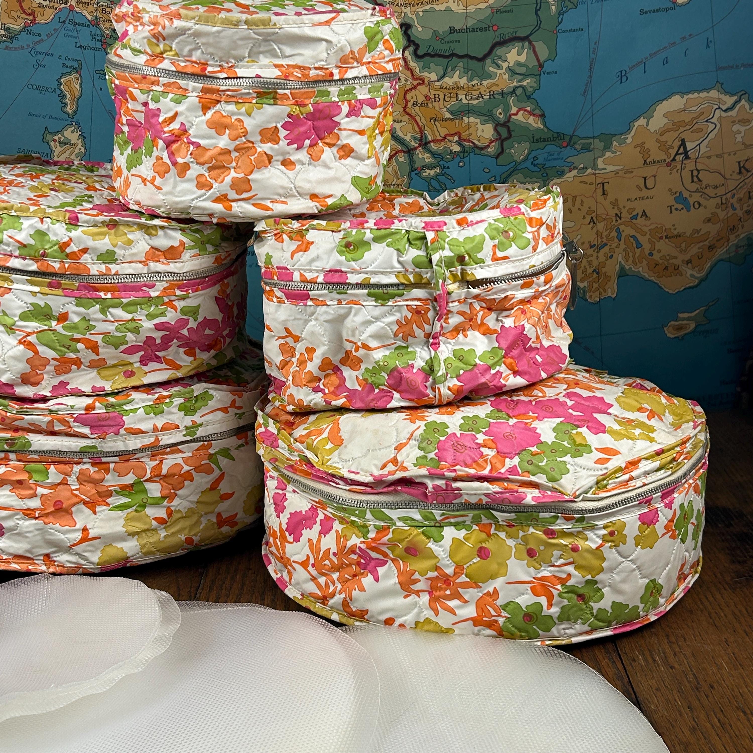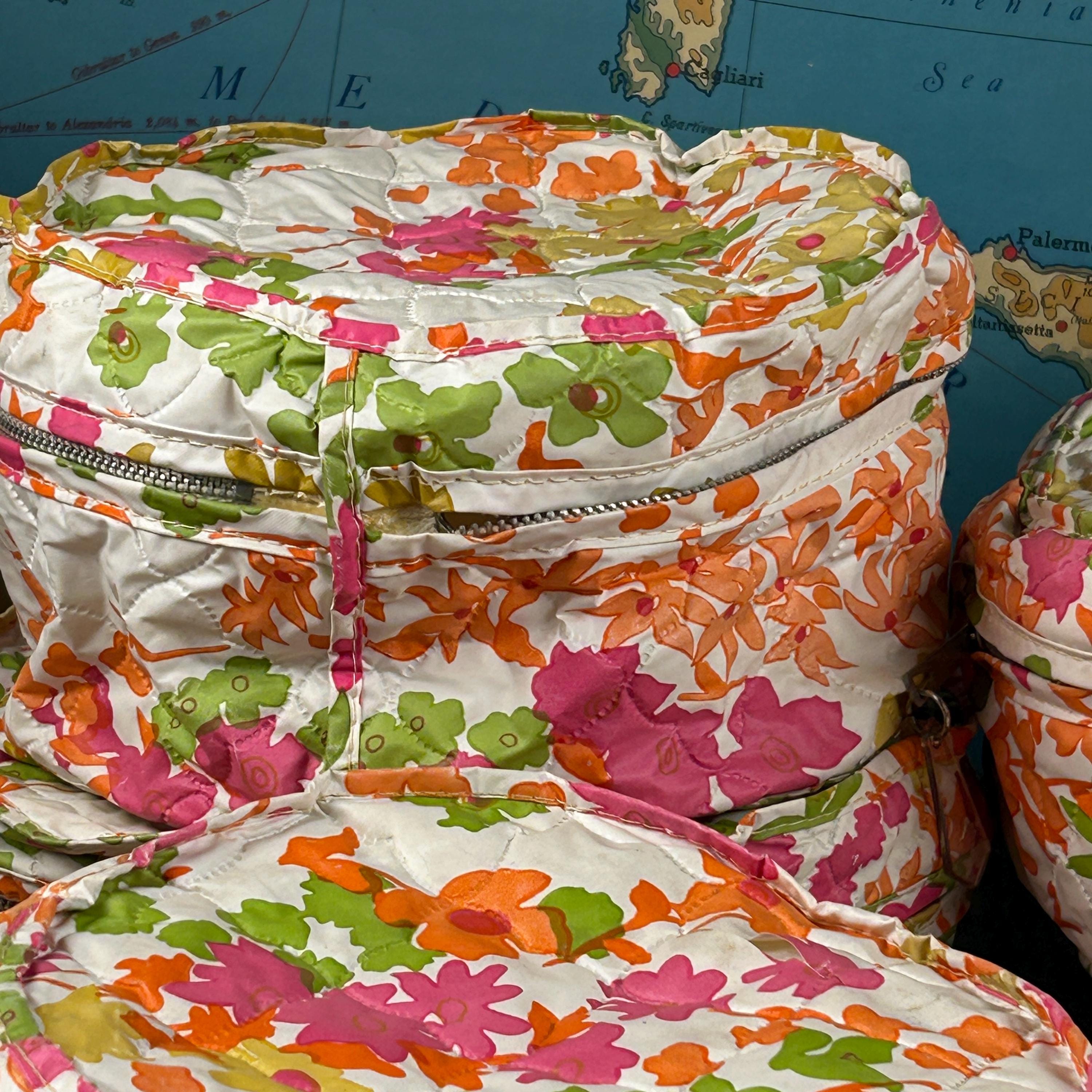 This set includes five round vinyl Seal Sac containers, each featuring a vibrant 1960s hippie floral print in hot pink, orange, yellow, green, and white. A true pop of color for any retro-inspired space!