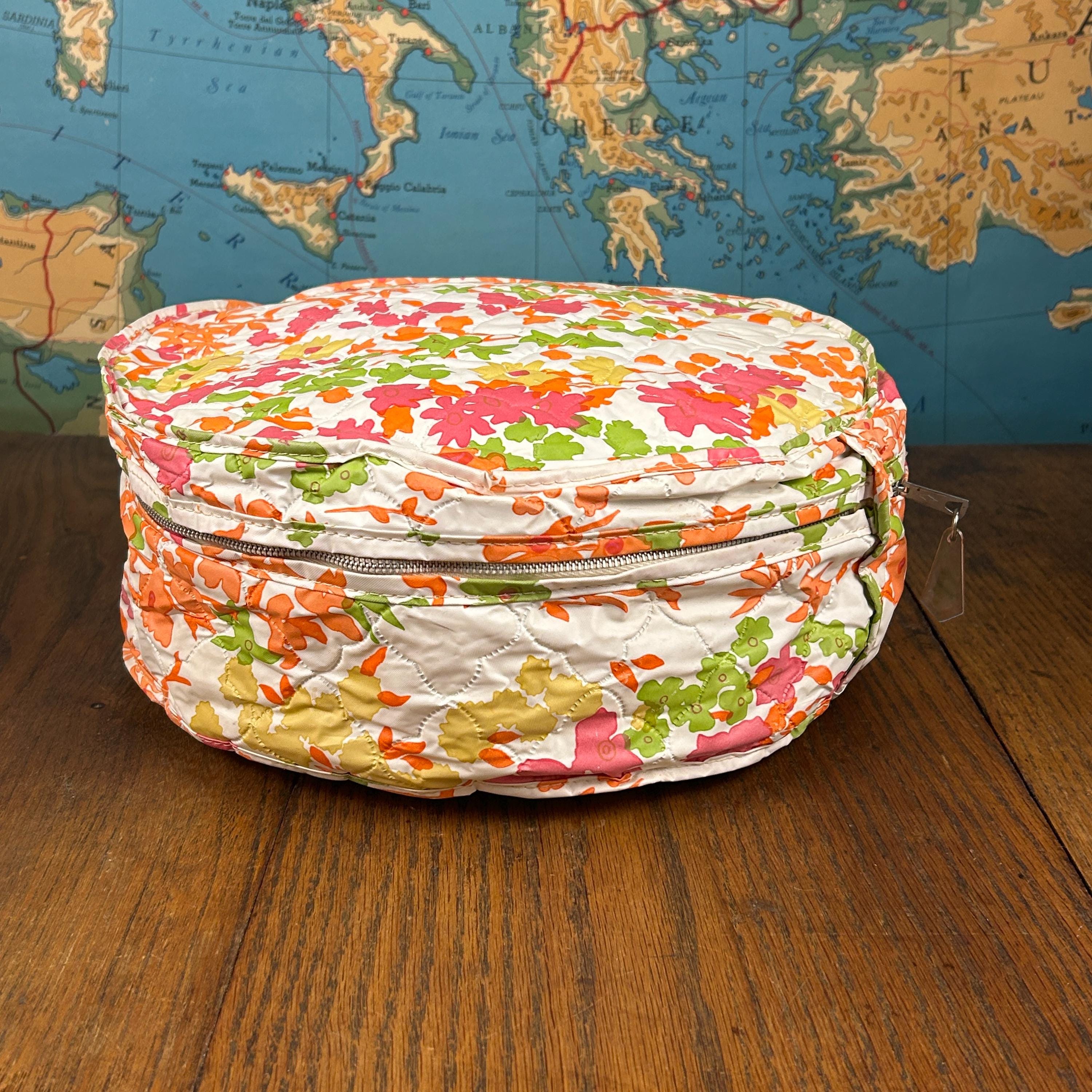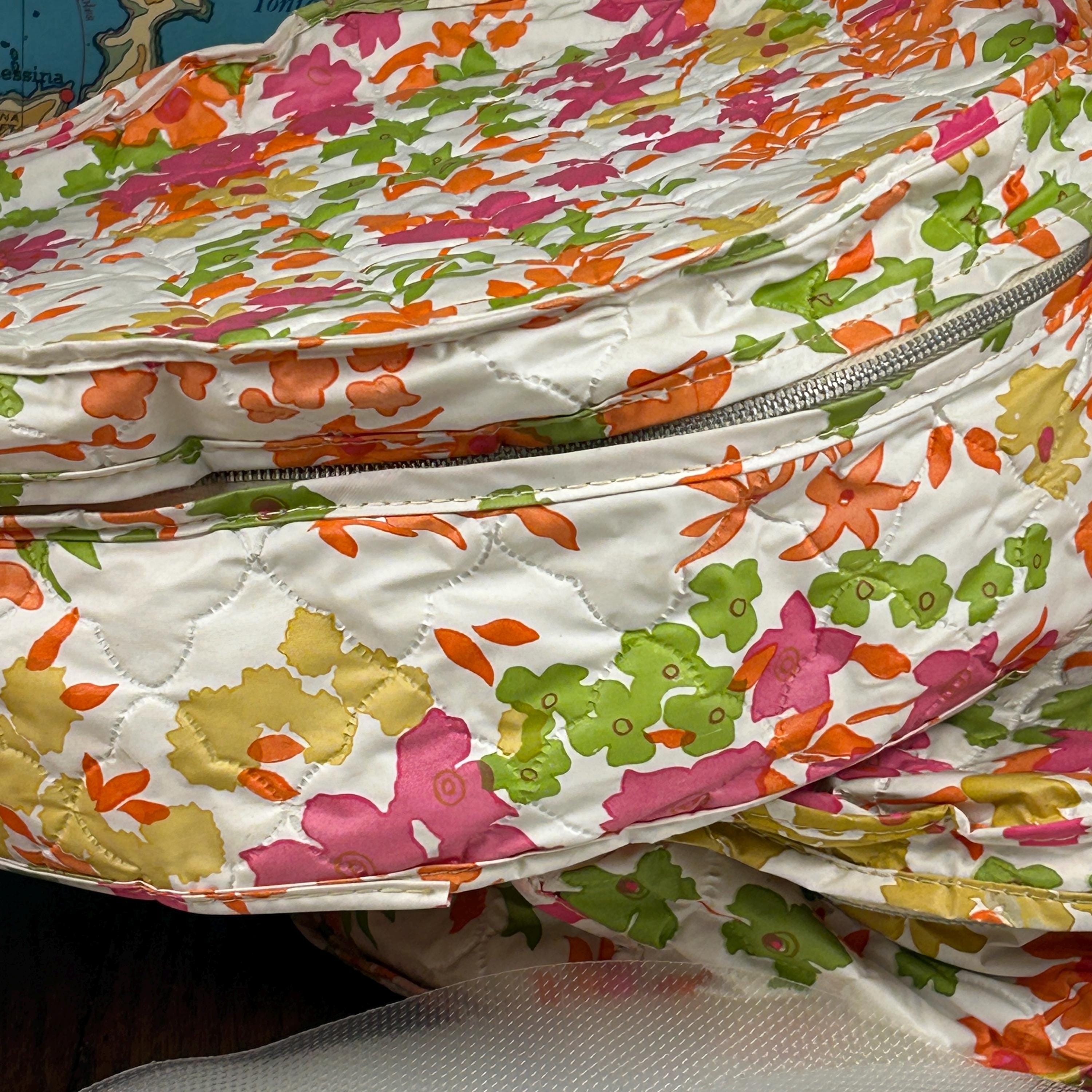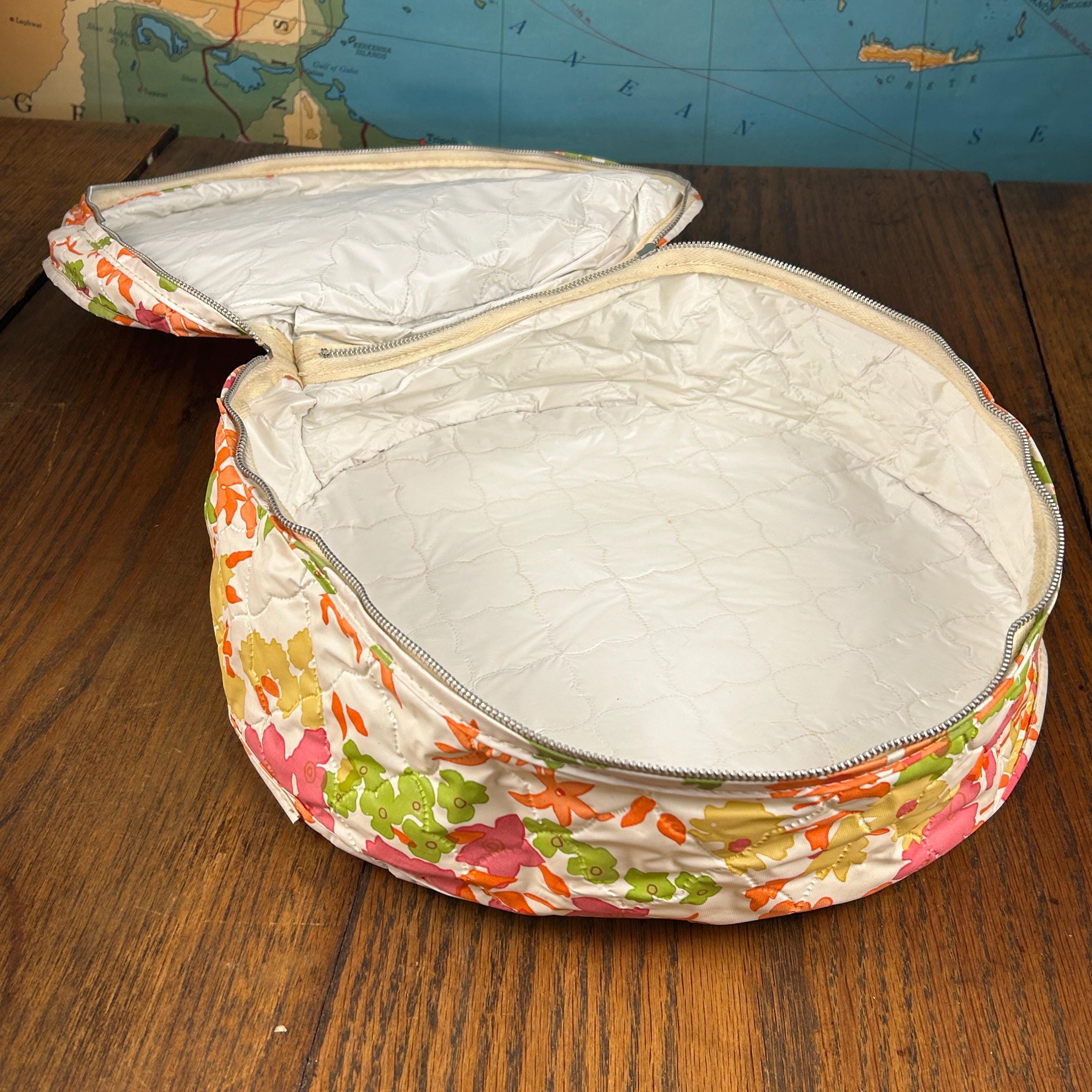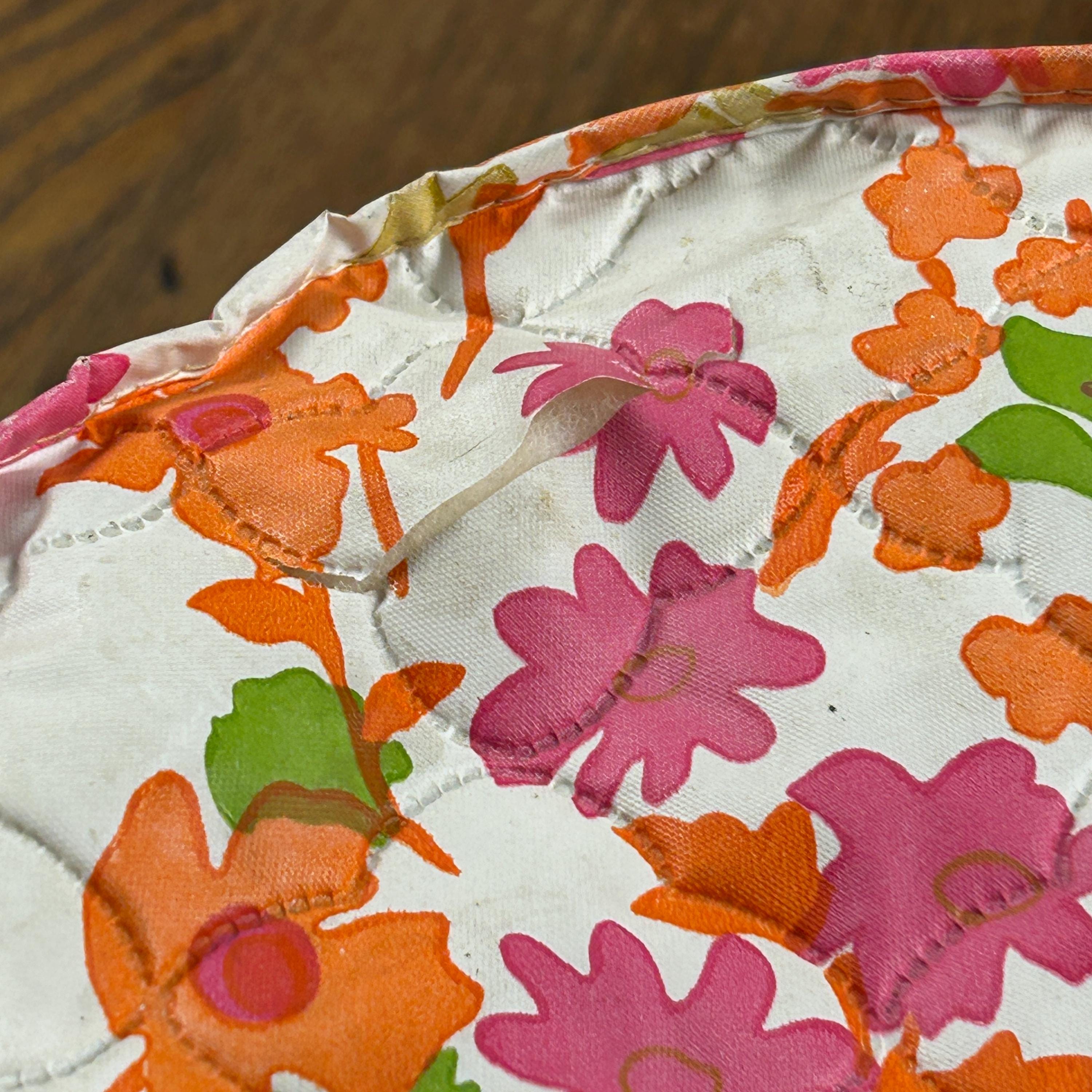 This set includes five round vinyl Seal Sac containers, each featuring a vibrant 1960s hippie floral print in hot pink, orange, yellow, green, and white. A true pop of color for any retro-inspired space!