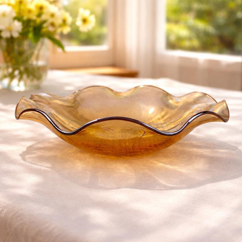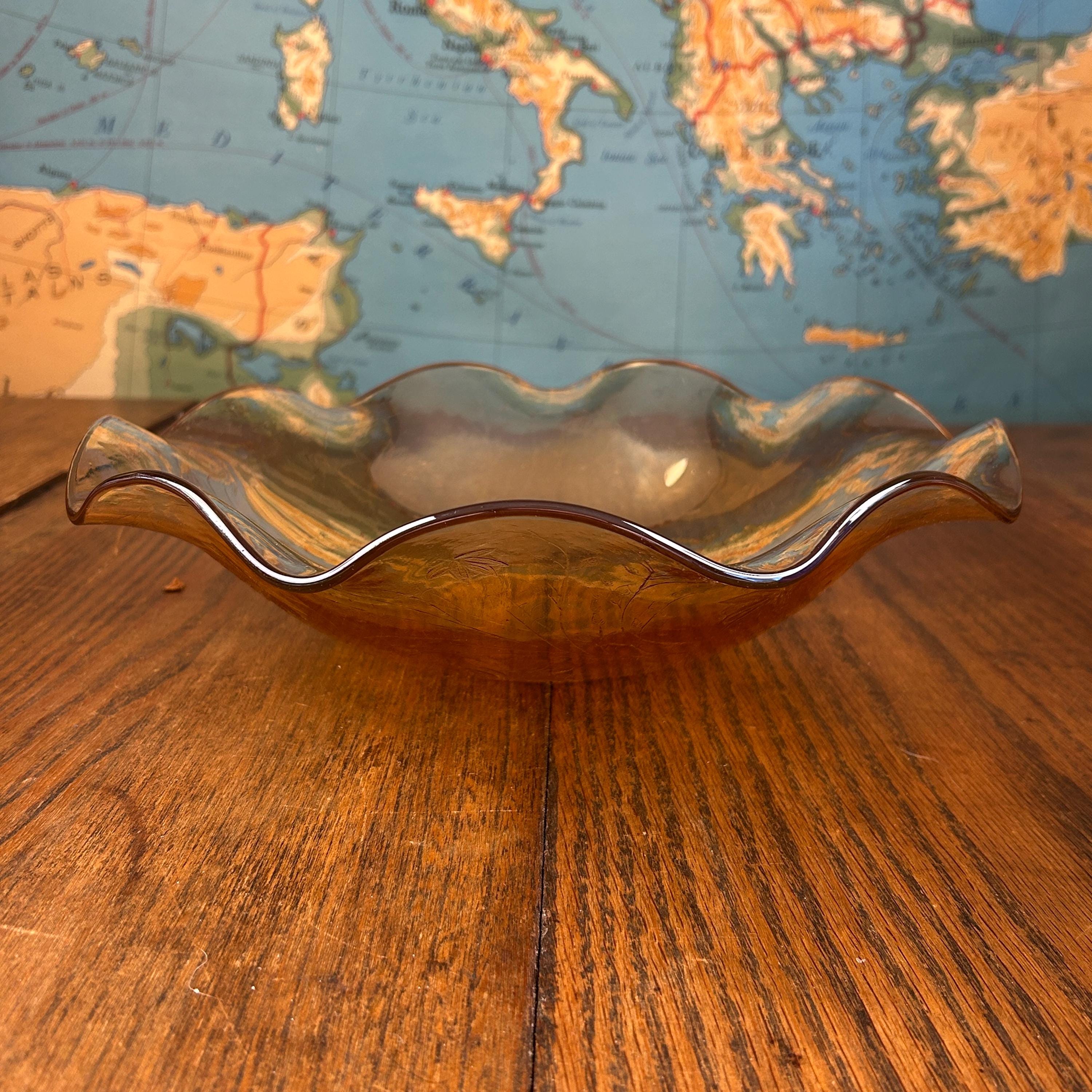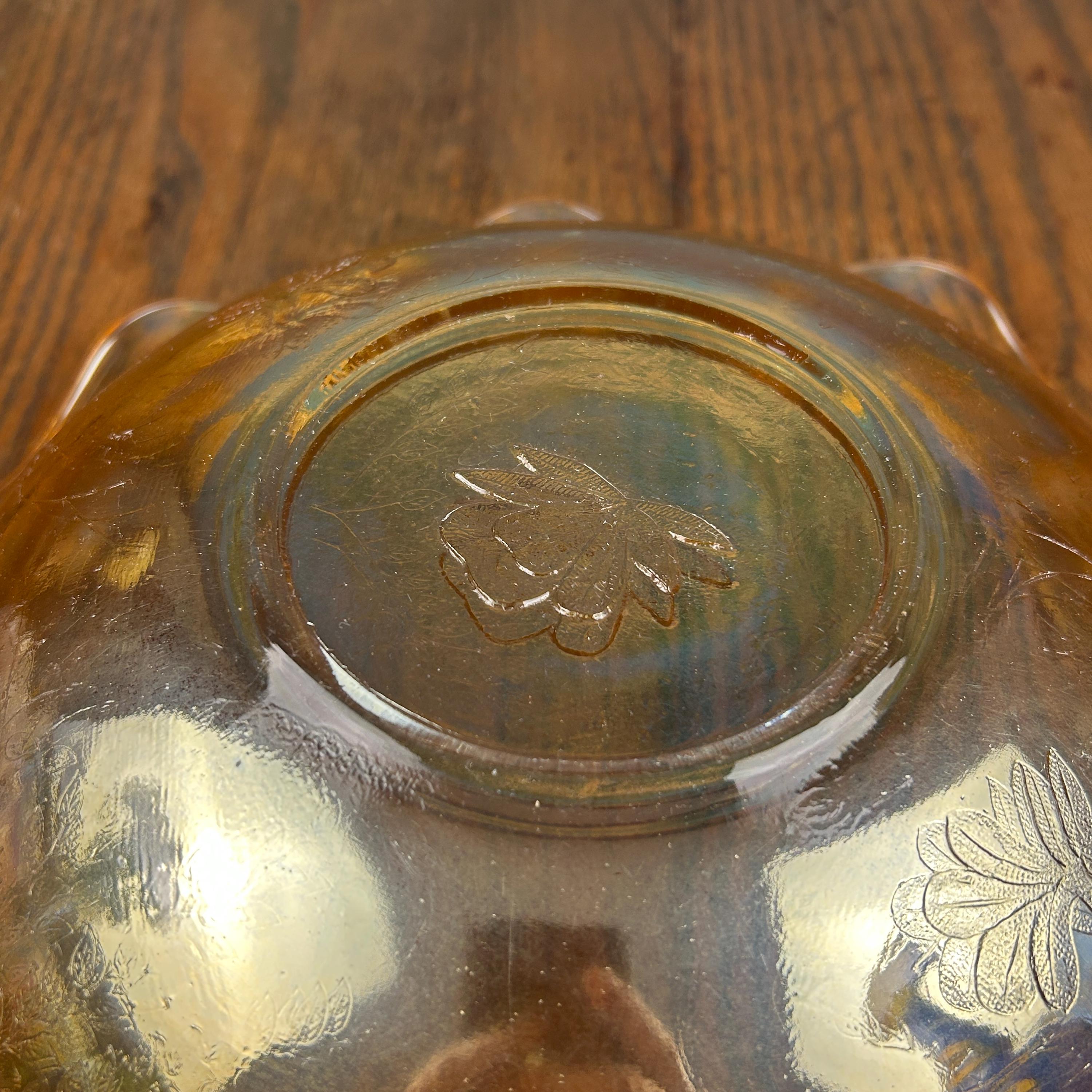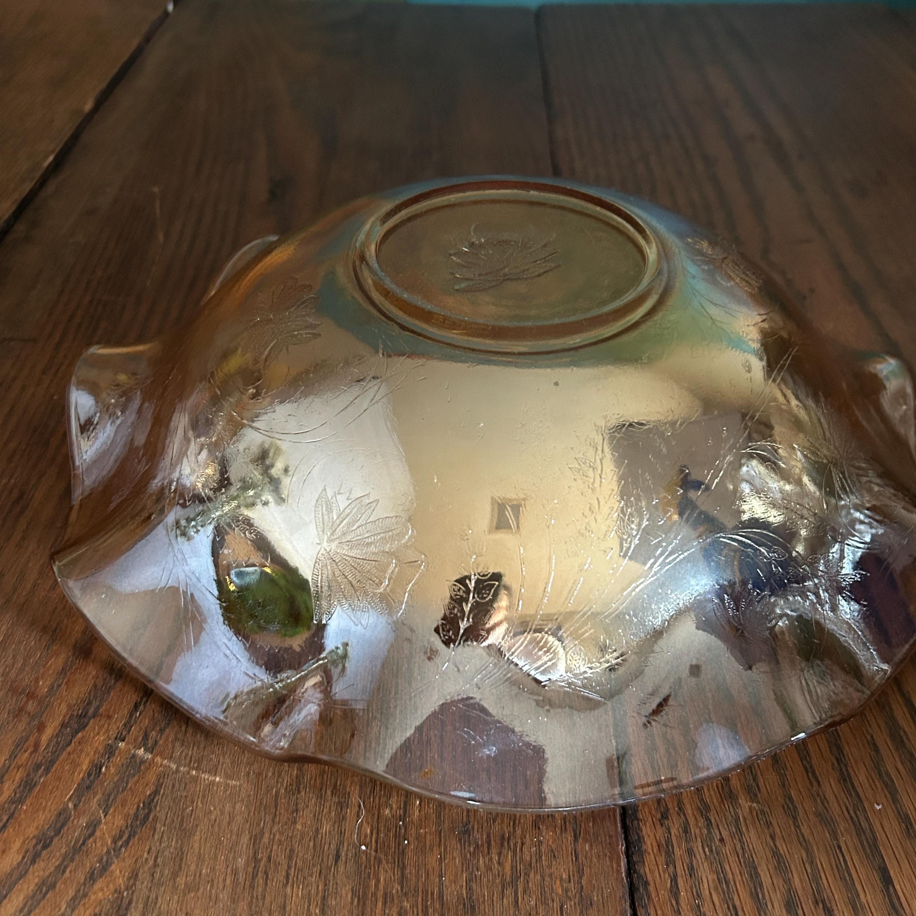 The Vintage Jeannette Glass Co. Louisa Floragold Ruffled Bowl is a notable piece from the Floragold collection, a carnival glass line produced by Jeannette Glass Company in the late 1940s and early 1950s. Here’s a deeper dive into its history, characteristics, and collectibility: