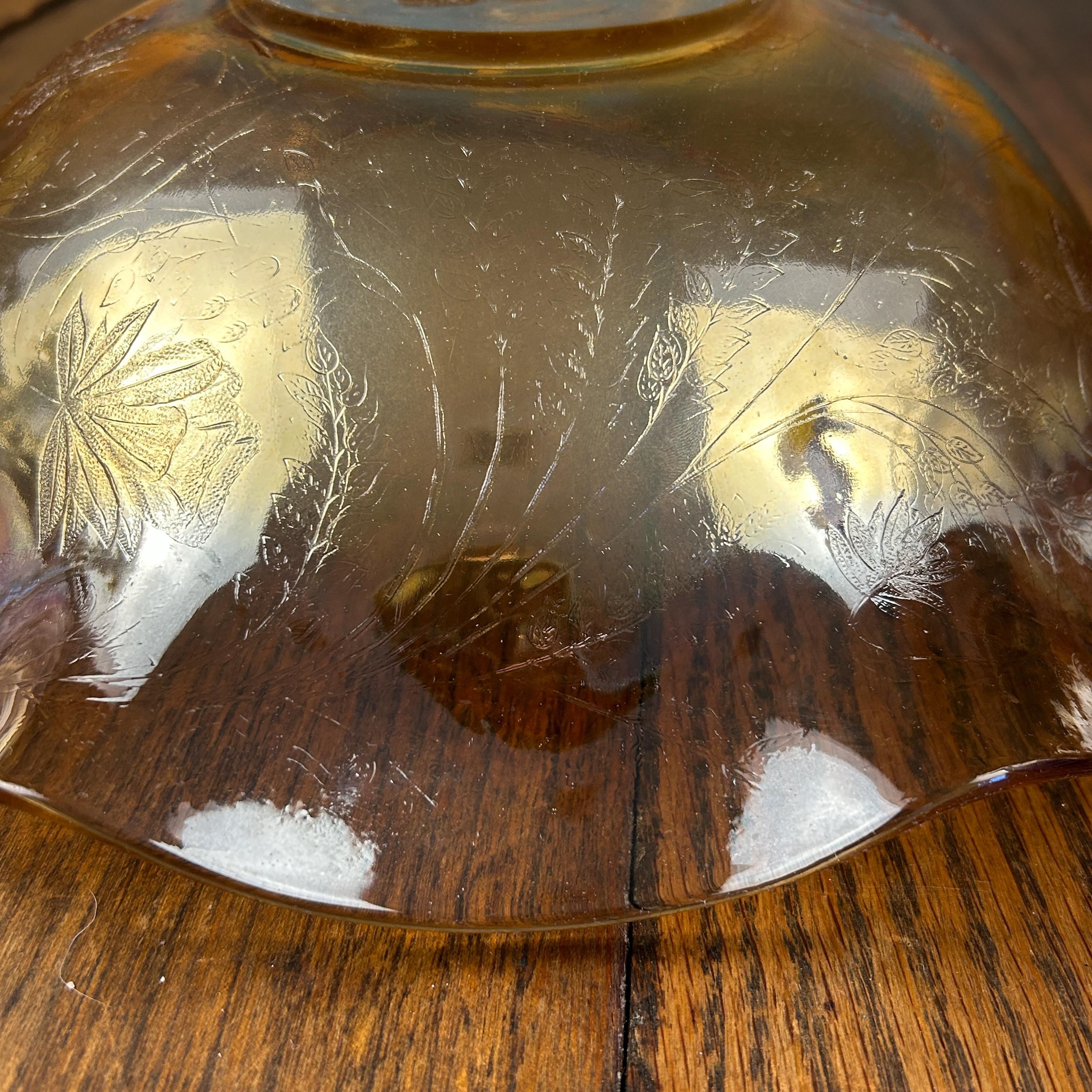 Despite its "carnival glass" look, Floragold is often classified as Depression-era pattern glass, as it was mass-produced and affordably priced.