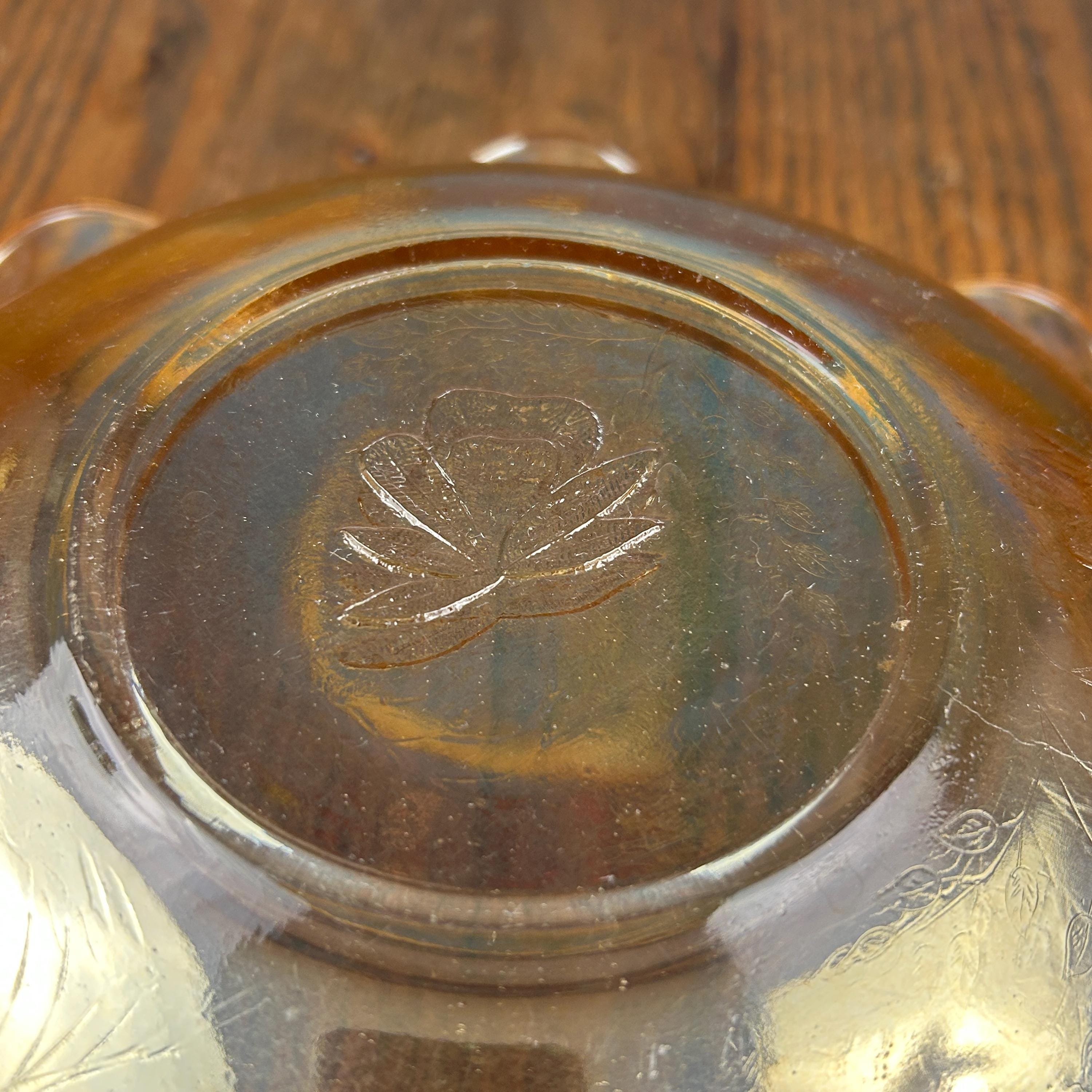 Unlike earlier carnival glass made by companies like Fenton or Northwood, Floragold pieces were pressed glass with an applied iridescent finish, rather than a fired-on metallic coating.