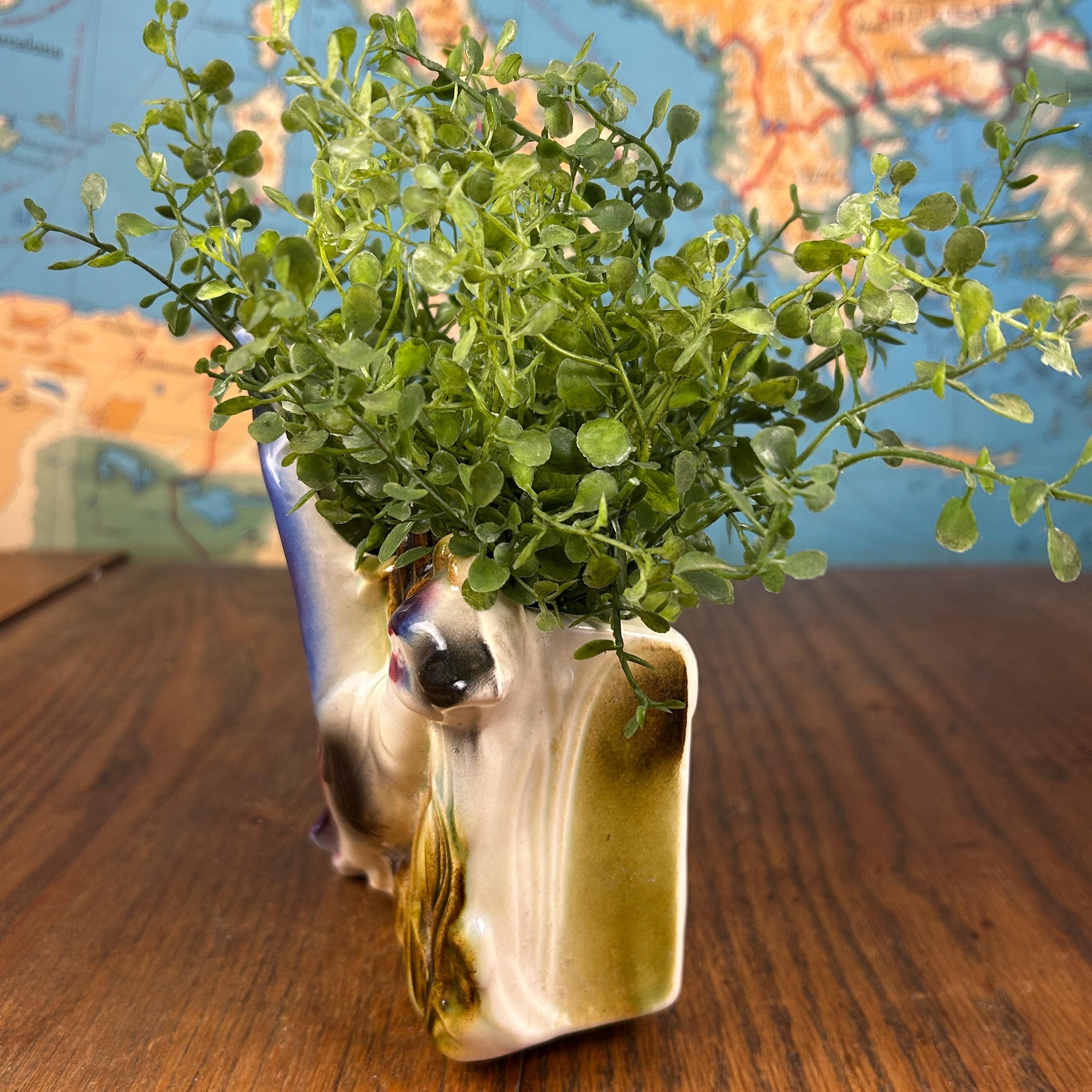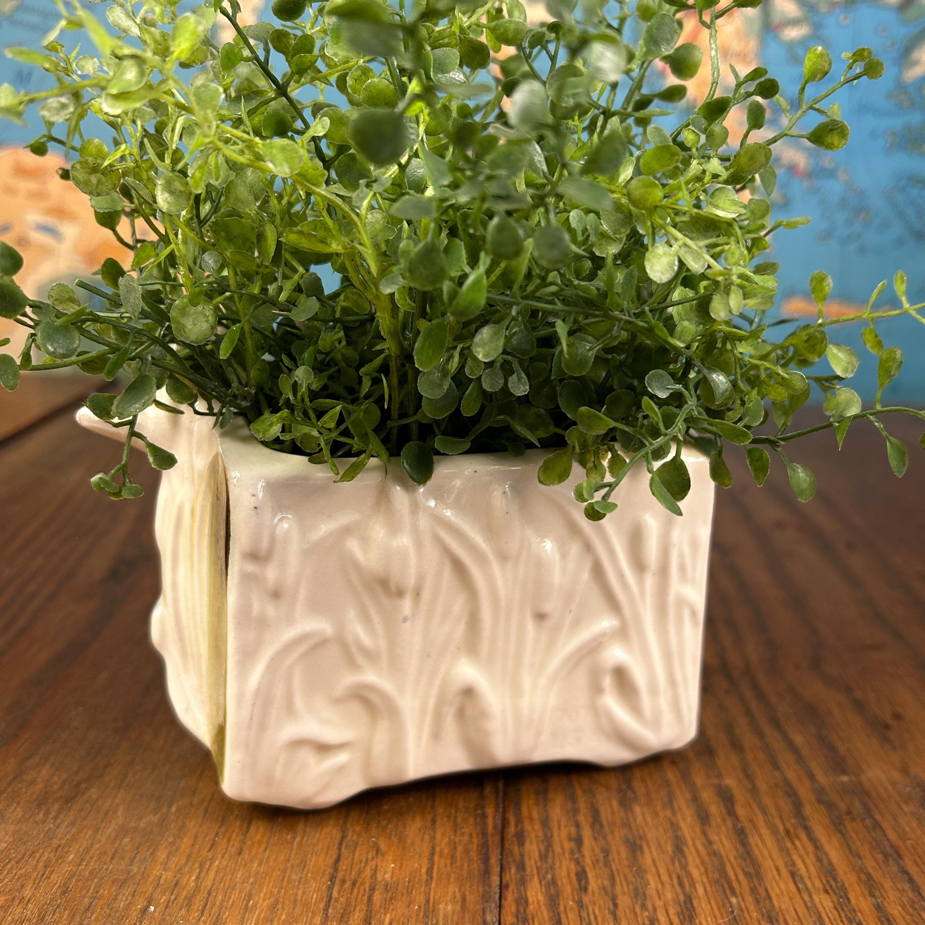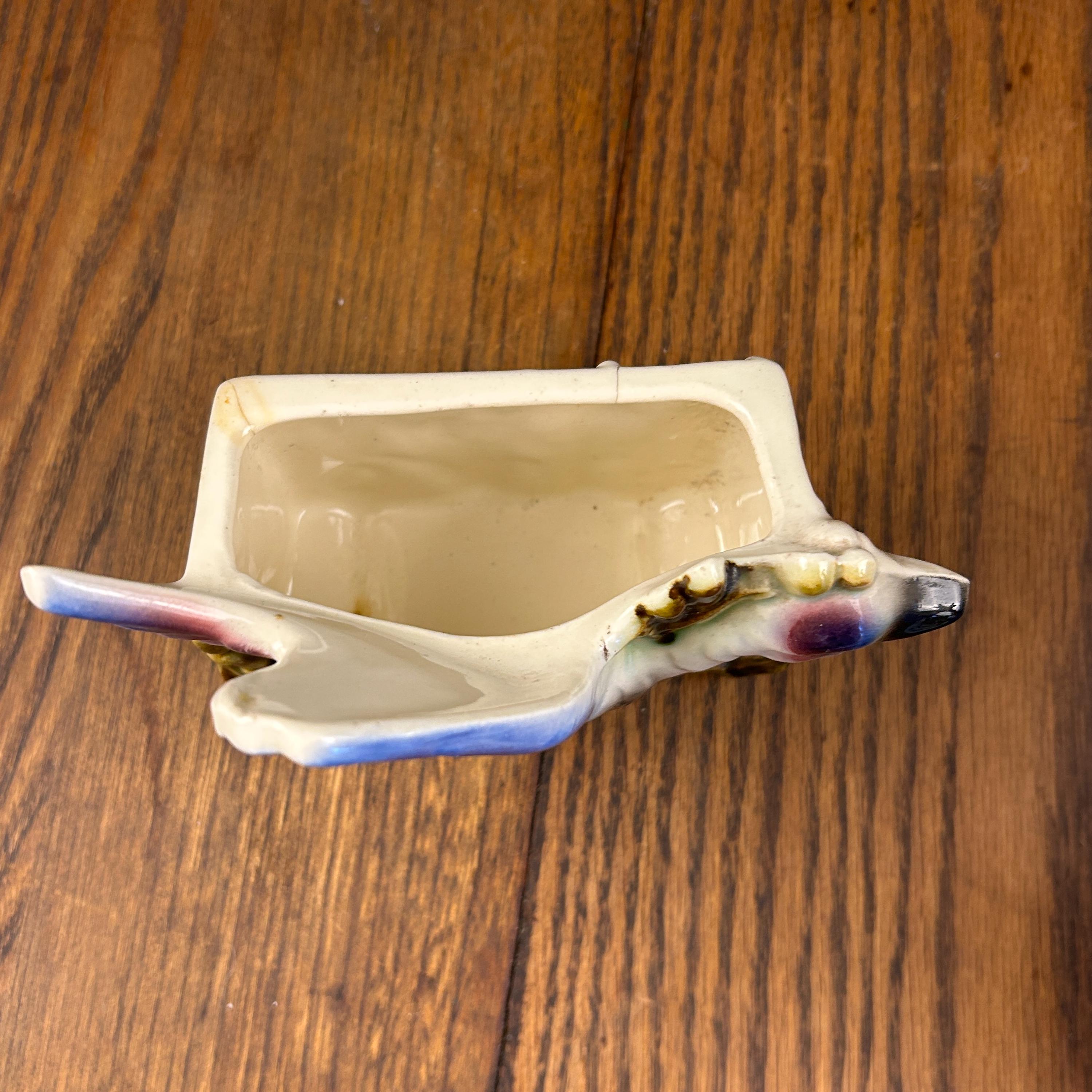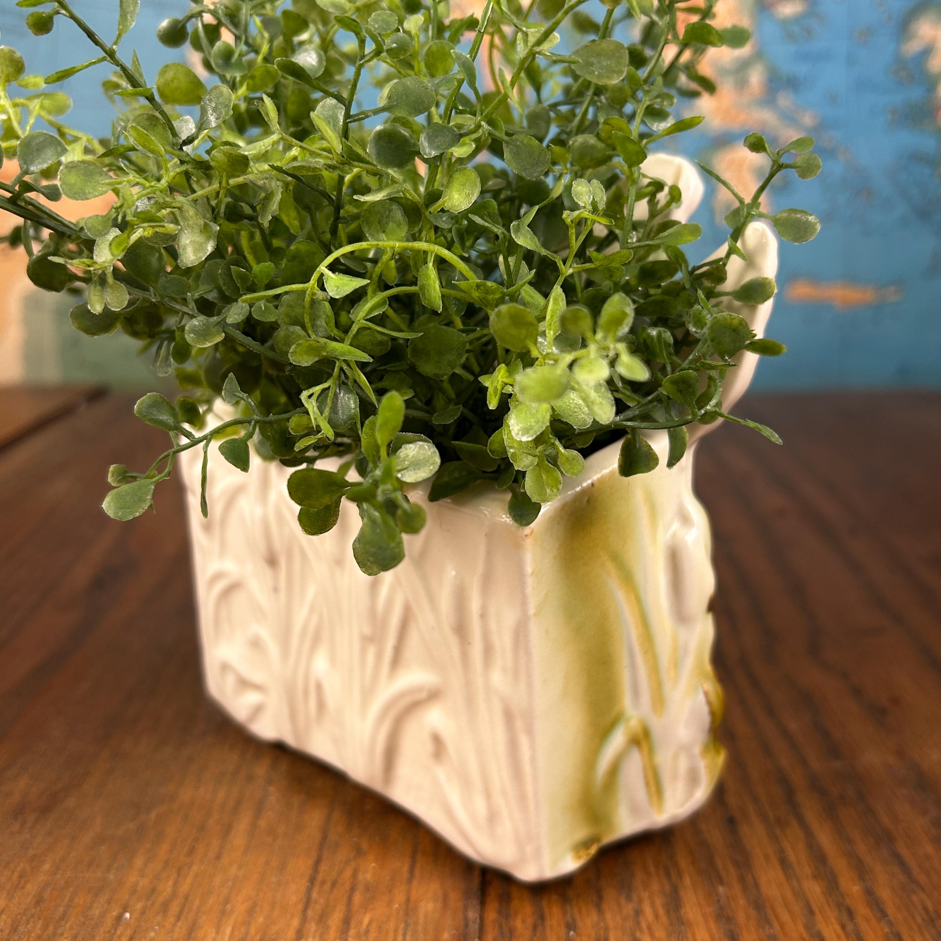 Made of glazed ceramic, this duck planter is ideal for displaying small houseplants, succulents, or faux greenery. It also makes a delightful standalone decorative accent on a shelf, mantel, or gallery wall. A wonderful find for mid century modern collectors, animal decor lovers, or anyone looking to add a unique vintage statement piece to their home.