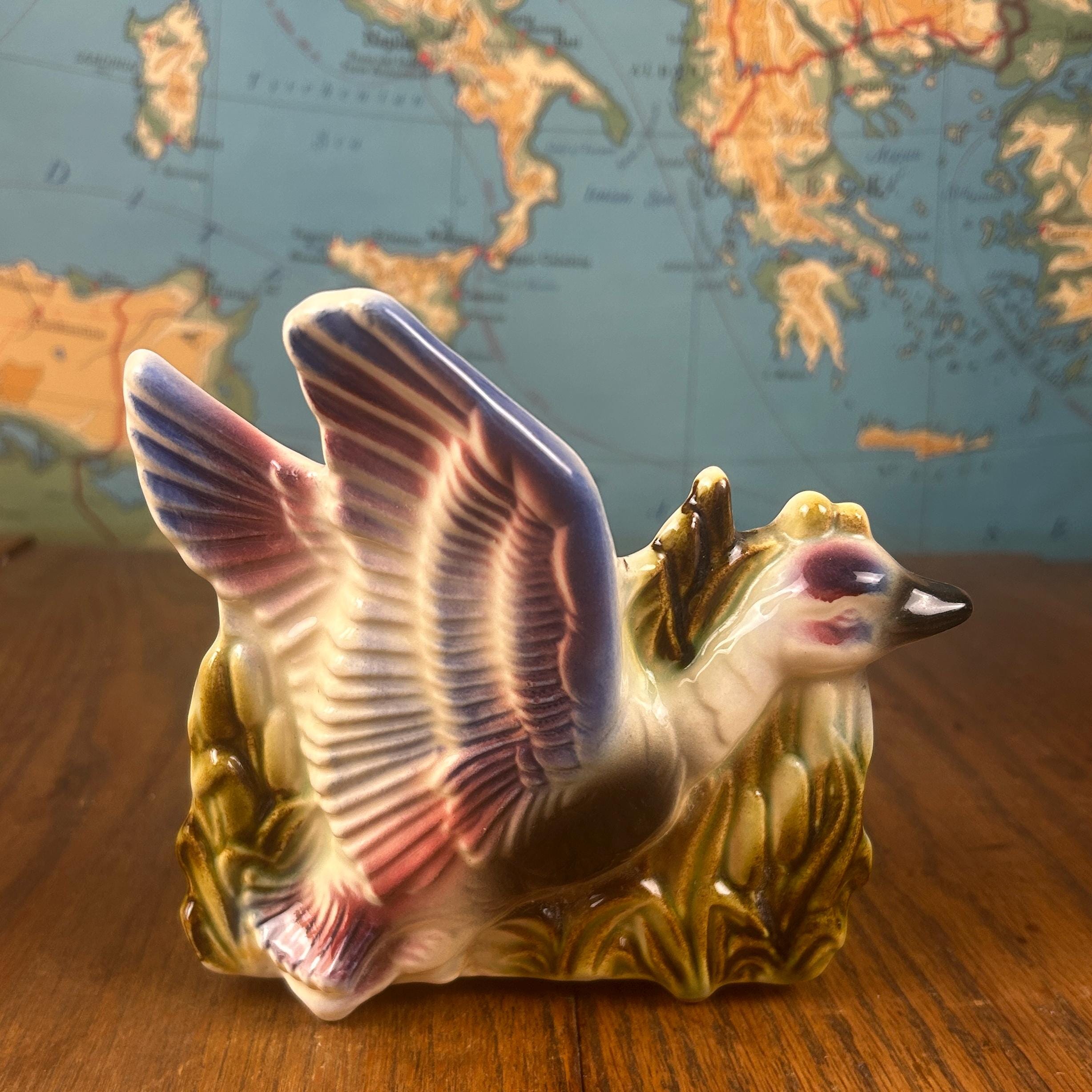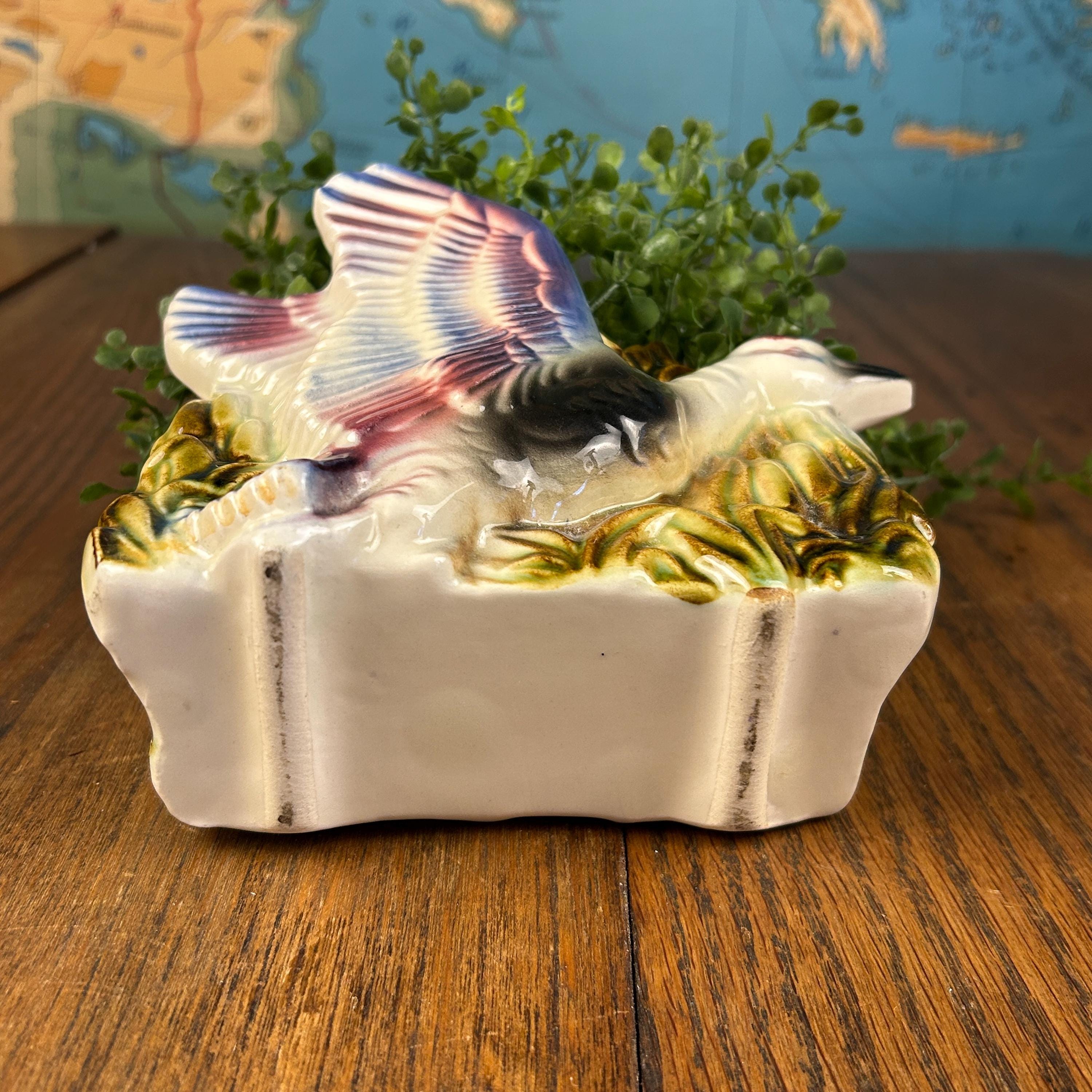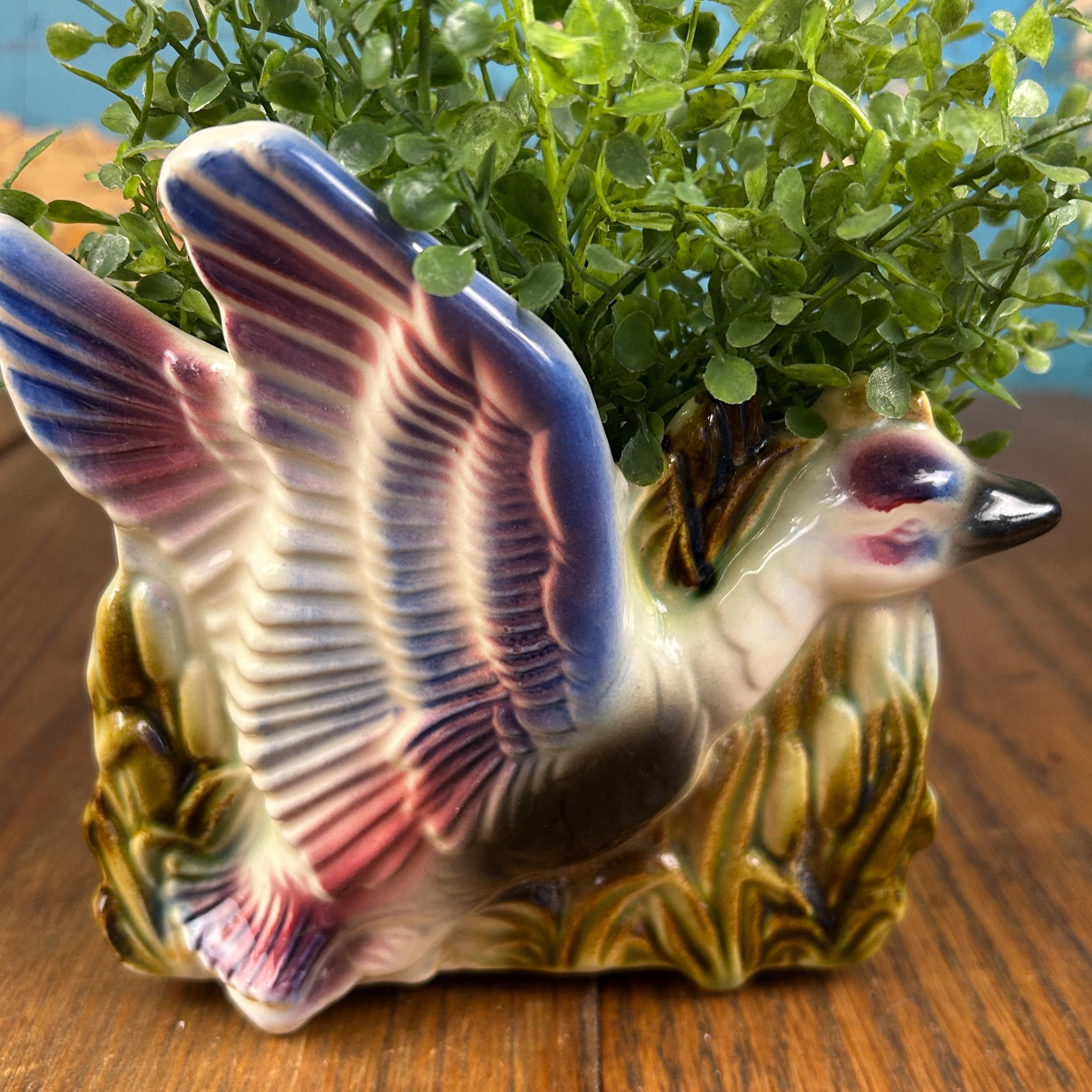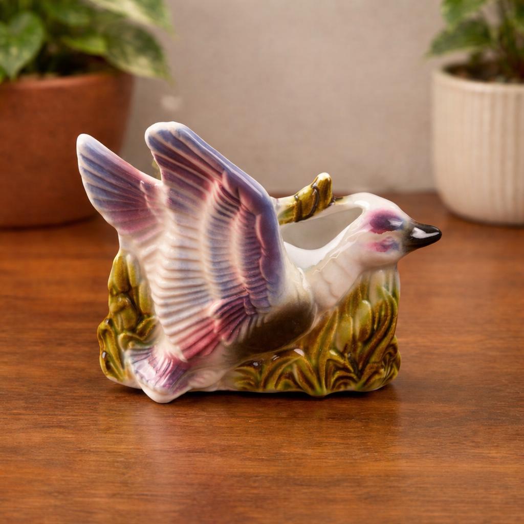 Add a touch of playful mid-century charm to your space with this vintage ceramic flying duck planter. With its stylized wings and classic MCM silhouette, this piece perfectly captures the whimsy and design-forward aesthetic of the 1950s–1960s.