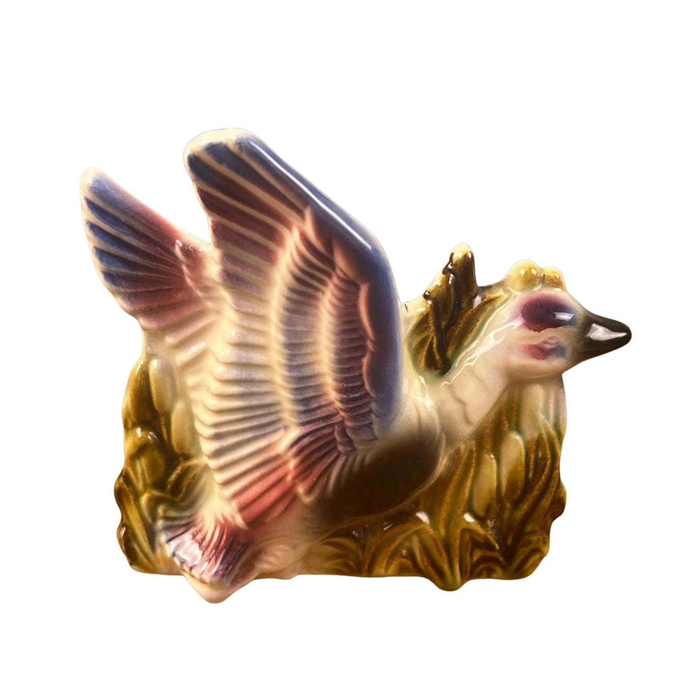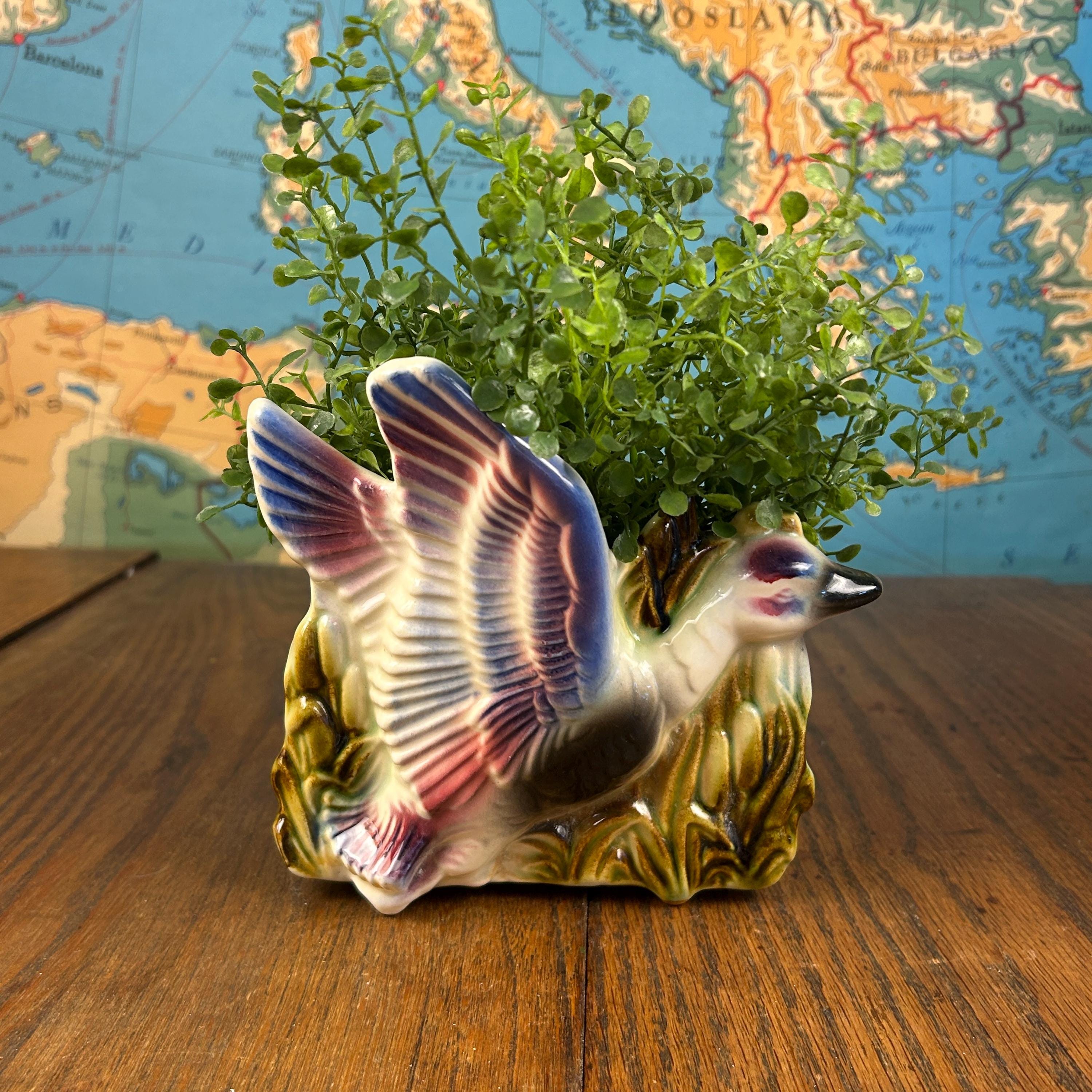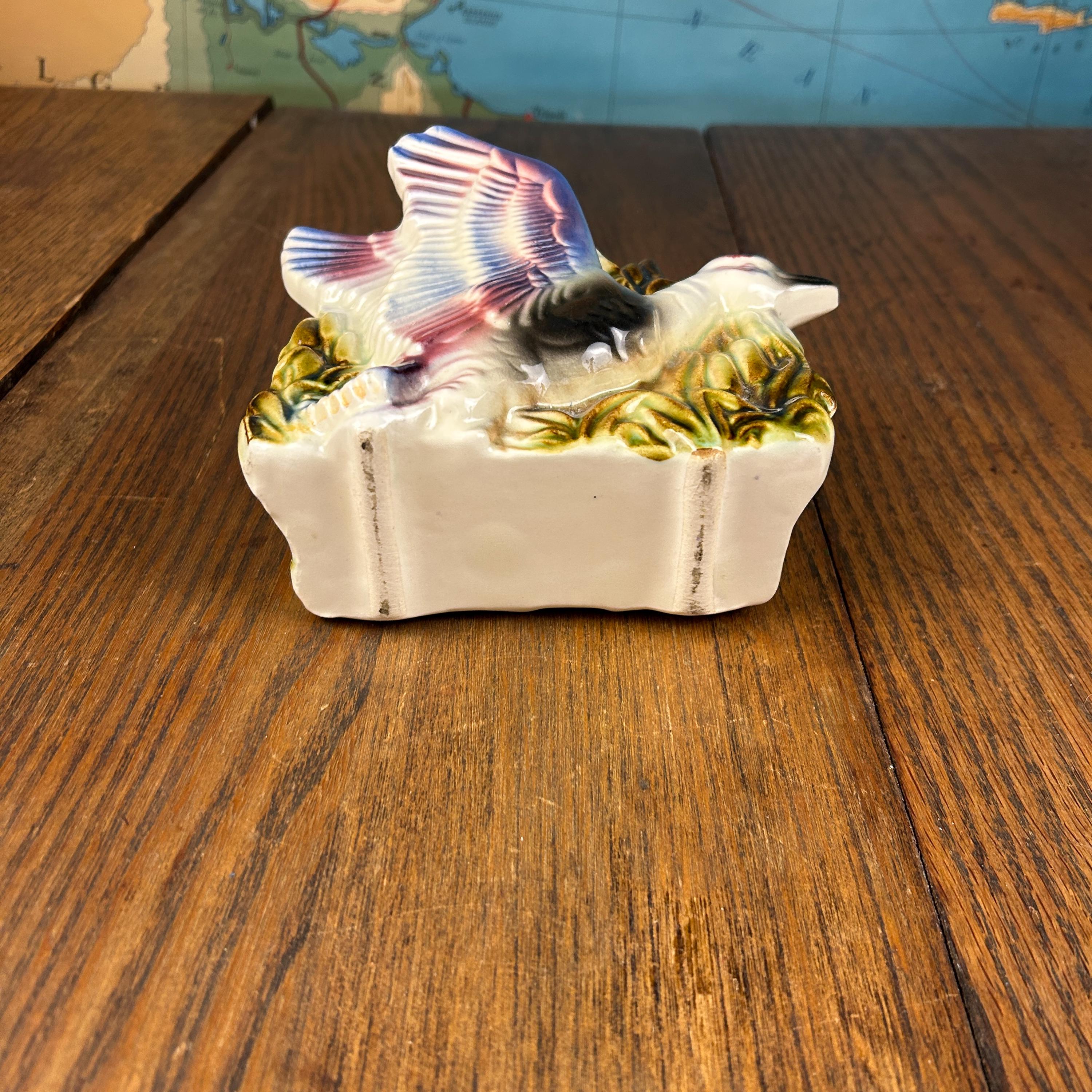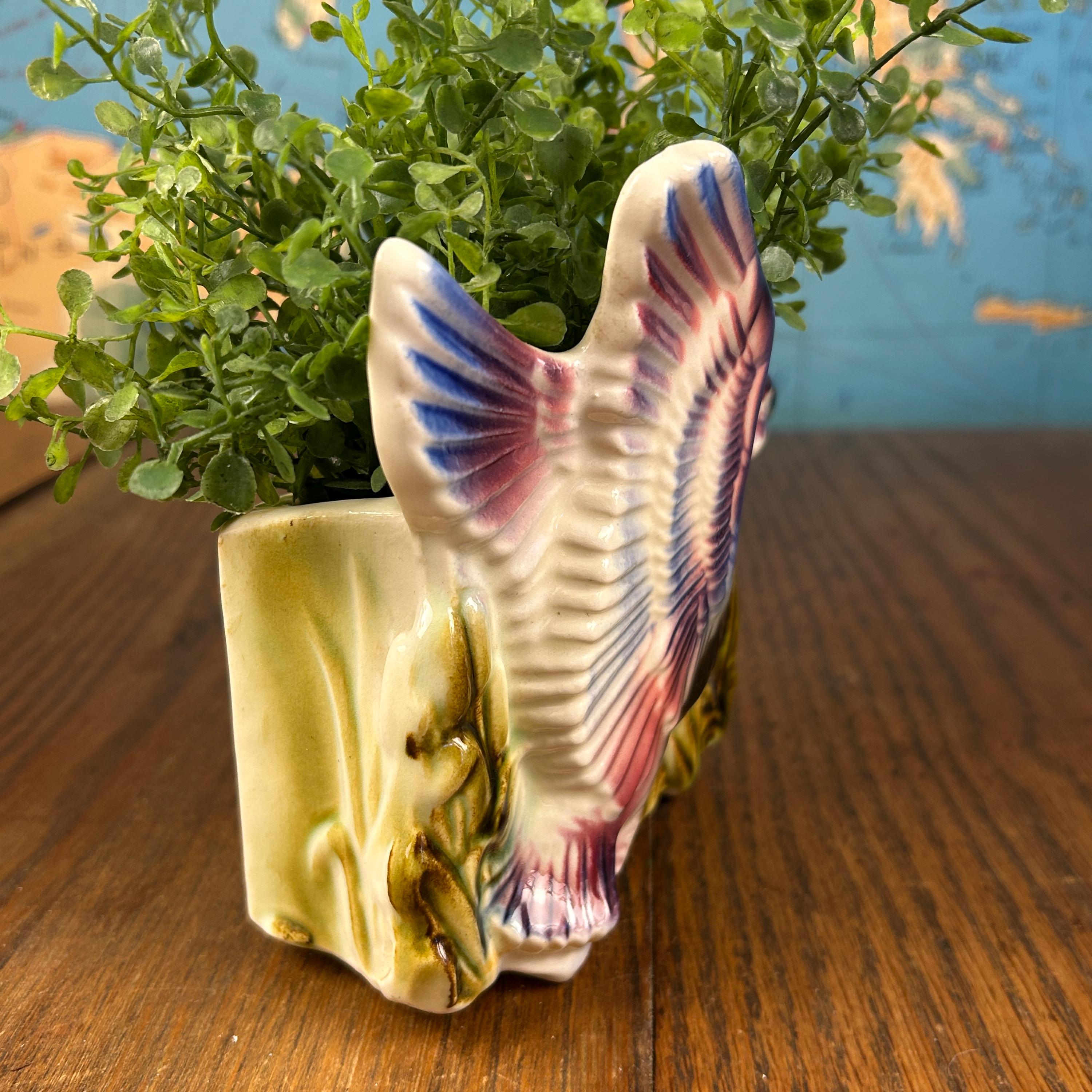 Add a touch of playful mid-century charm to your space with this vintage ceramic flying duck planter. With its stylized wings and classic MCM silhouette, this piece perfectly captures the whimsy and design-forward aesthetic of the 1950s–1960s.