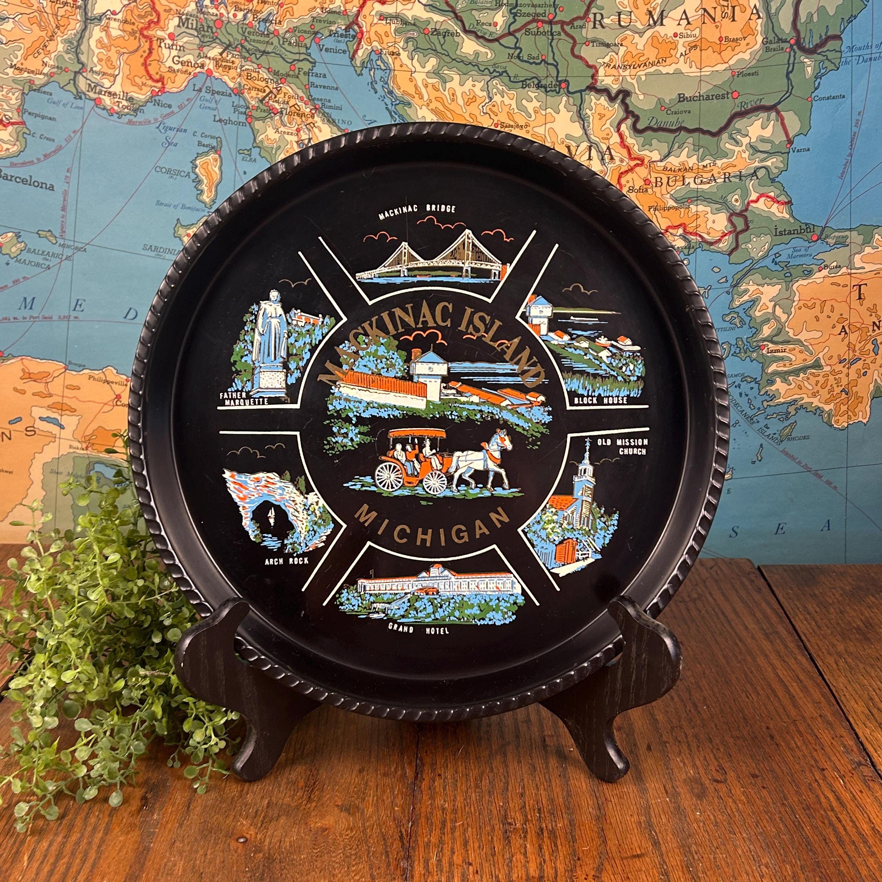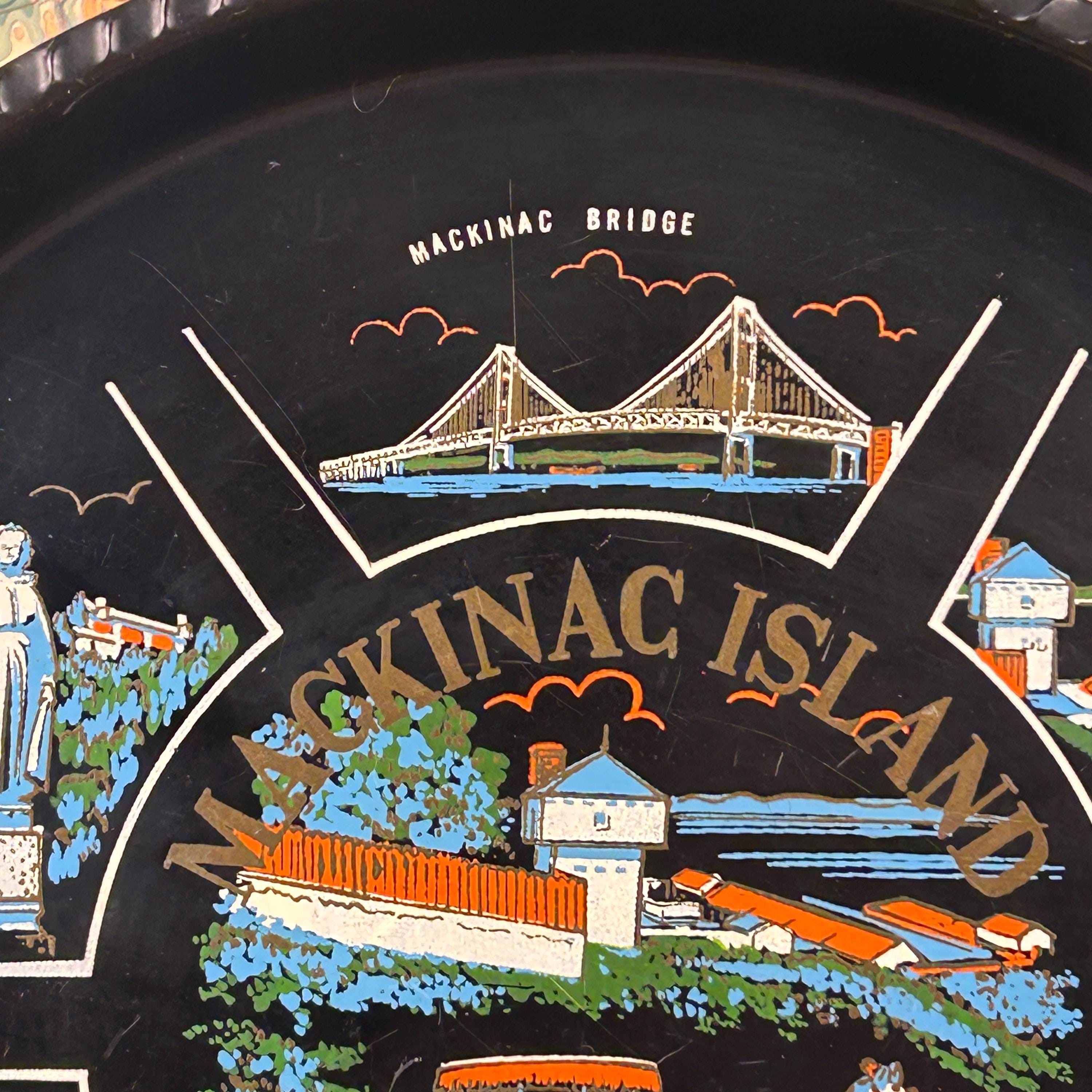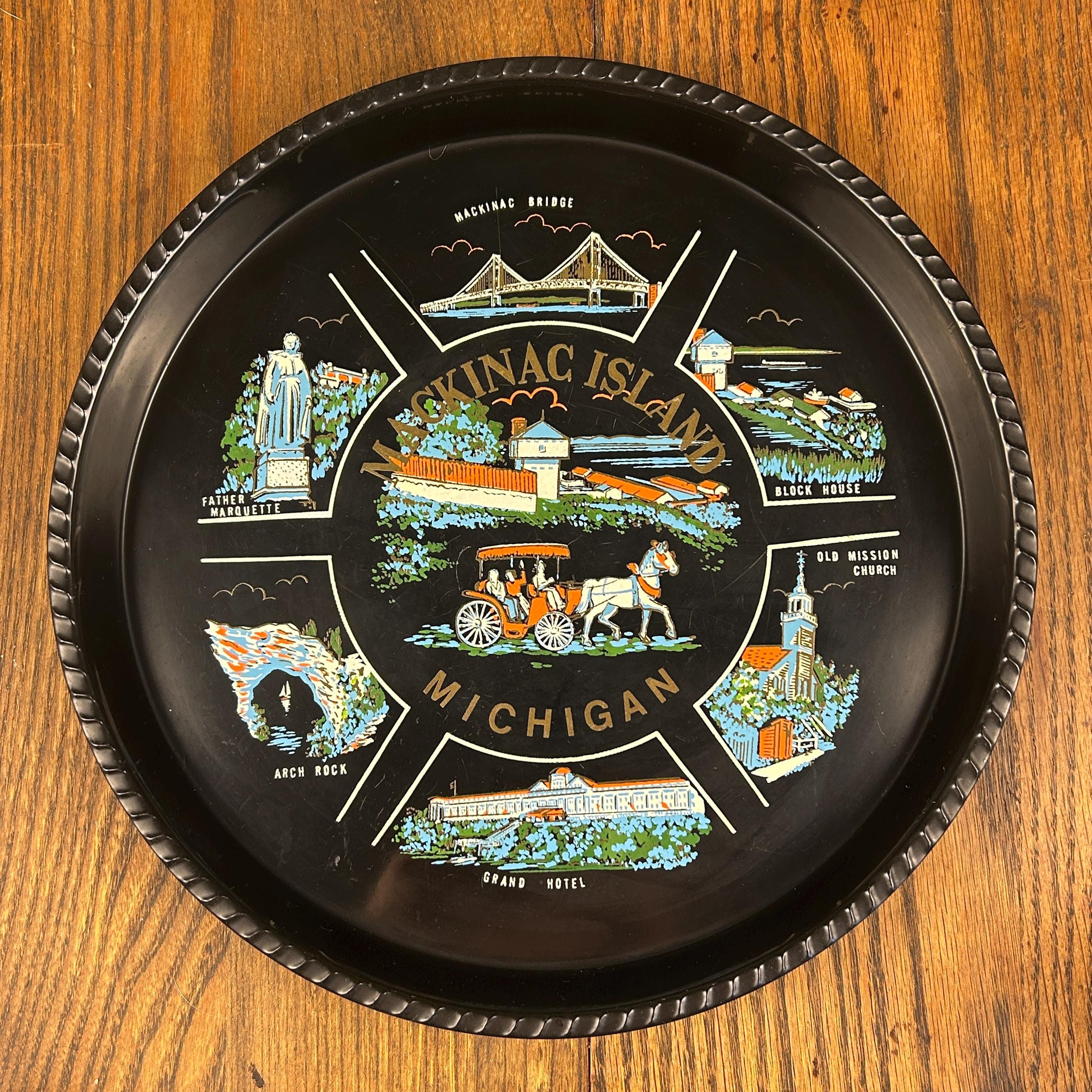 Illustrations include the iconic Grand Hotel, natural Arch Rock, the Mackinac Bridge, Block House, Old Mission Church, and a statue of Father Marquette. Souvenir trays like this were popular in the mid-20th century and were often produced to commemorate notable U.S. states and tourist attractions, making this a wonderful collectible piece.