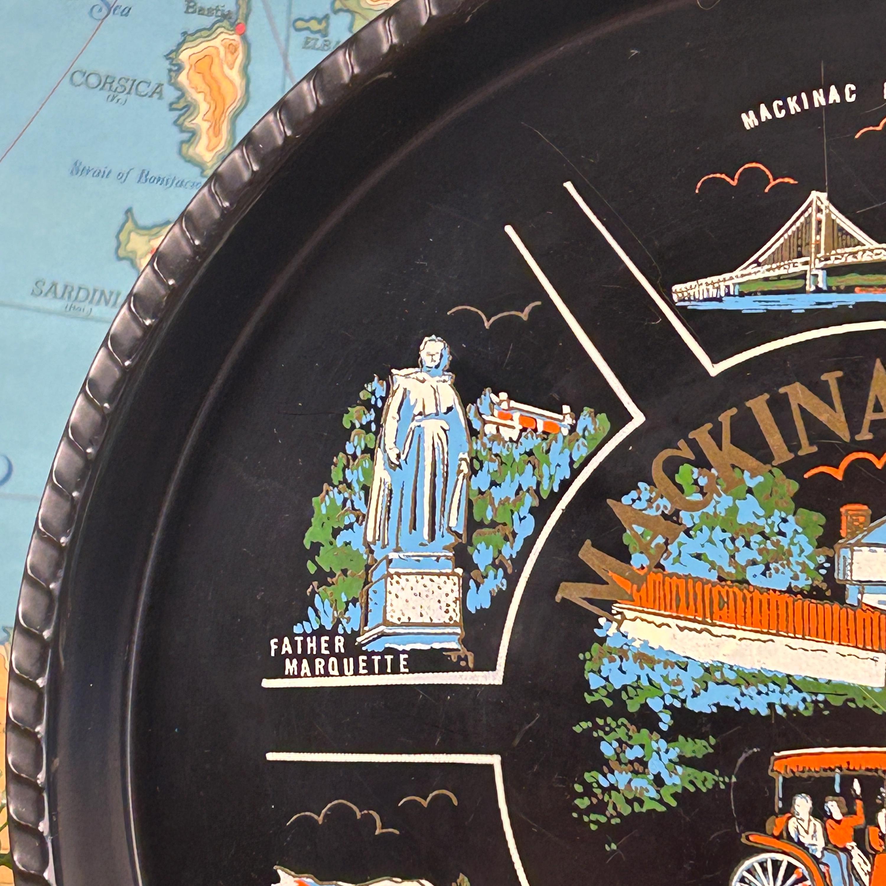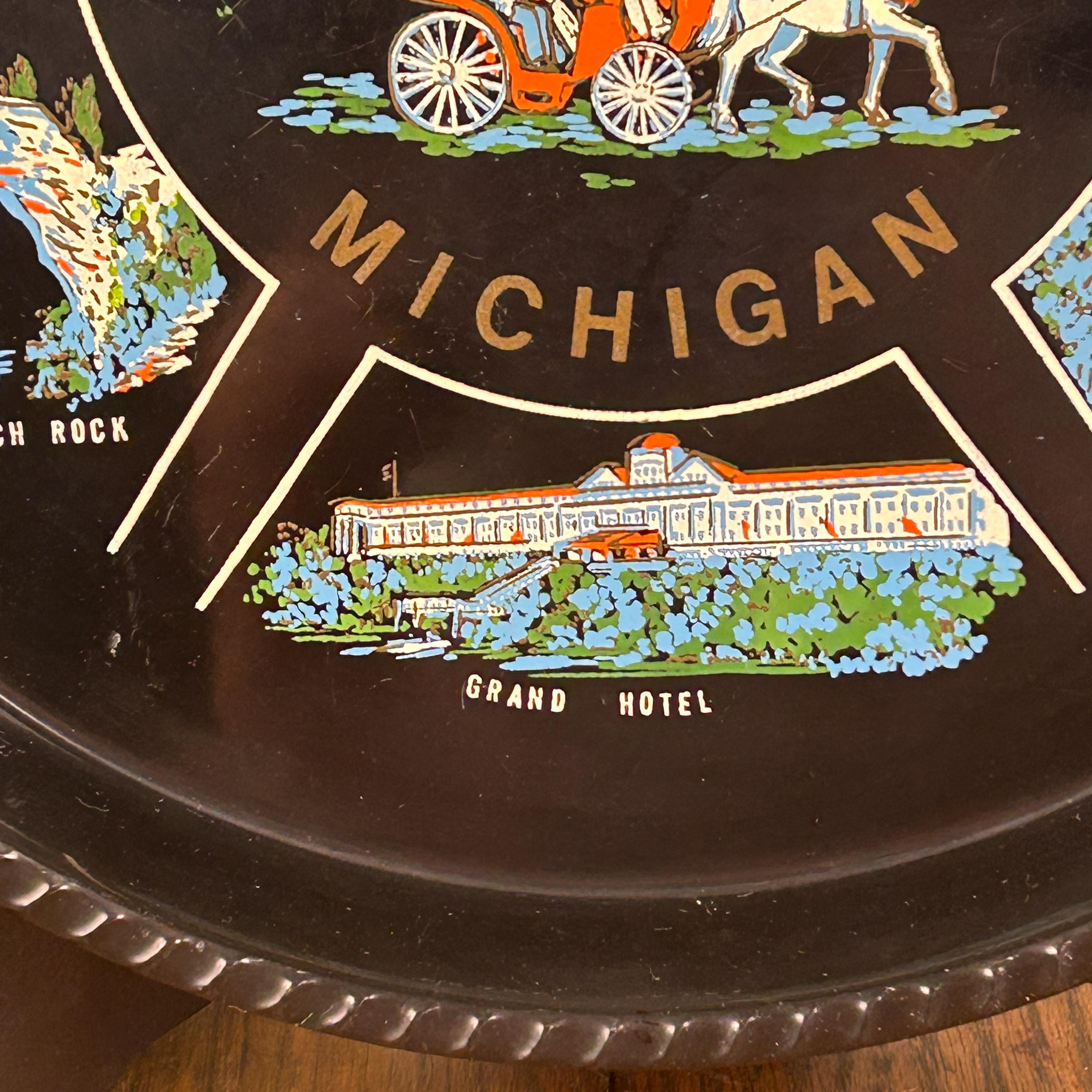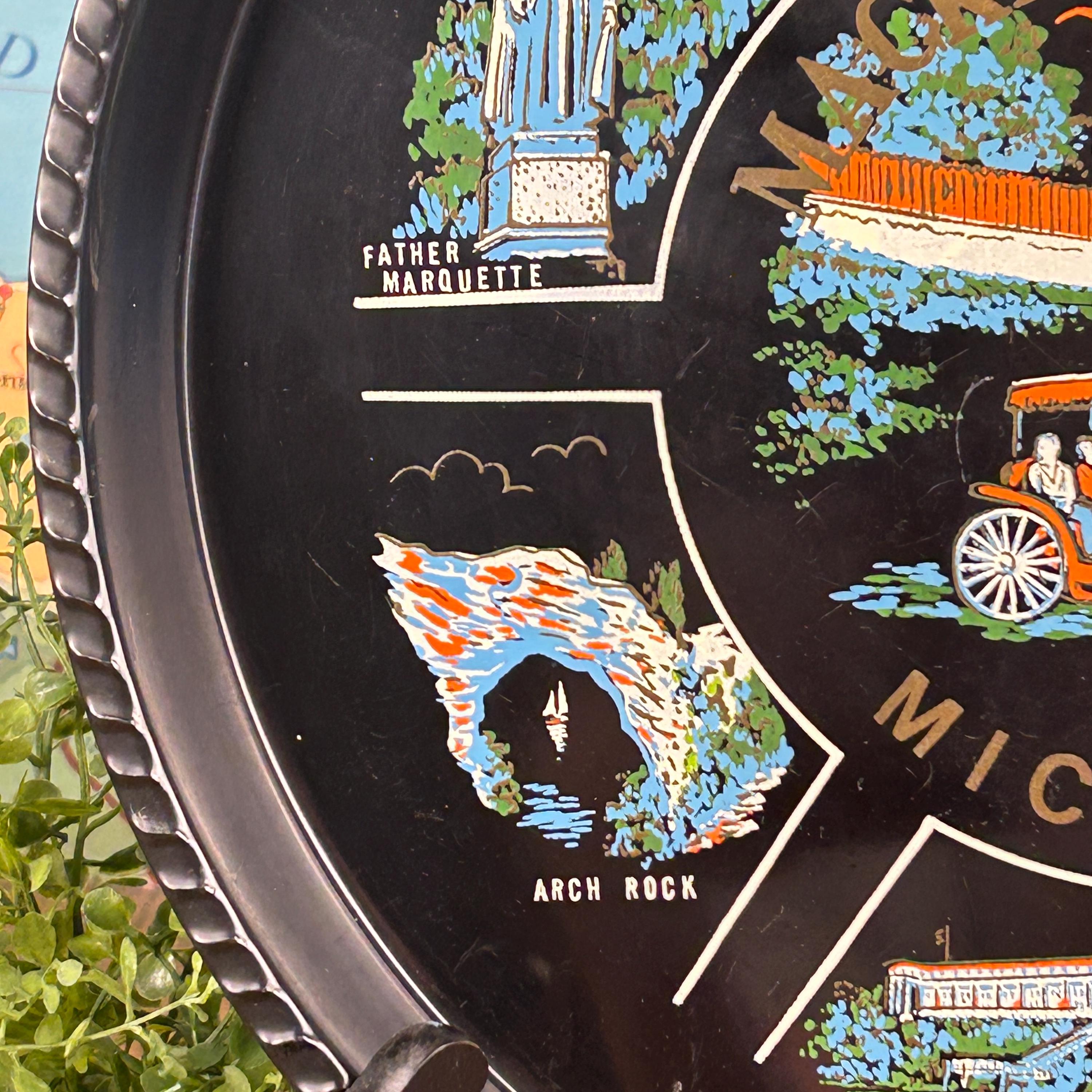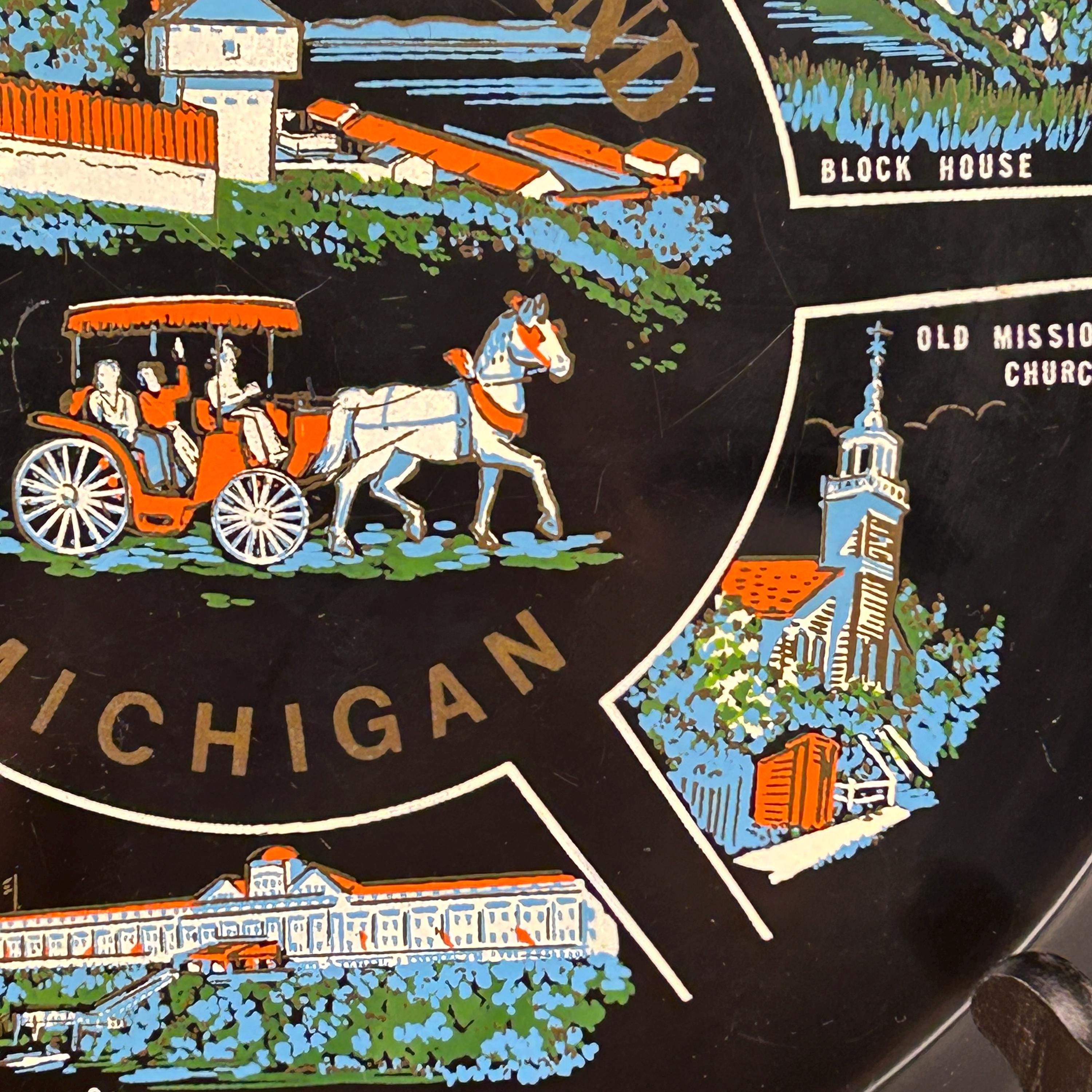 Illustrations include the iconic Grand Hotel, natural Arch Rock, the Mackinac Bridge, Block House, Old Mission Church, and a statue of Father Marquette. Souvenir trays like this were popular in the mid-20th century and were often produced to commemorate notable U.S. states and tourist attractions, making this a wonderful collectible piece.