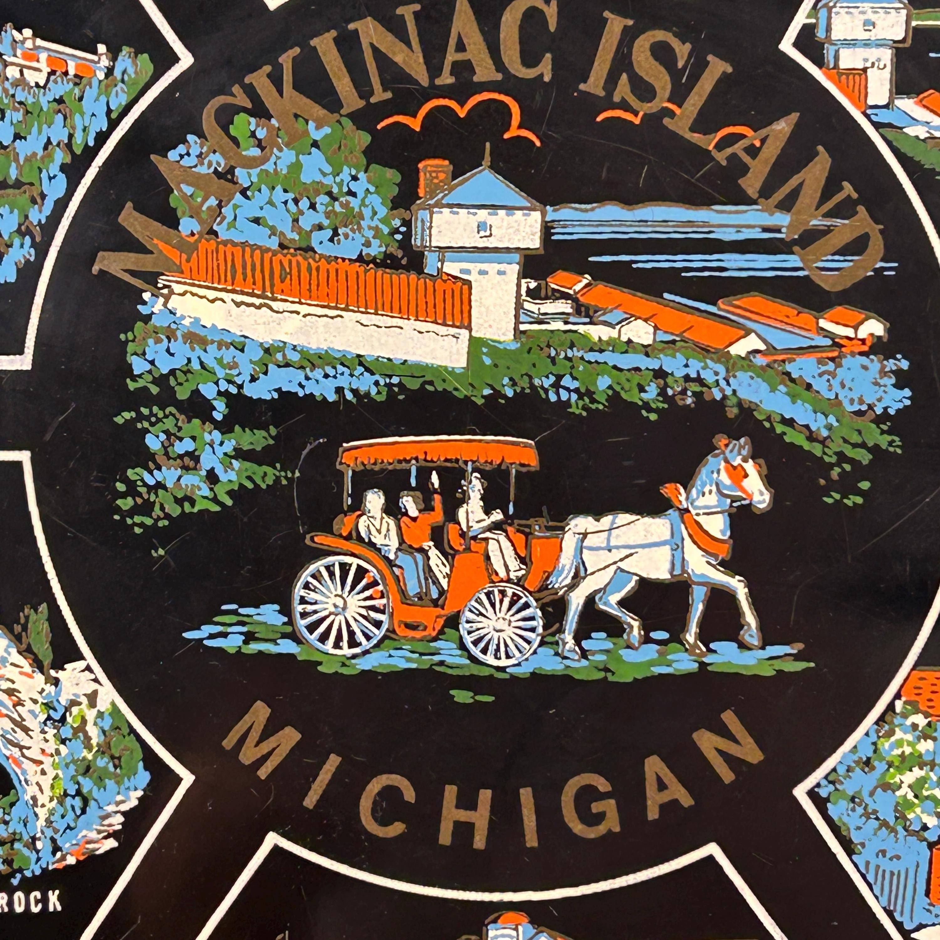Celebrate classic American travel nostalgia with this vintage Mackinac Island, Michigan souvenir serving tray. Made in a black round form of durable plastic, the tray features colorful illustrated scenes of beloved Mackinac landmarks, capturing the charm of this historic destination.