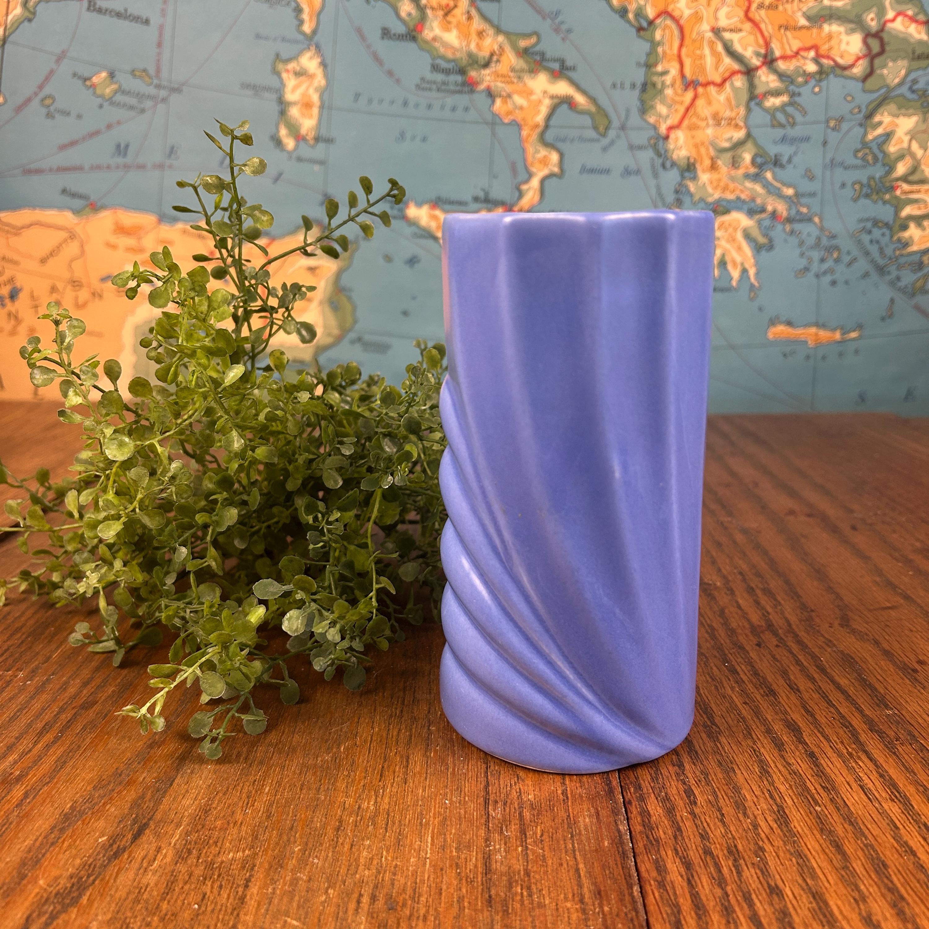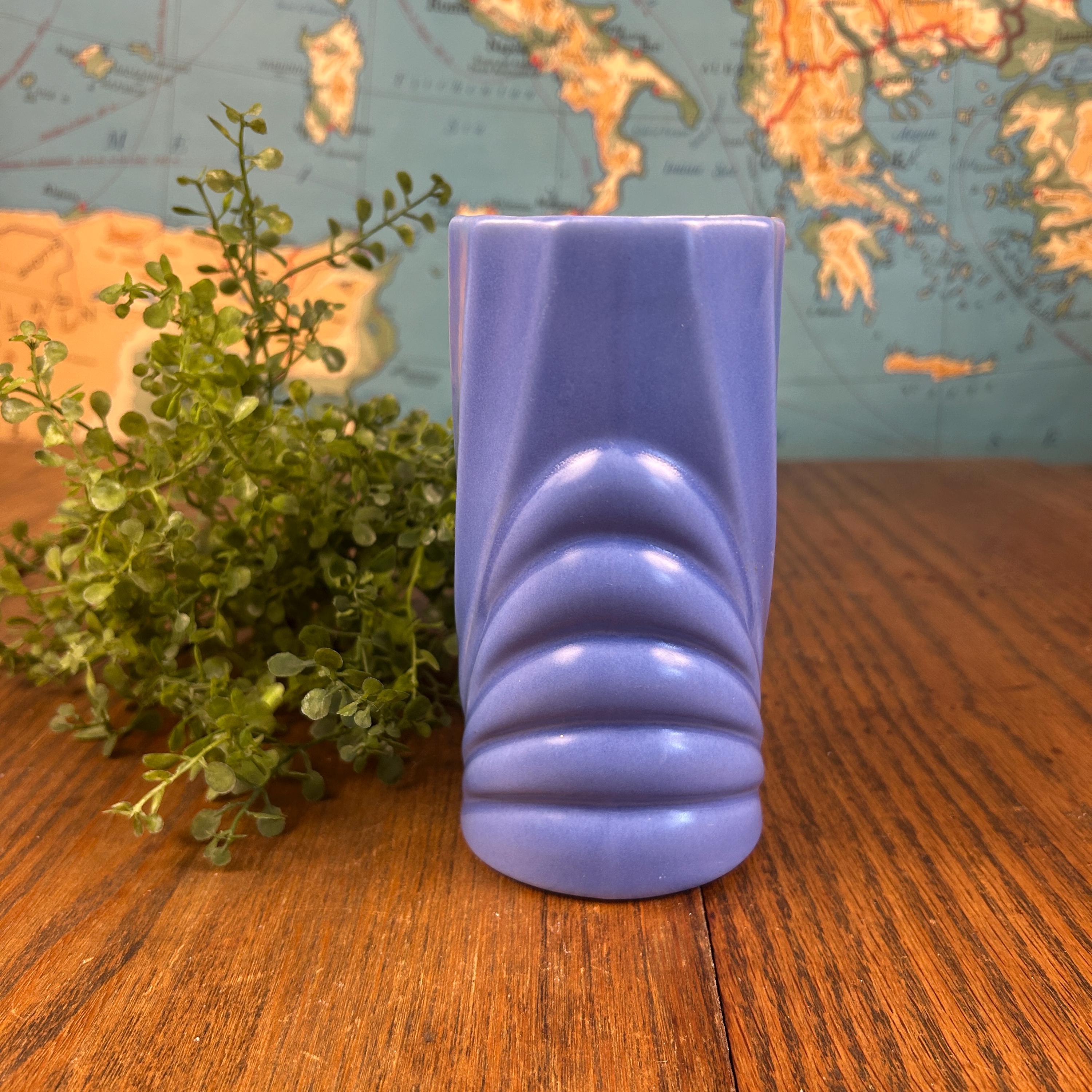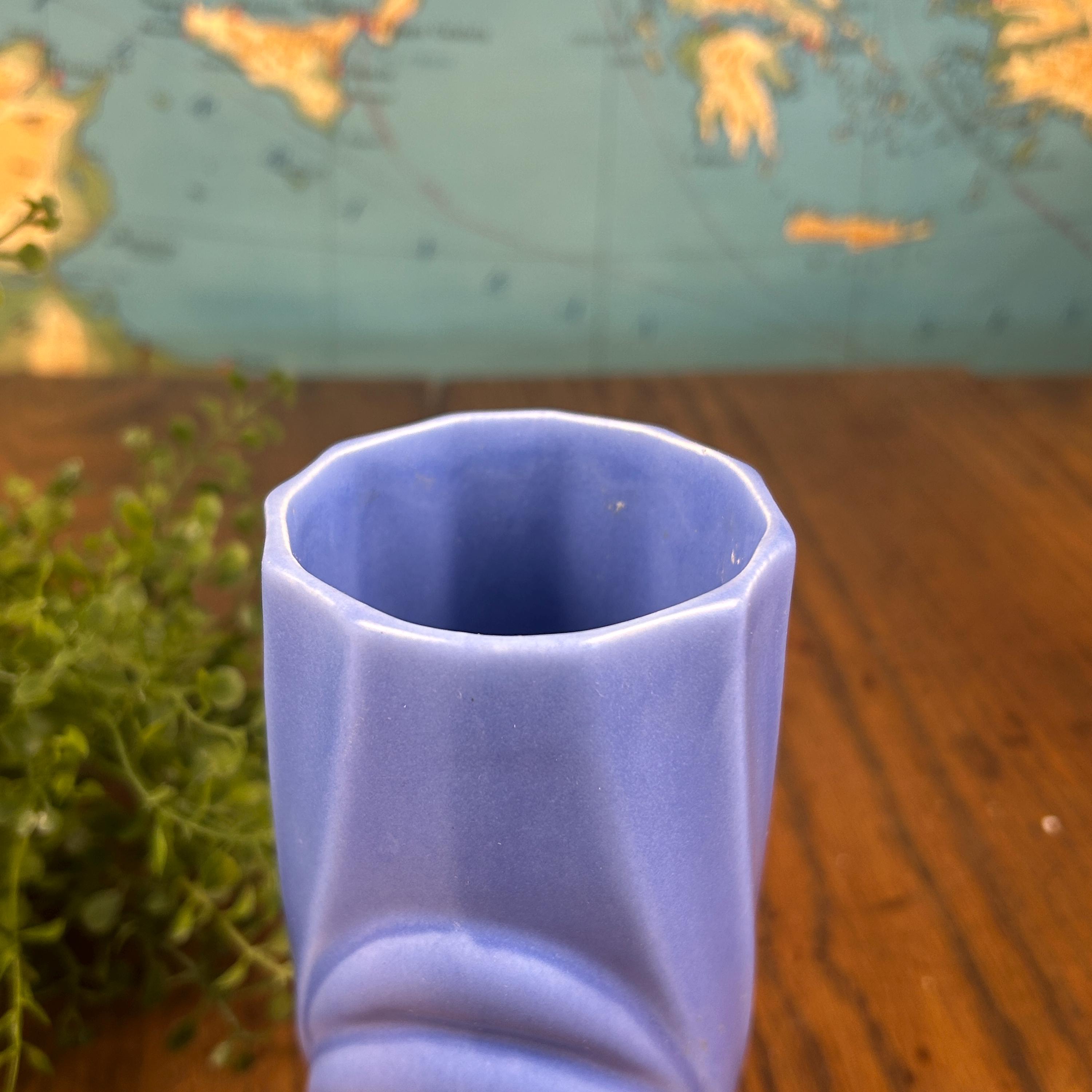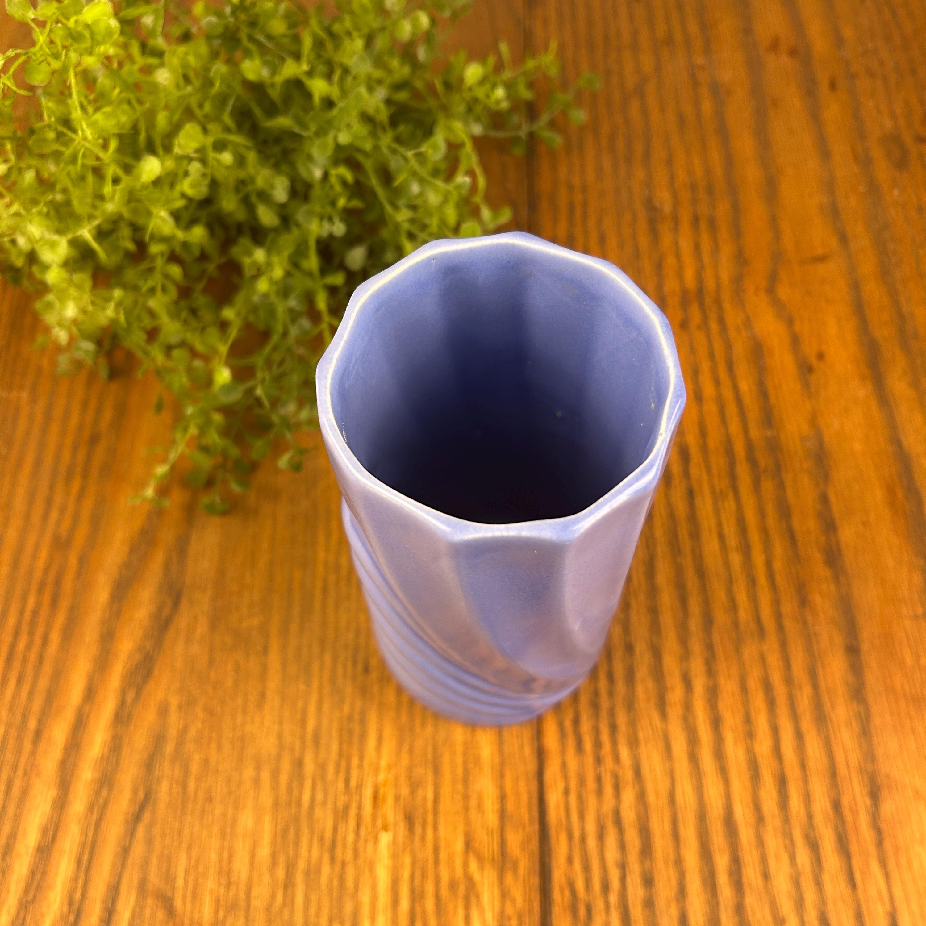 This vintage periwinkle blue vase showcases classic Art Deco style with clean lines and a timeless geometric silhouette. The soft blue glaze adds an elegant pop of color while remaining versatile enough for both modern and vintage-inspired interiors.