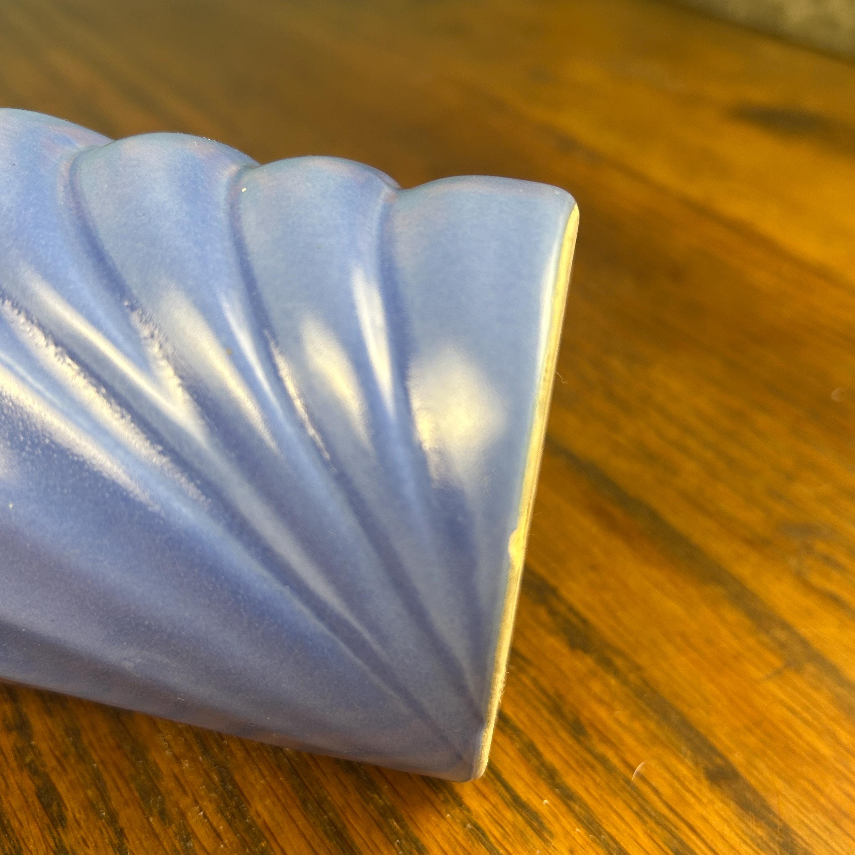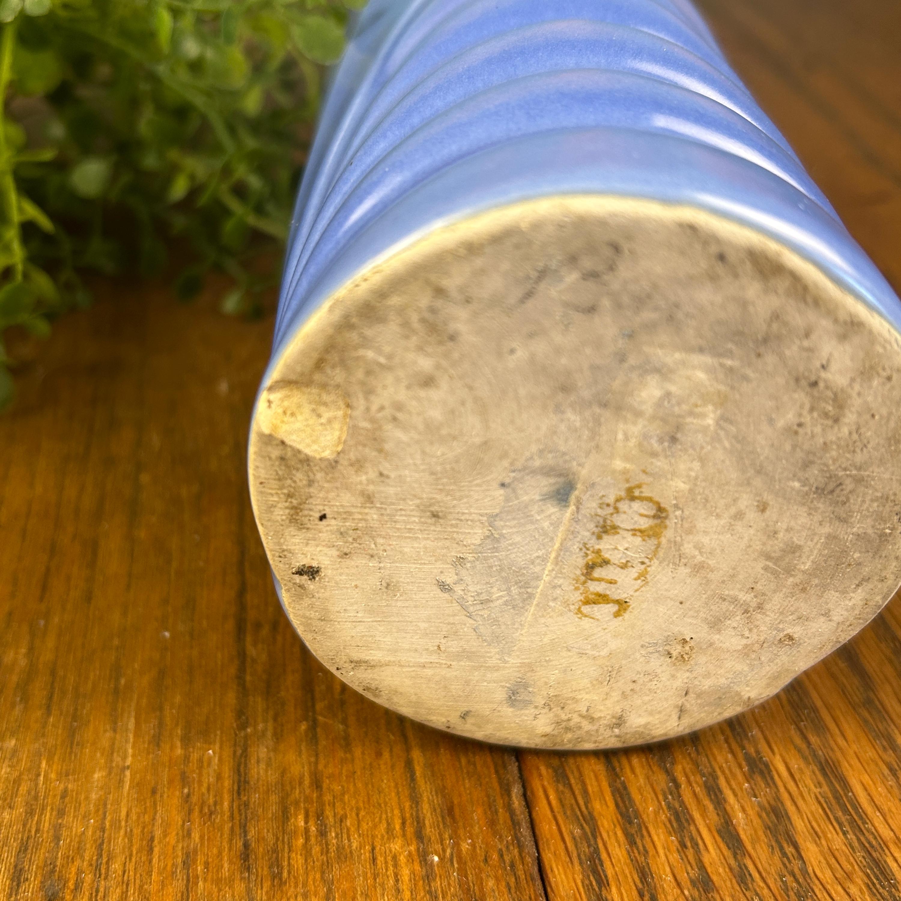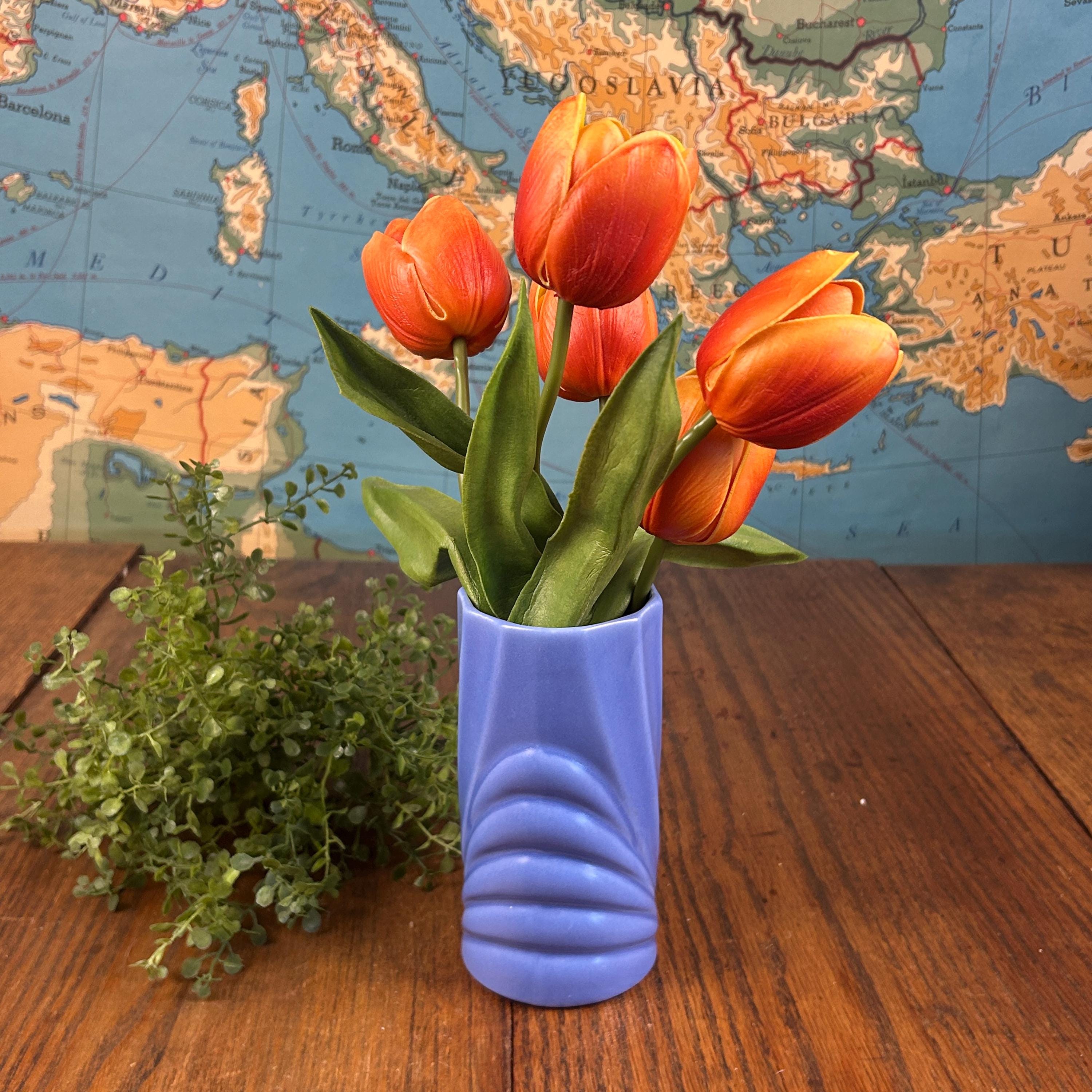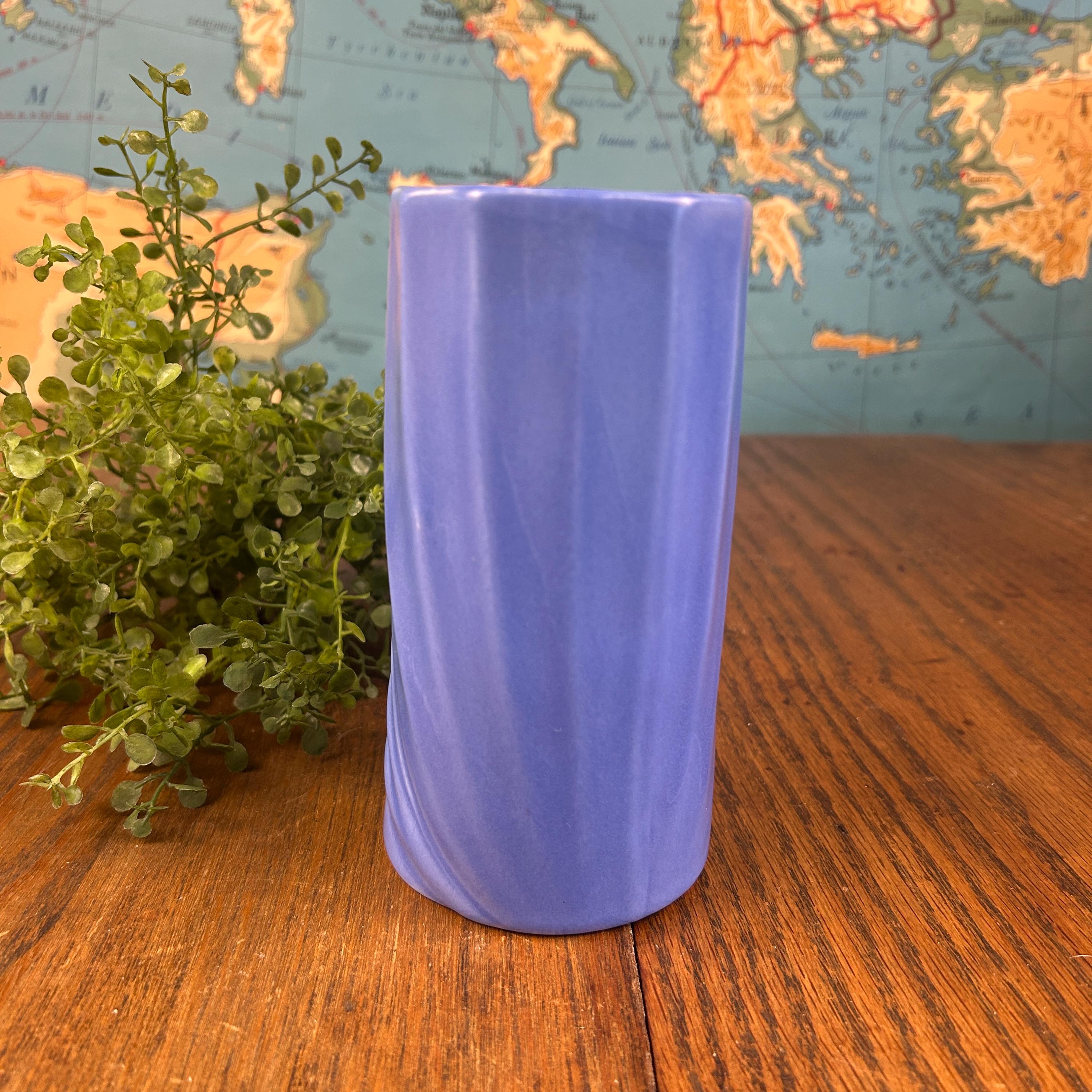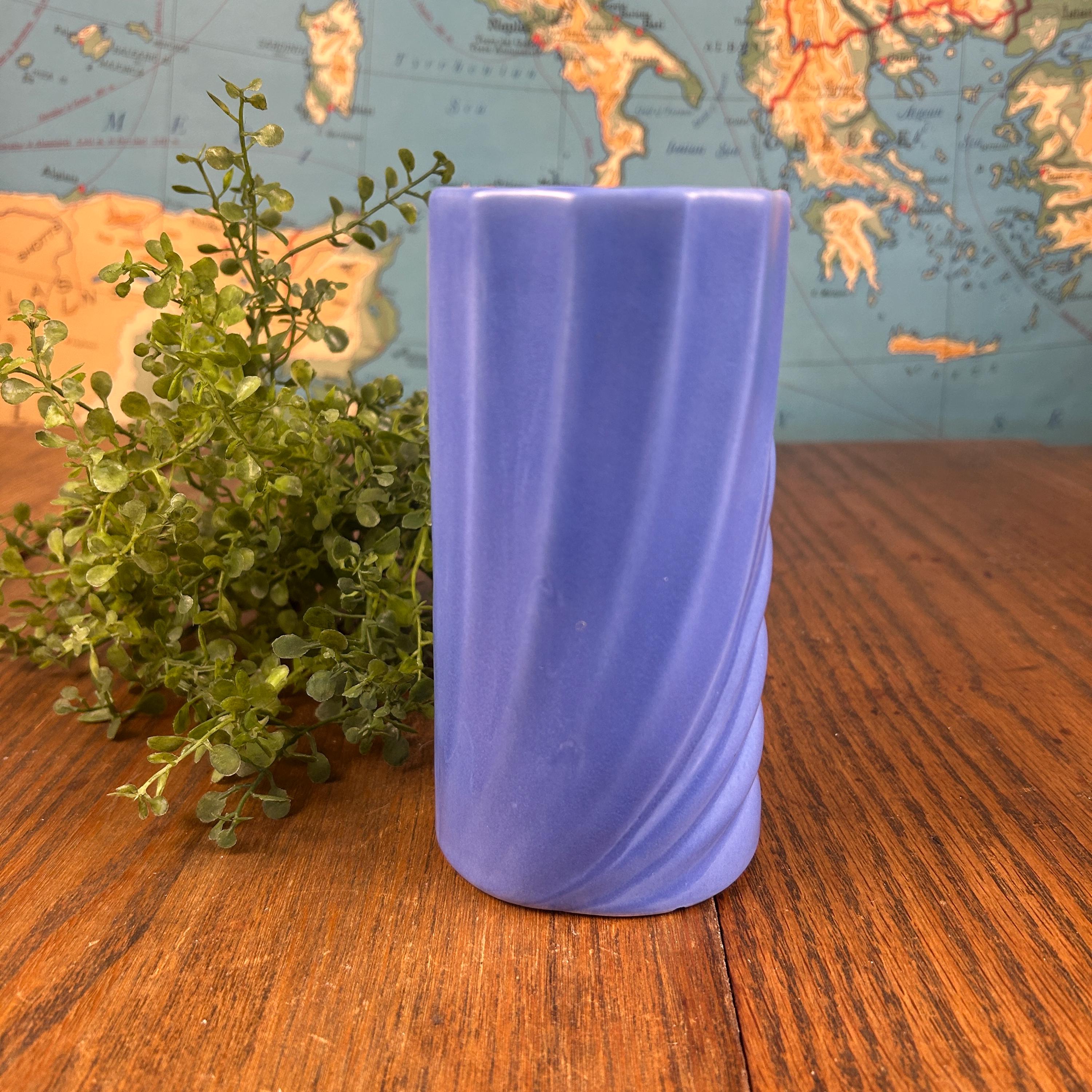 This vintage periwinkle blue vase showcases classic Art Deco style with clean lines and a timeless geometric silhouette. The soft blue glaze adds an elegant pop of color while remaining versatile enough for both modern and vintage-inspired interiors.