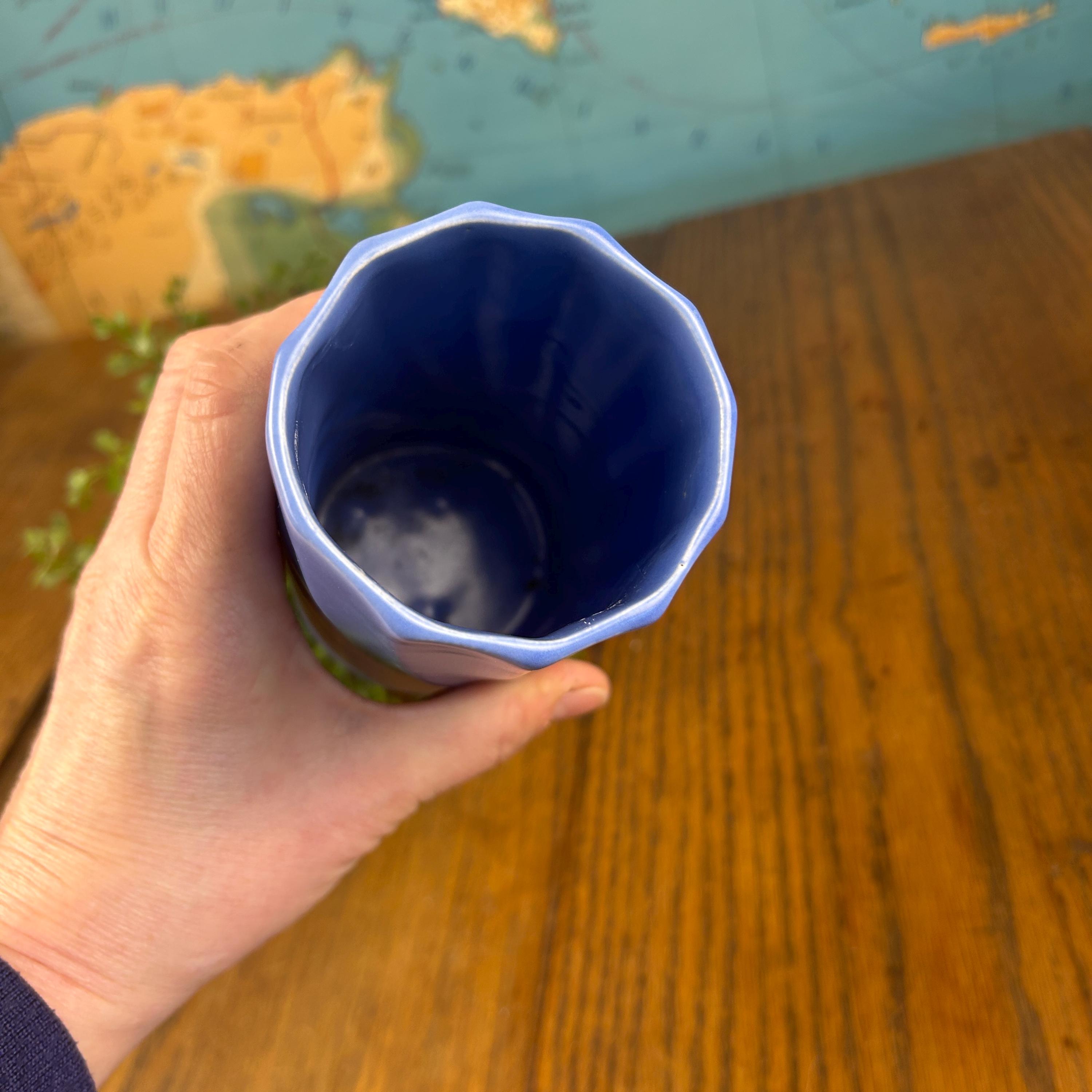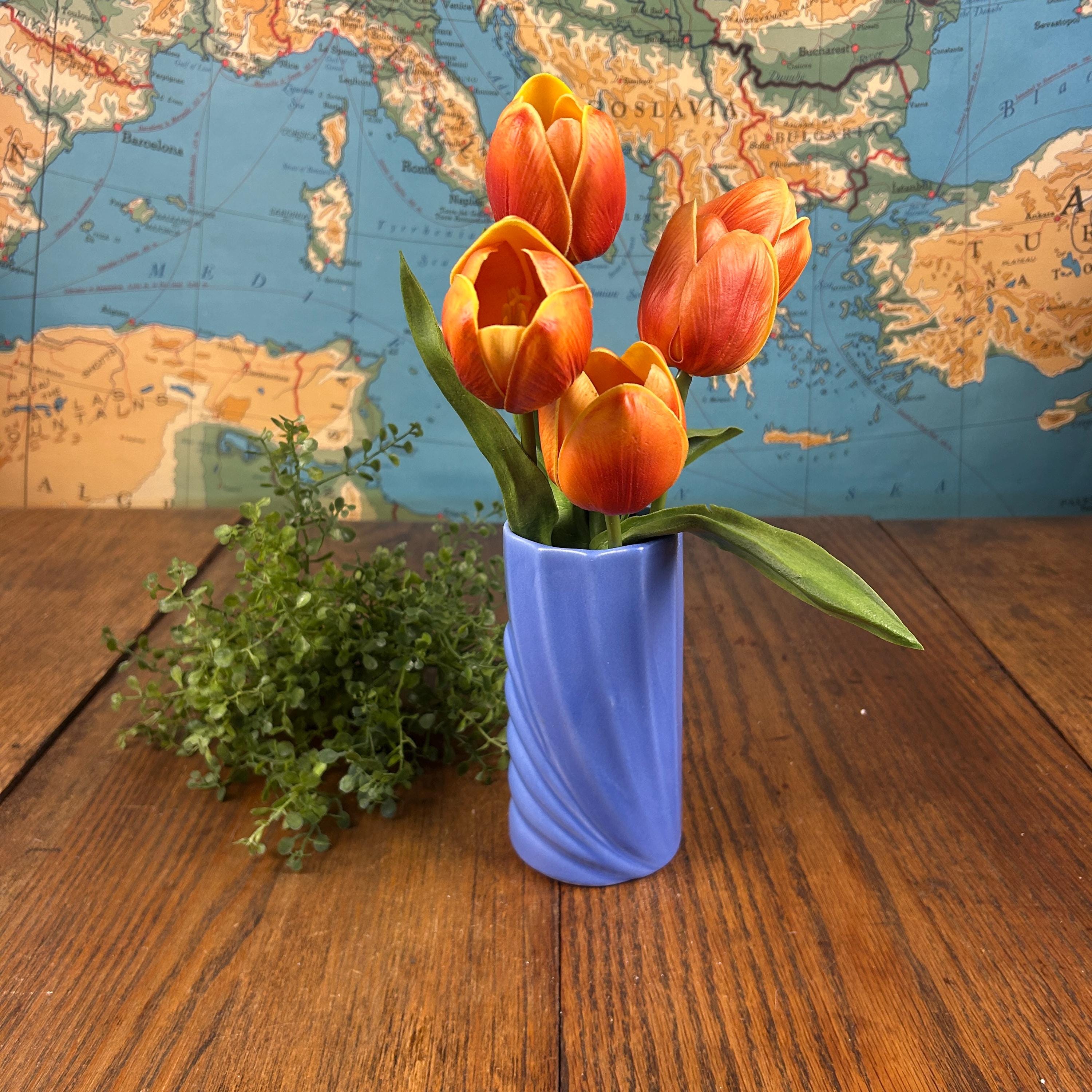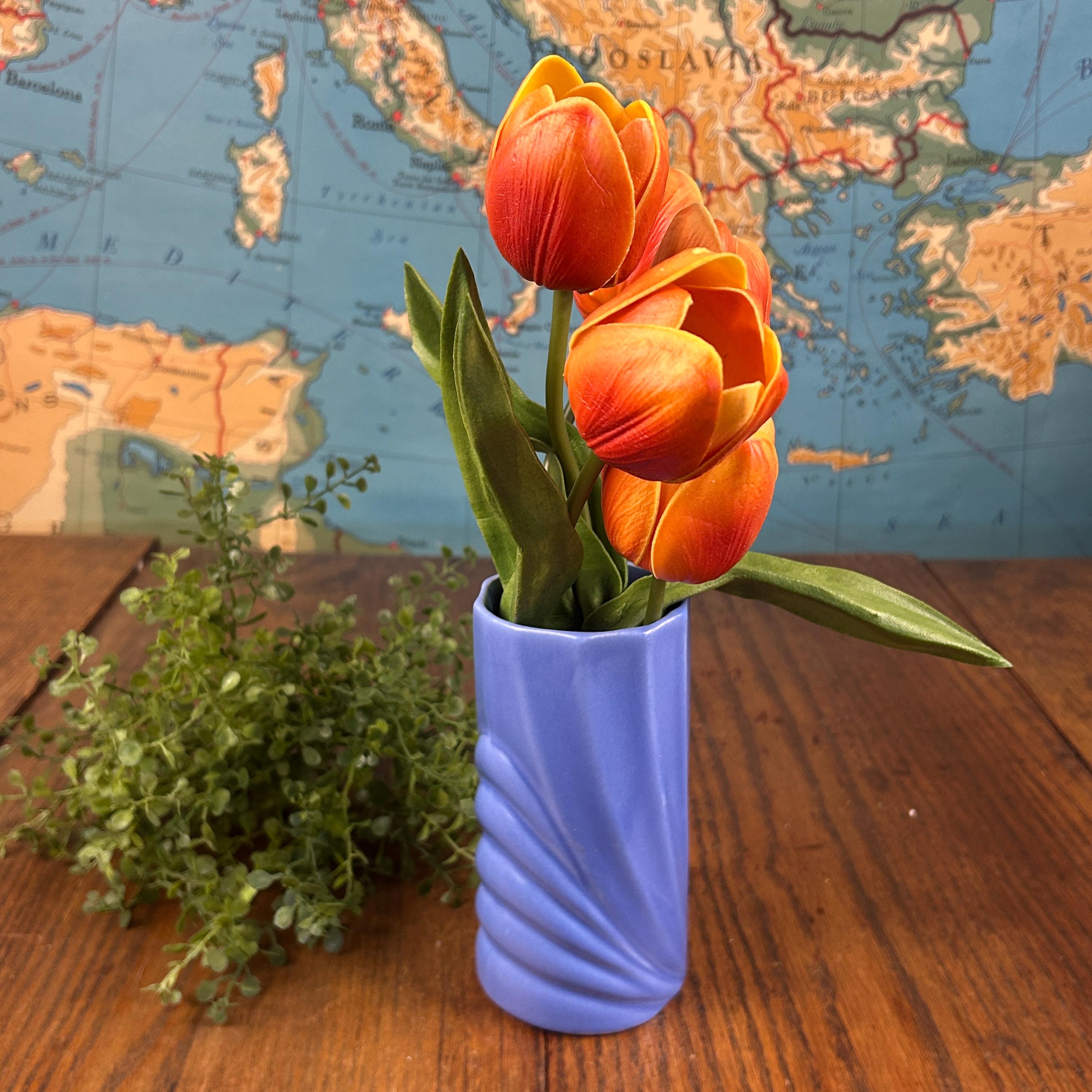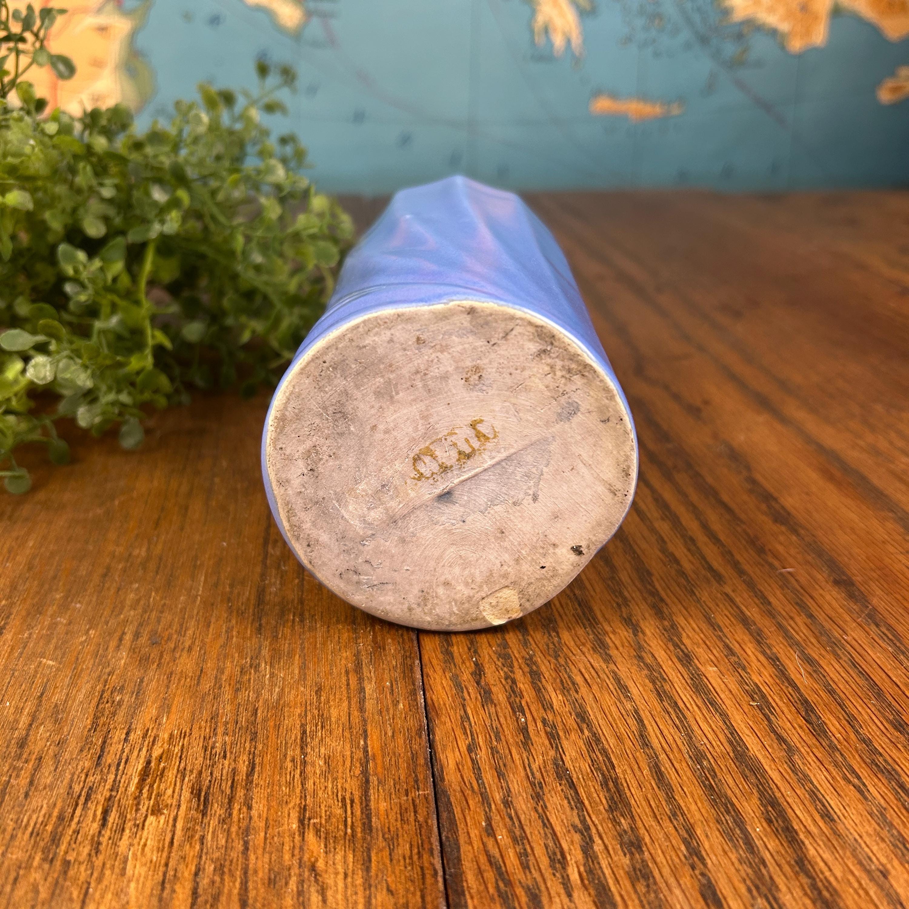 This vintage periwinkle blue vase showcases classic Art Deco style with clean lines and a timeless geometric silhouette. The soft blue glaze adds an elegant pop of color while remaining versatile enough for both modern and vintage-inspired interiors.