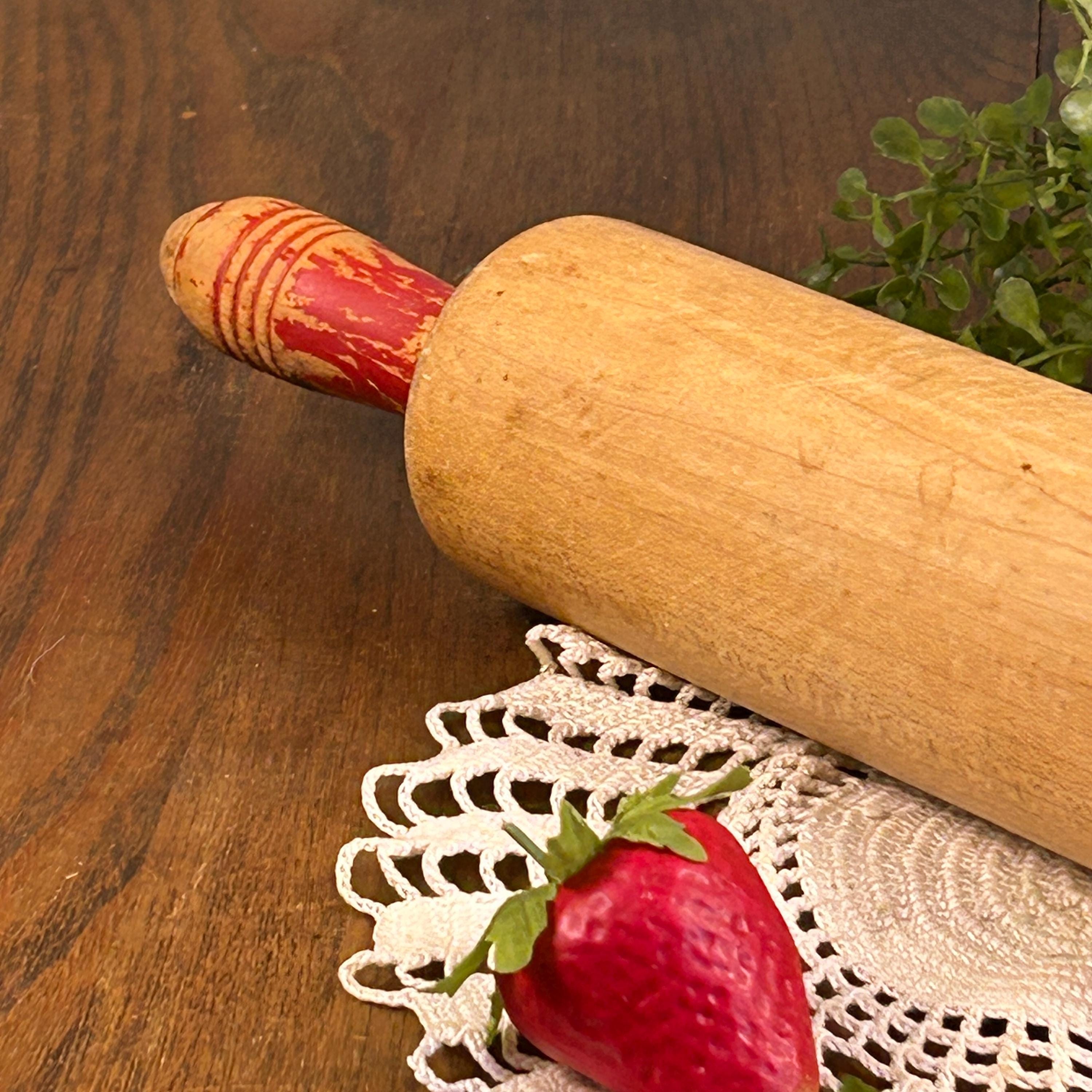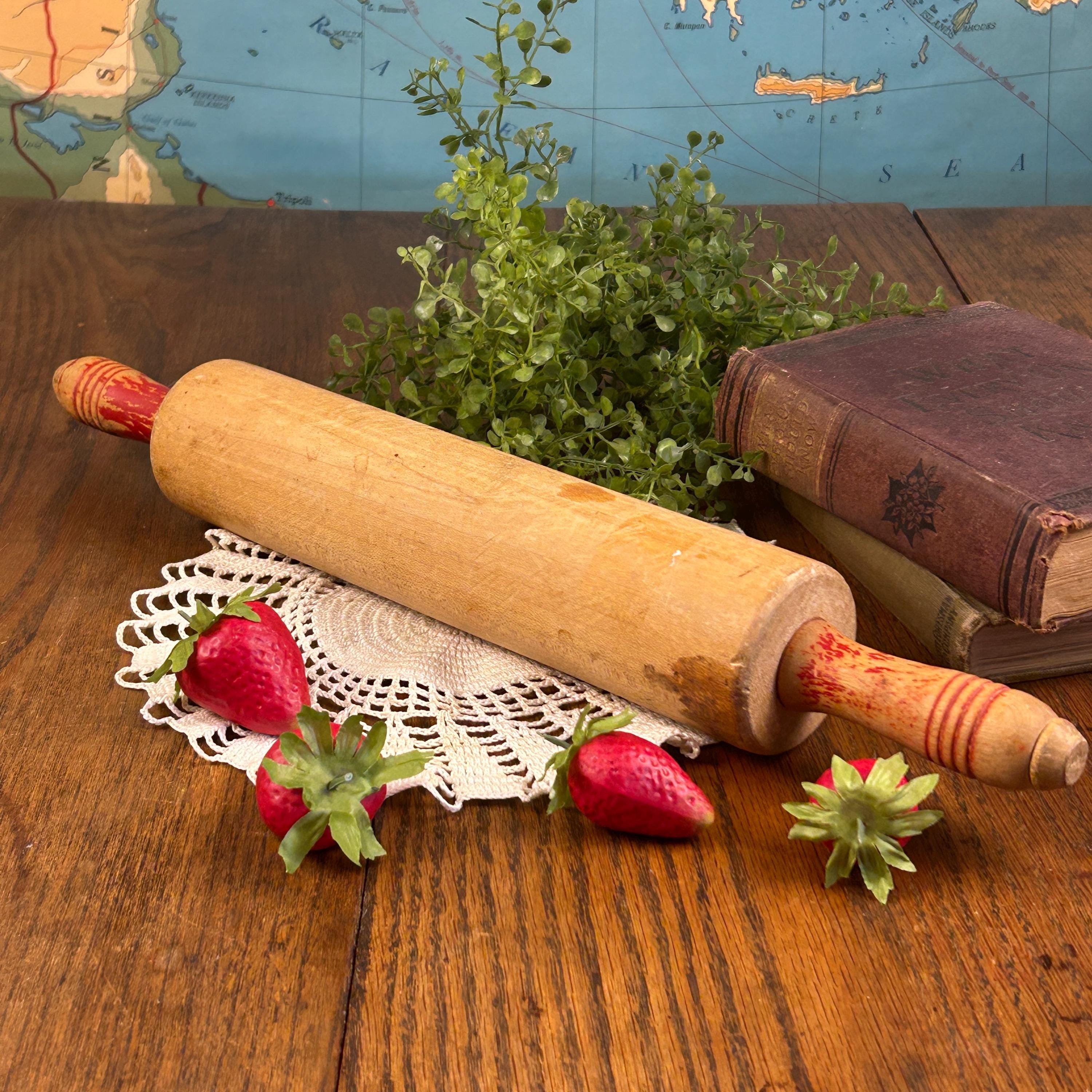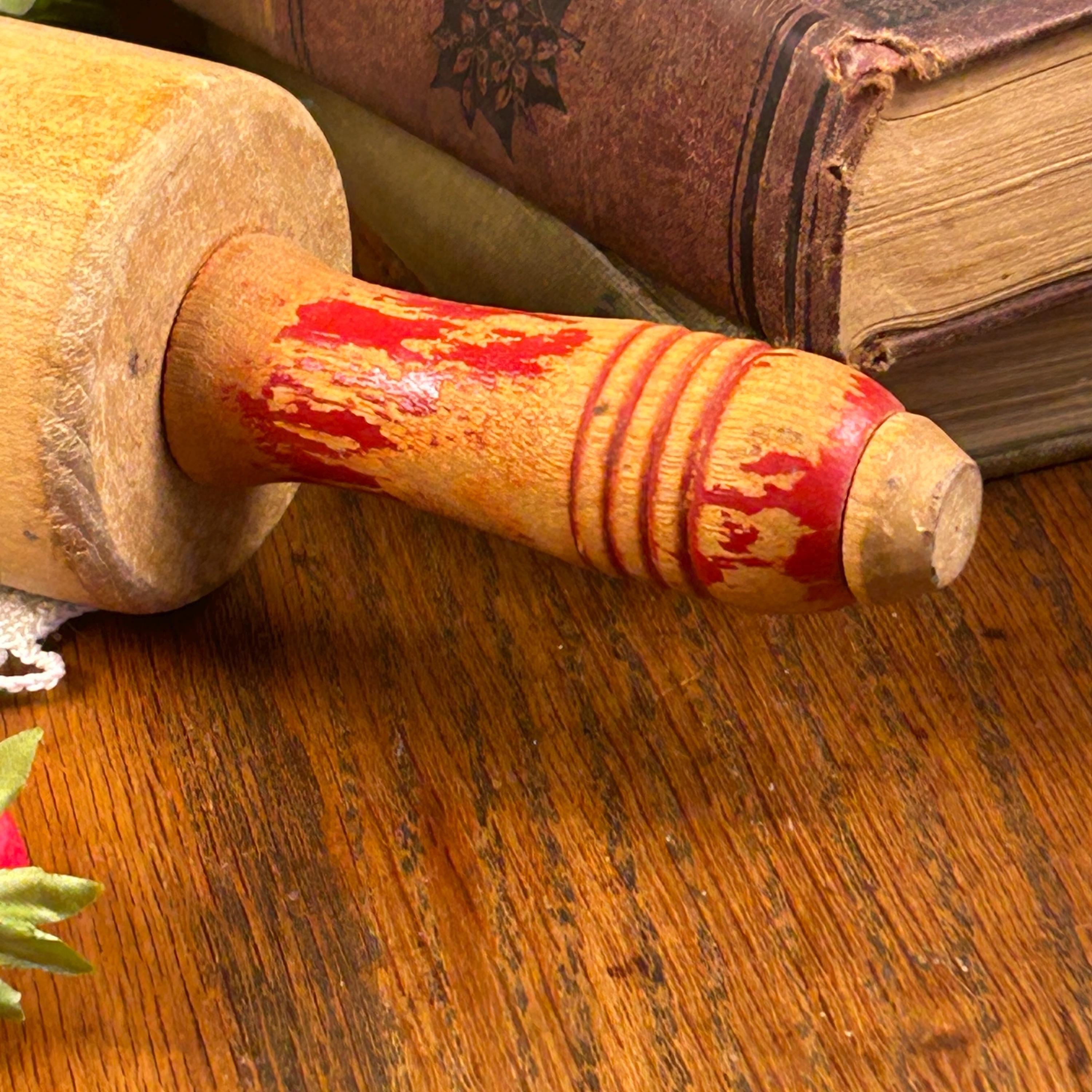 This vintage wooden rolling pin features classic red-painted handles with visible wear that adds to its authentic, timeworn charm. The natural patina and signs of age make this piece especially appealing to farmhouse, primitive, and country-style kitchens.