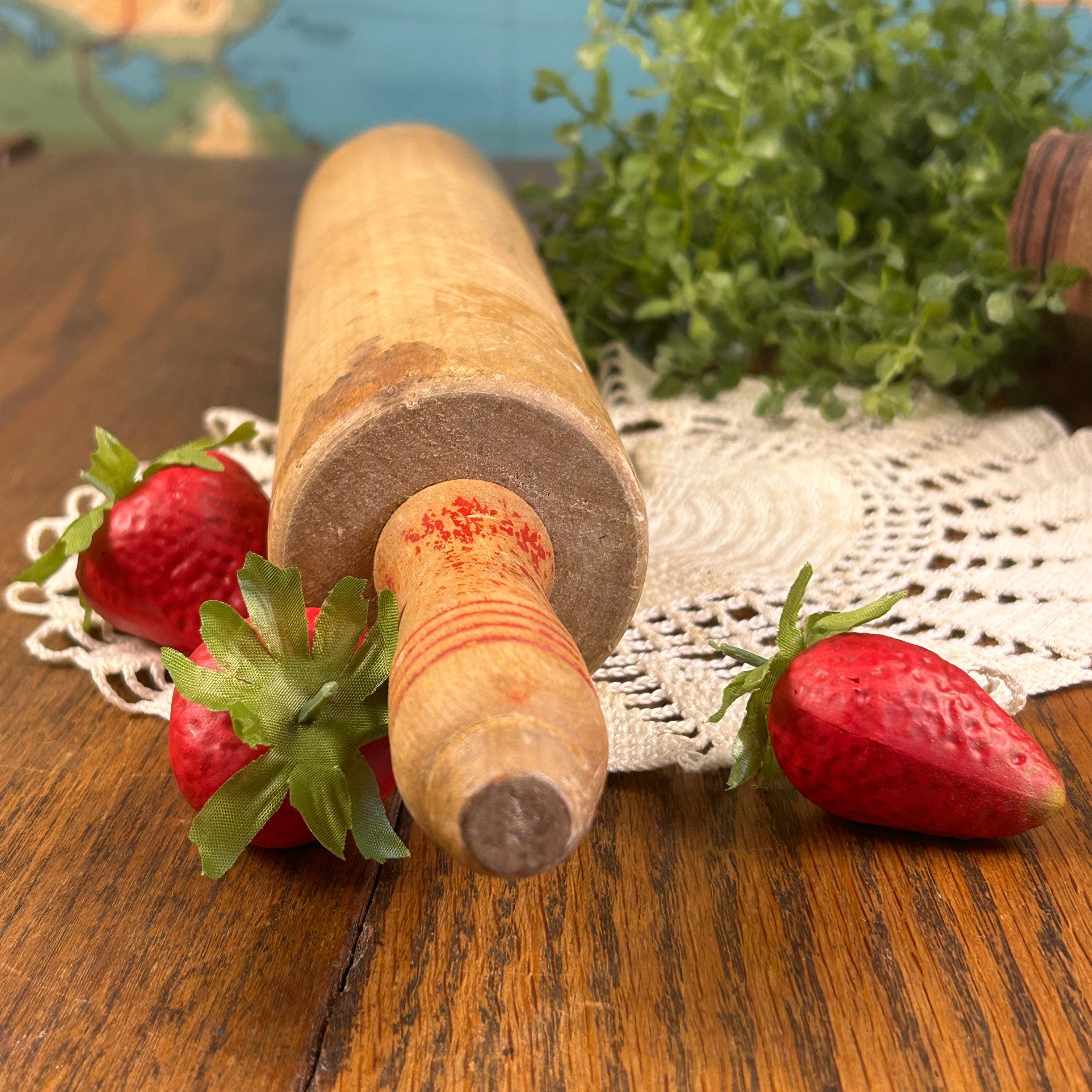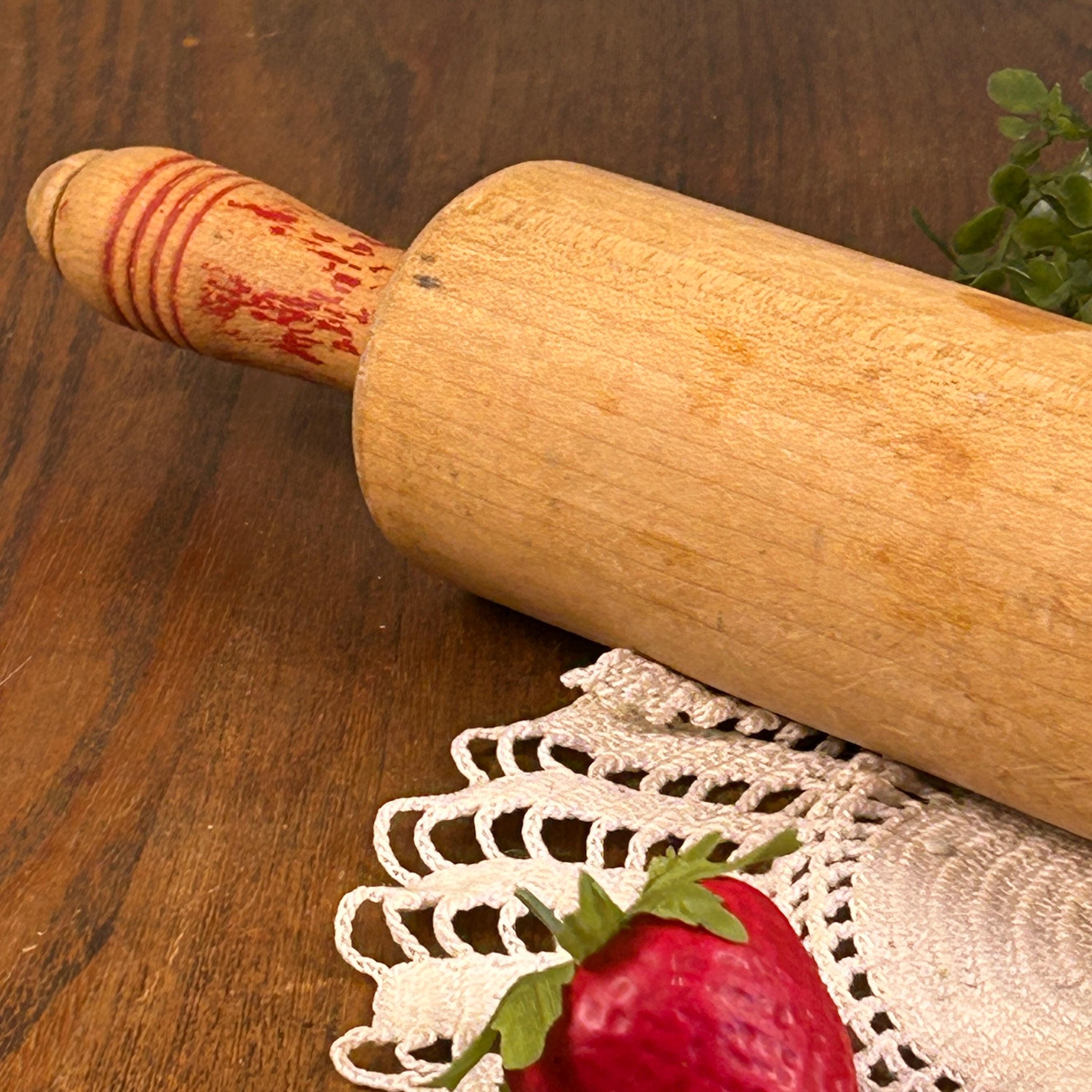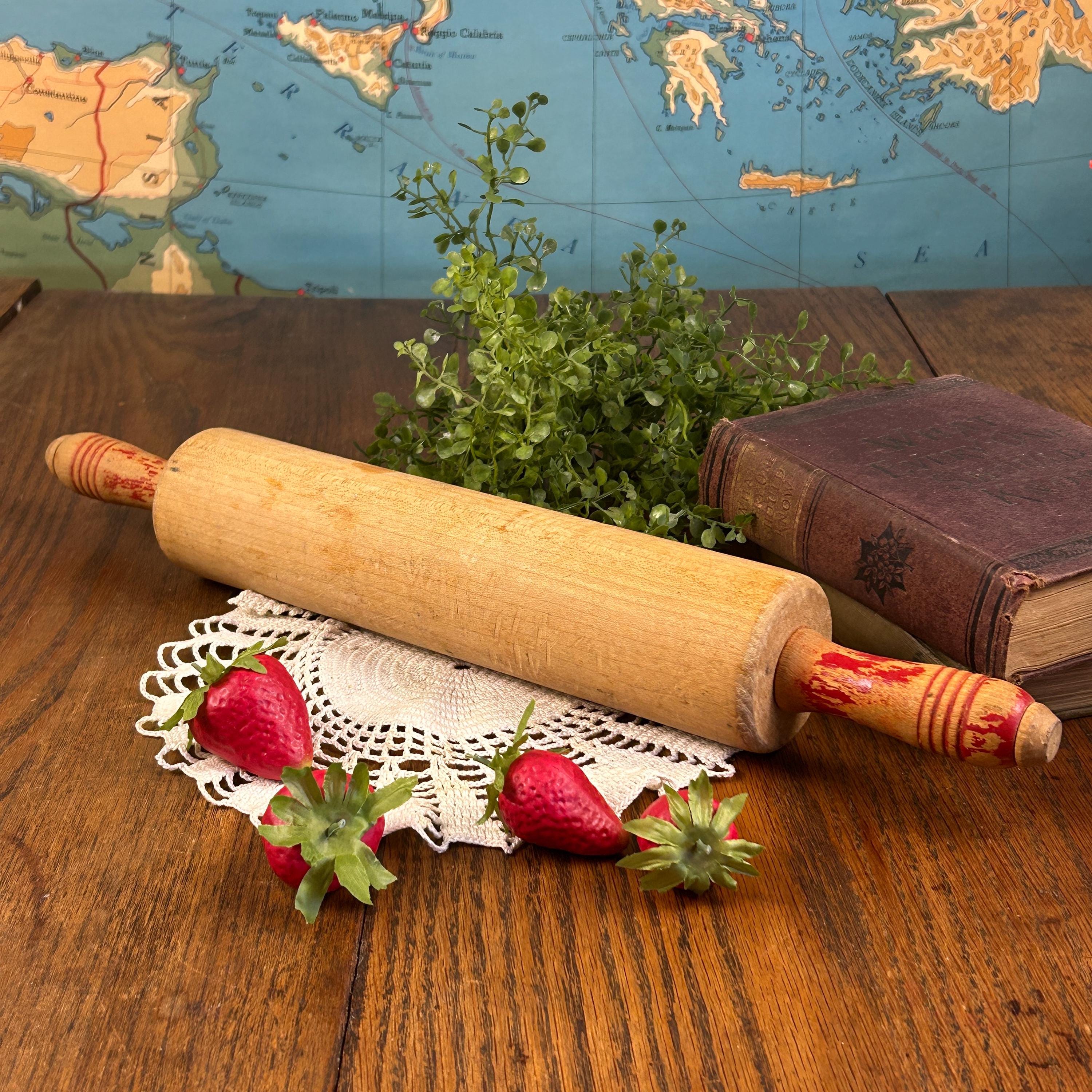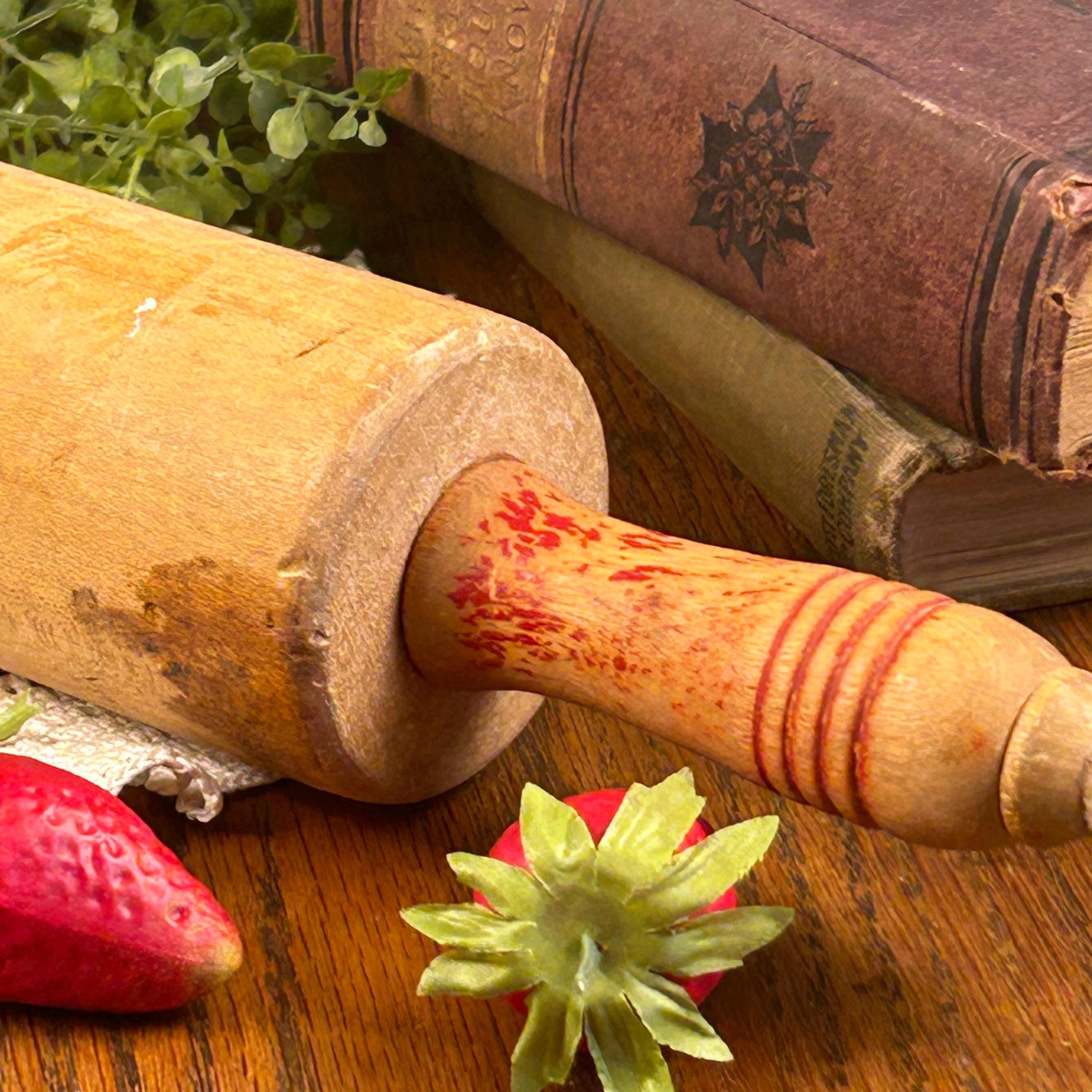 This vintage wooden rolling pin features classic red-painted handles with visible wear that adds to its authentic, timeworn charm. The natural patina and signs of age make this piece especially appealing to farmhouse, primitive, and country-style kitchens.