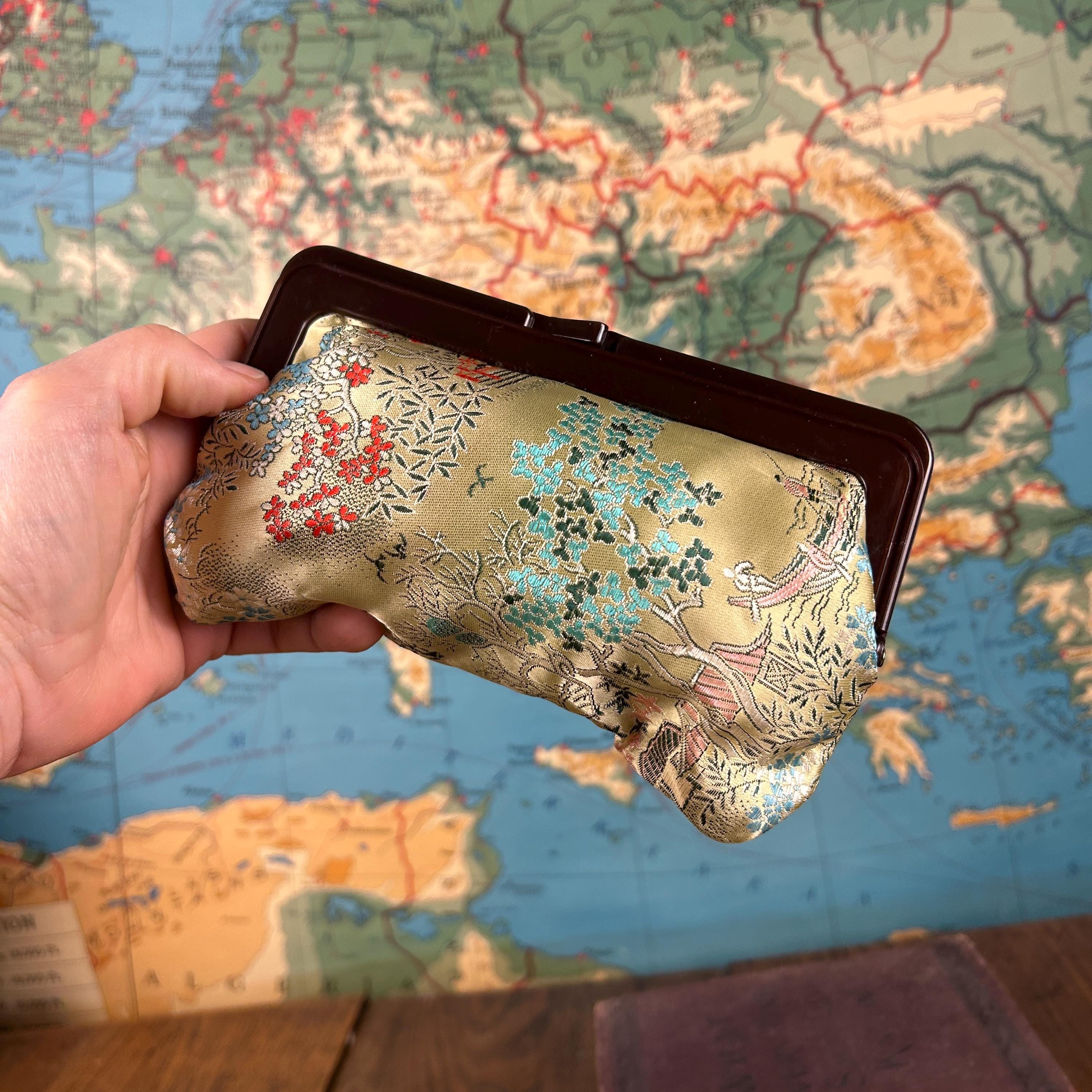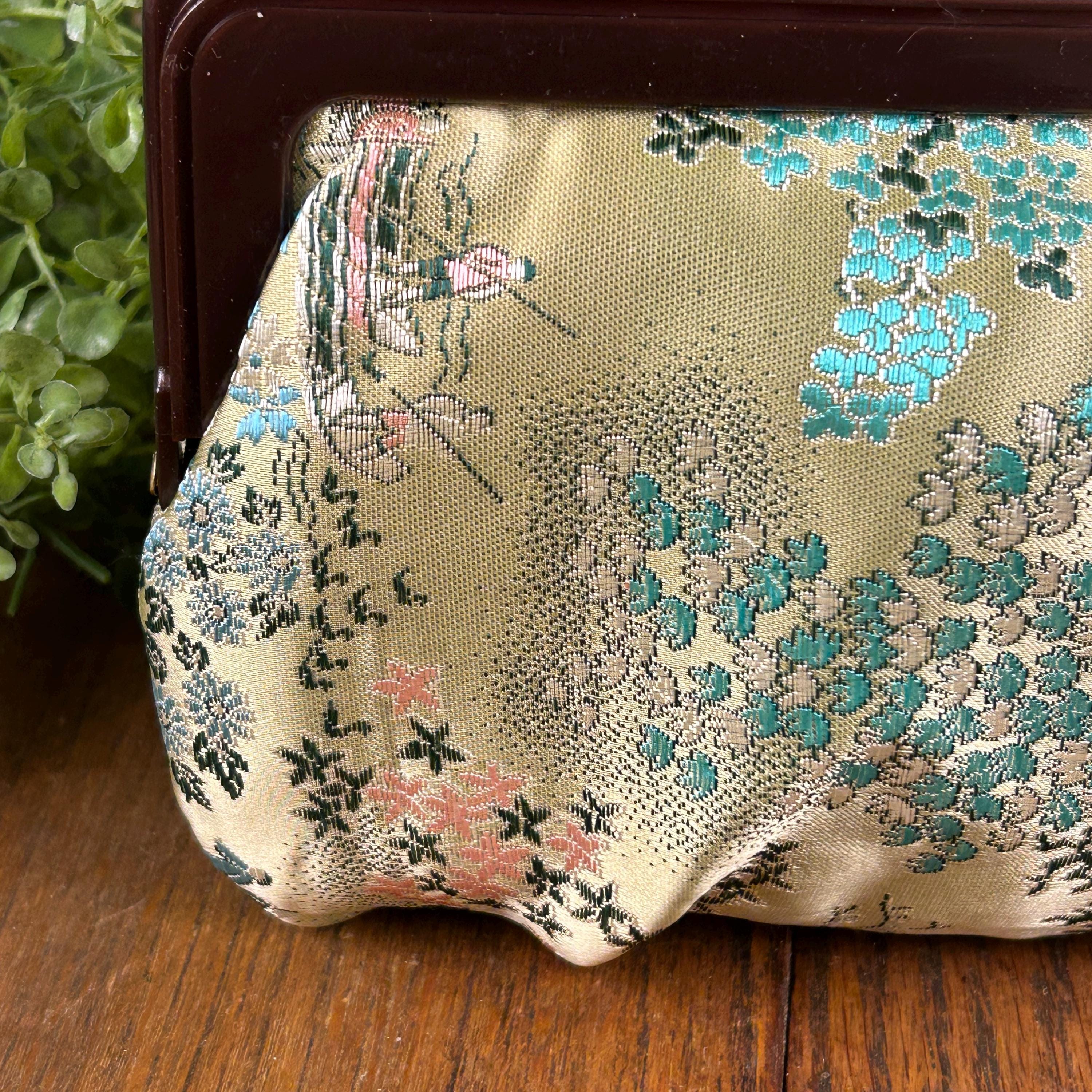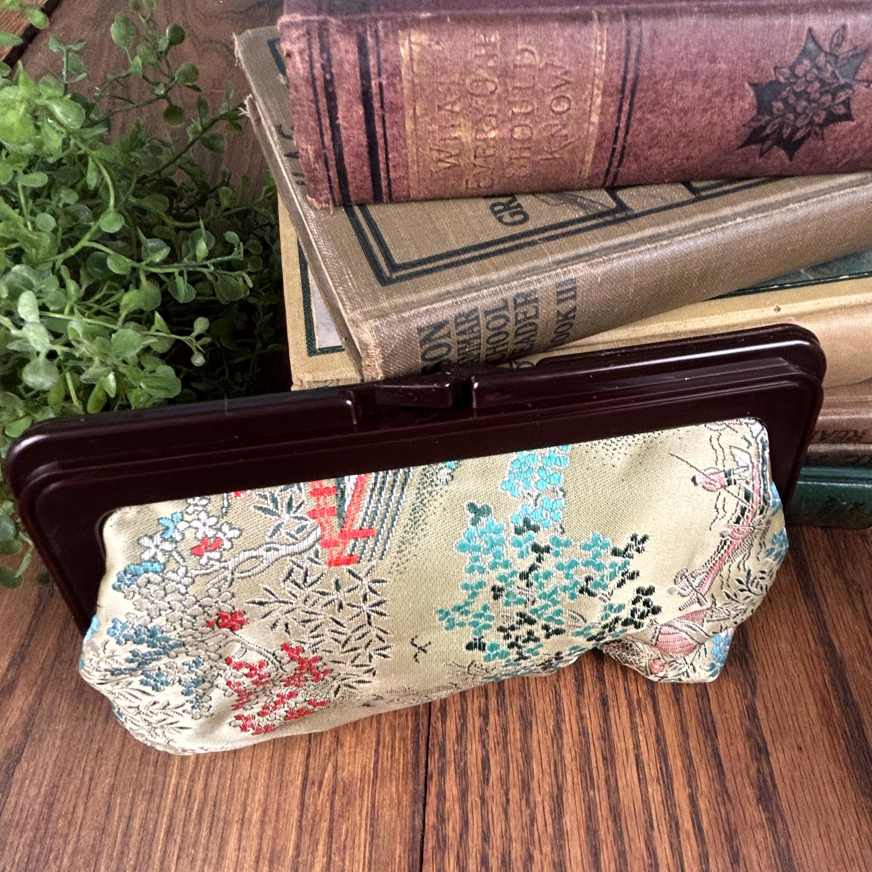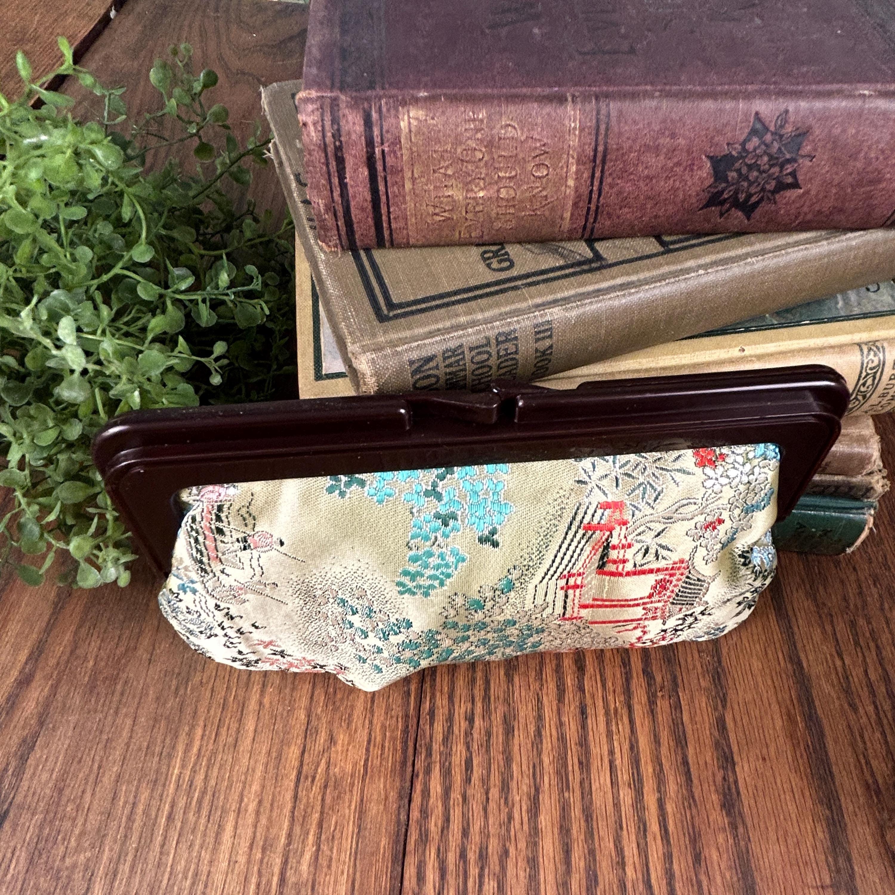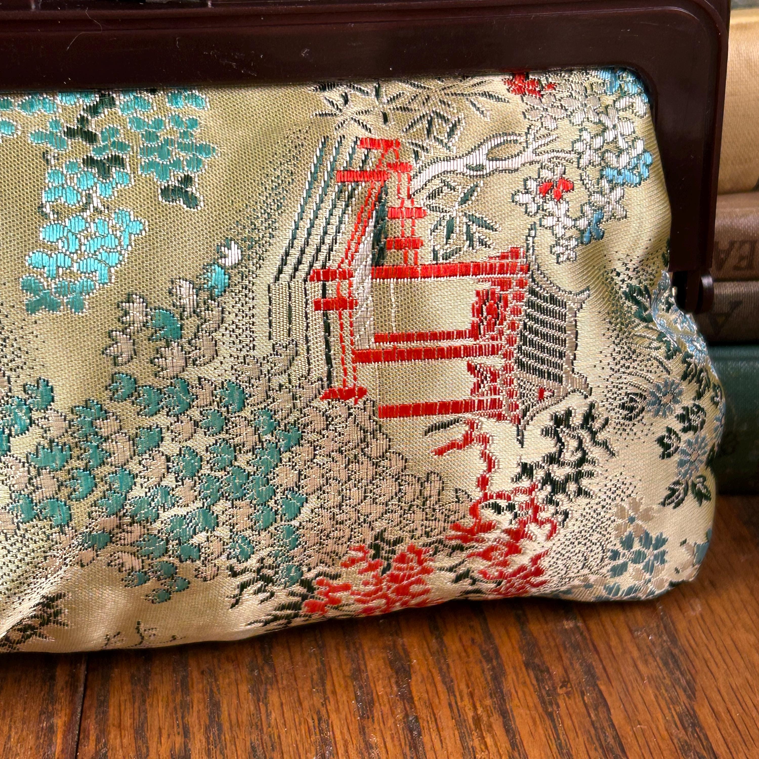his elegant vintage clutch features a richly textured Asian-inspired brocade silk exterior paired with a sleek lucite frame and classic kiss-lock closure. The woven silk fabric showcases intricate patterning with a subtle sheen, giving the bag a timeless, refined look rooted in traditional Eastern design.