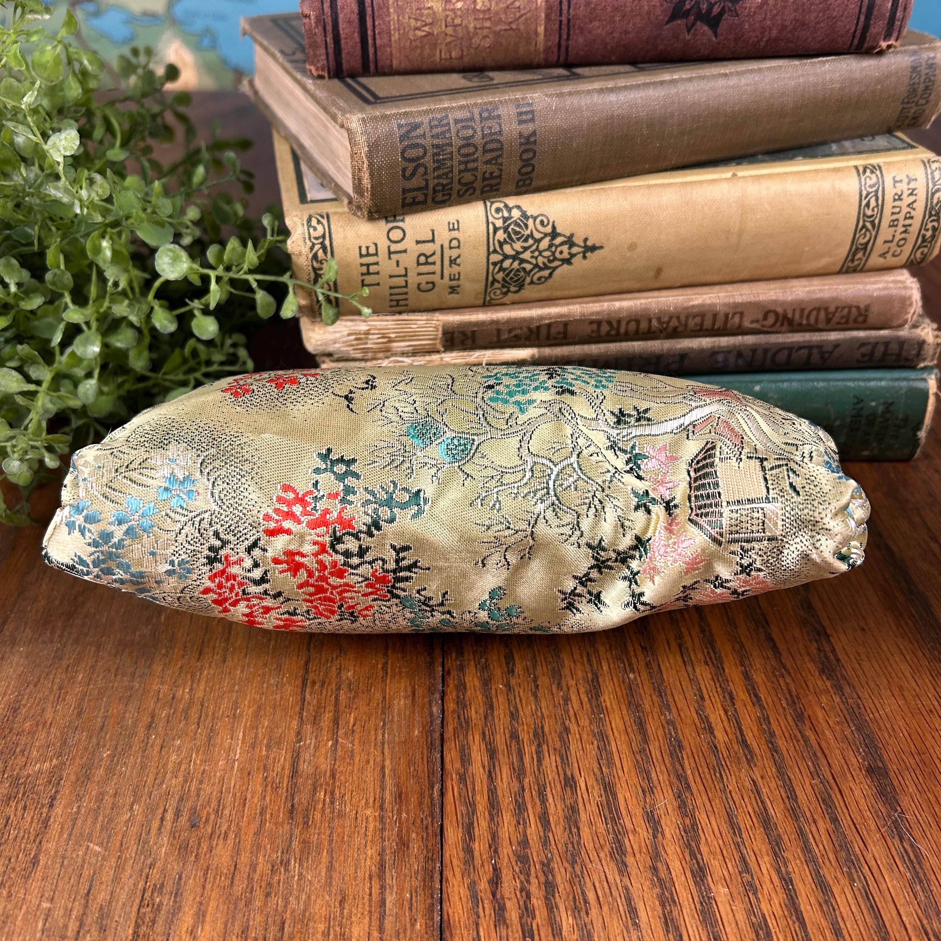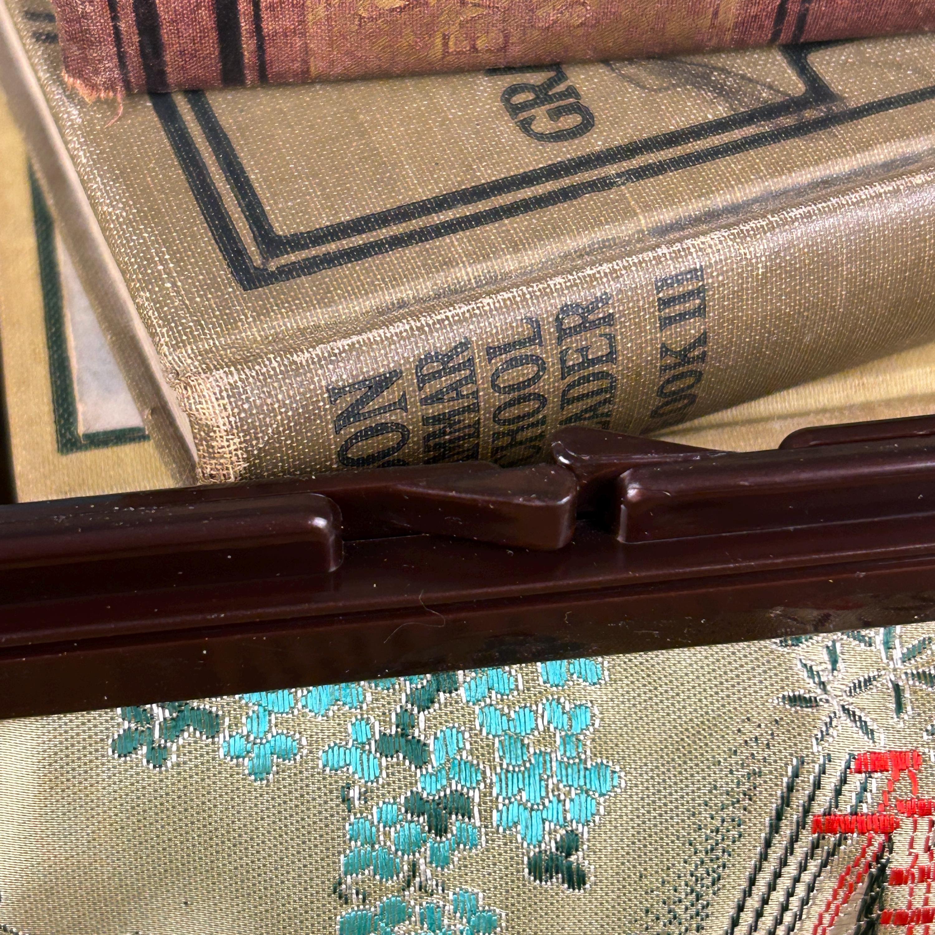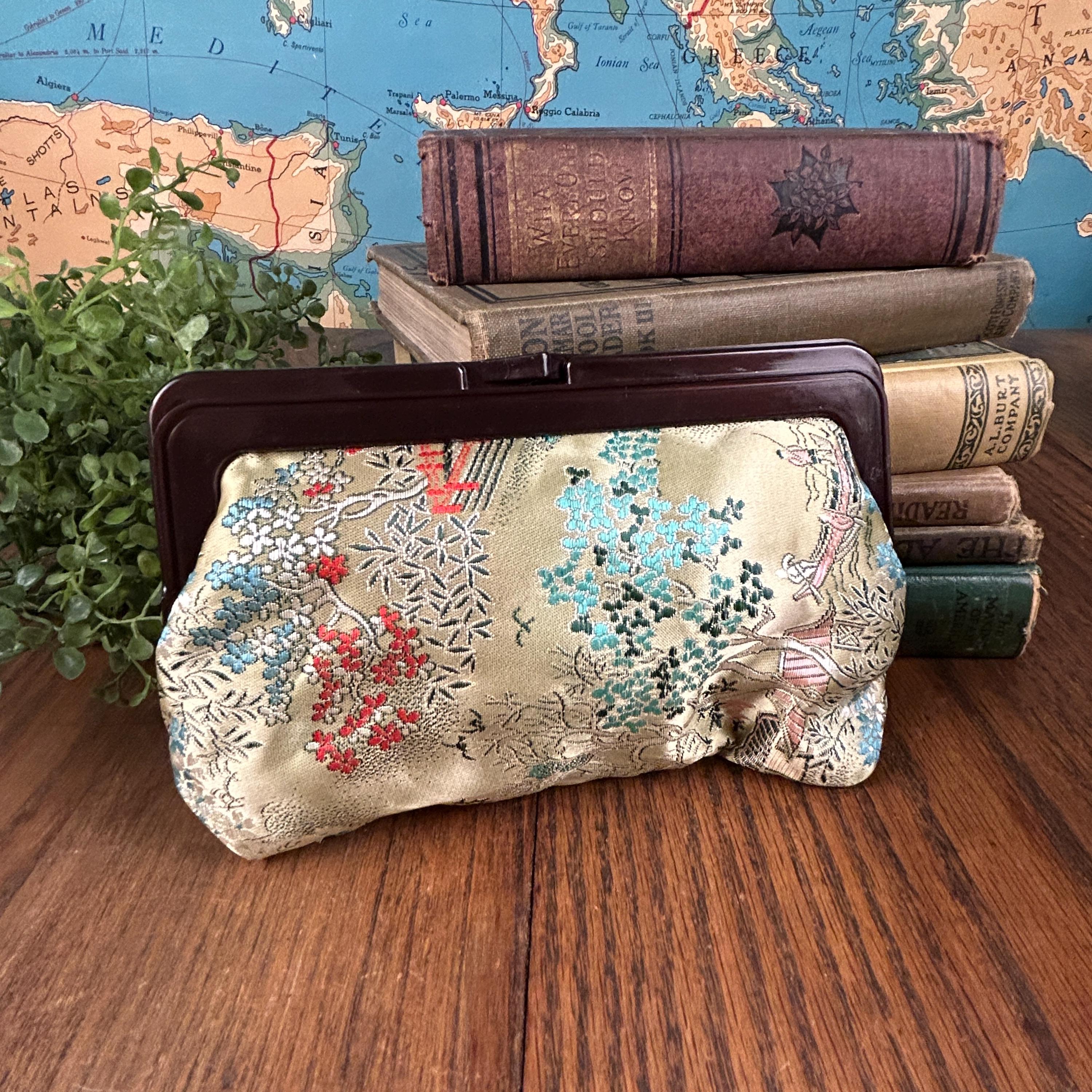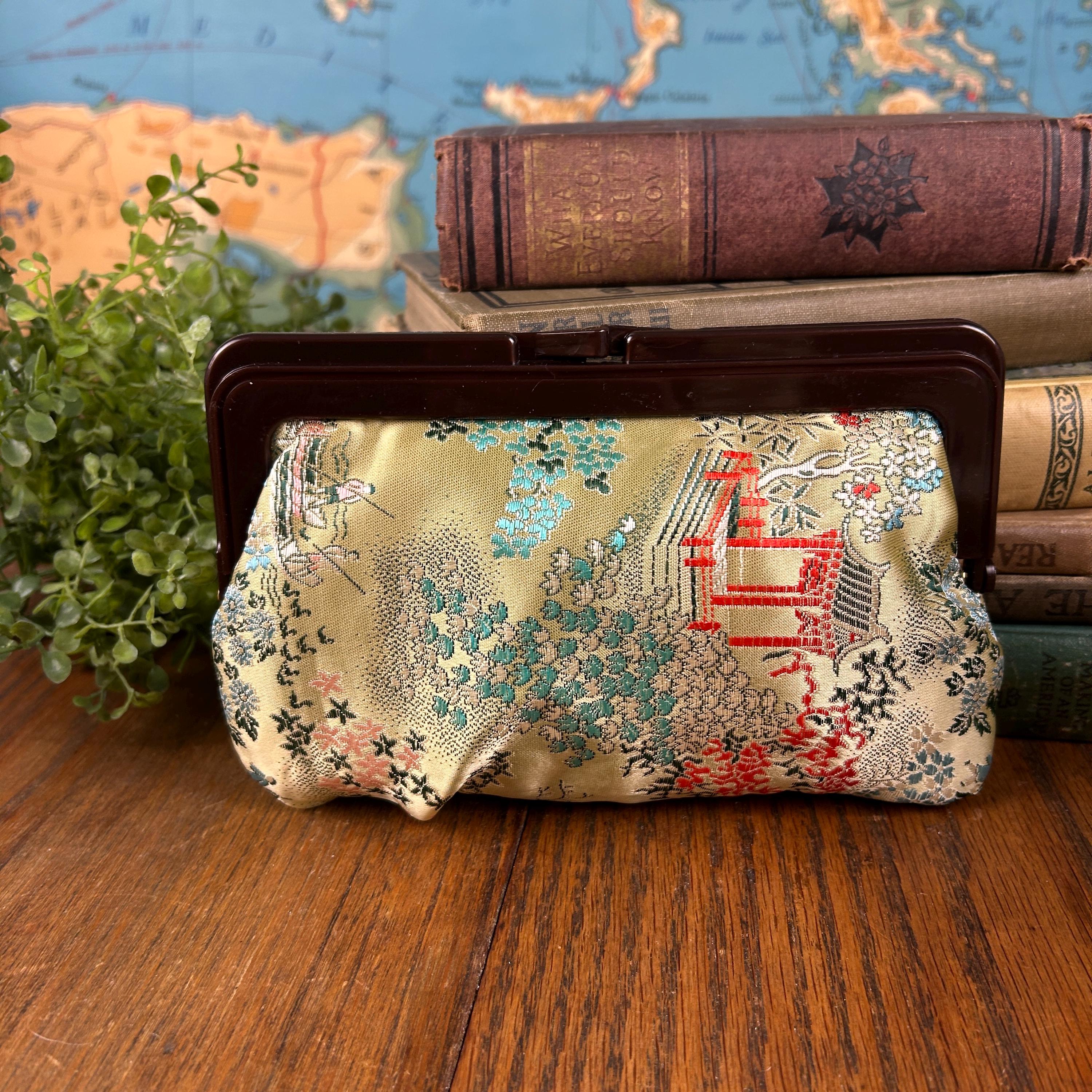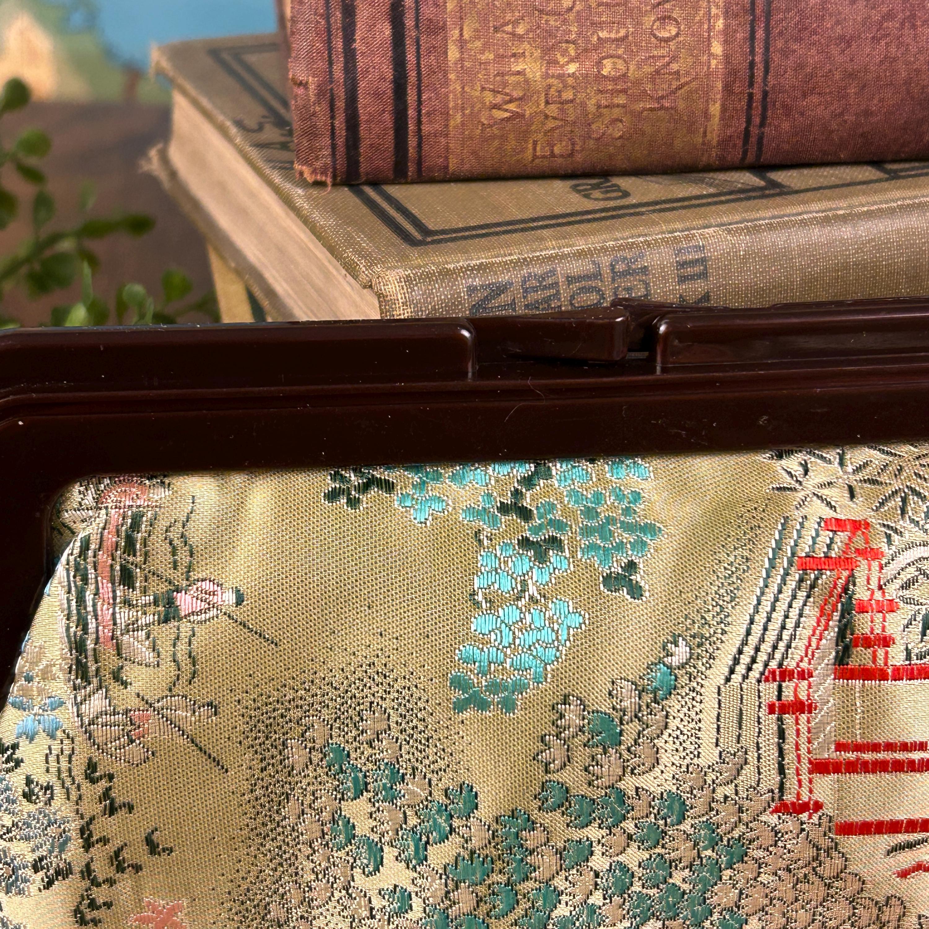 his elegant vintage clutch features a richly textured Asian-inspired brocade silk exterior paired with a sleek lucite frame and classic kiss-lock closure. The woven silk fabric showcases intricate patterning with a subtle sheen, giving the bag a timeless, refined look rooted in traditional Eastern design.