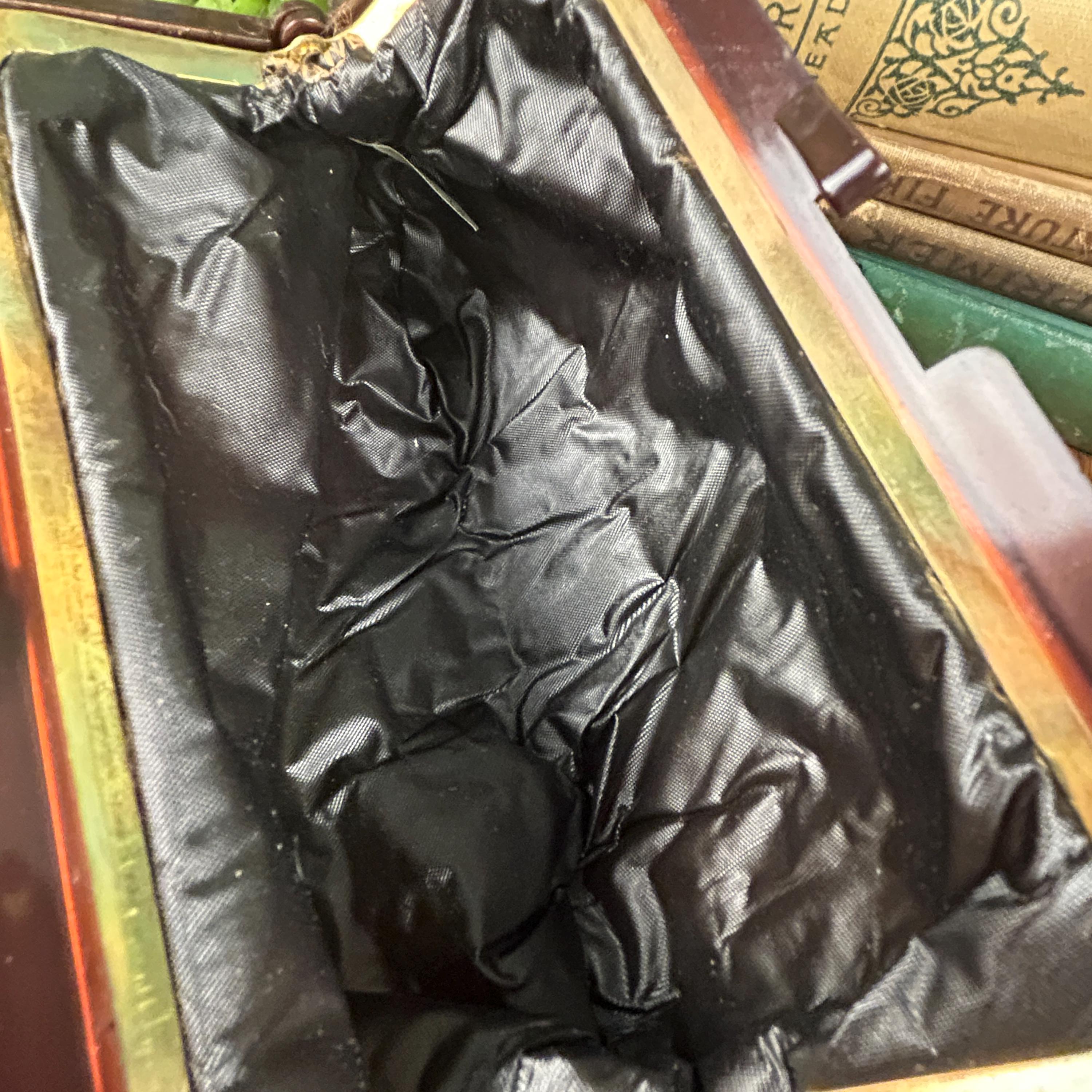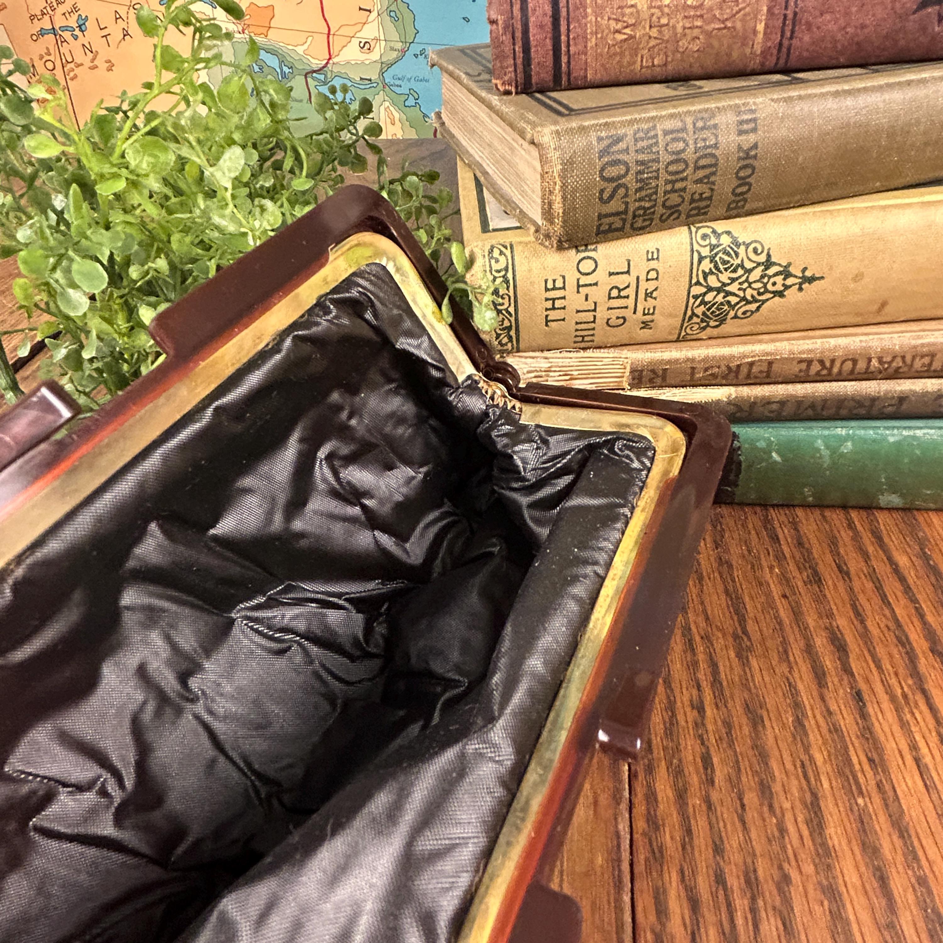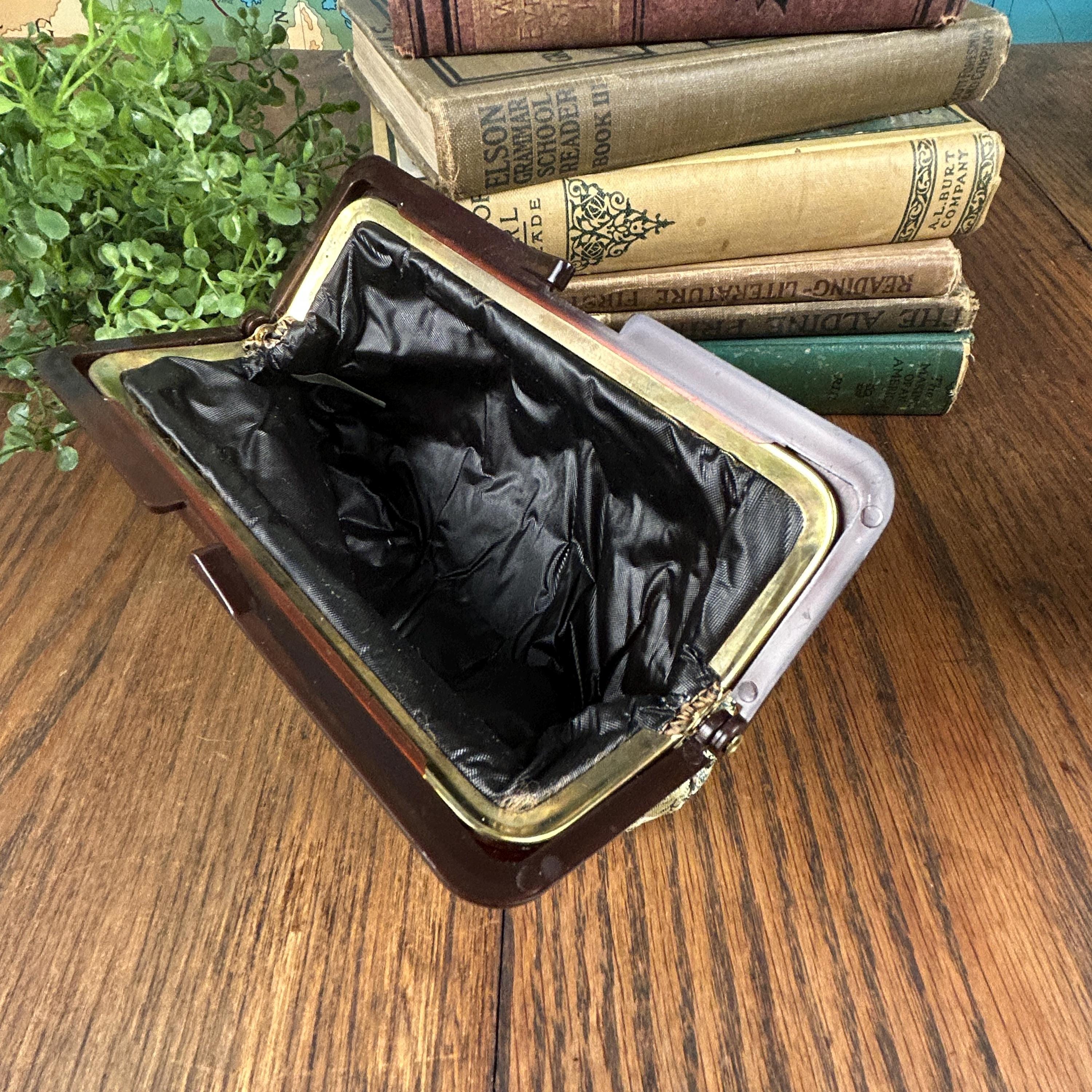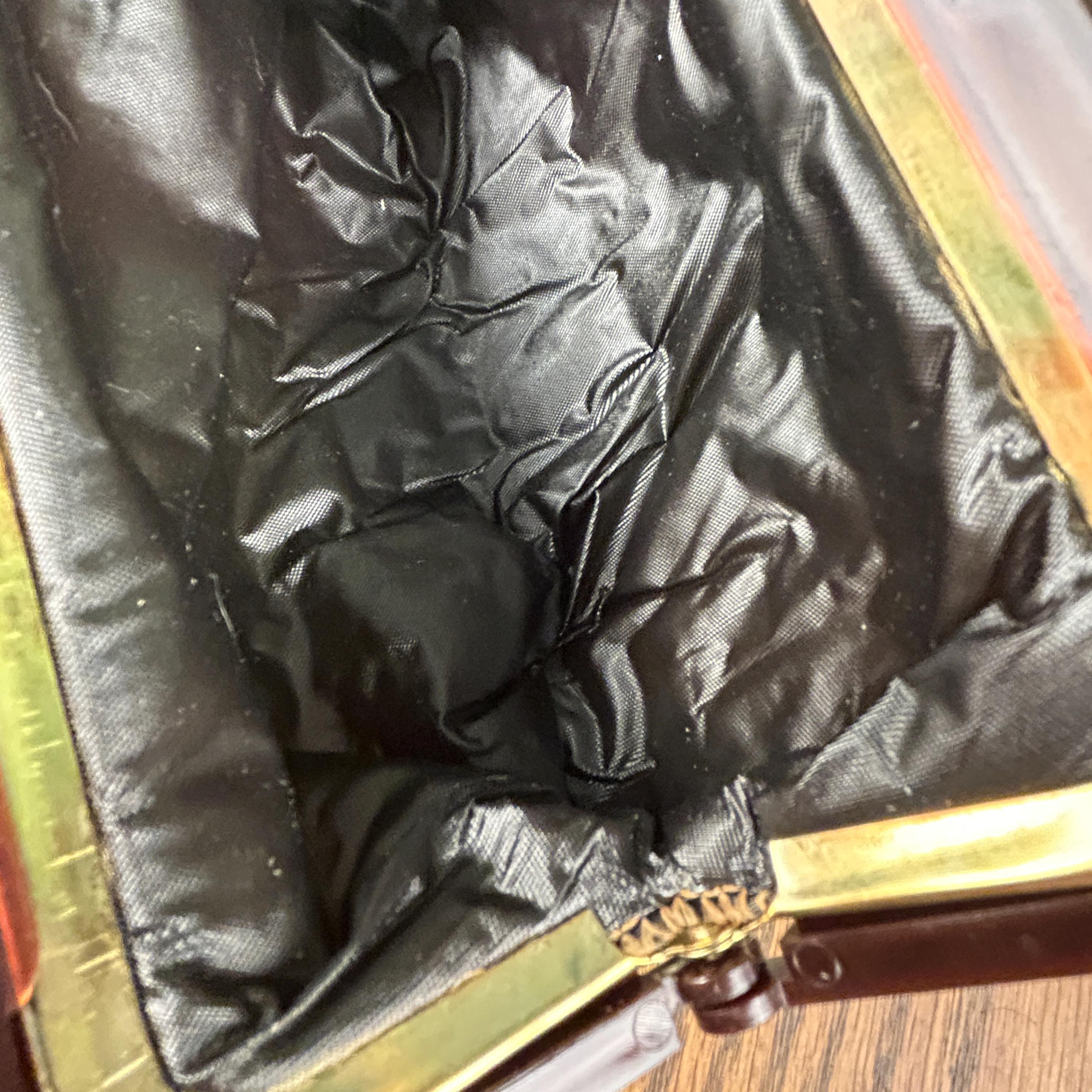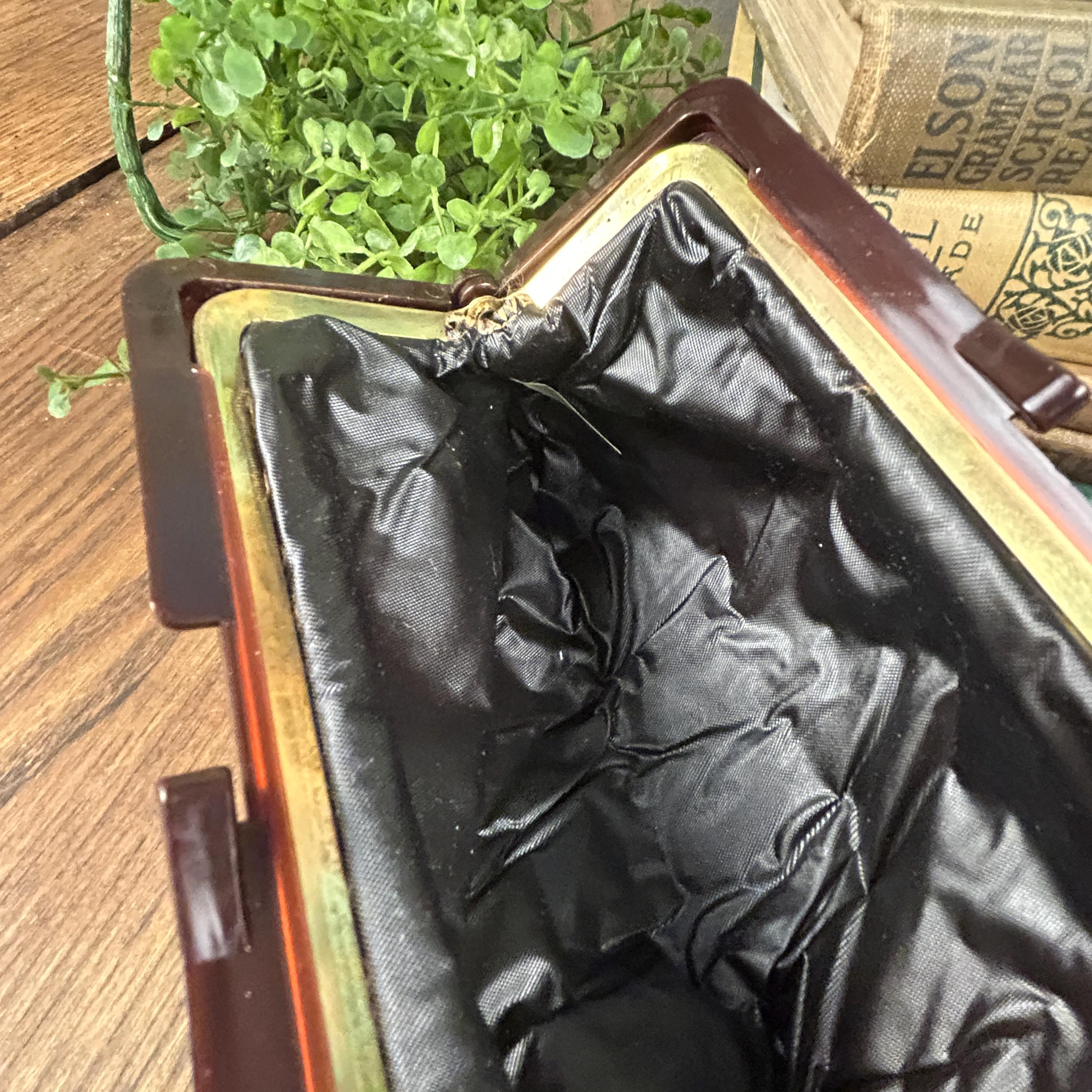 The structured lucite frame adds a mid-century flair while providing durability and a clean silhouette. Compact yet eye-catching, this clutch is perfect for evening wear, special occasions, or as a collectible vintage accessory.