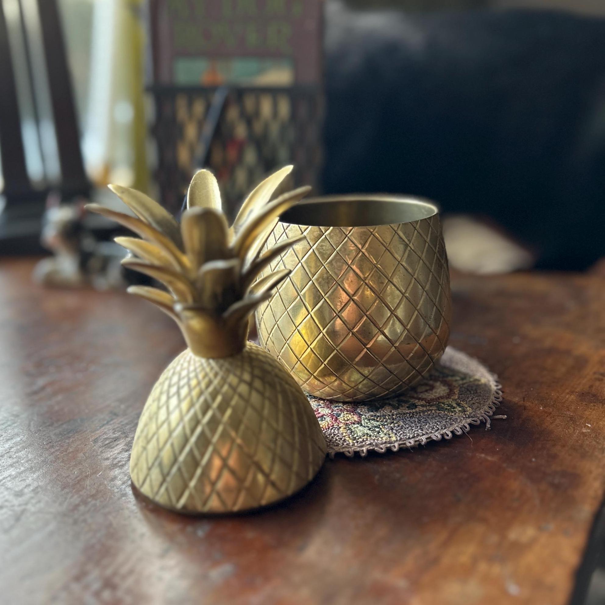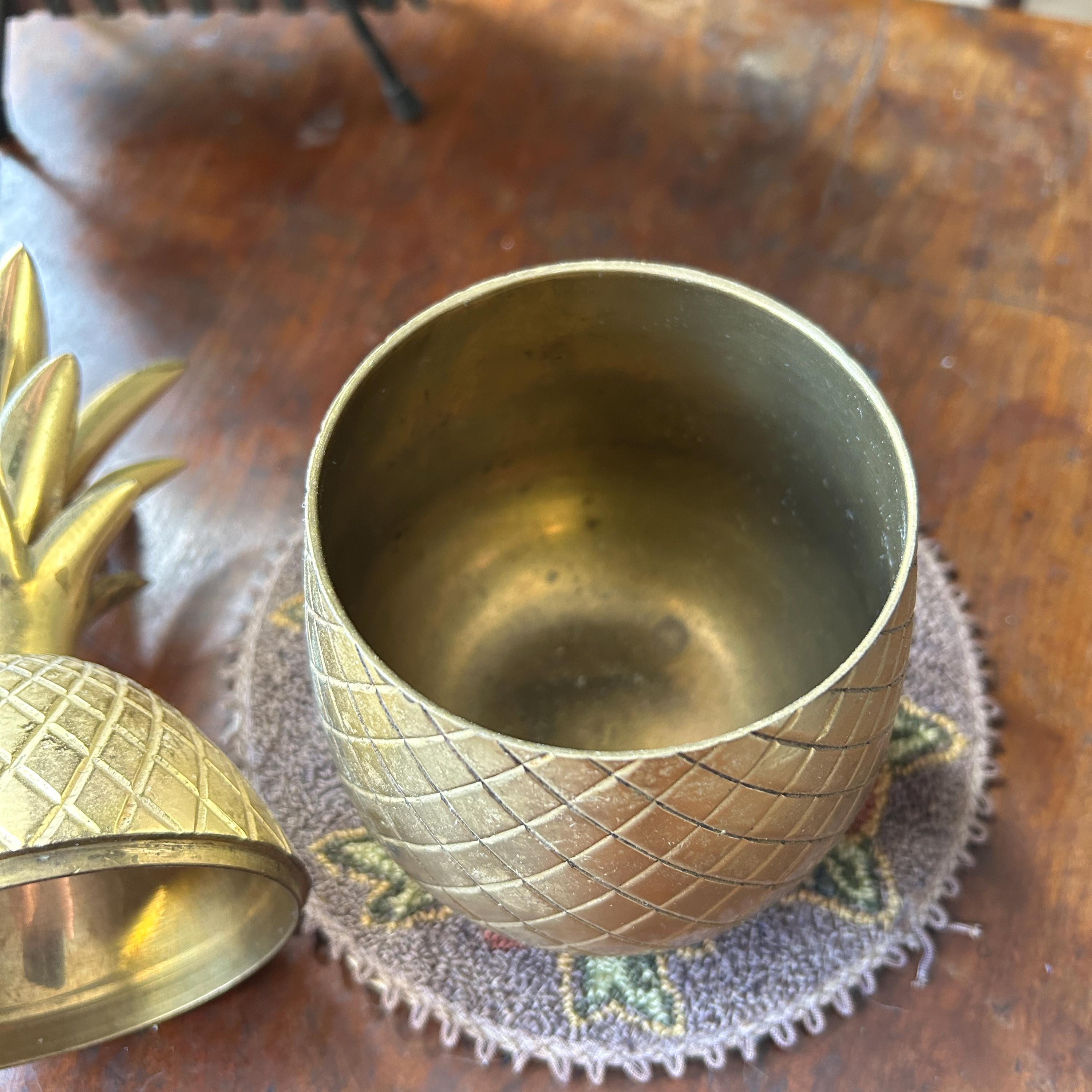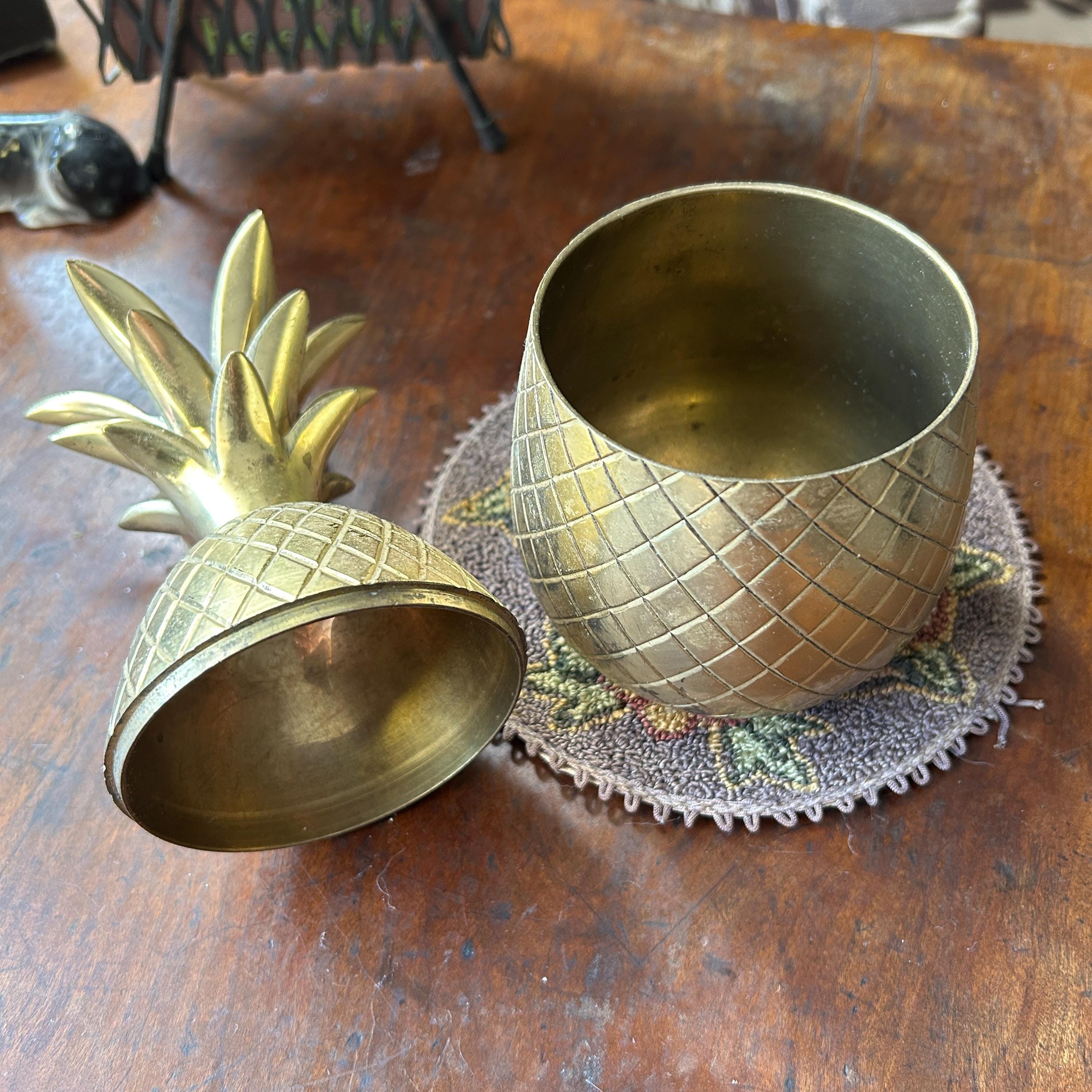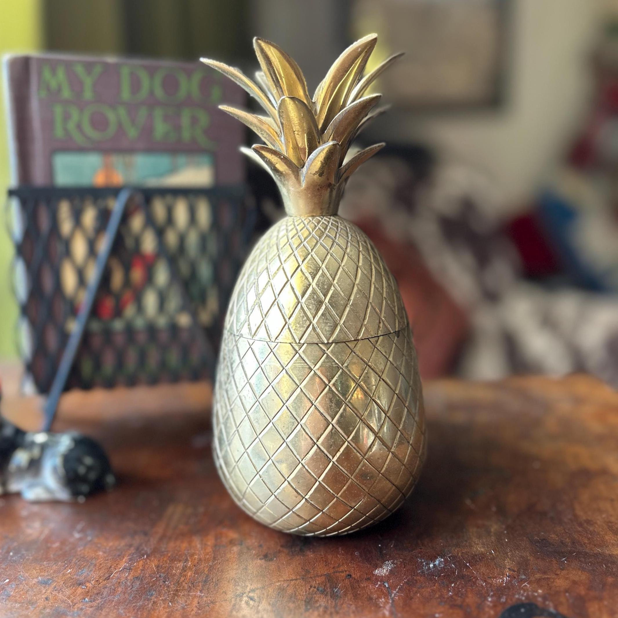 This vintage heavy brass pineapple container is a charming and symbolic decorative accent, traditionally representing hospitality and warmth. Crafted from solid brass with a richly detailed, textured surface, this piece has a substantial weight and quality feel.