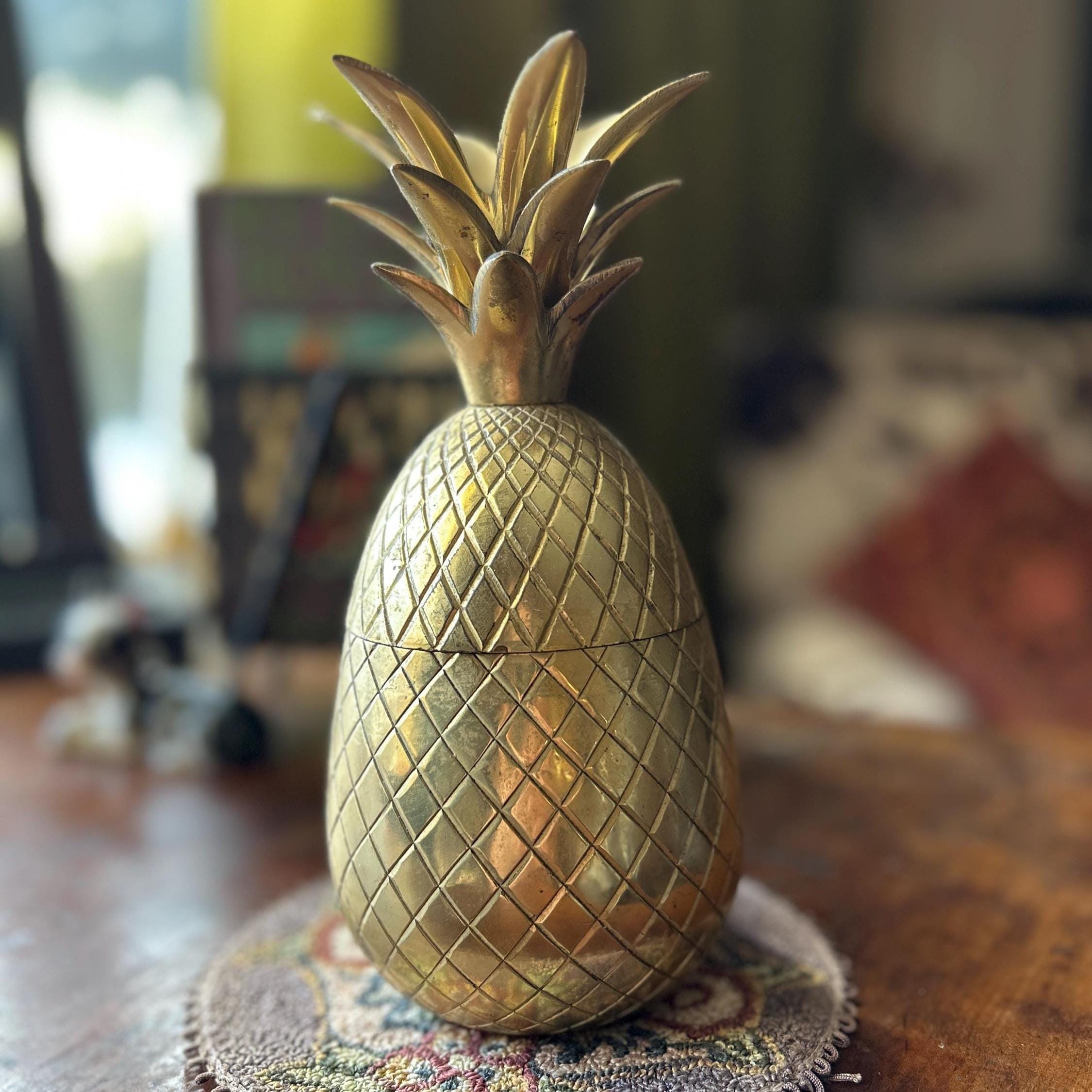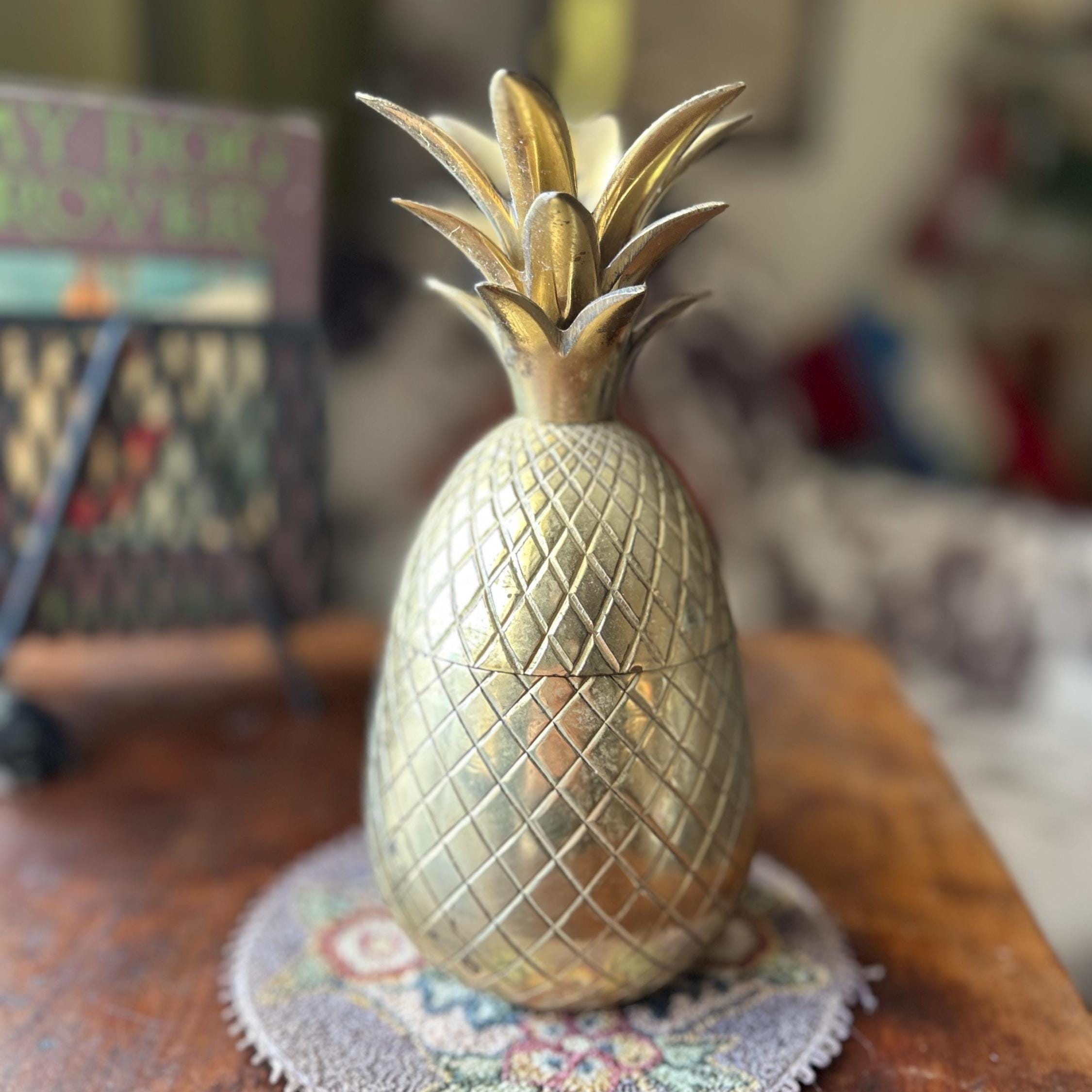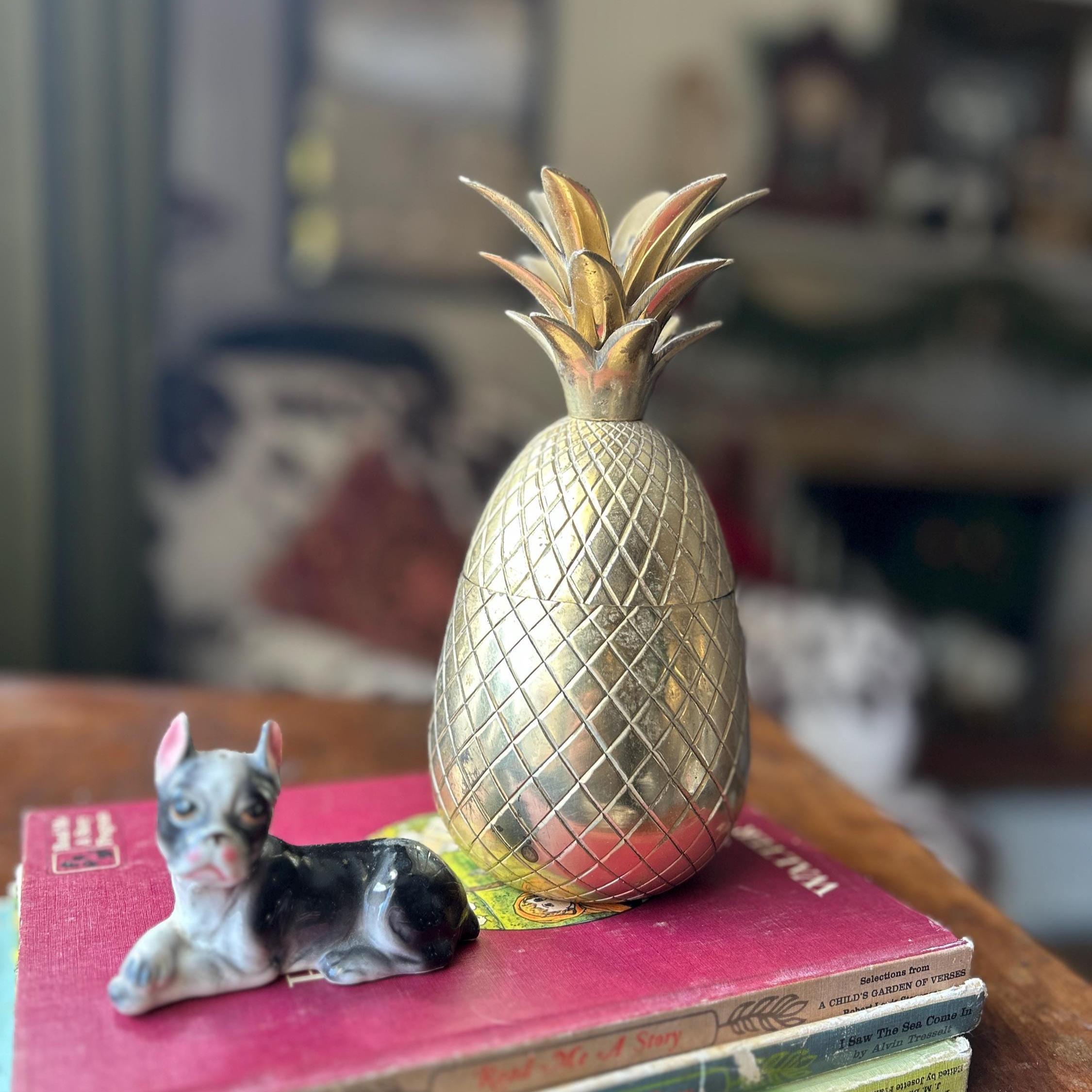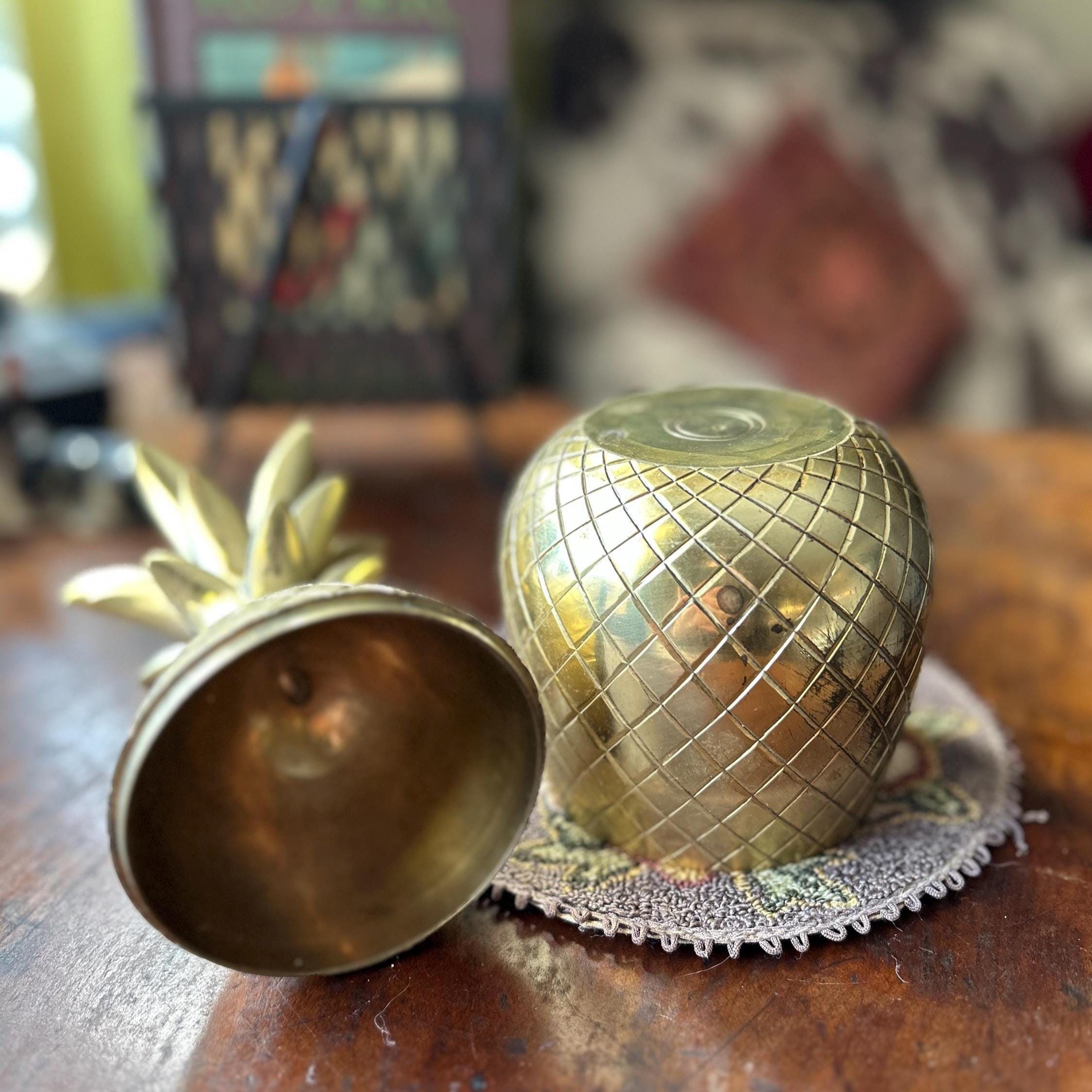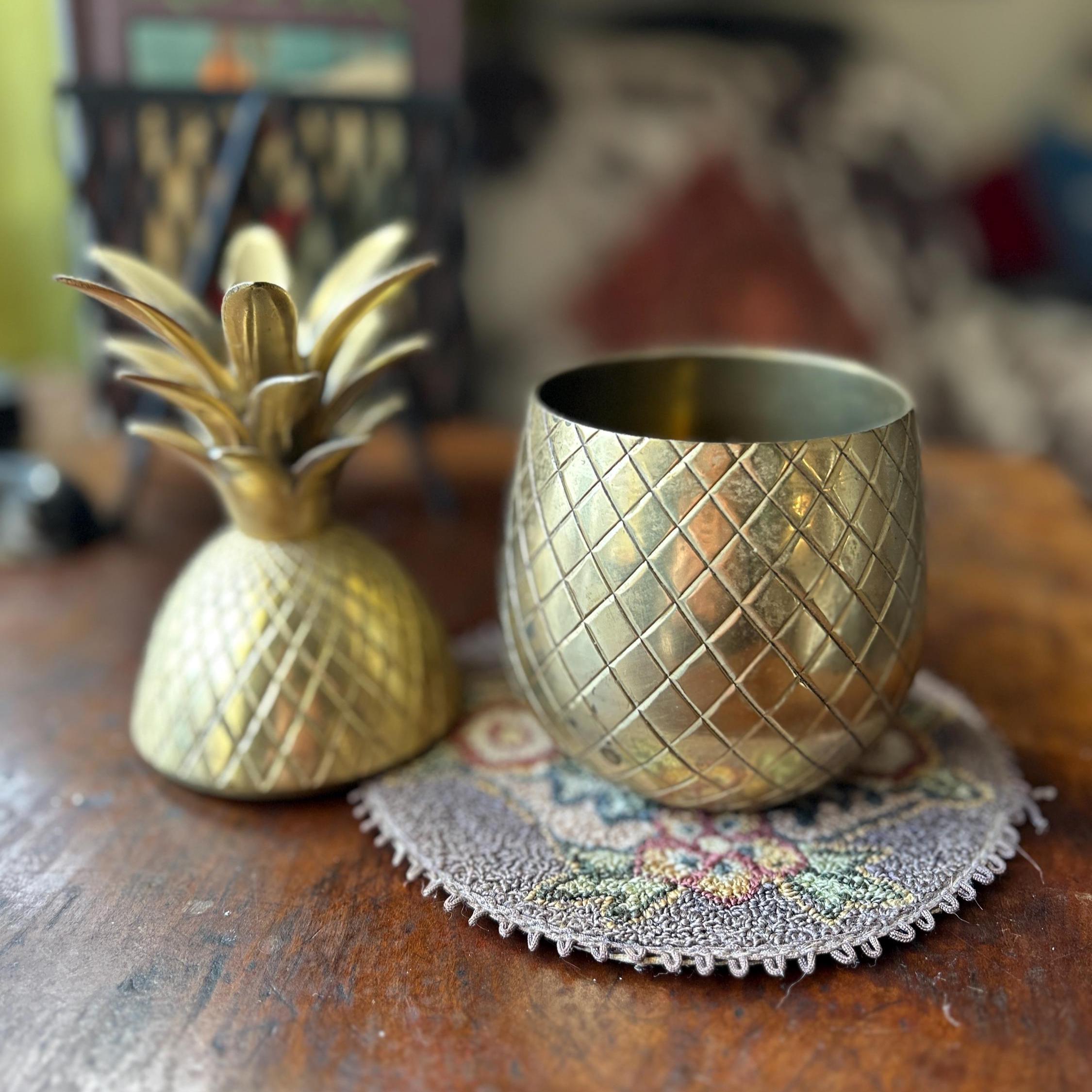 This vintage heavy brass pineapple container is a charming and symbolic decorative accent, traditionally representing hospitality and warmth. Crafted from solid brass with a richly detailed, textured surface, this piece has a substantial weight and quality feel.