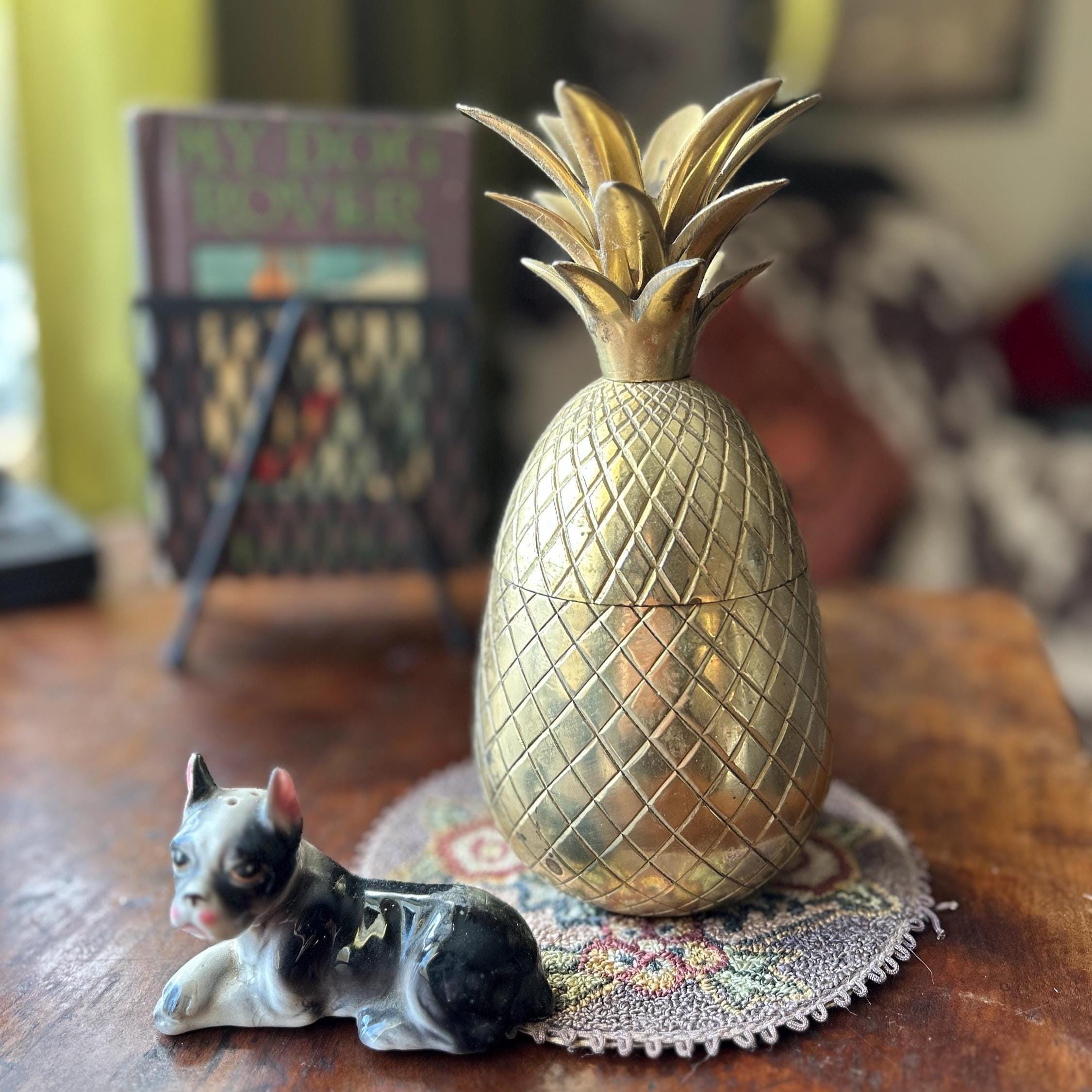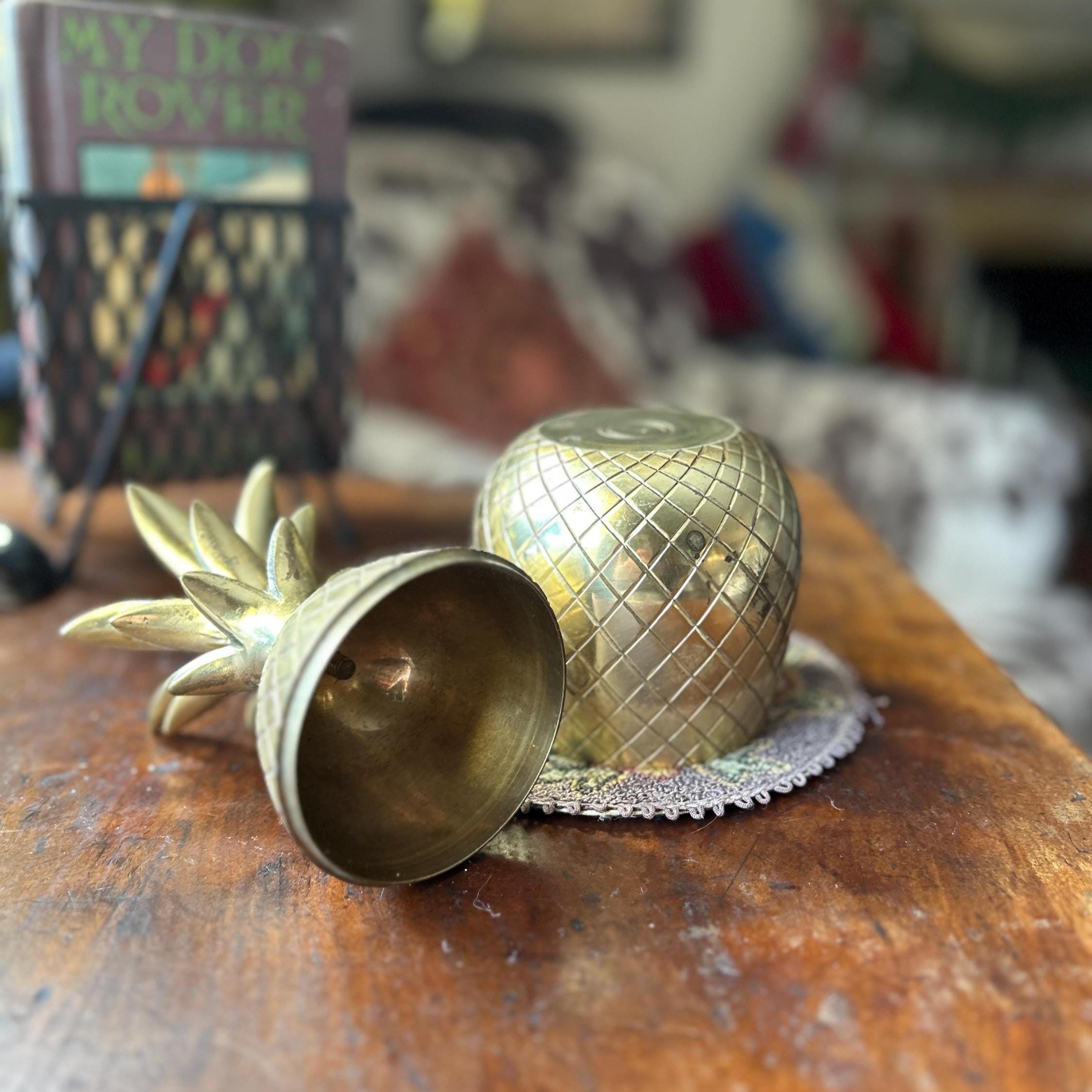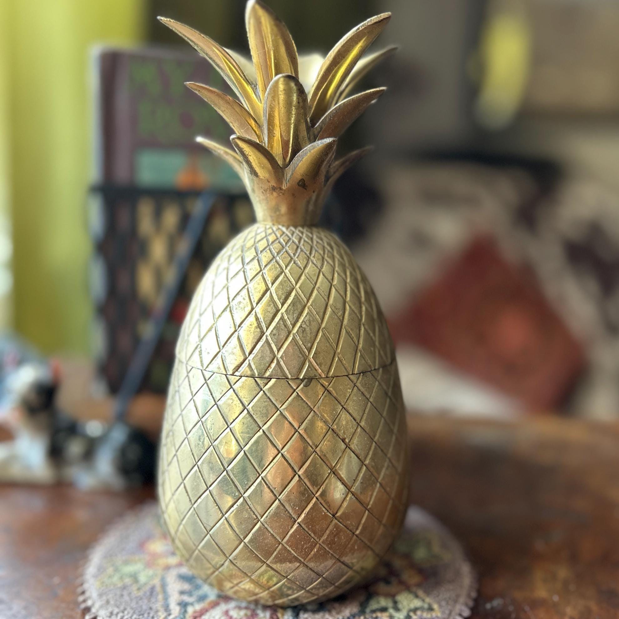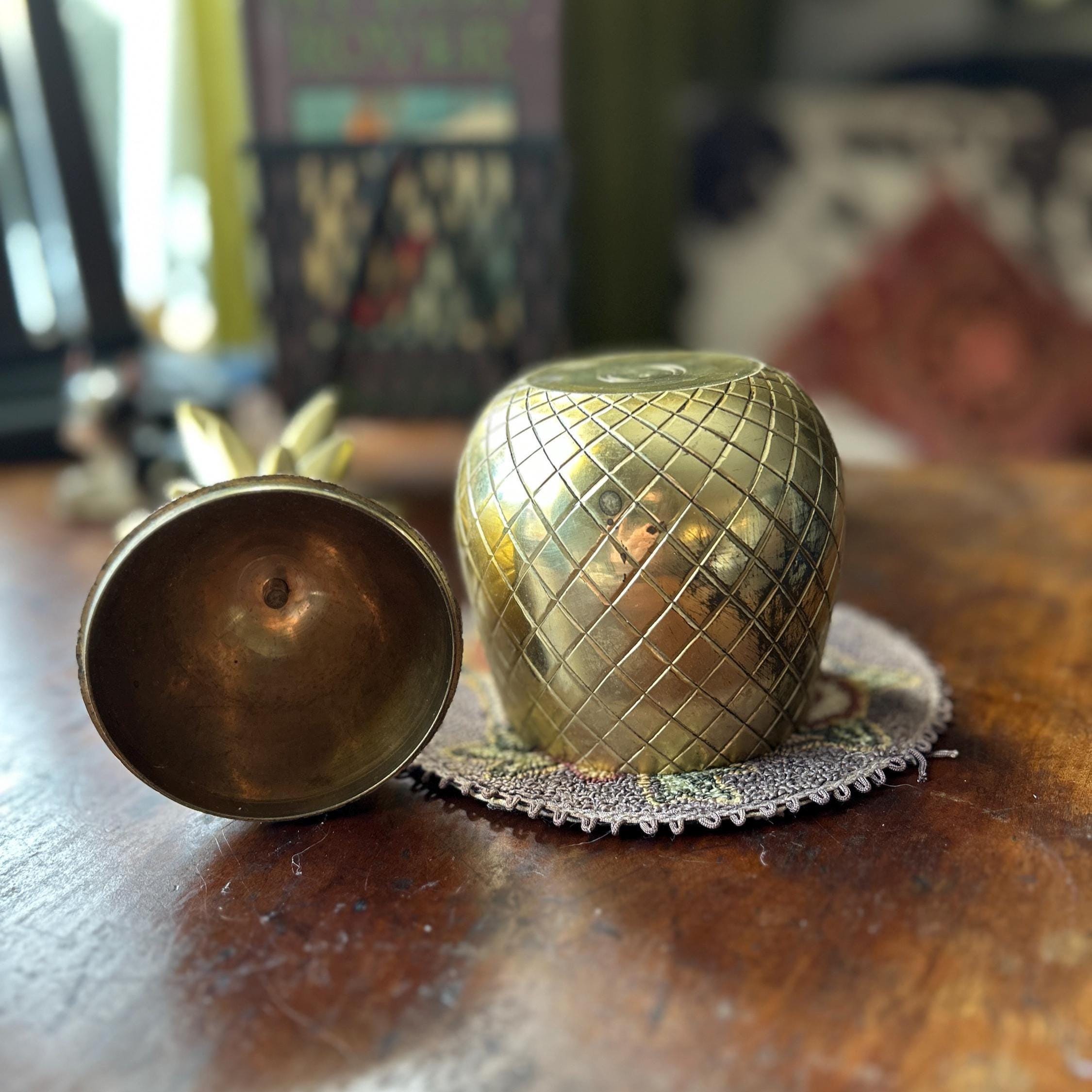 This vintage heavy brass pineapple container is a charming and symbolic decorative accent, traditionally representing hospitality and warmth. Crafted from solid brass with a richly detailed, textured surface, this piece has a substantial weight and quality feel.
