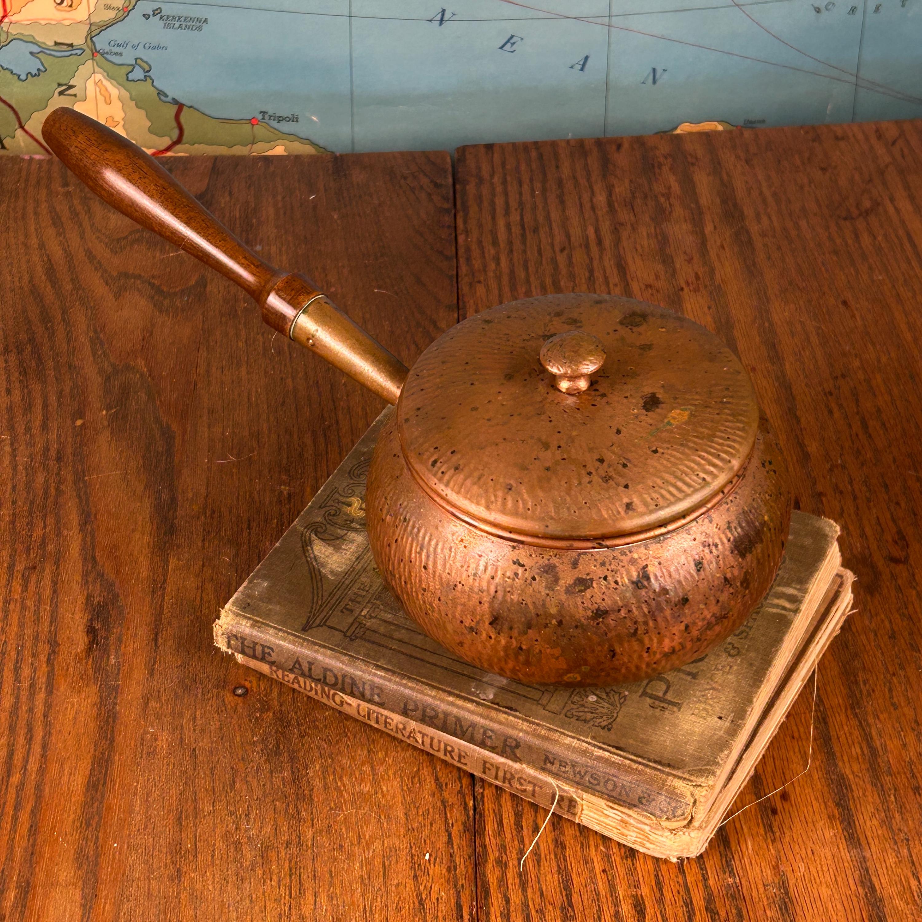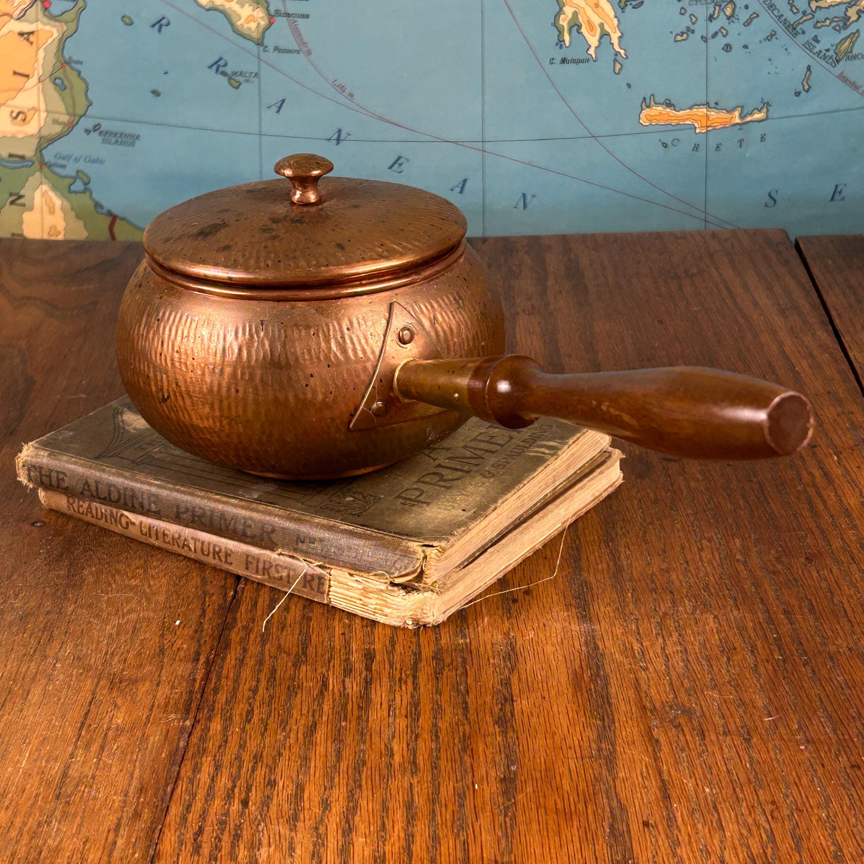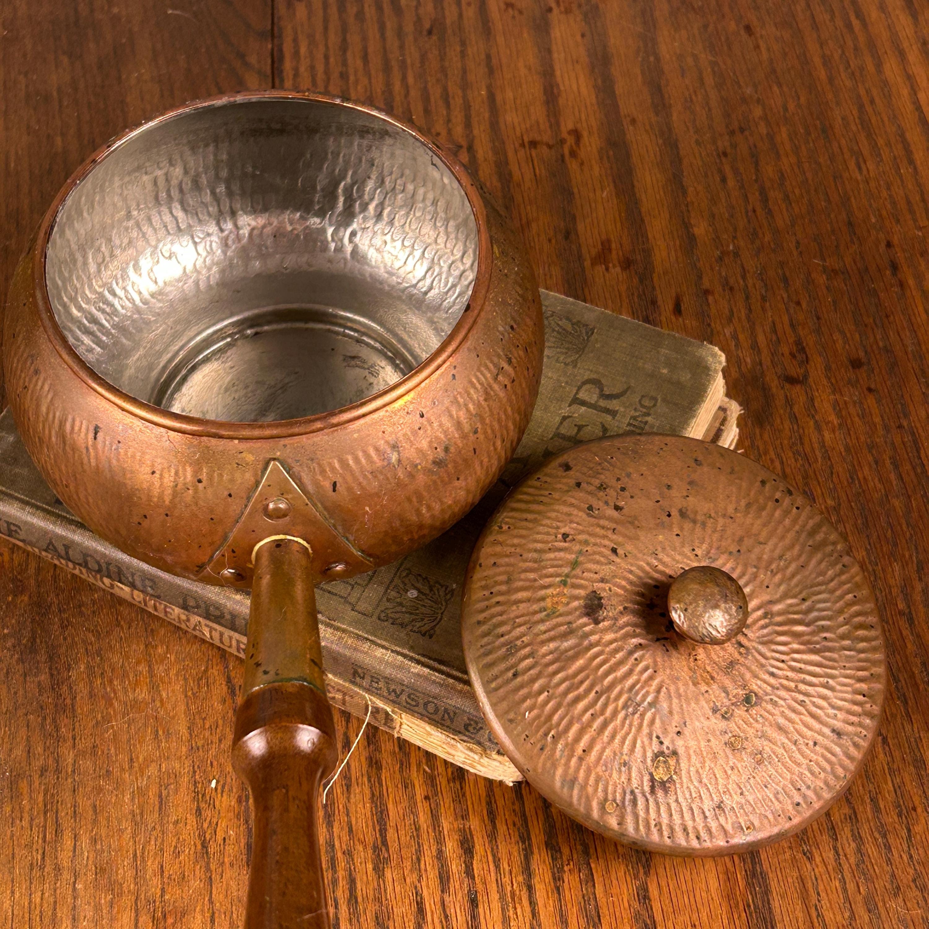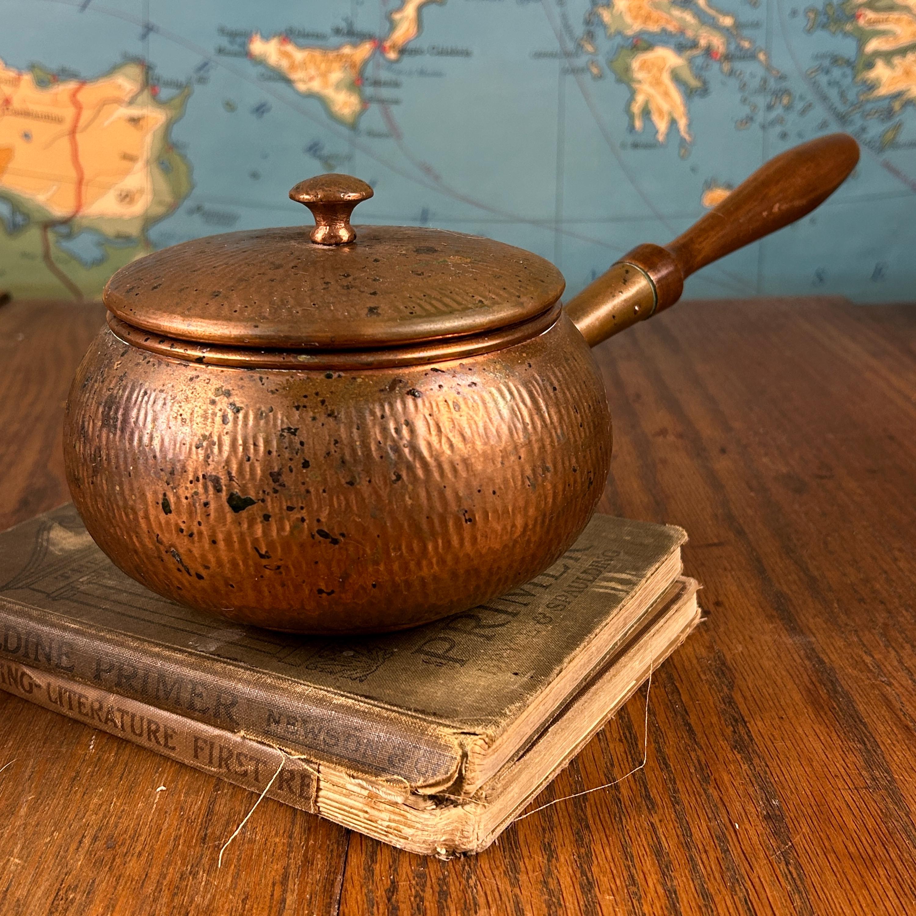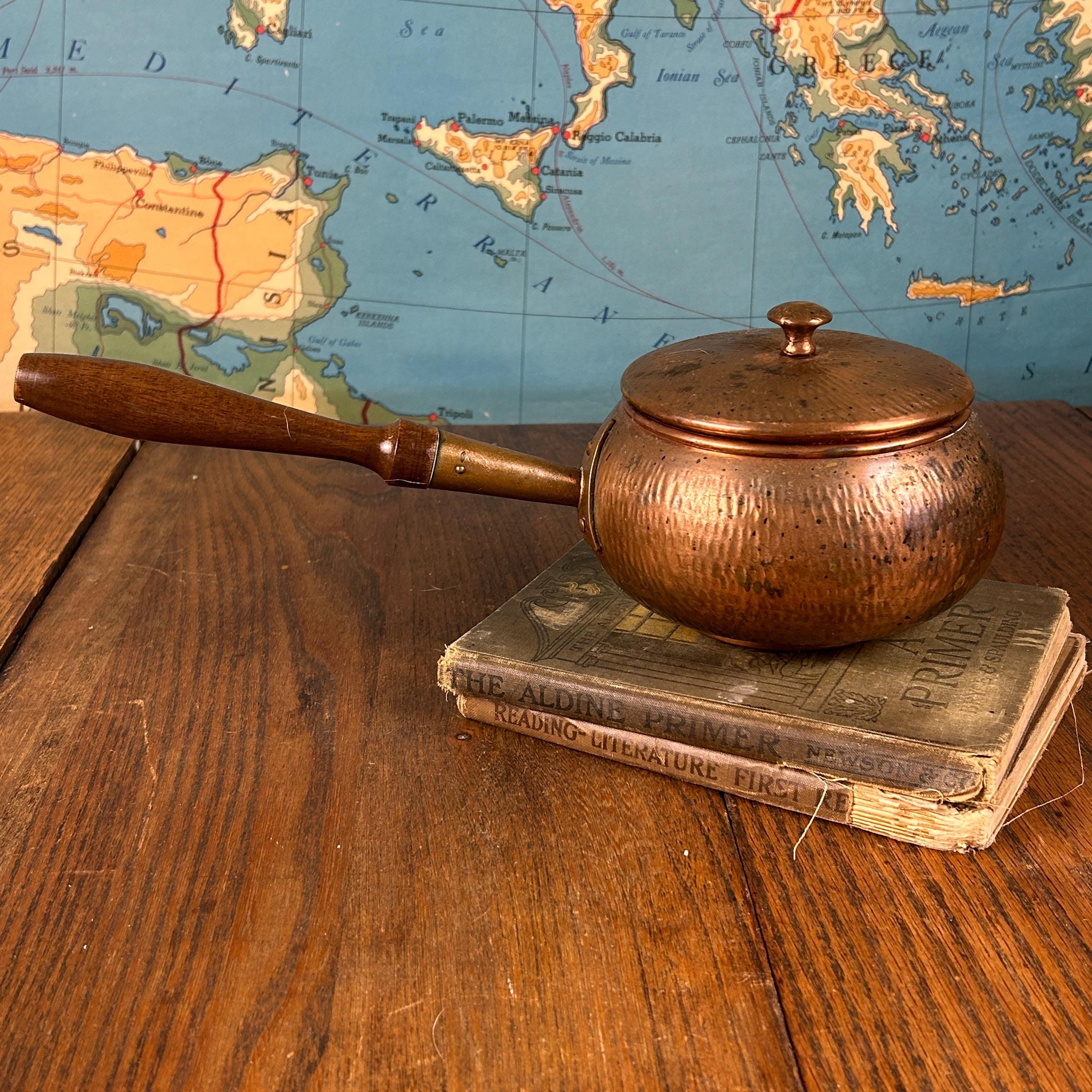 Add a warm, rustic touch to your kitchen with this vintage hammered copper fondue pot featuring a wooden handle and matching lid. The pot has a beautiful hand-hammered finish that gives it rich texture and classic mid-century style. Often marketed as a Swiss fondue pot or small copper saucepan, it is perfect for melting cheese or chocolate, warming sauces, or displaying as vintage décor.