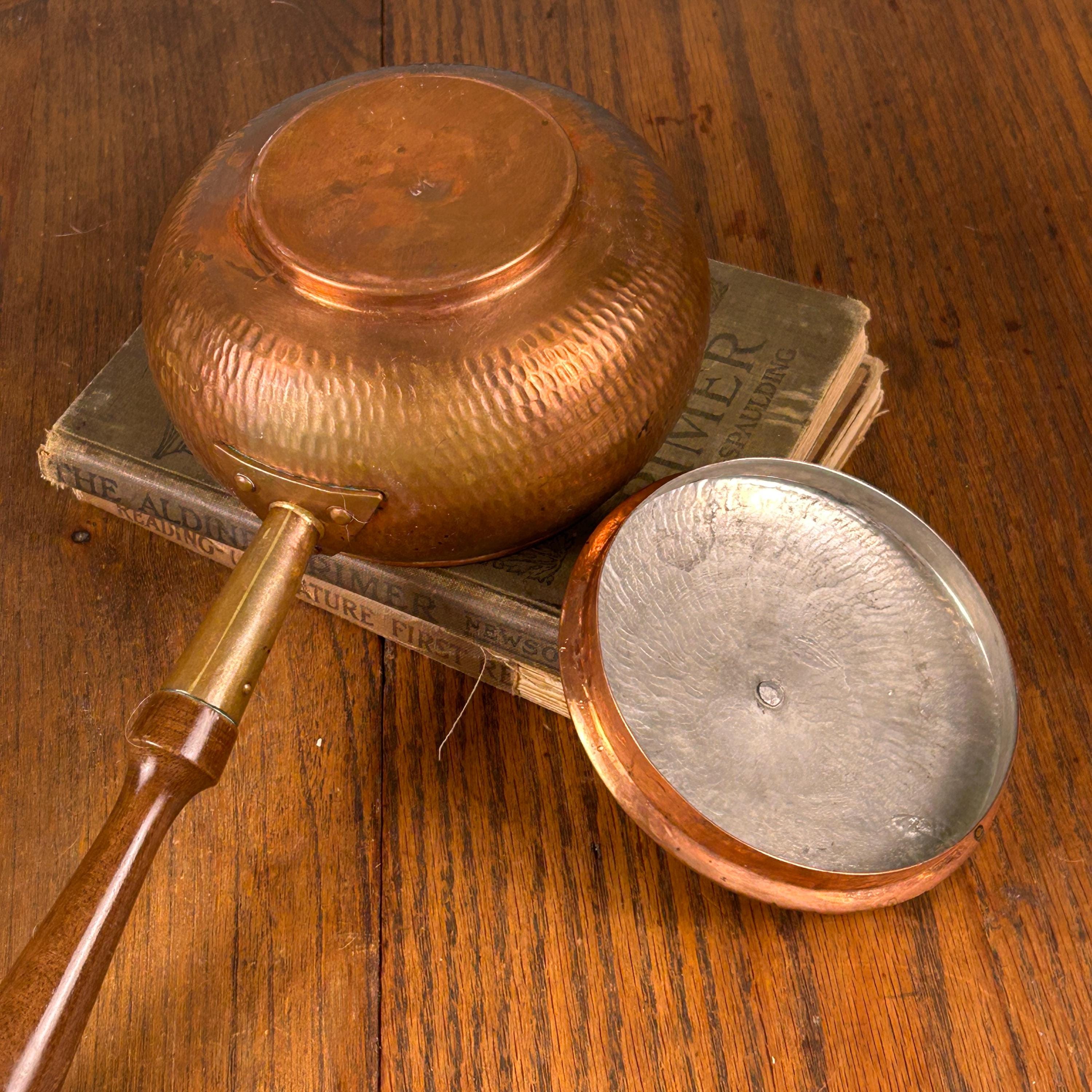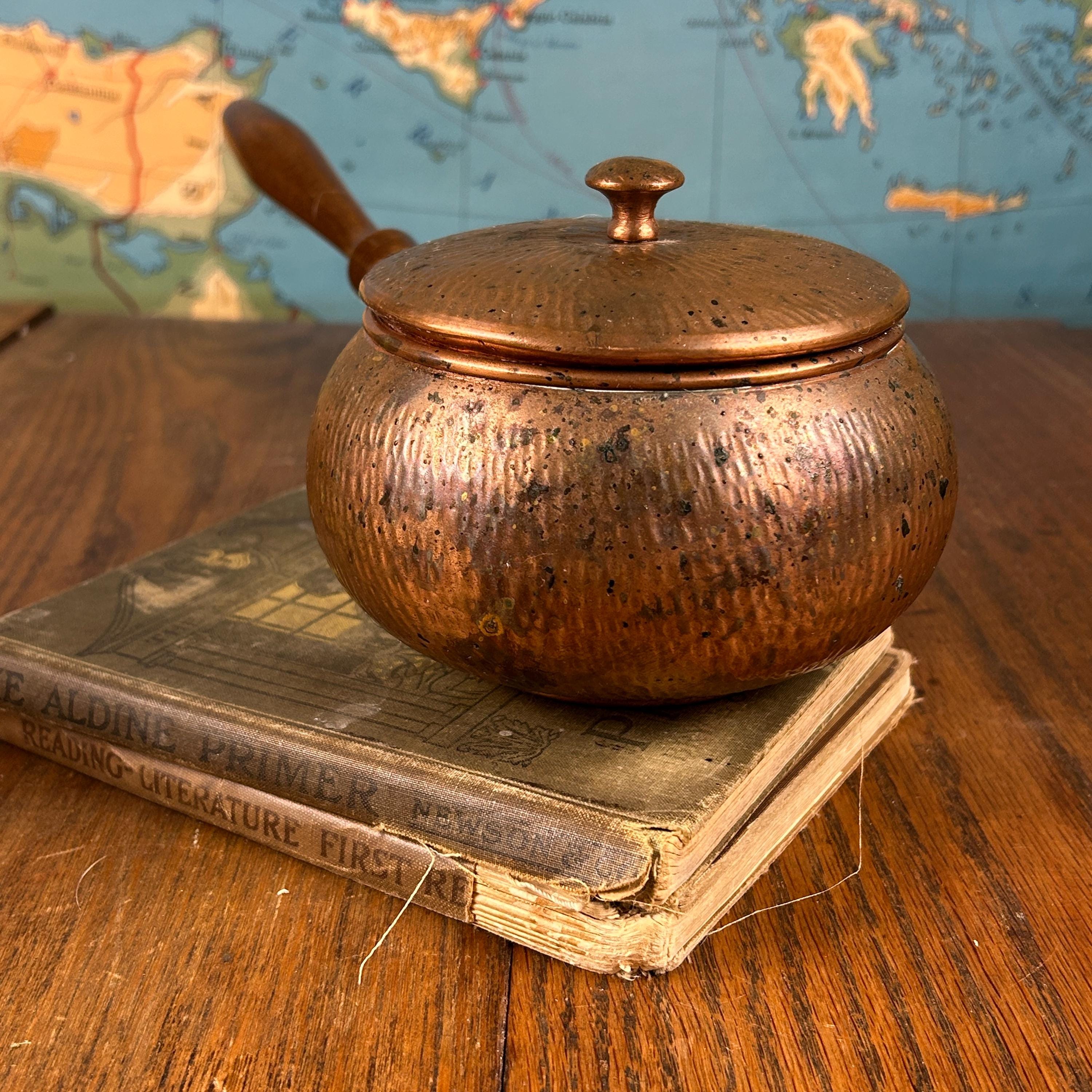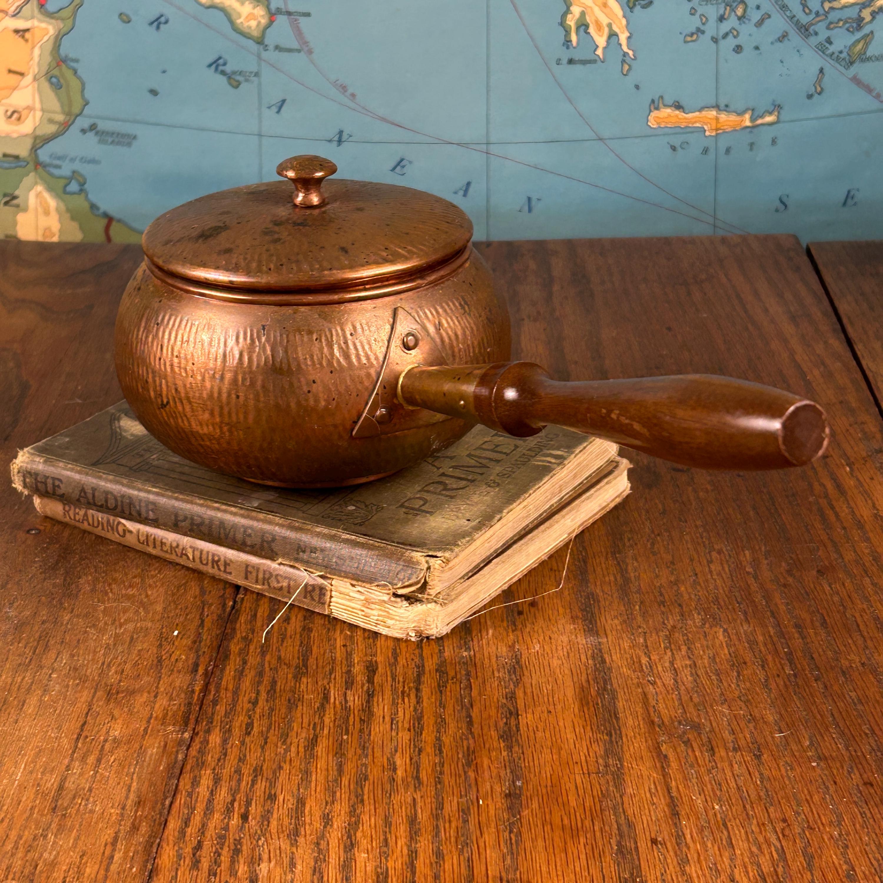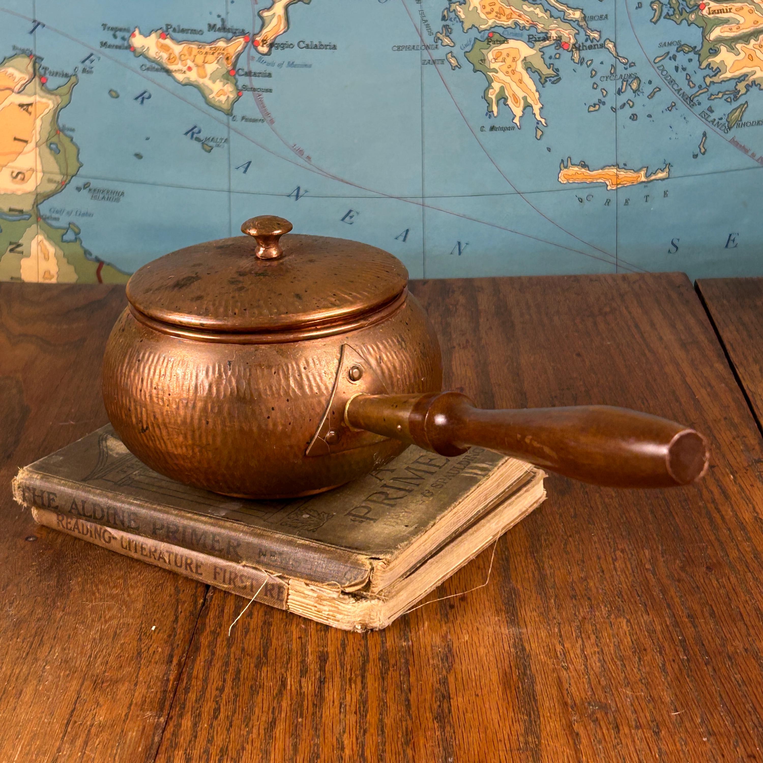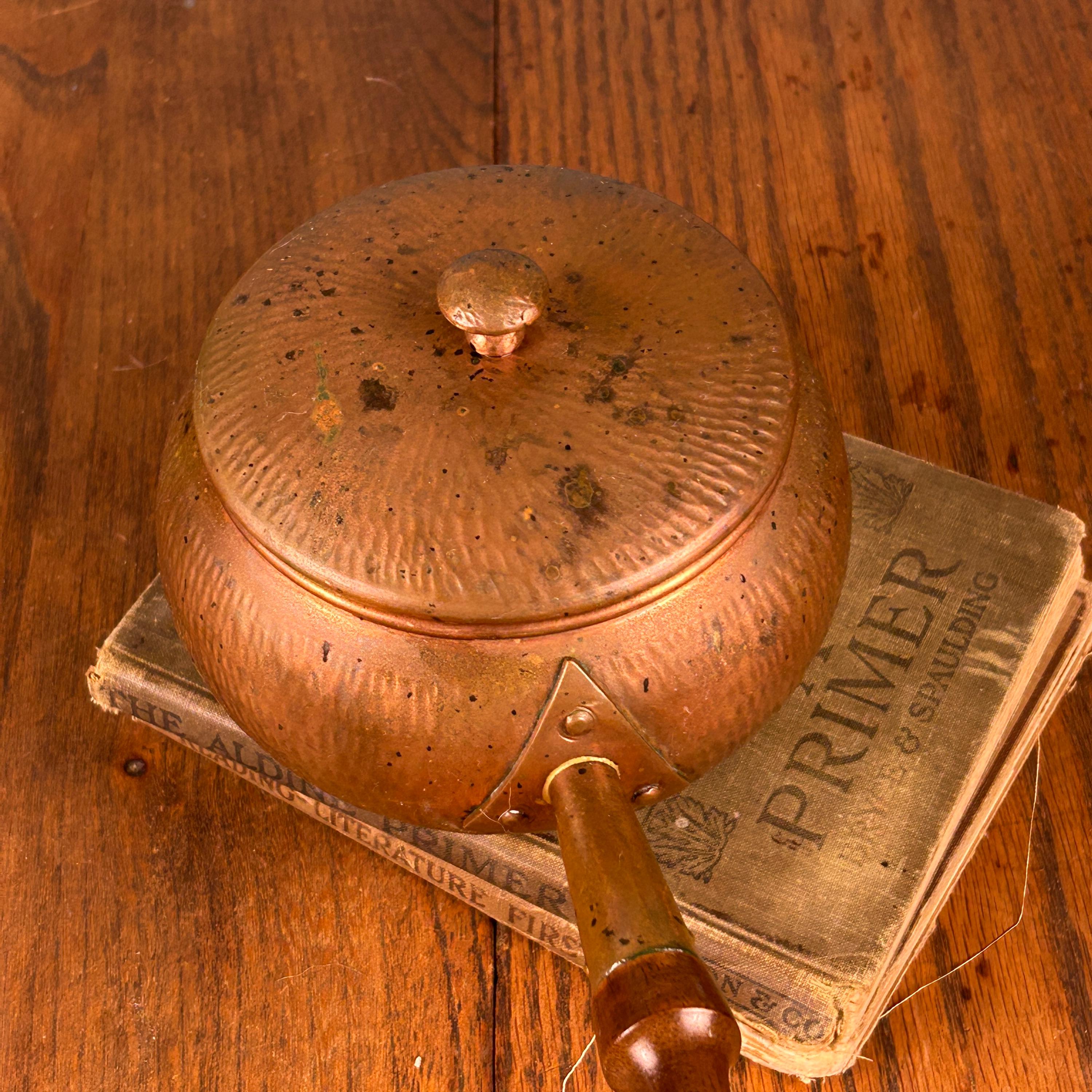 Add a warm, rustic touch to your kitchen with this vintage hammered copper fondue pot featuring a wooden handle and matching lid. The pot has a beautiful hand-hammered finish that gives it rich texture and classic mid-century style. Often marketed as a Swiss fondue pot or small copper saucepan, it is perfect for melting cheese or chocolate, warming sauces, or displaying as vintage décor.