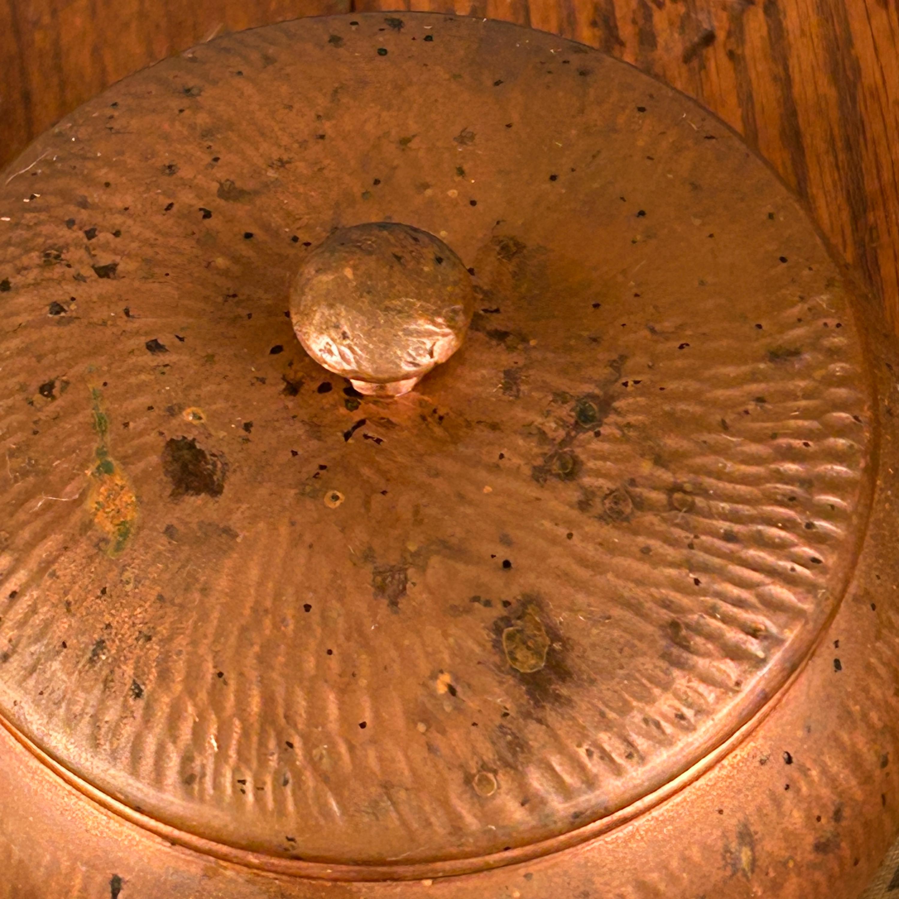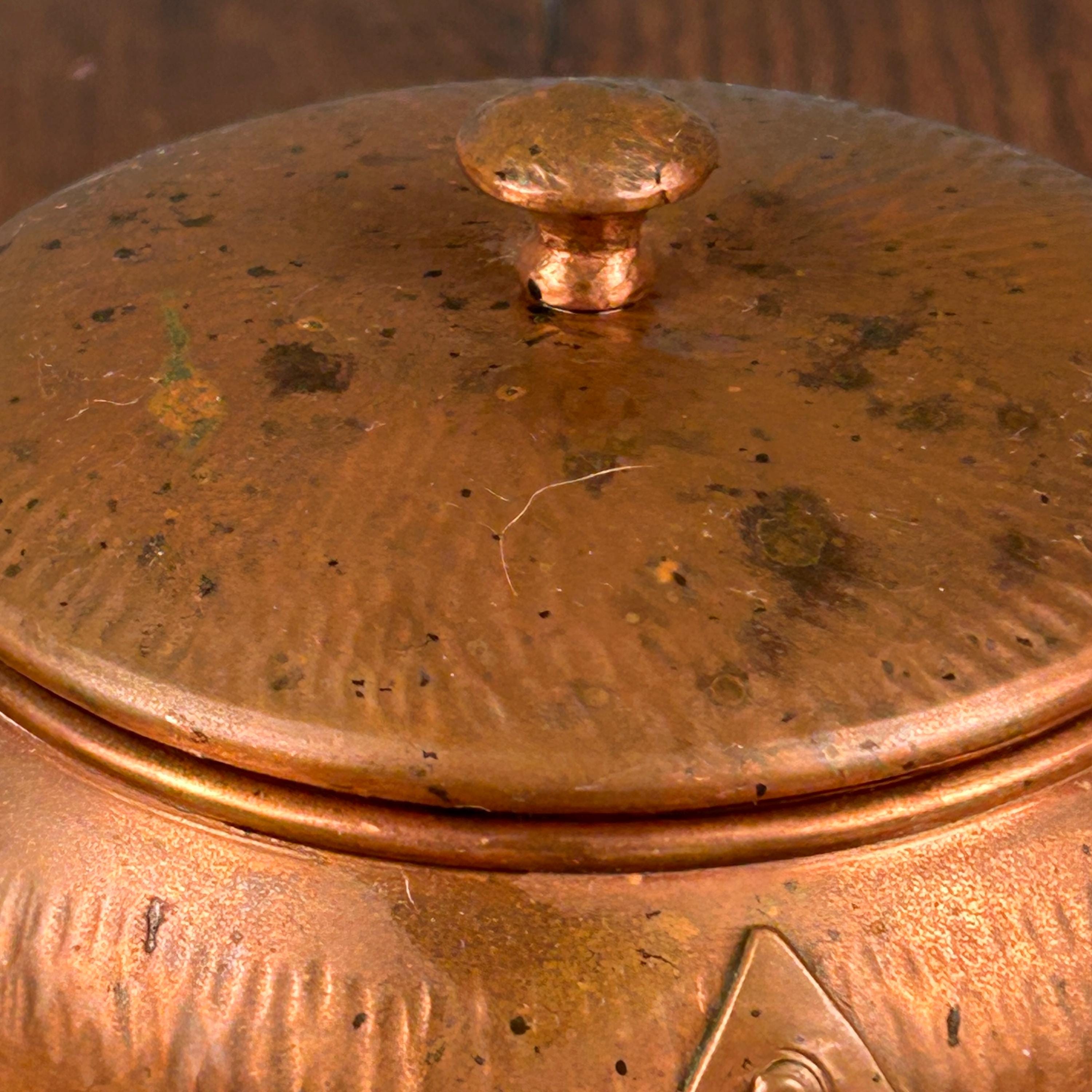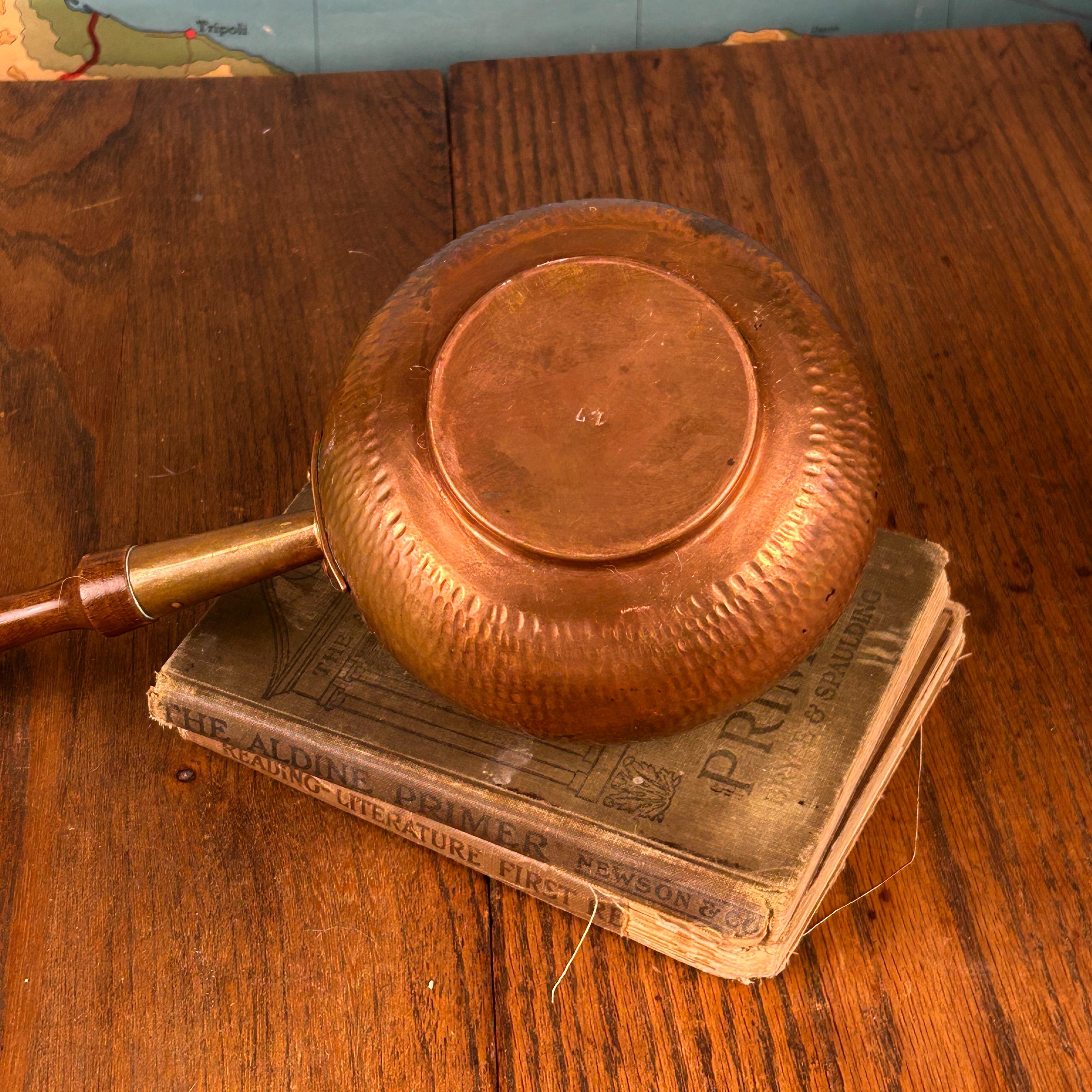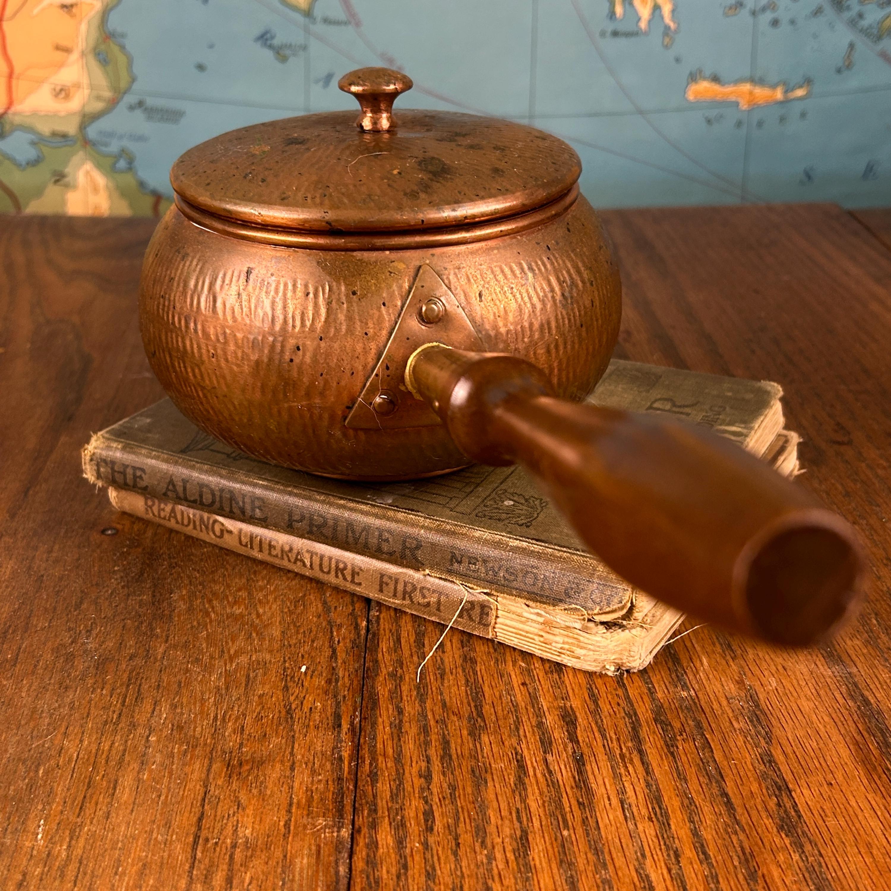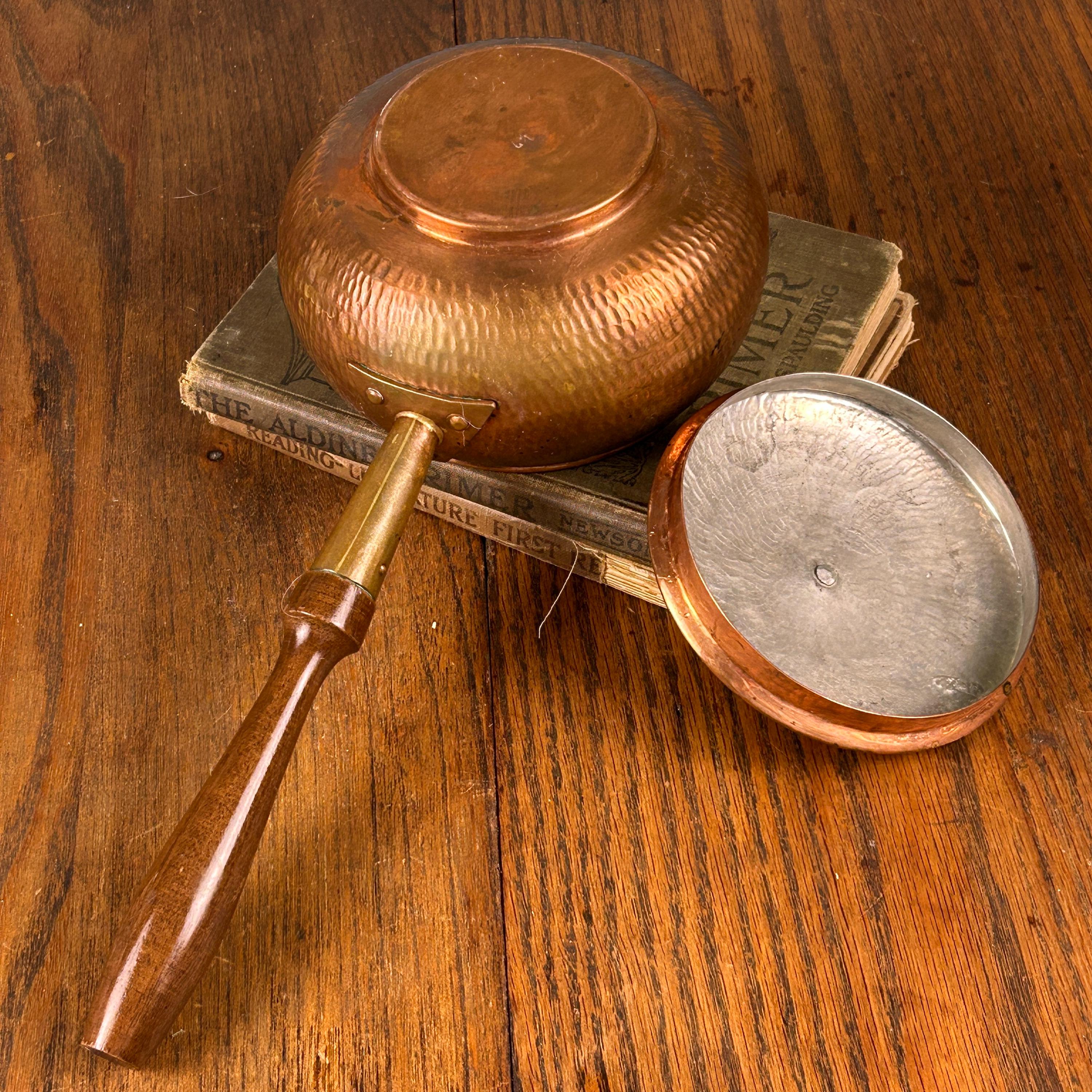 Add a warm, rustic touch to your kitchen with this vintage hammered copper fondue pot featuring a wooden handle and matching lid. The pot has a beautiful hand-hammered finish that gives it rich texture and classic mid-century style. Often marketed as a Swiss fondue pot or small copper saucepan, it is perfect for melting cheese or chocolate, warming sauces, or displaying as vintage décor.