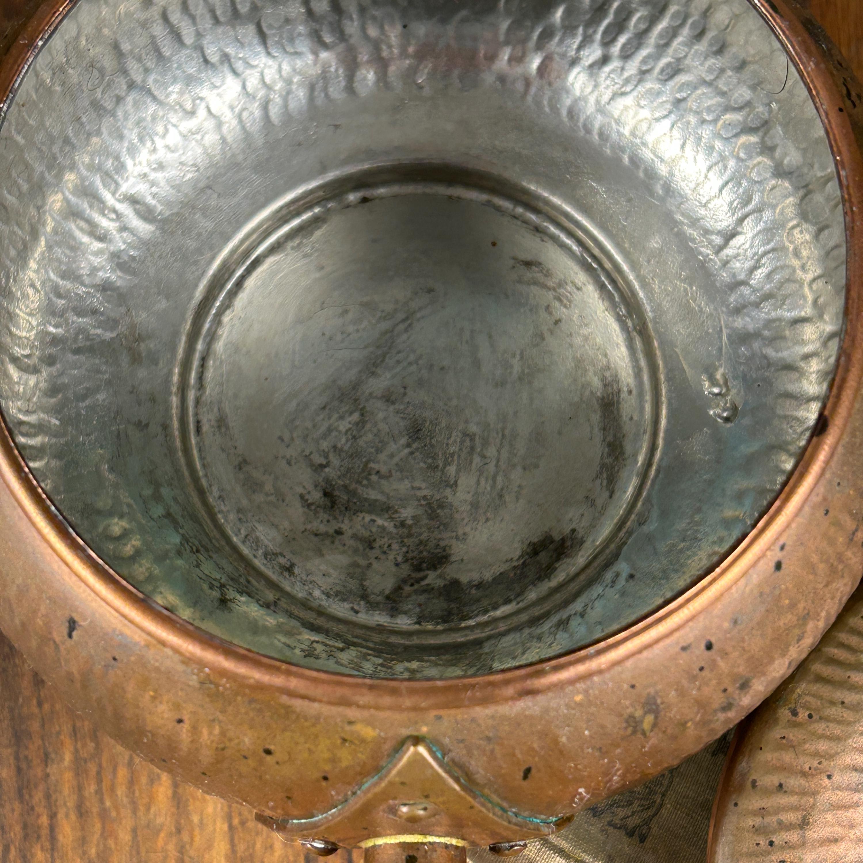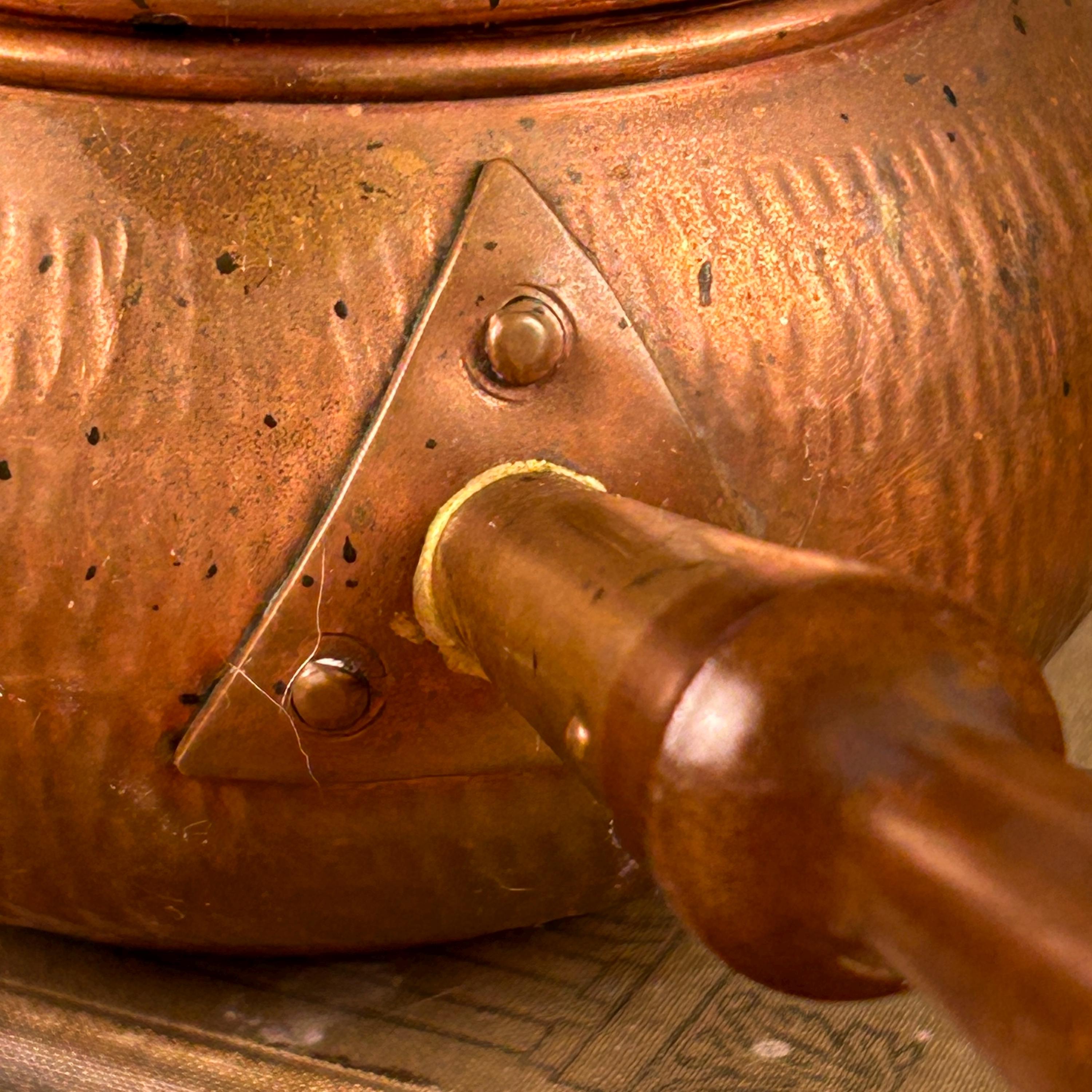 This piece is in good vintage condition with tarnish, patina, and surface wear consistent with age and prior use, adding to its authentic character. The wooden handle offers a comfortable grip, and the copper body makes a striking display on an open shelf, hearth, or pot rack.