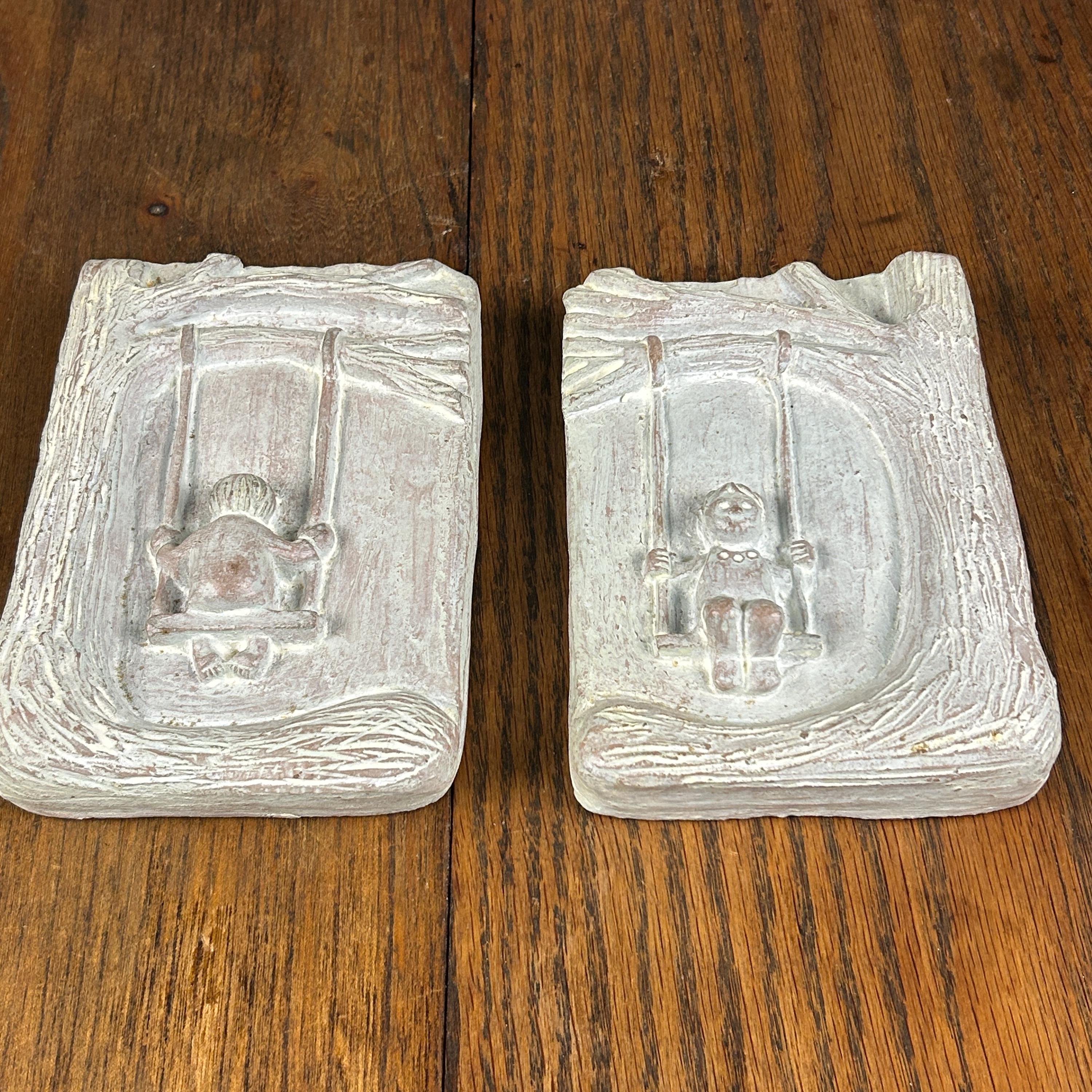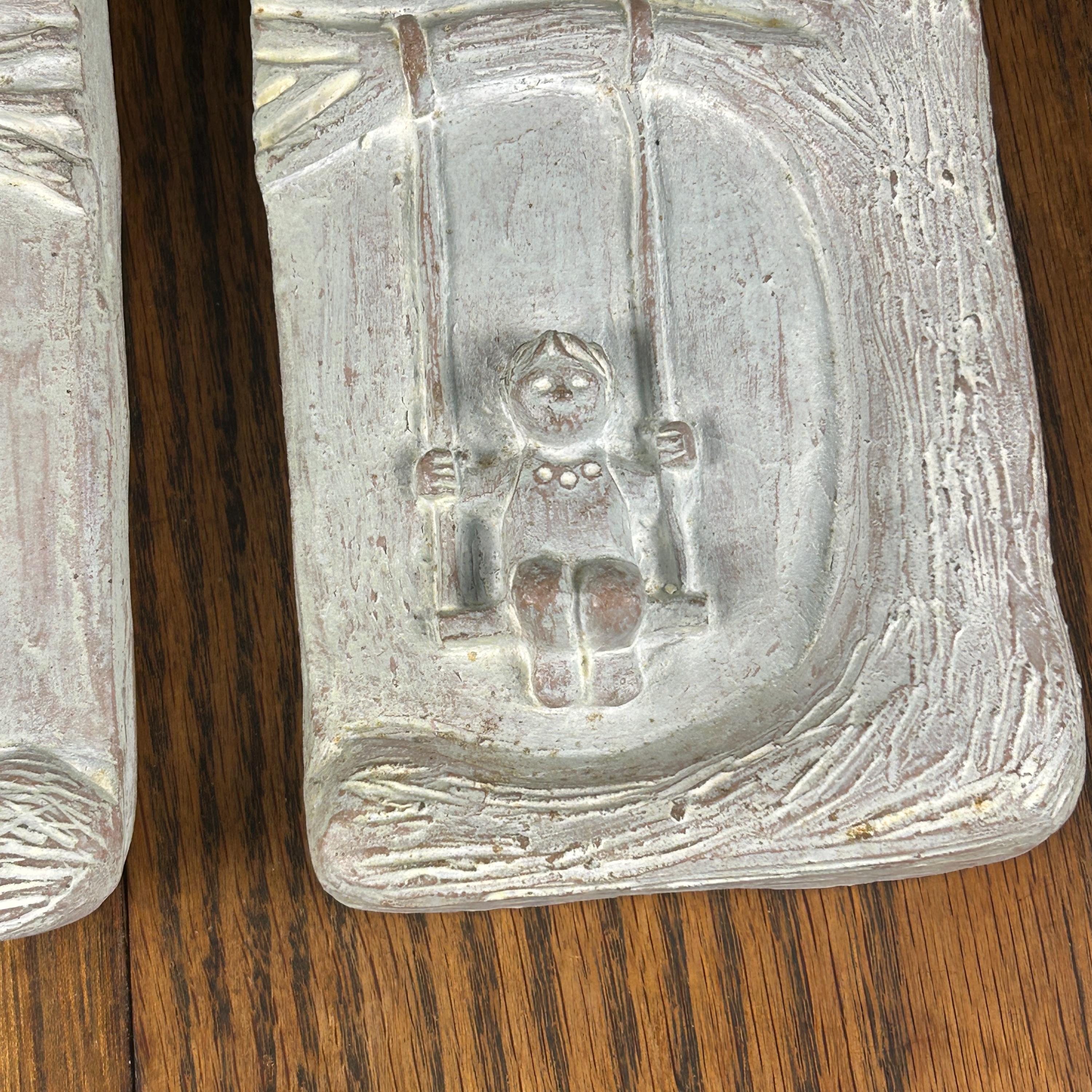 Add whimsical mid-century charm to your home with this pair of vintage Isabel Bloom wall plaques featuring an endearing child on a swing. Created by beloved artist Isabel Bloom (1908–2001), these pieces showcase her signature style—simple, joyful forms with heartwarming personality.