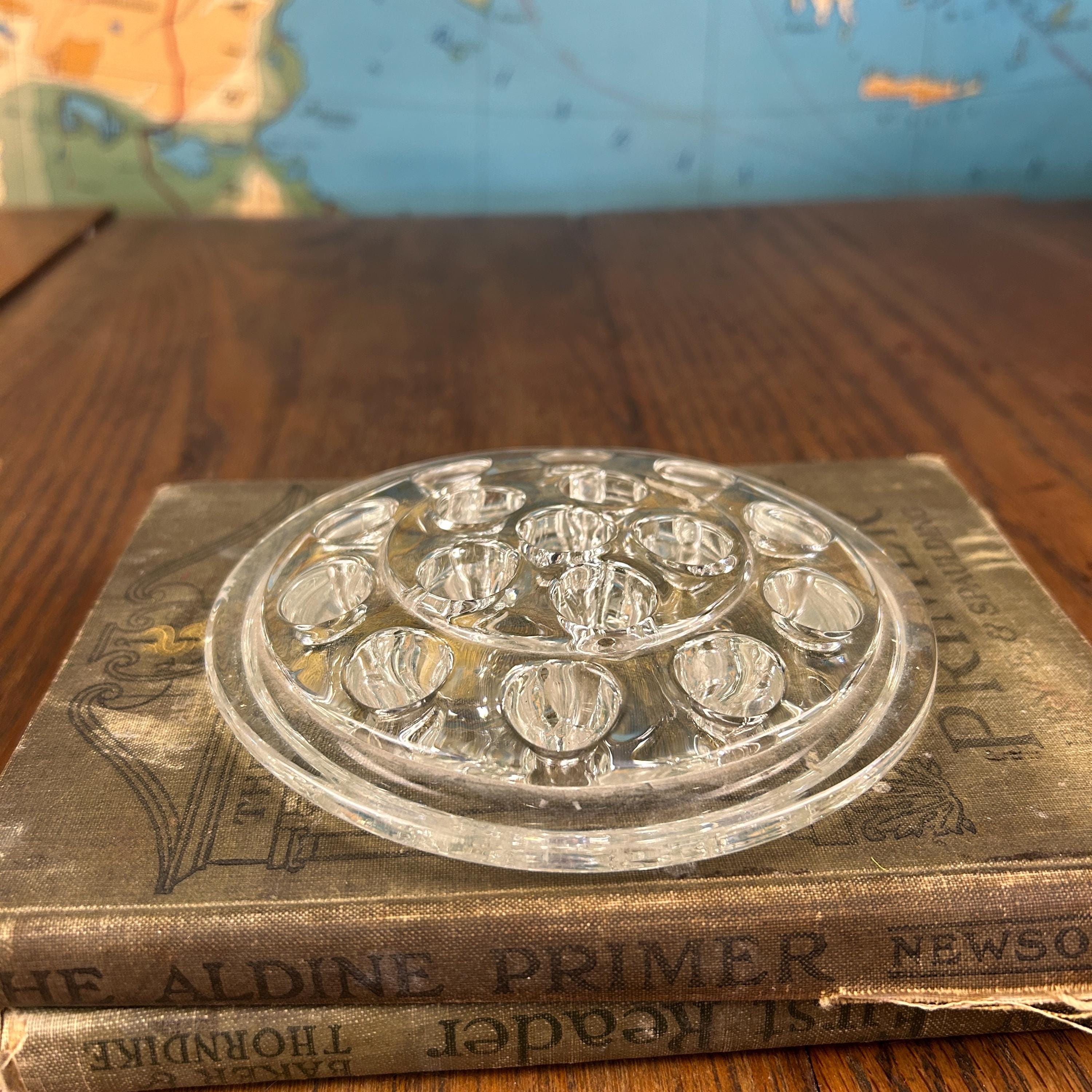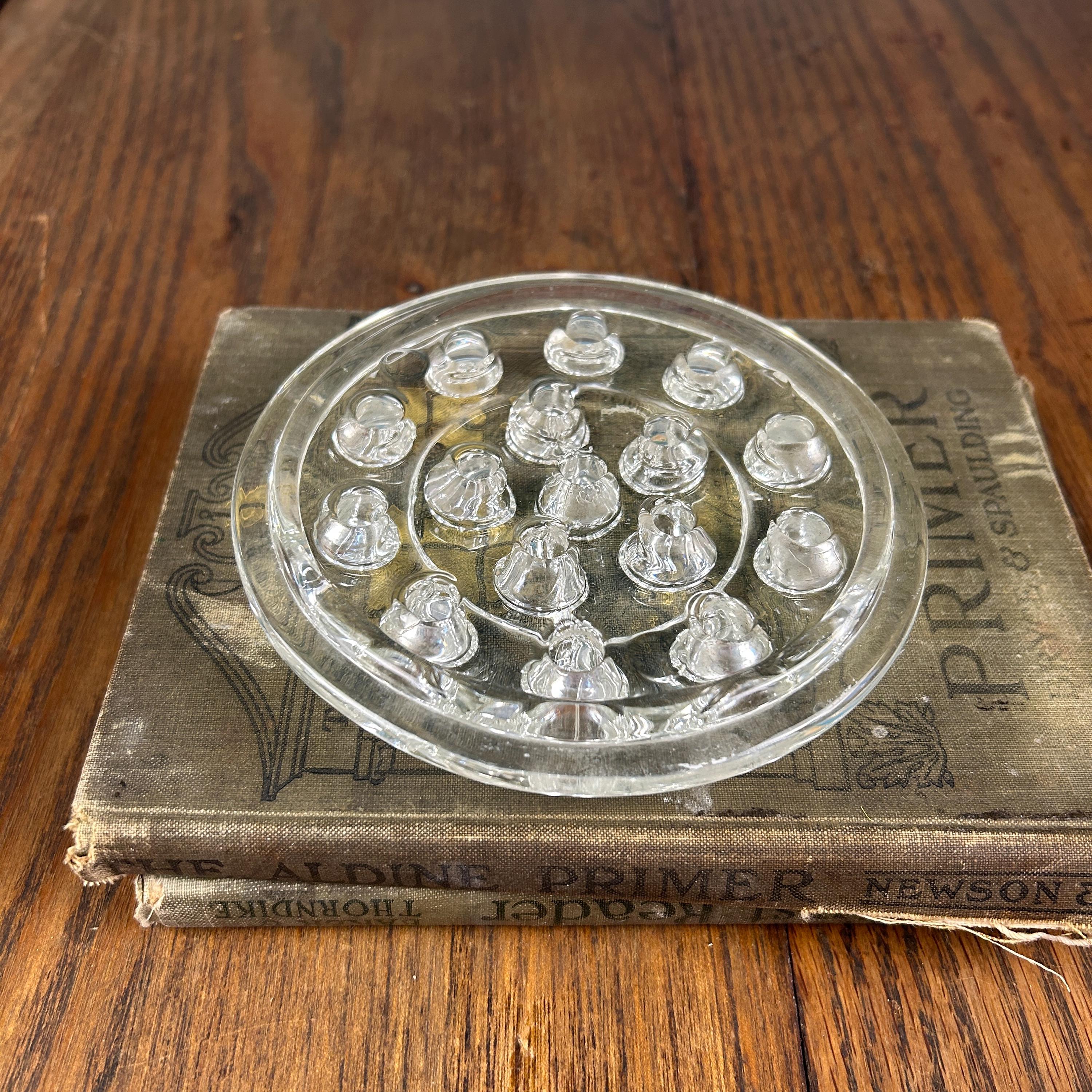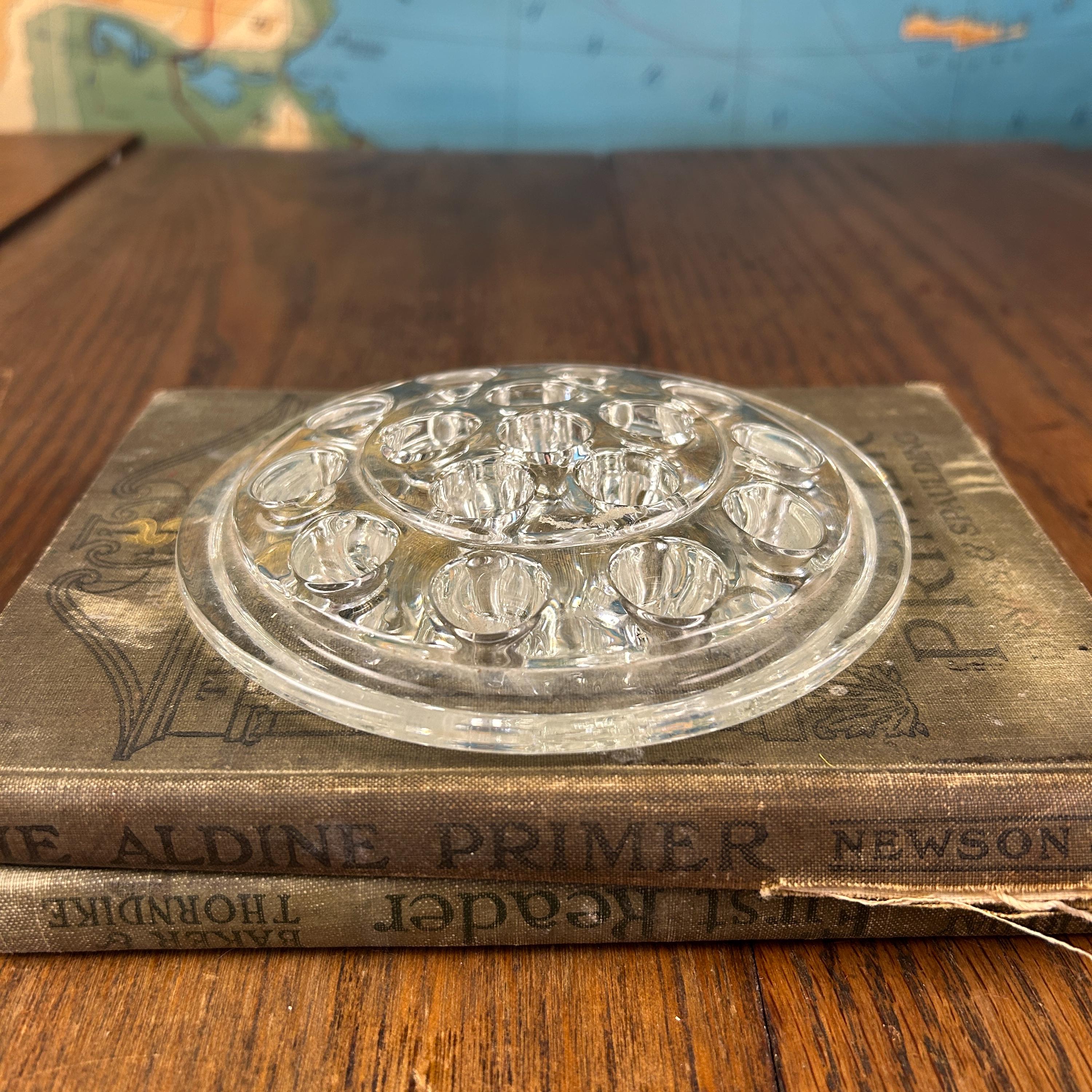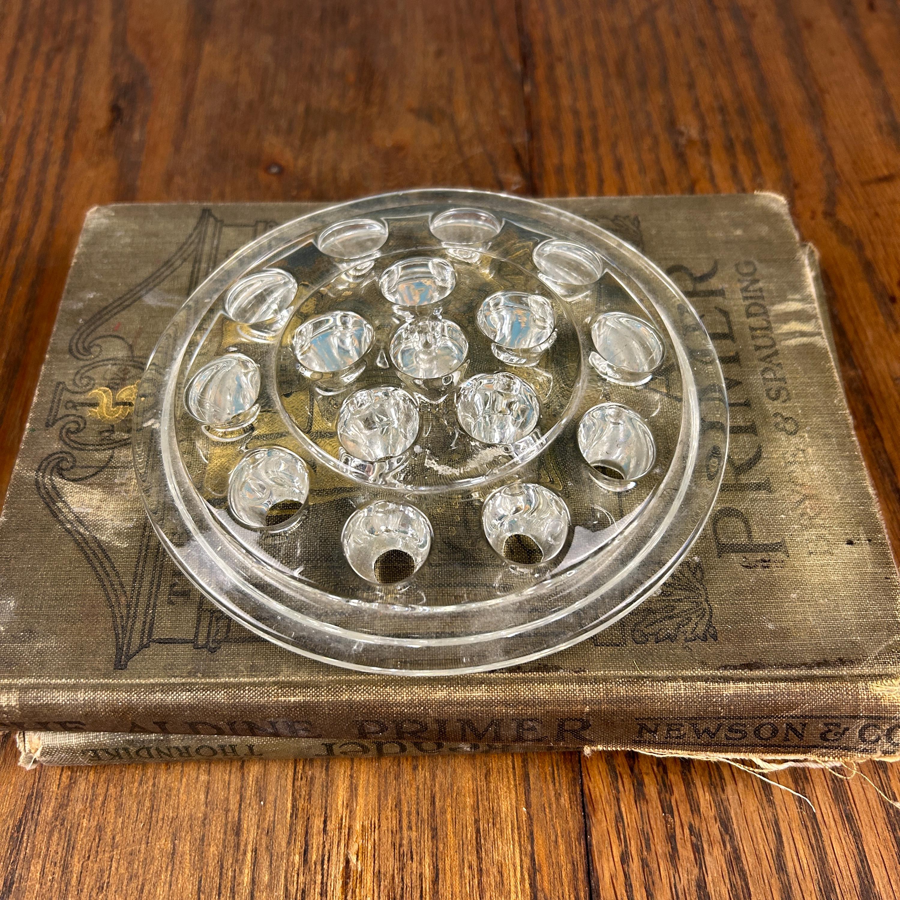 This is a lovely vintage clear pressed glass flower frog, traditionally used as a floral arranger to keep flower stems upright and evenly spaced in a vase or bowl. It features 16 round holes, making it ideal for arranging both fresh and dried flowers into stable, creative displays.