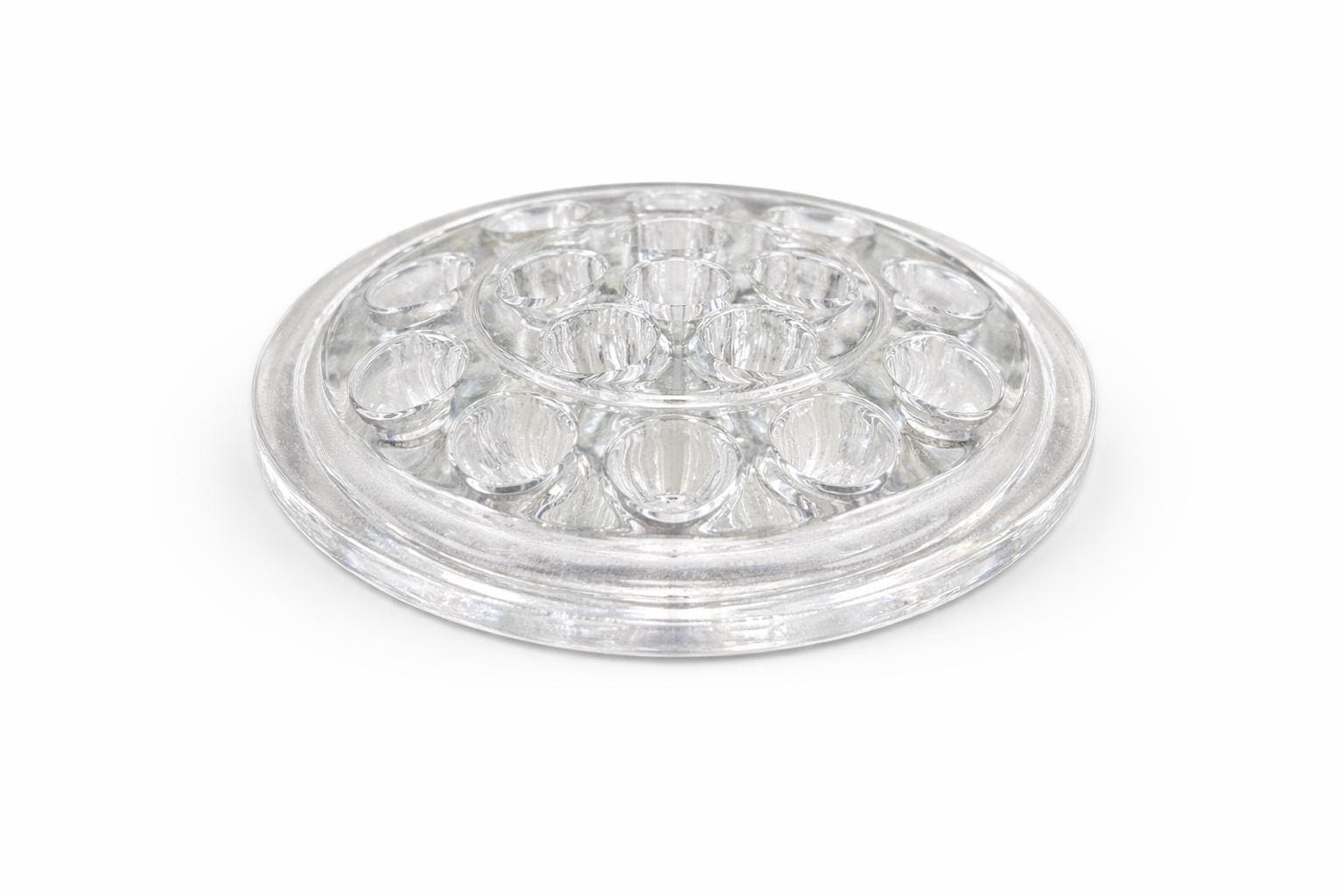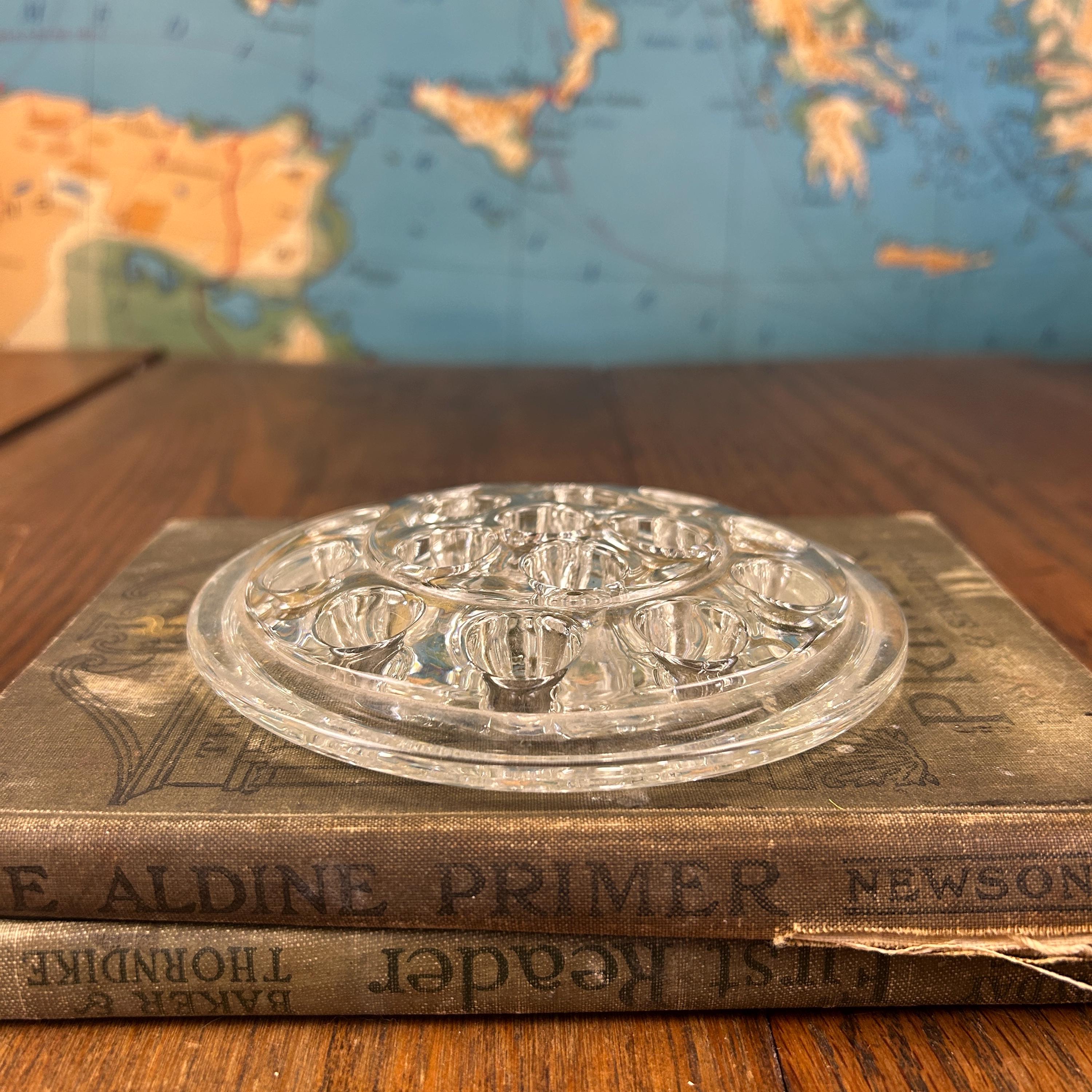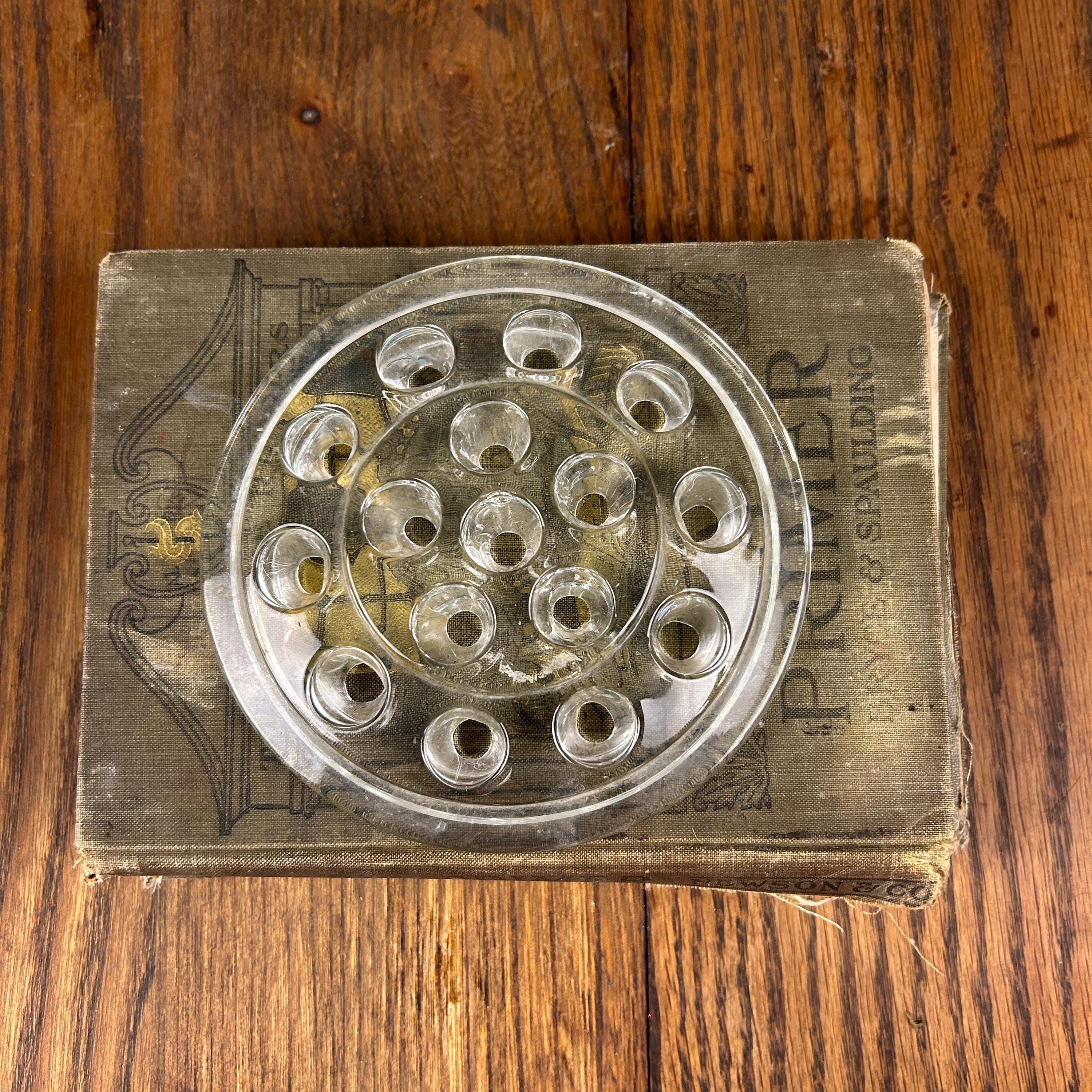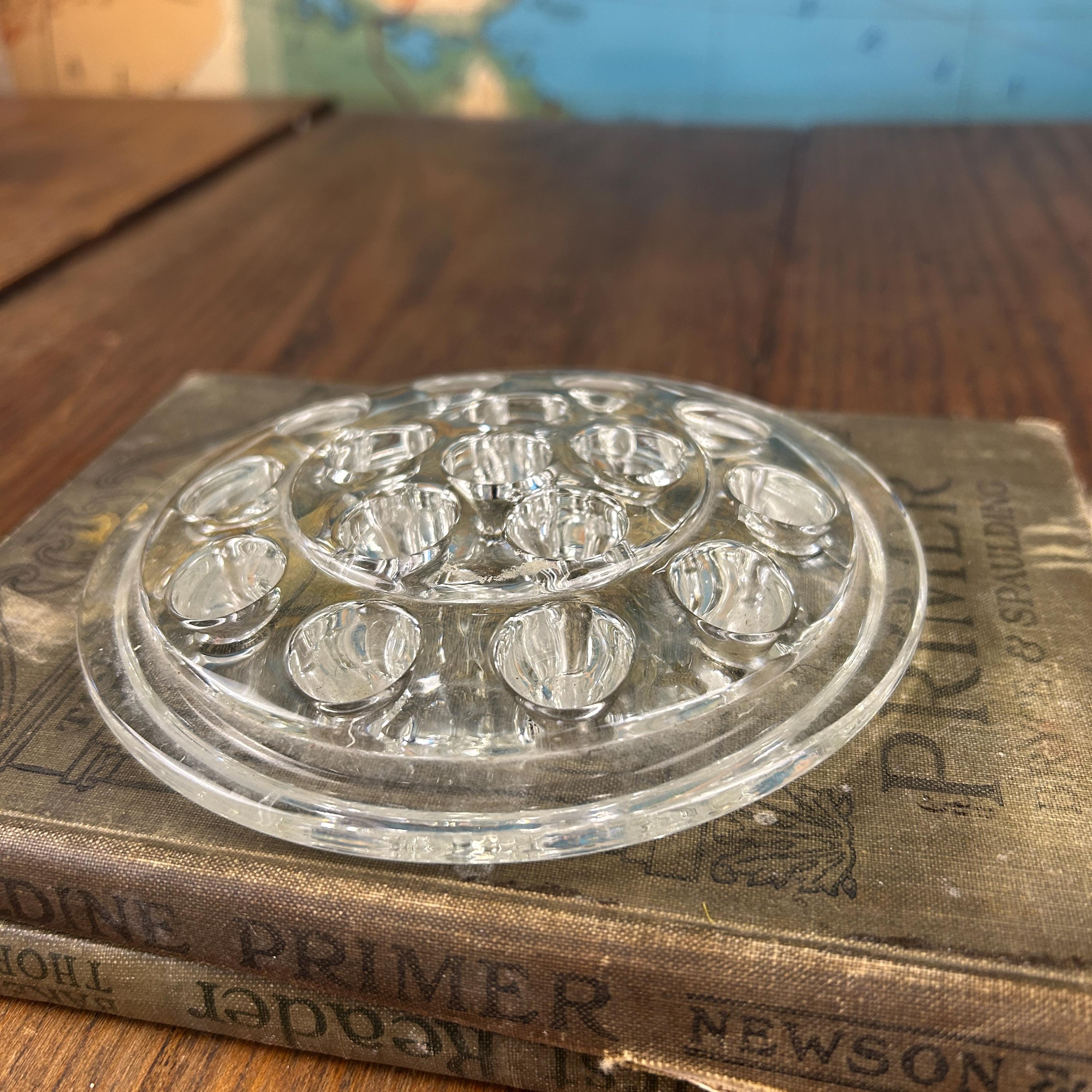 This is a lovely vintage clear pressed glass flower frog, traditionally used as a floral arranger to keep flower stems upright and evenly spaced in a vase or bowl. It features 16 round holes, making it ideal for arranging both fresh and dried flowers into stable, creative displays.