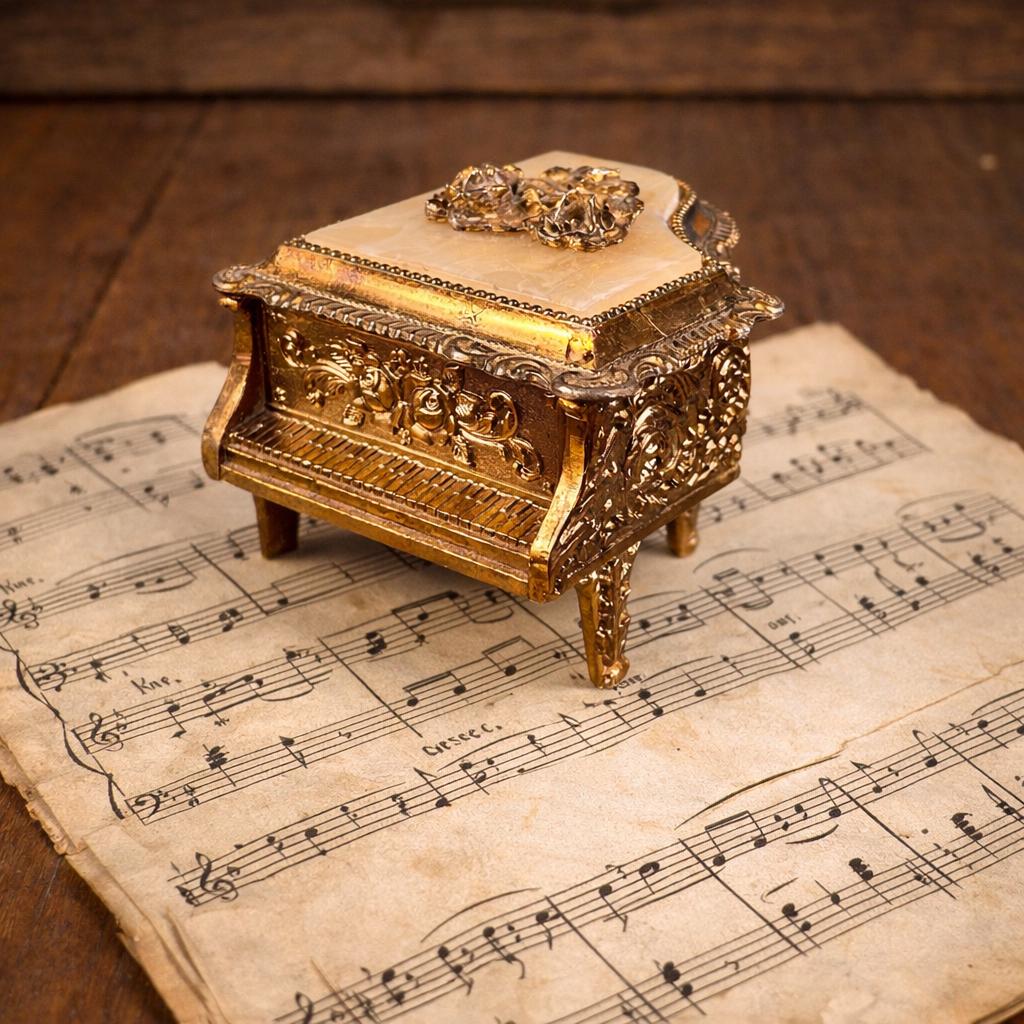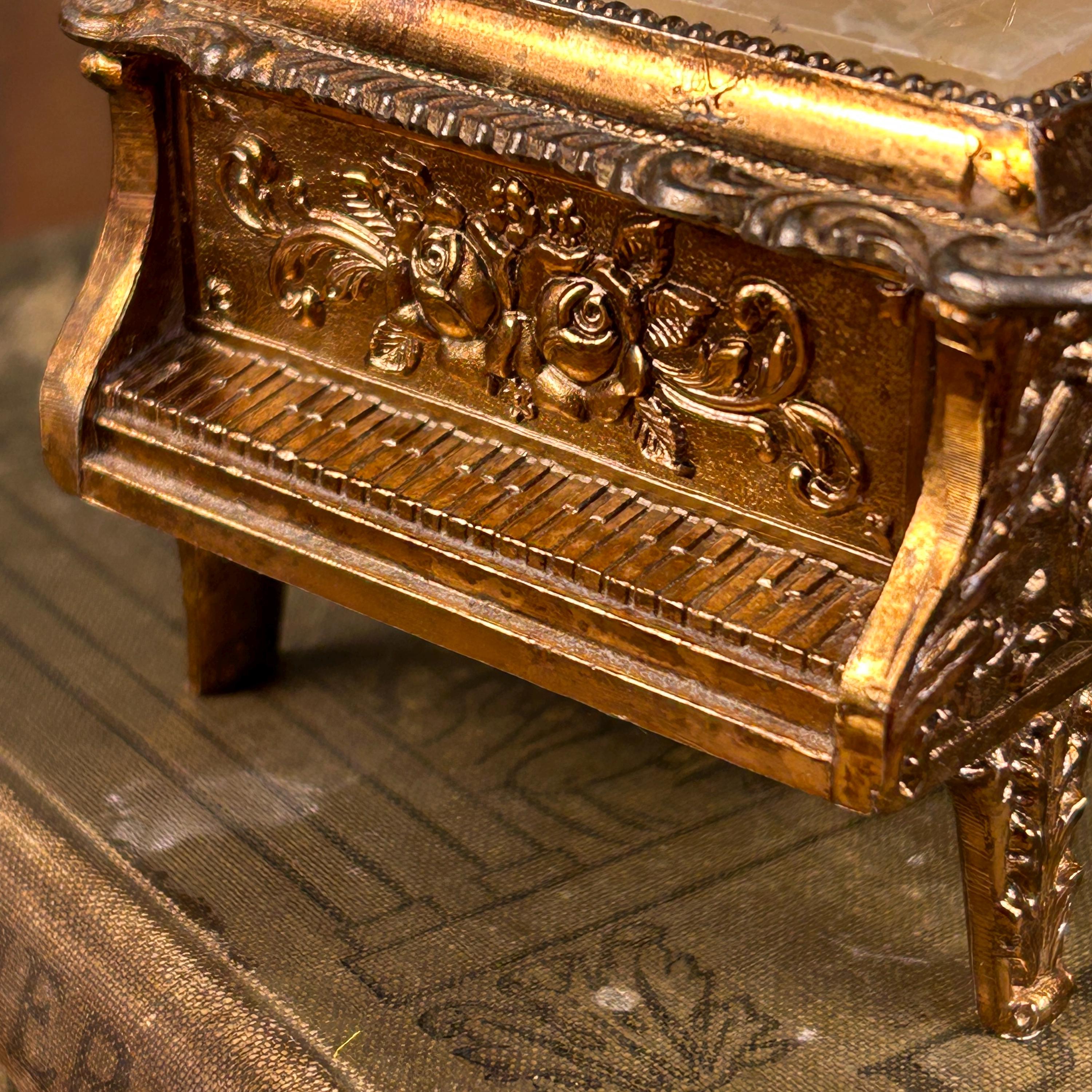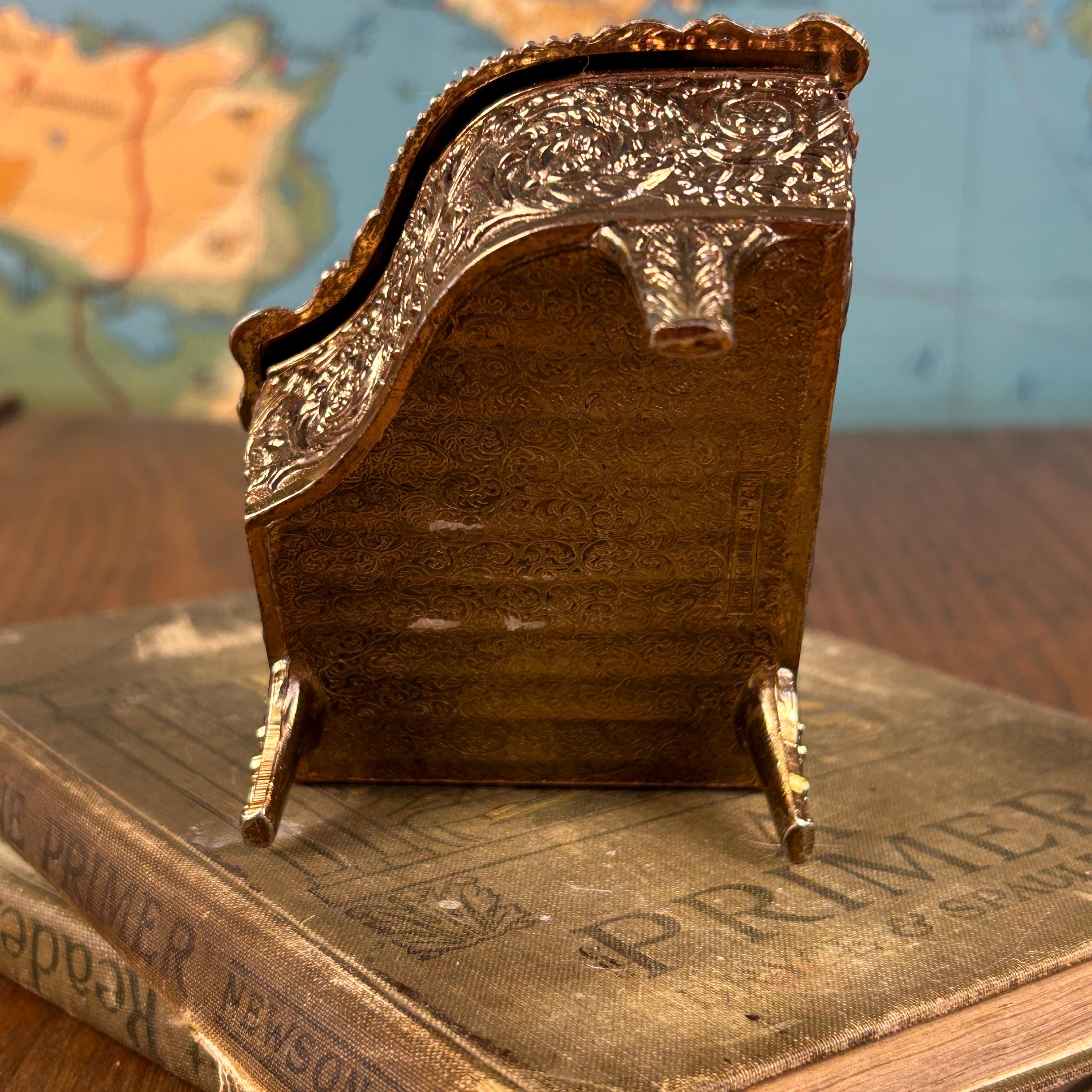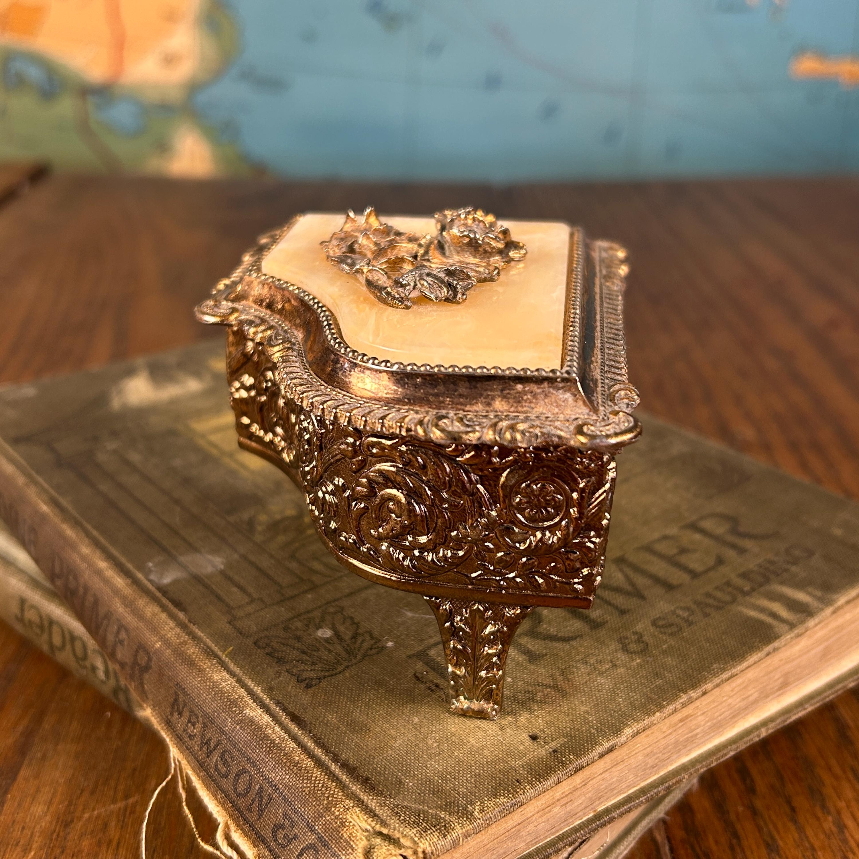 Add a touch of romantic vintage charm to your vanity or dresser with this vintage piano-shaped trinket box, made in Japan. Styled like a miniature grand piano, this small storage box is perfect for holding rings, earrings, keepsakes, or other tiny treasures.