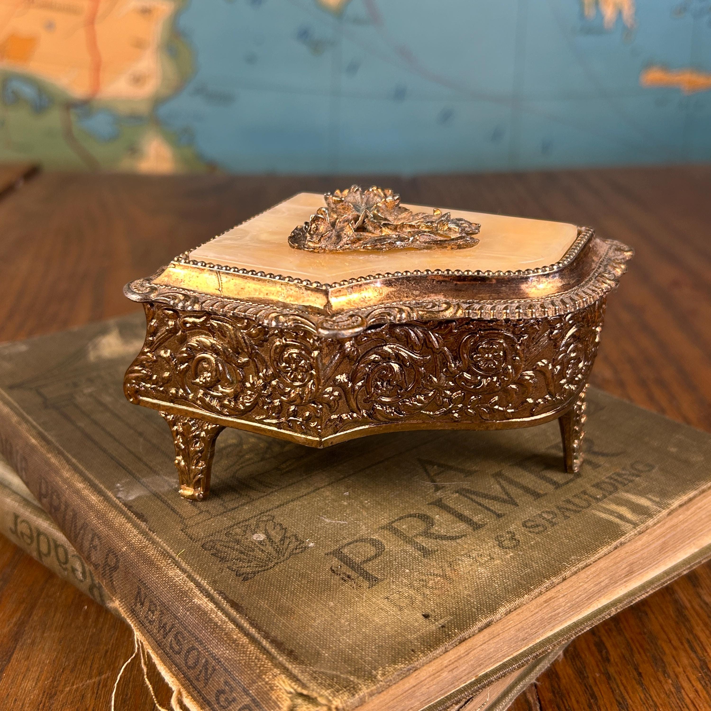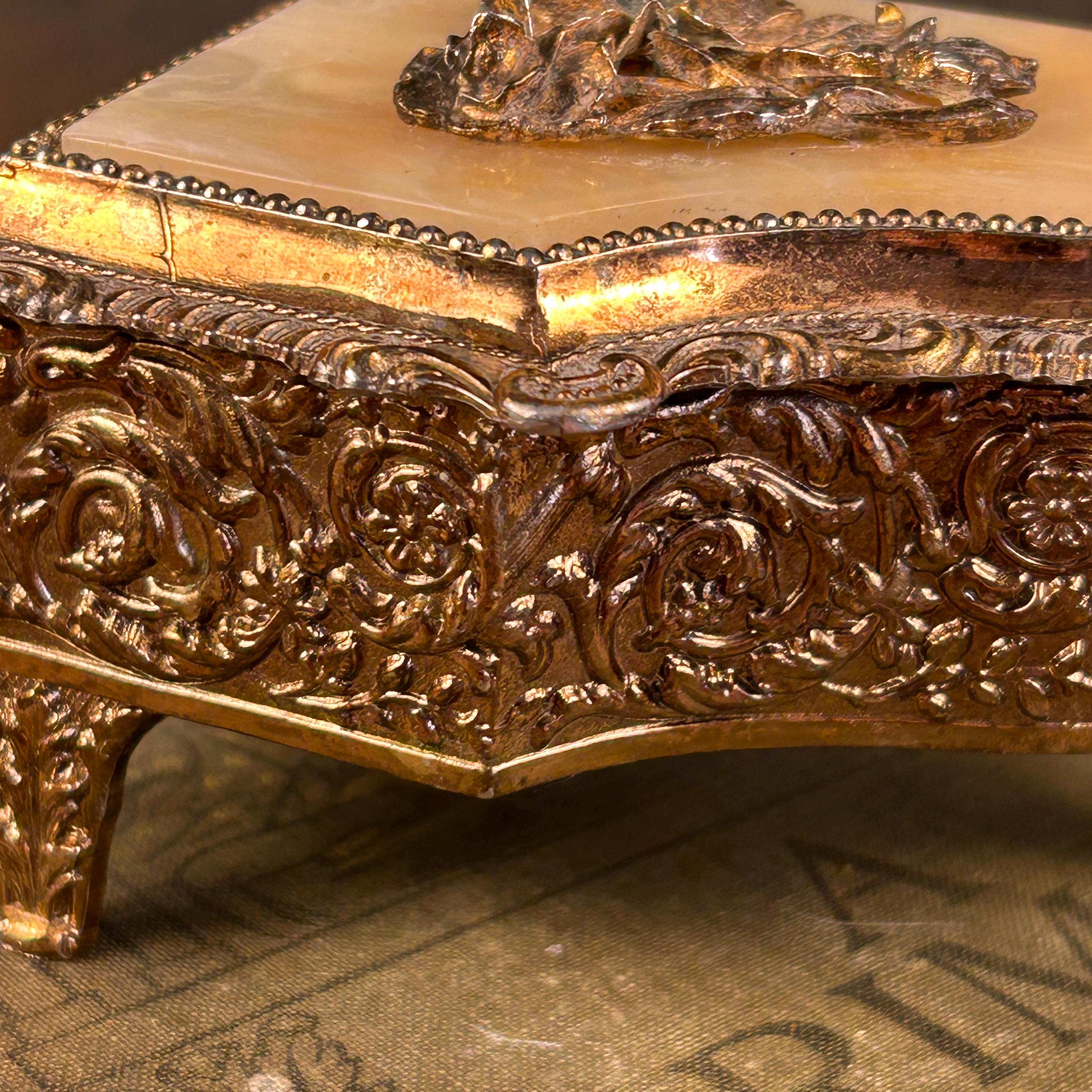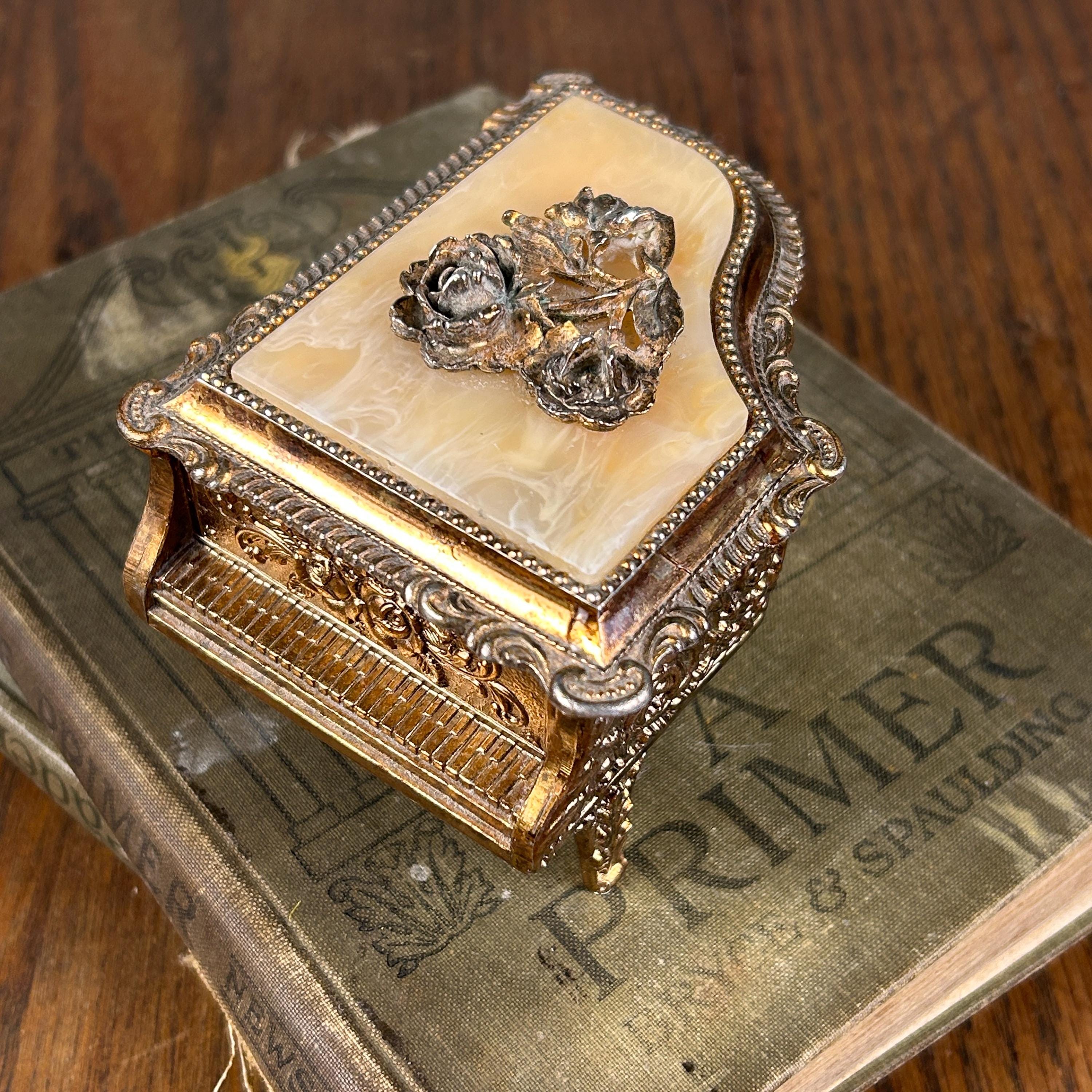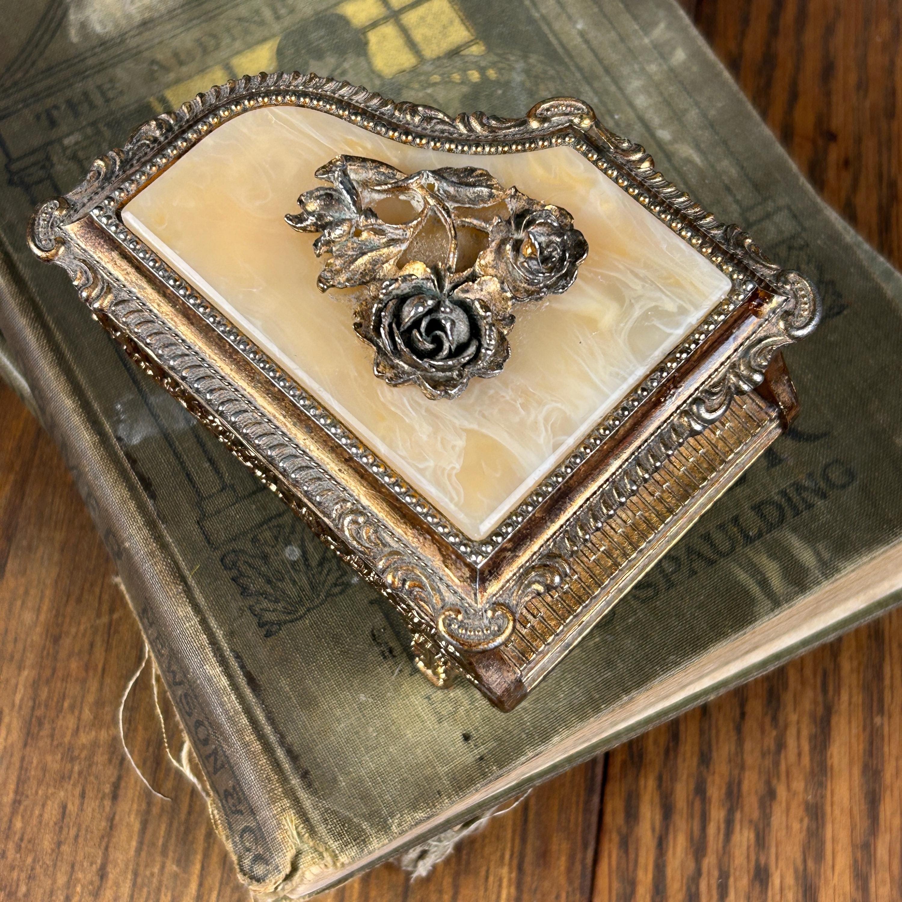 The lid features a marbled Bakelite panel embellished with raised metal rose motifs, giving it lovely texture and dimensional detail. Inside, the box is lined with gold fabric, adding a warm, elegant glow to anything stored inside.