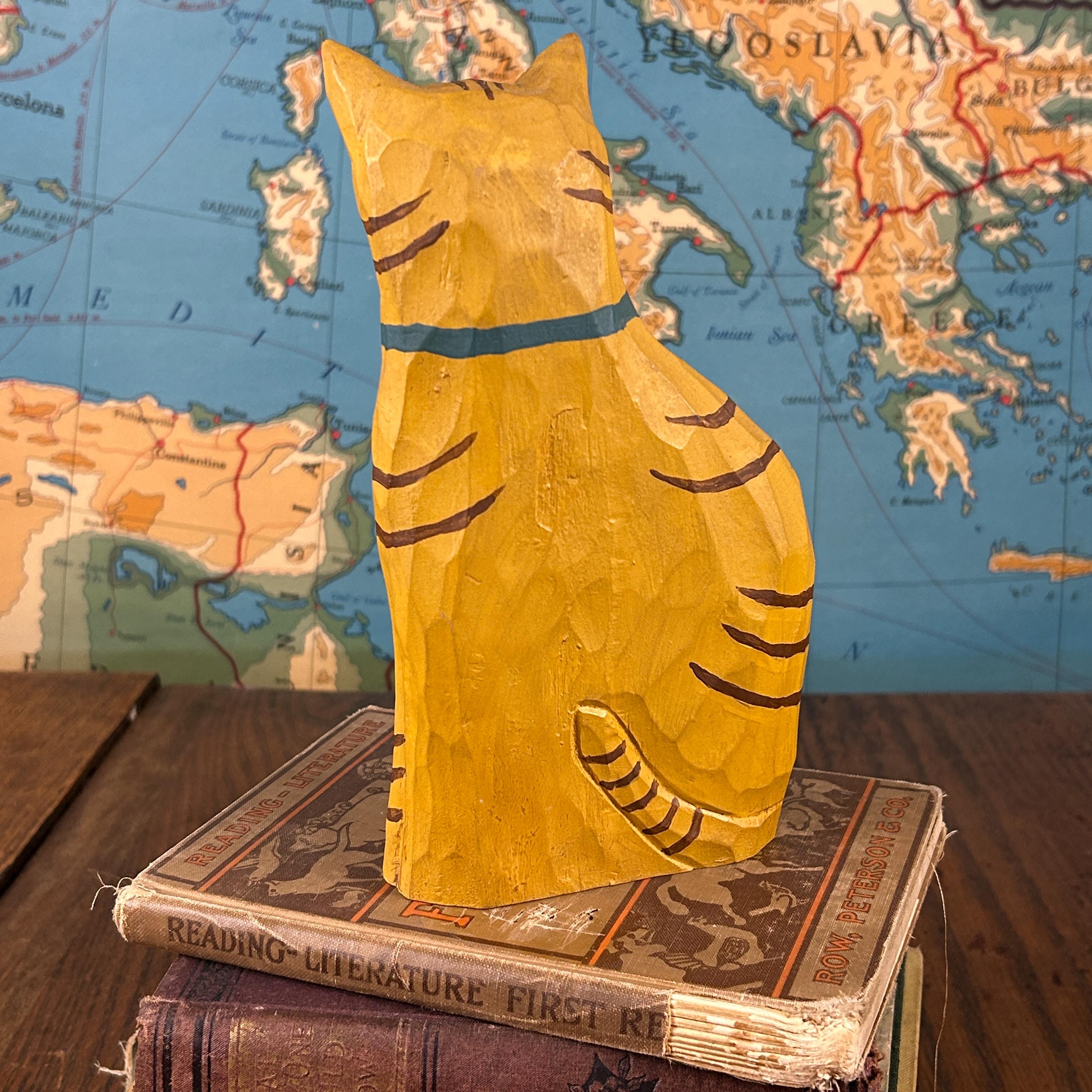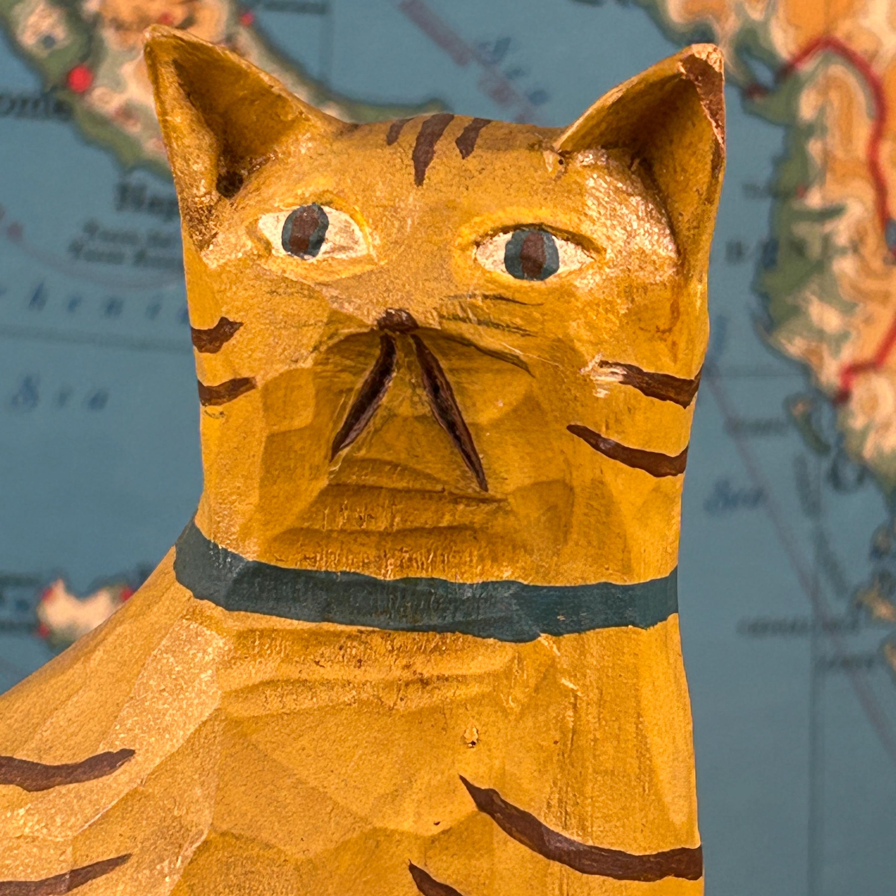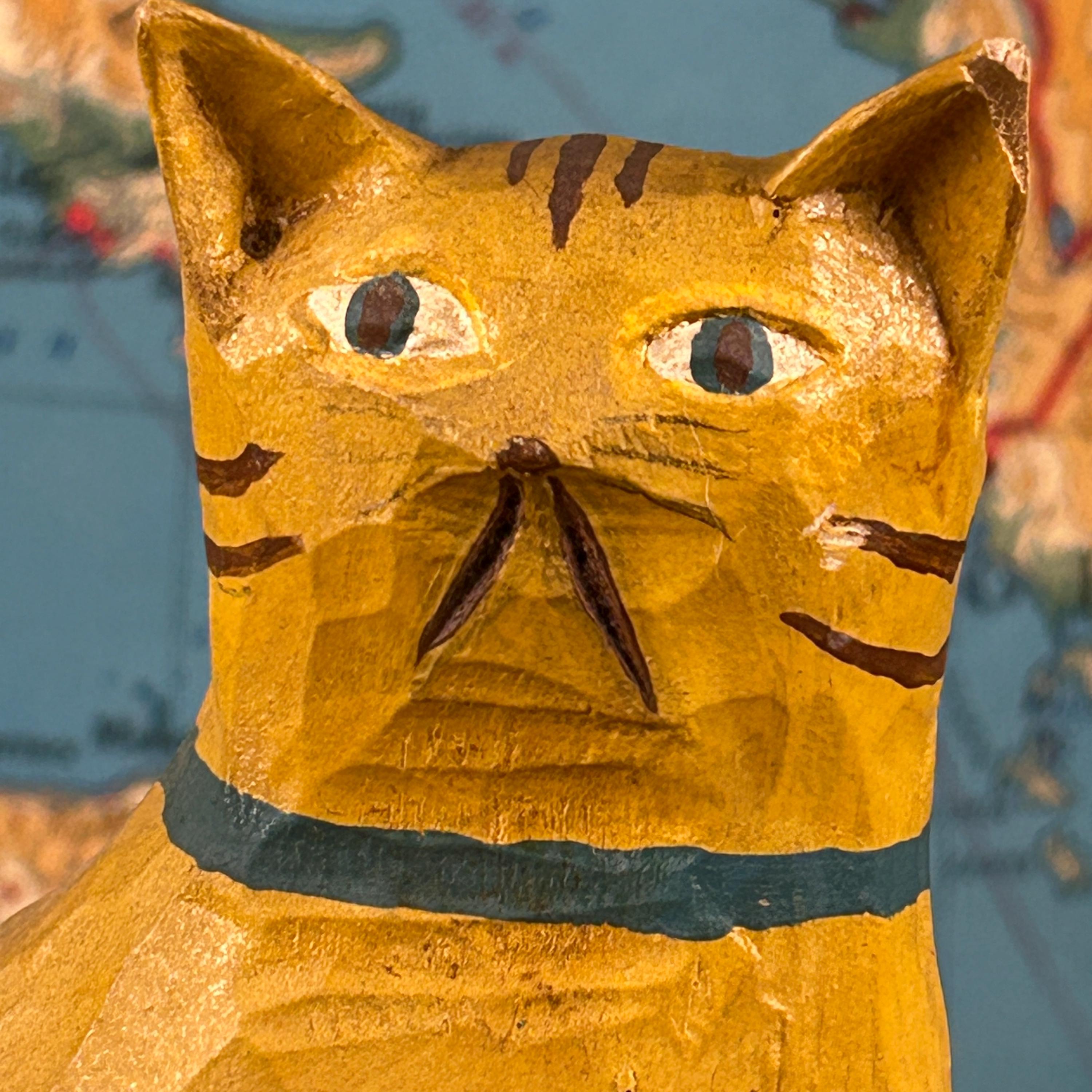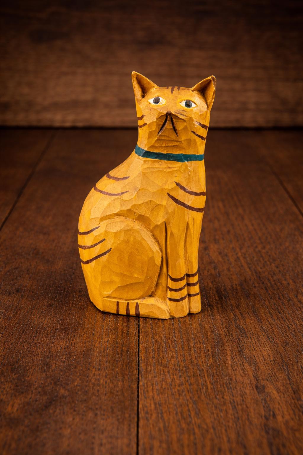 Bring a touch of warm, whimsical charm to your home décor with this hand-carved and painted wooden folk art cat figurine. This sweet sitting orange tabby cat is carved from solid wood and features hand-painted striped details and a cheerful blue collar.